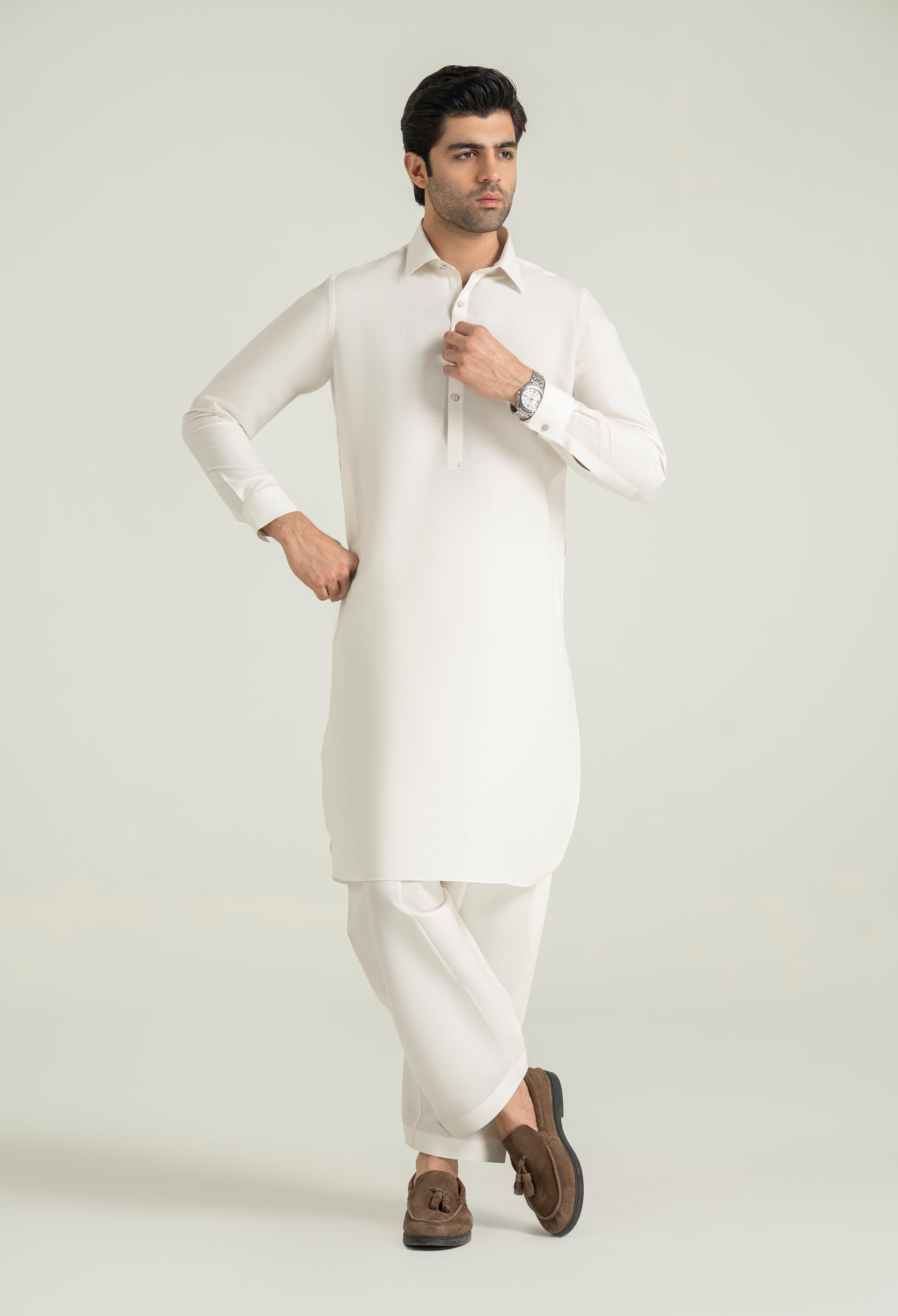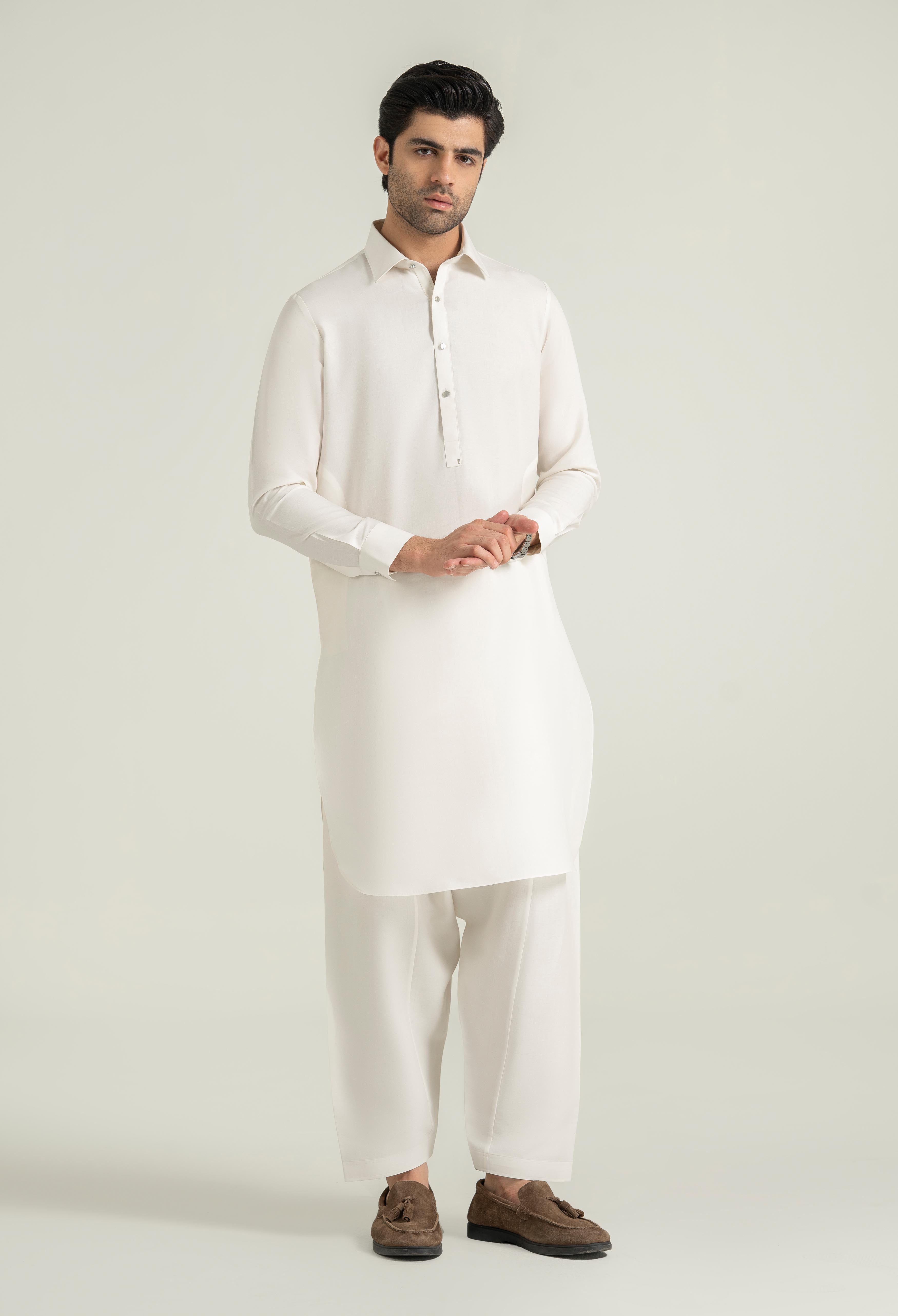 Crafted with refined attention to detail, this festive collection showcases a new shirt collar that introduces a fresh and contemporary tone. The front placket is accented with a metal stud, while the button placket features a selvedge finish for clean, structured detailing. The outside collar band is designed with selvedge finishing, complemented by a 1.5-inch selvedge tape along the back shoulder for added craftsmanship. The inside label-D is made from luxurious Katan fabric, bringing an elevated touch to the internal construction.
