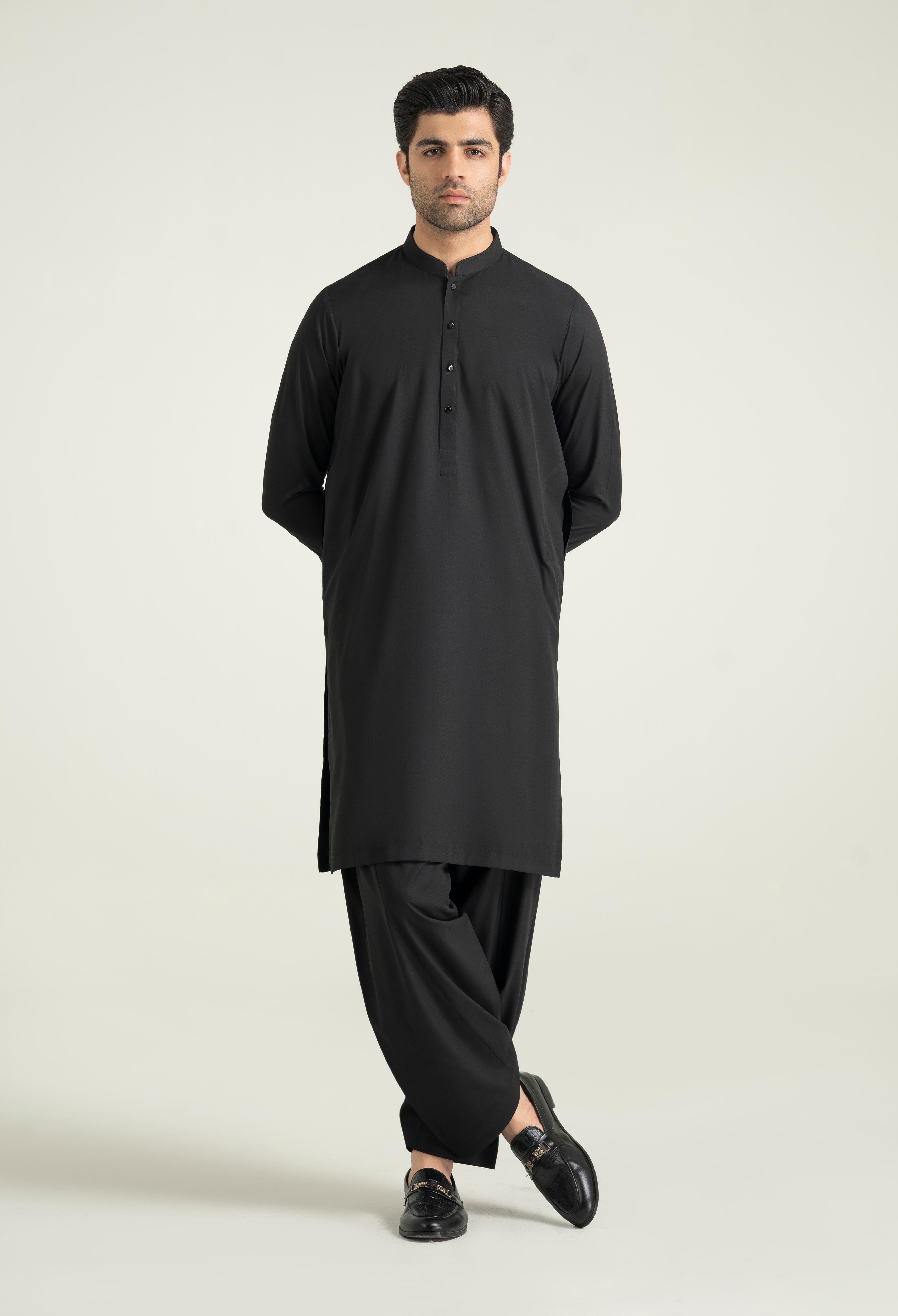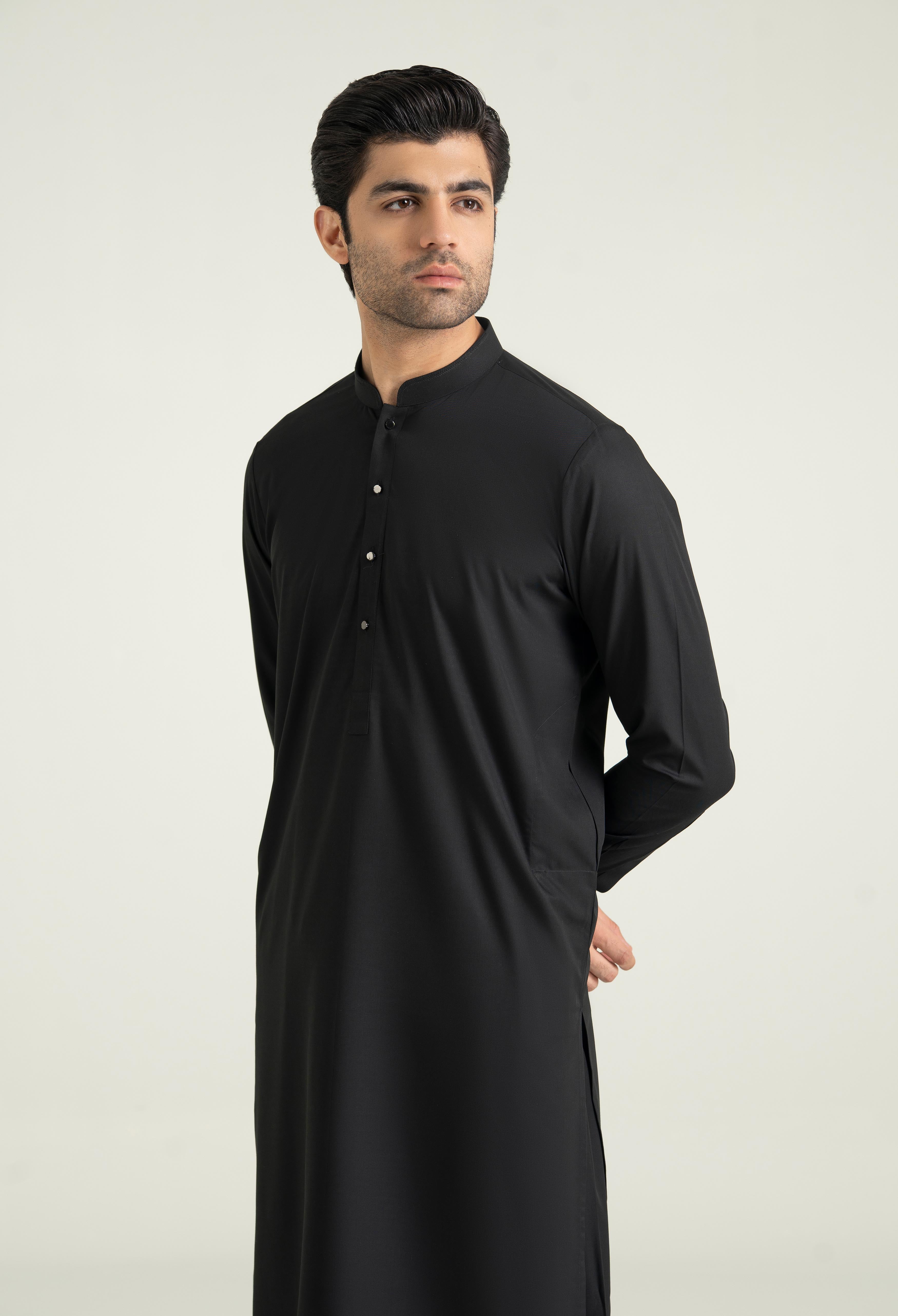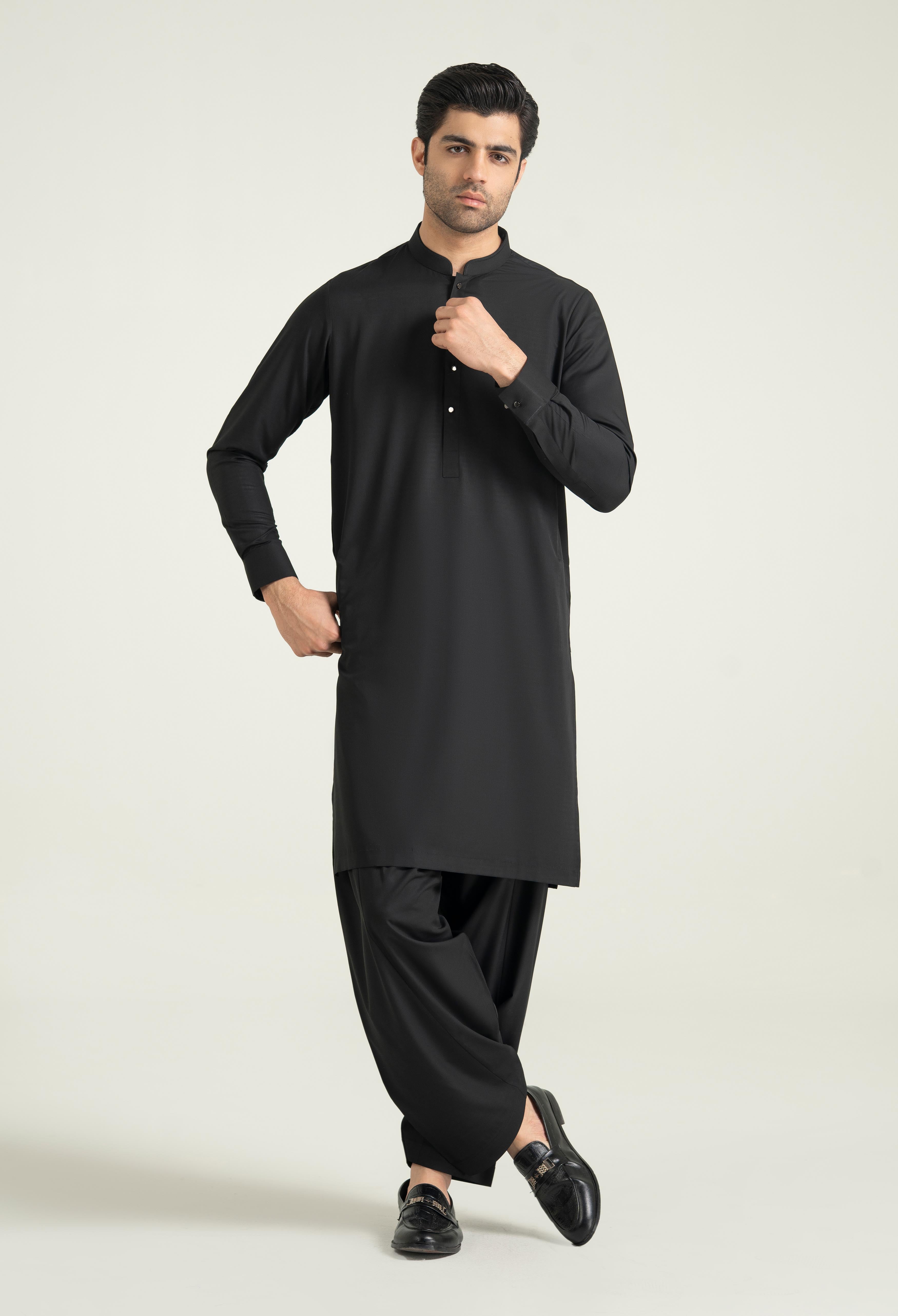 This thoughtfully designed shalwar kameez collection features a round band collar paired with straight cuffs, offering a clean and contemporary look. Intricate arrowhead embroidered stitch embellishes the half band collar, cuffs, and back shoulder, adding distinctive craftsmanship to the design. Contrast print fabric is used on the inside of the band collar, inside back label, and inside cuffs, enhancing the garment with subtle visual interest. The outfit is completed with a 1-inch placket, 2.5-inch straight cuffs, a straight hand-stitched hem, and two side pockets, blending functionality with refined detailing.