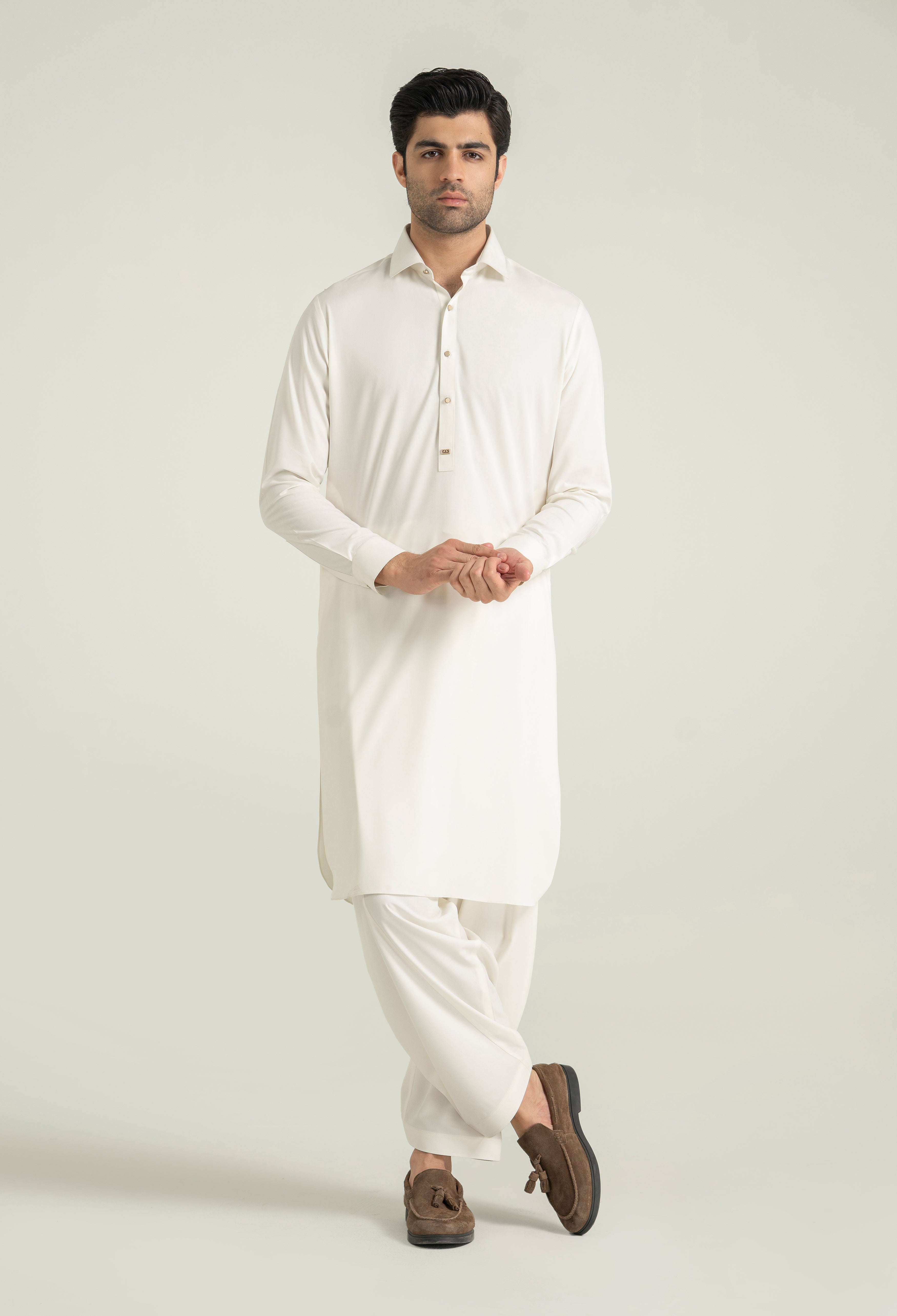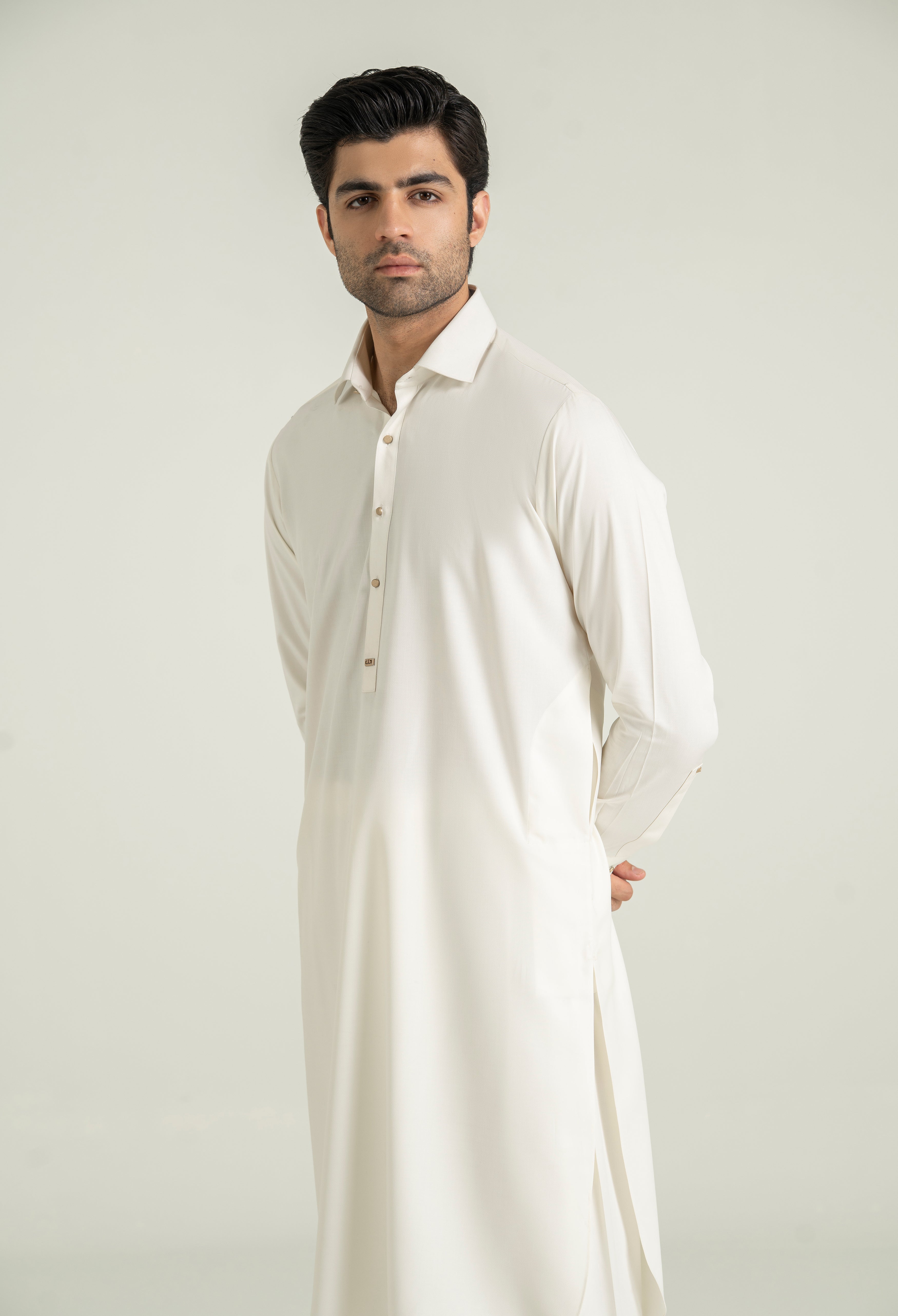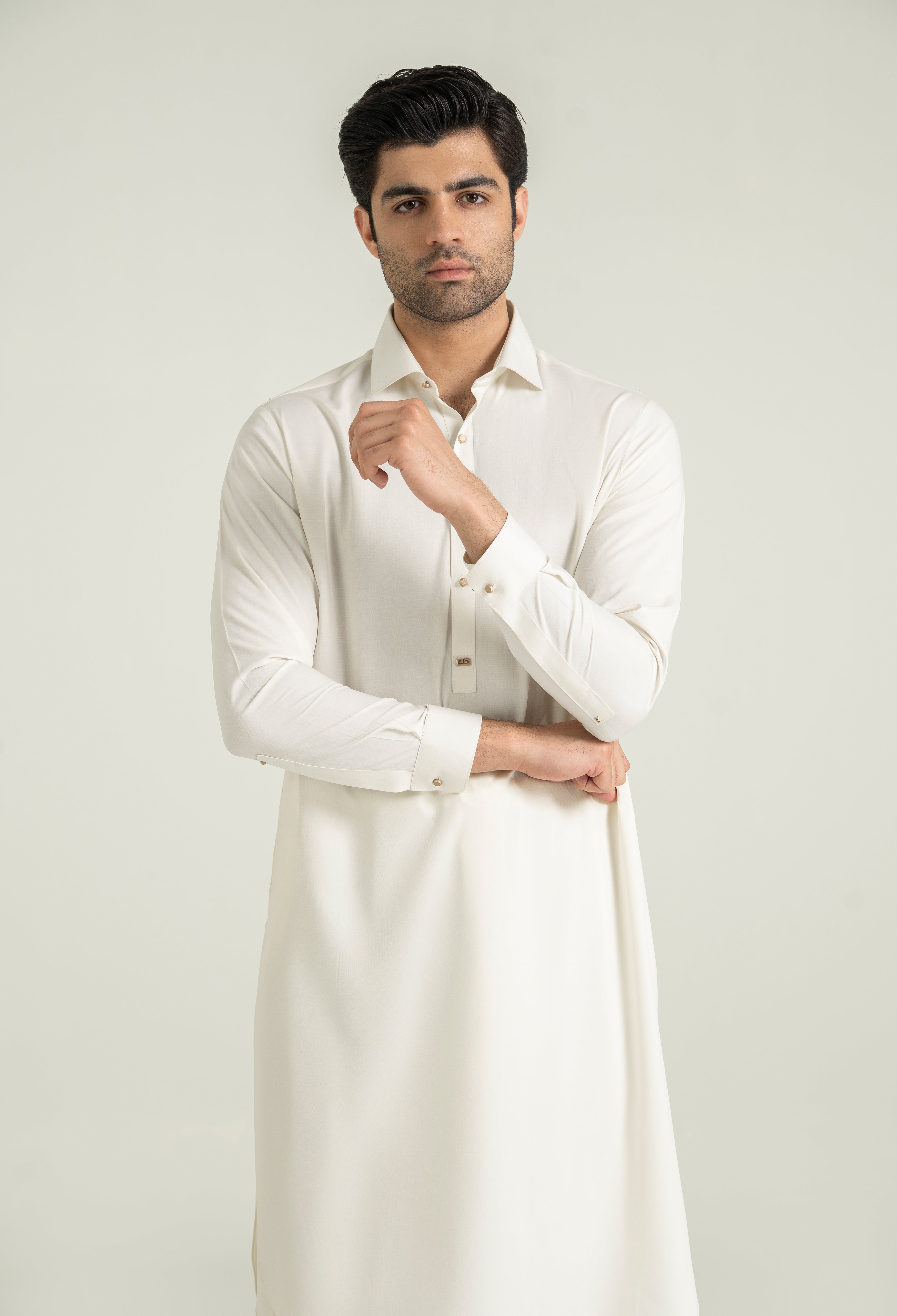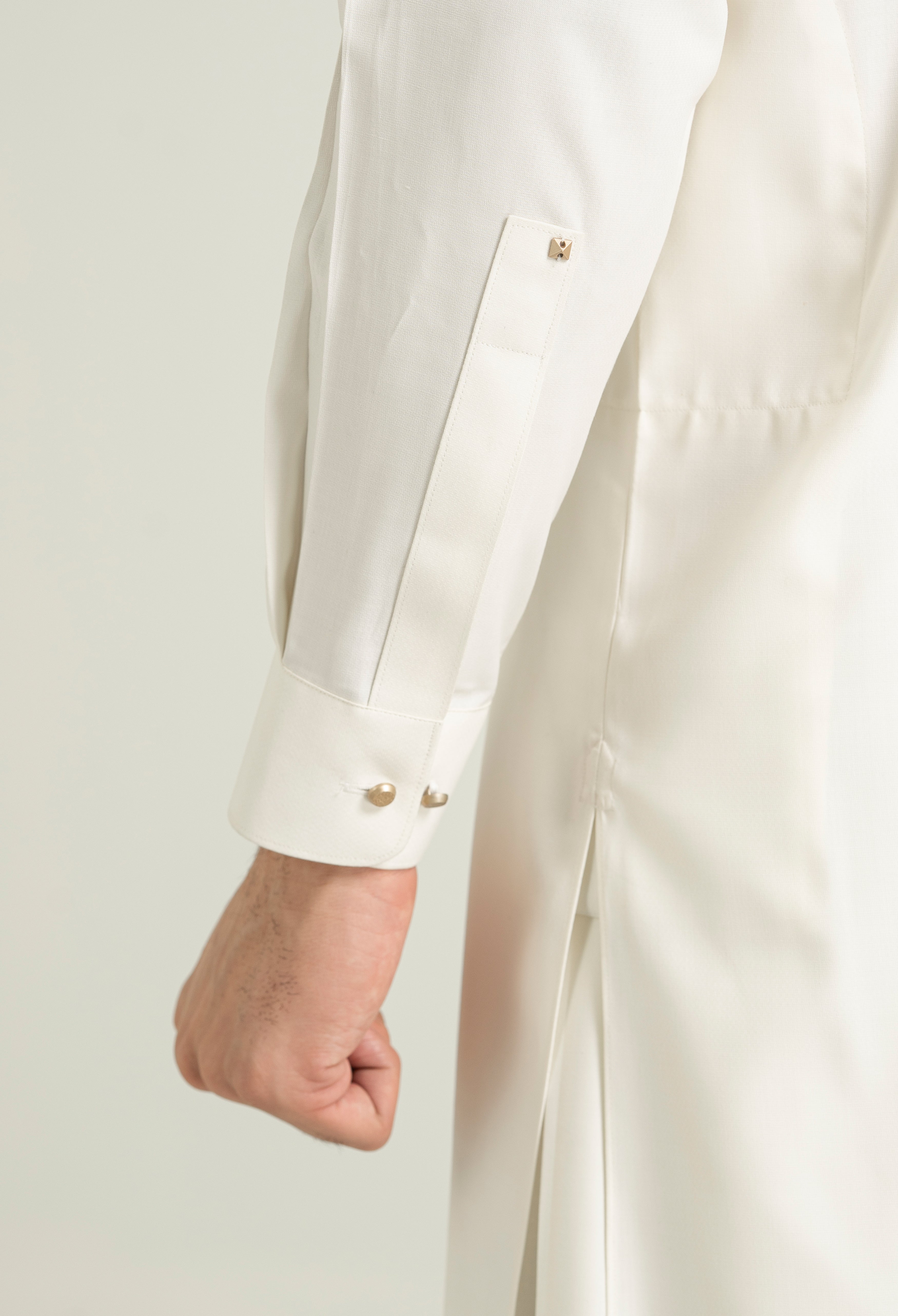 This elegantly tailored festive collection features a new shirt collar, offering a fresh and refined look. The front placket is elevated with a metal clip, while the sleeve plackets are adorned with metal studs, adding a bold contemporary edge. A distinctive knot on the shoulders further enhances the outfit’s unique character and craftsmanship.