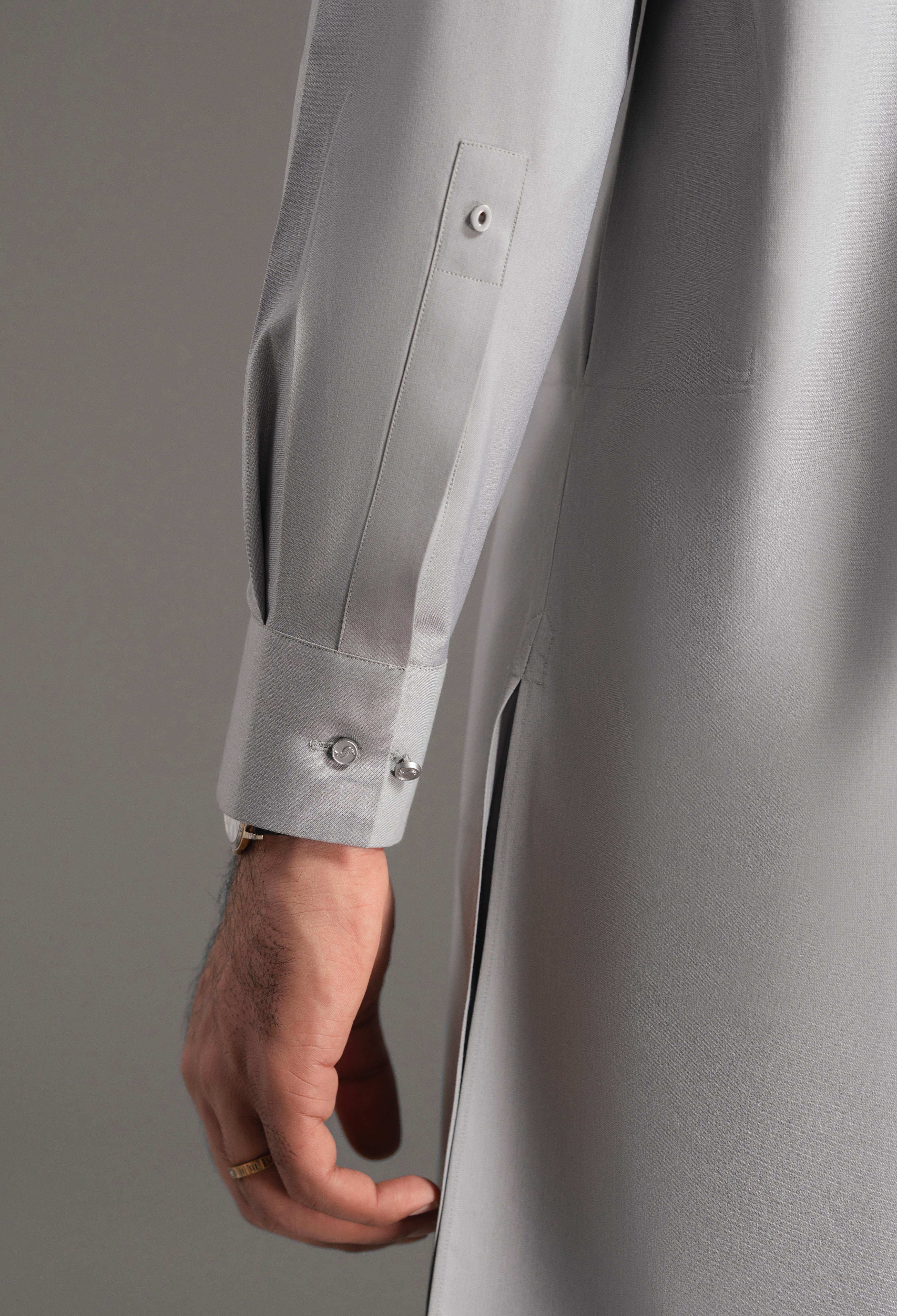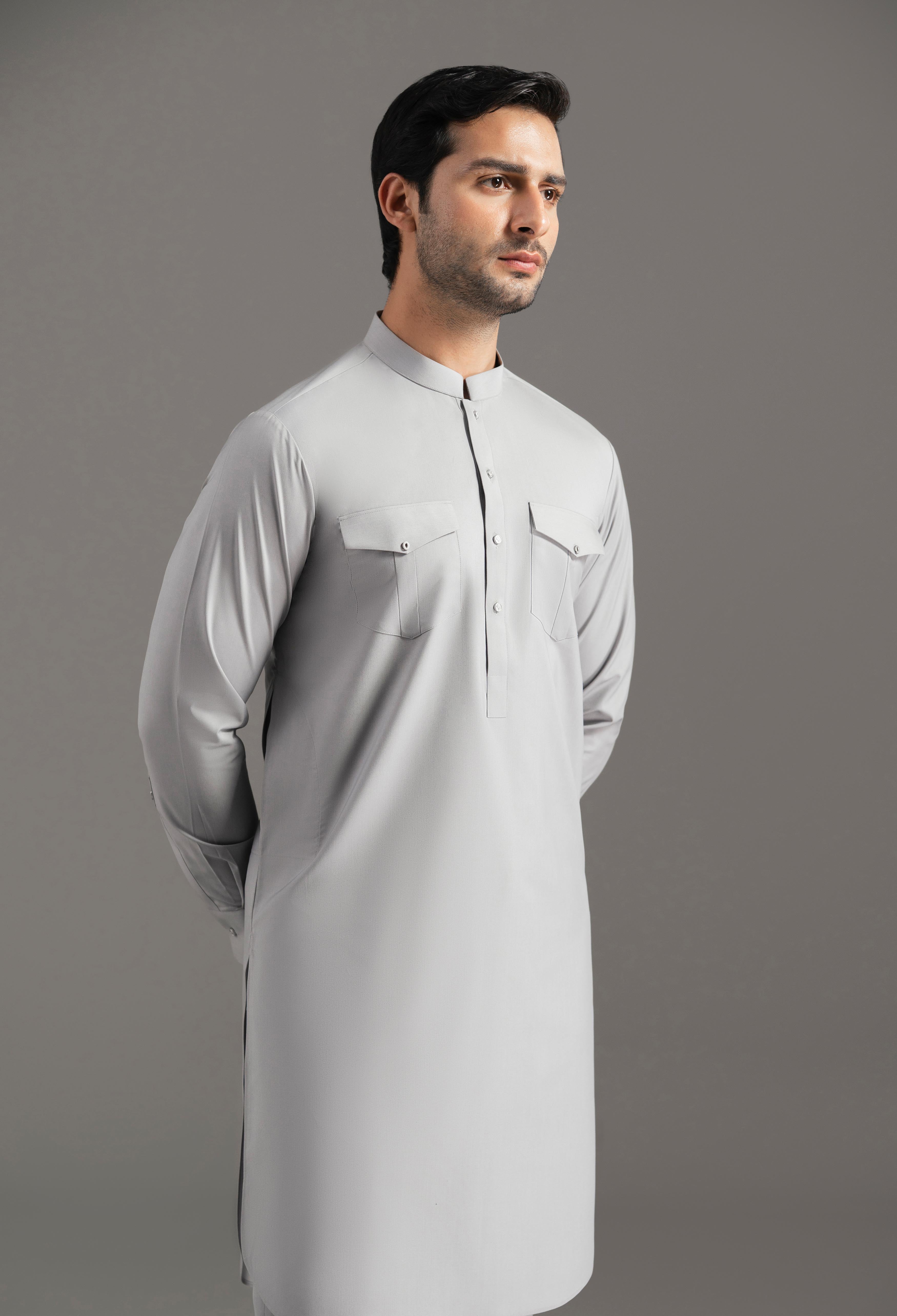 A modern essential designed for winter sophistication, this ensemble features a short, knee-length shirt paired with a new straight pant pajama. The kurta is cut in a contemporary silhouette that emphasizes clean lines and refined construction. It has a 1.1-inch straight band collar with contrast fabric (Superior Blend Mosaic Grey) piping inside the collar and along the button placket, adding subtle elegance.