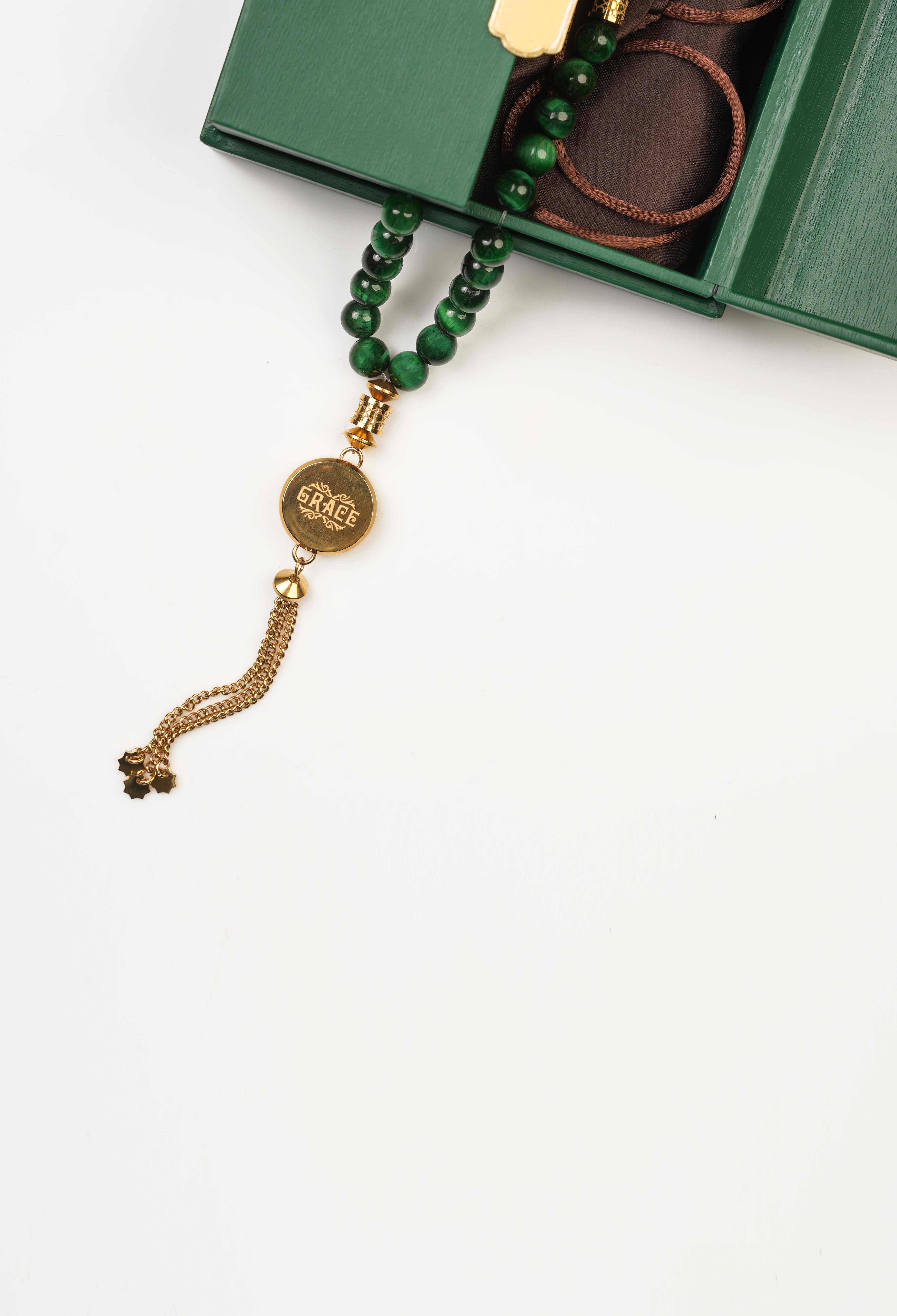 Balance, Focus. Complete with velvet pouch & elegant packaging. Genuine 8mm beads with golden spacer markers. Perfect gift with antique-like charm.