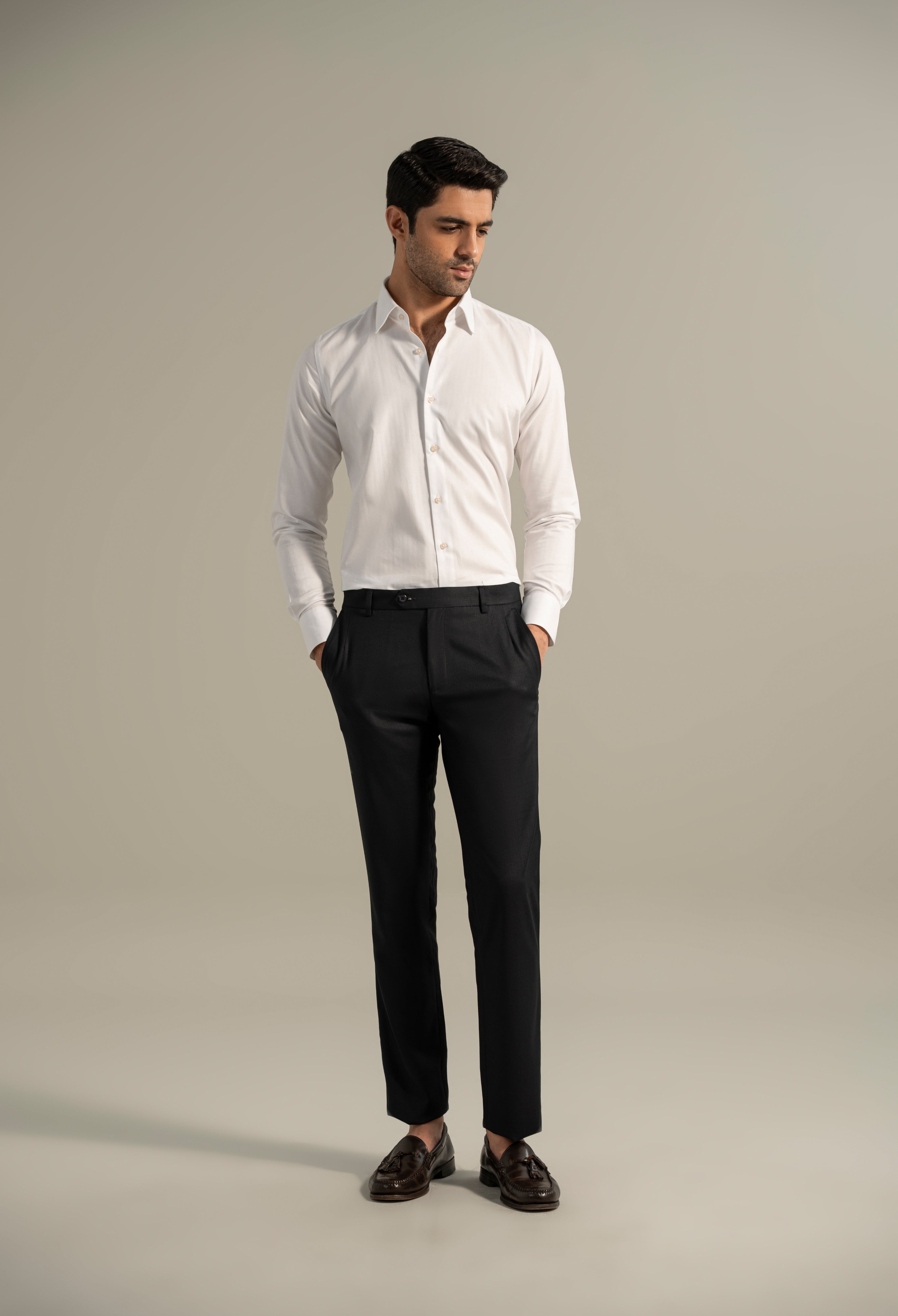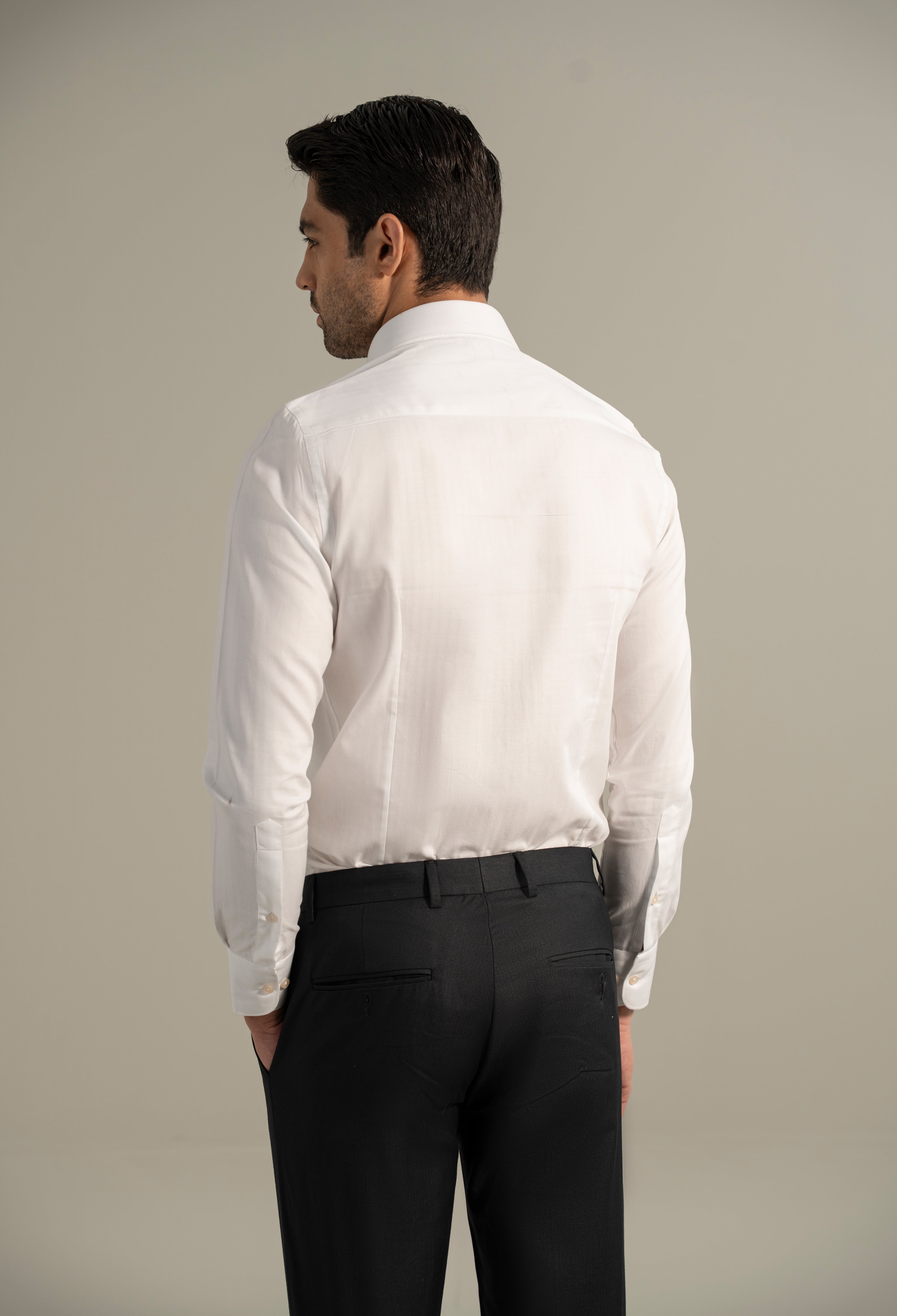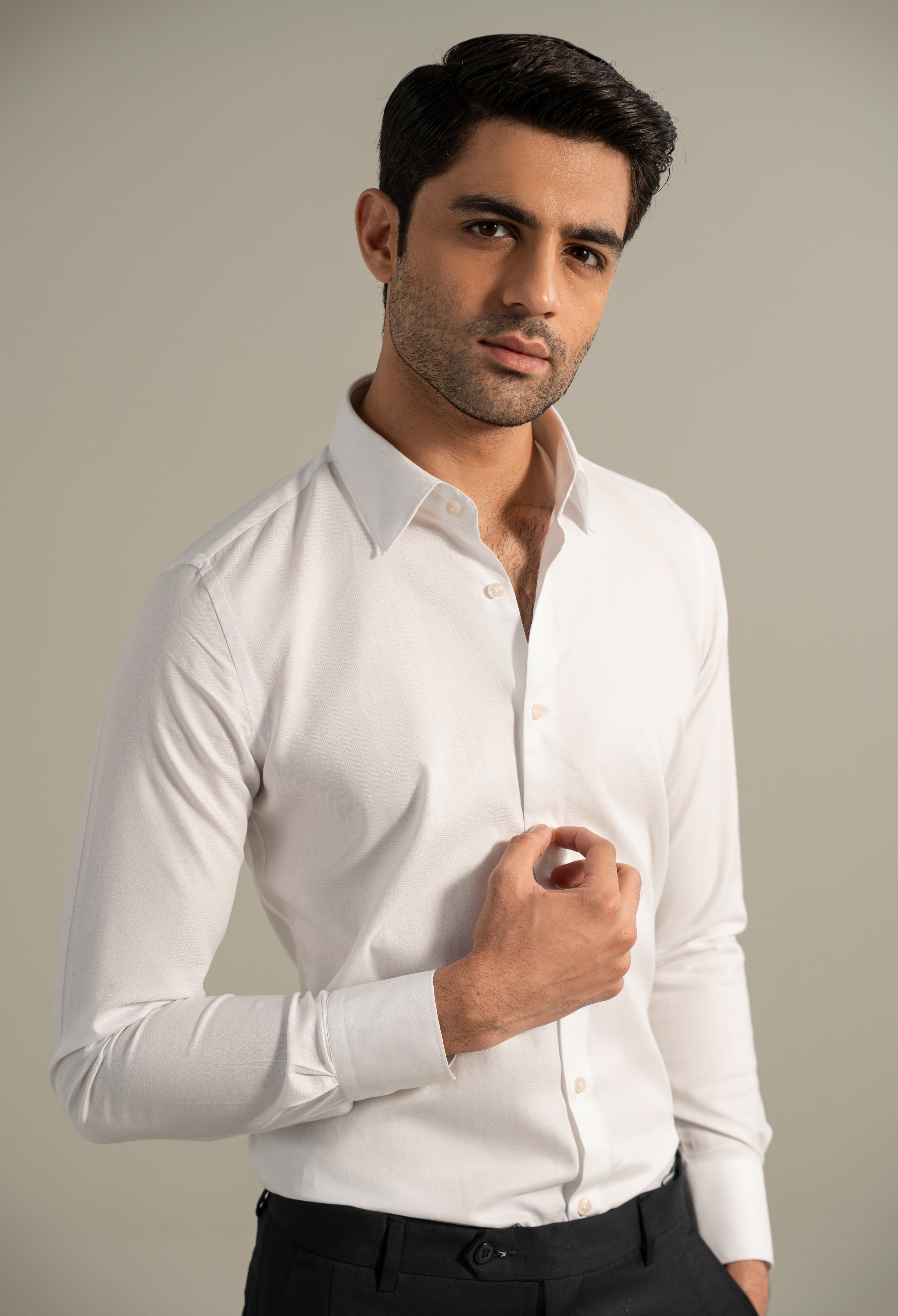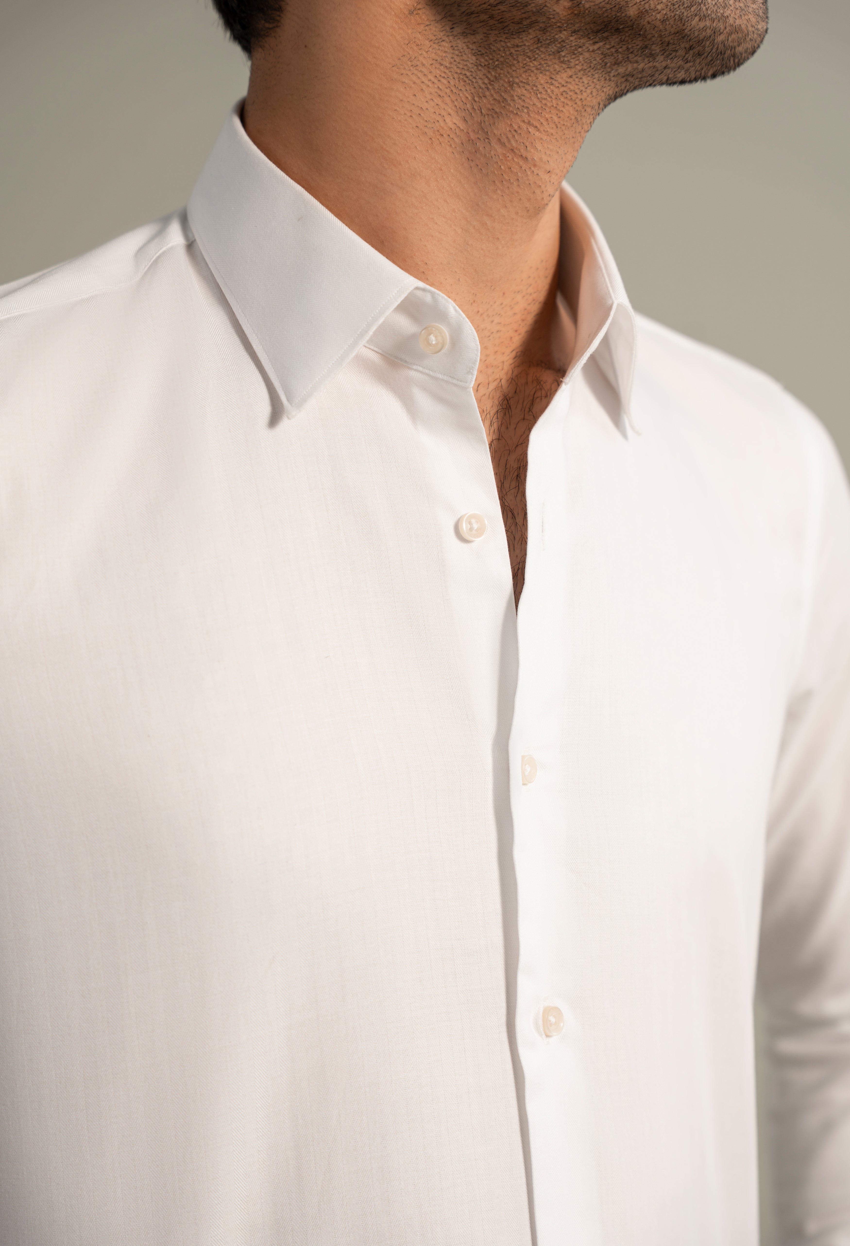 Azure White shirt features expert tailoring with a round hem and cut cuffs for a refined silhouette. It includes durable plastic buttons and a customized shirt collar designed for both comfort and style. The plain button placket maintains a clean, classic look, crafted precisely to match sample specifications for consistent quality and fit.