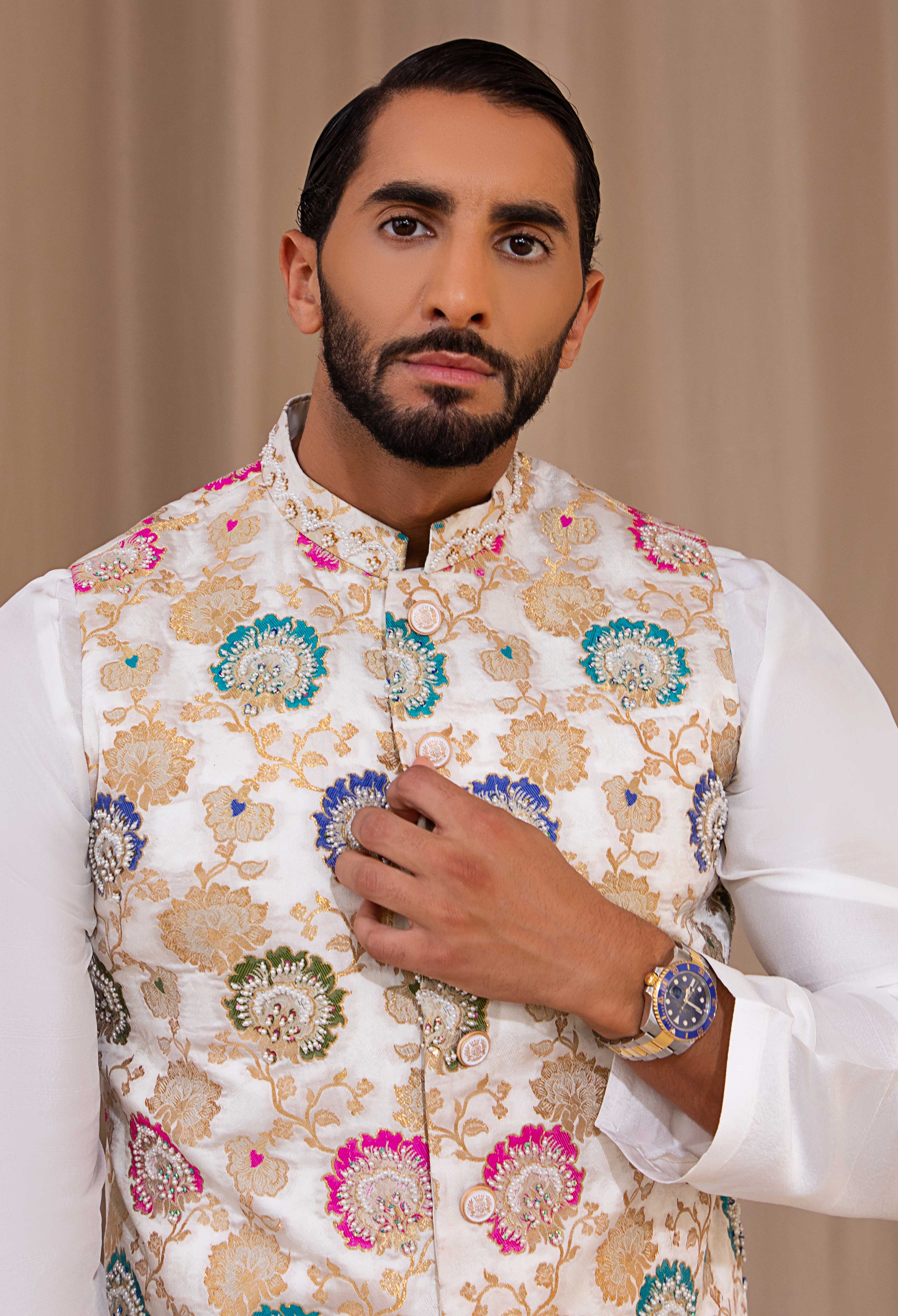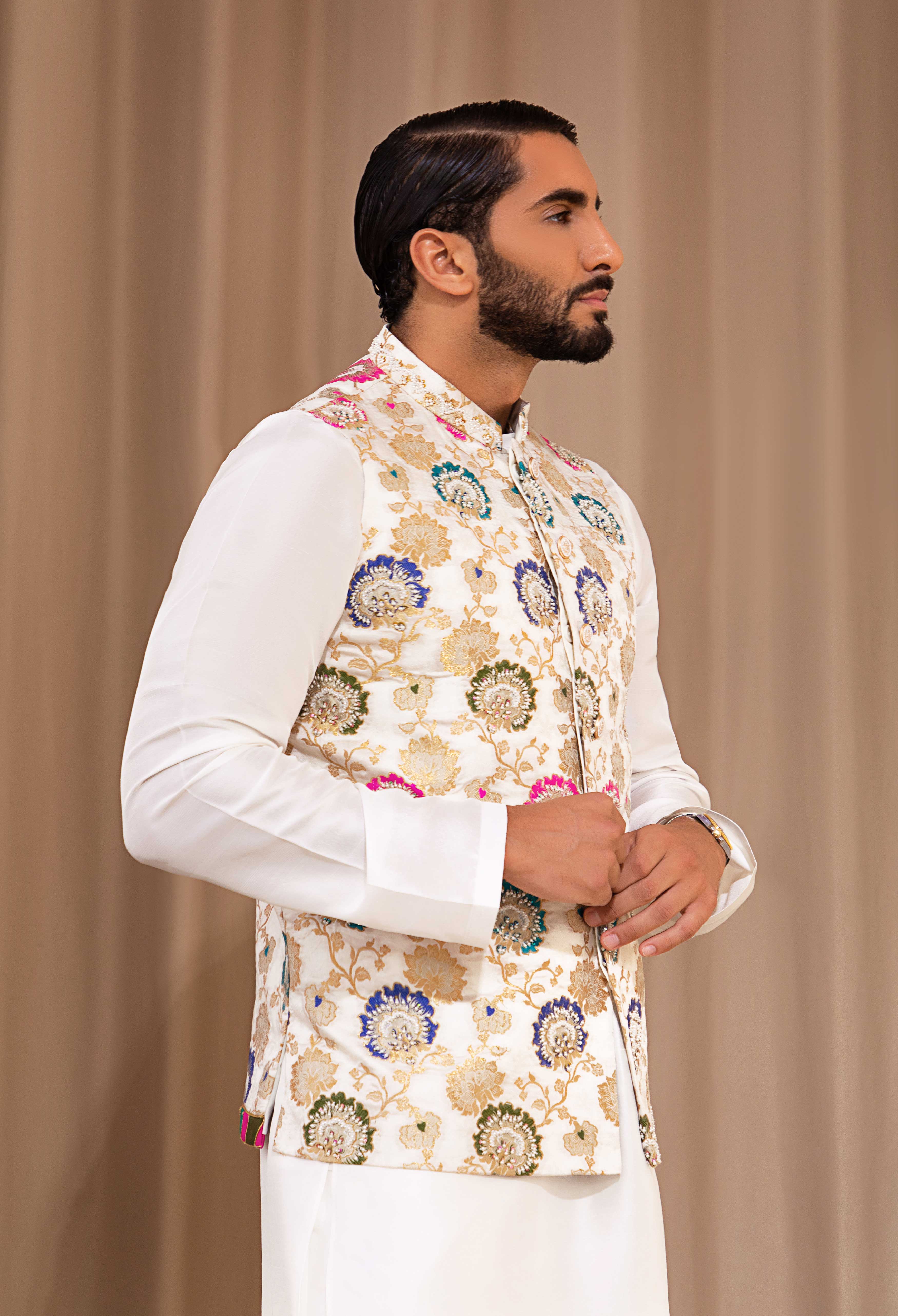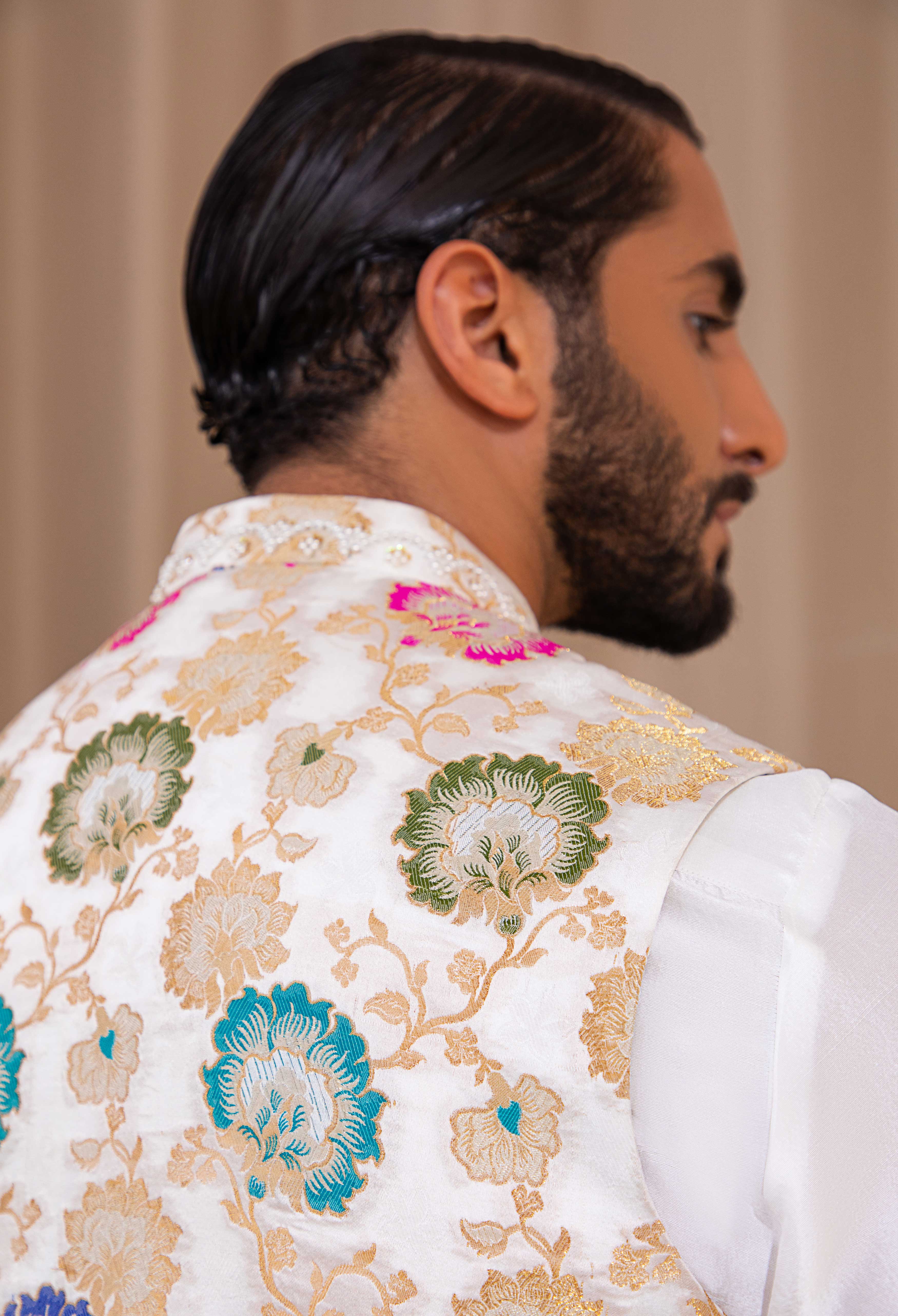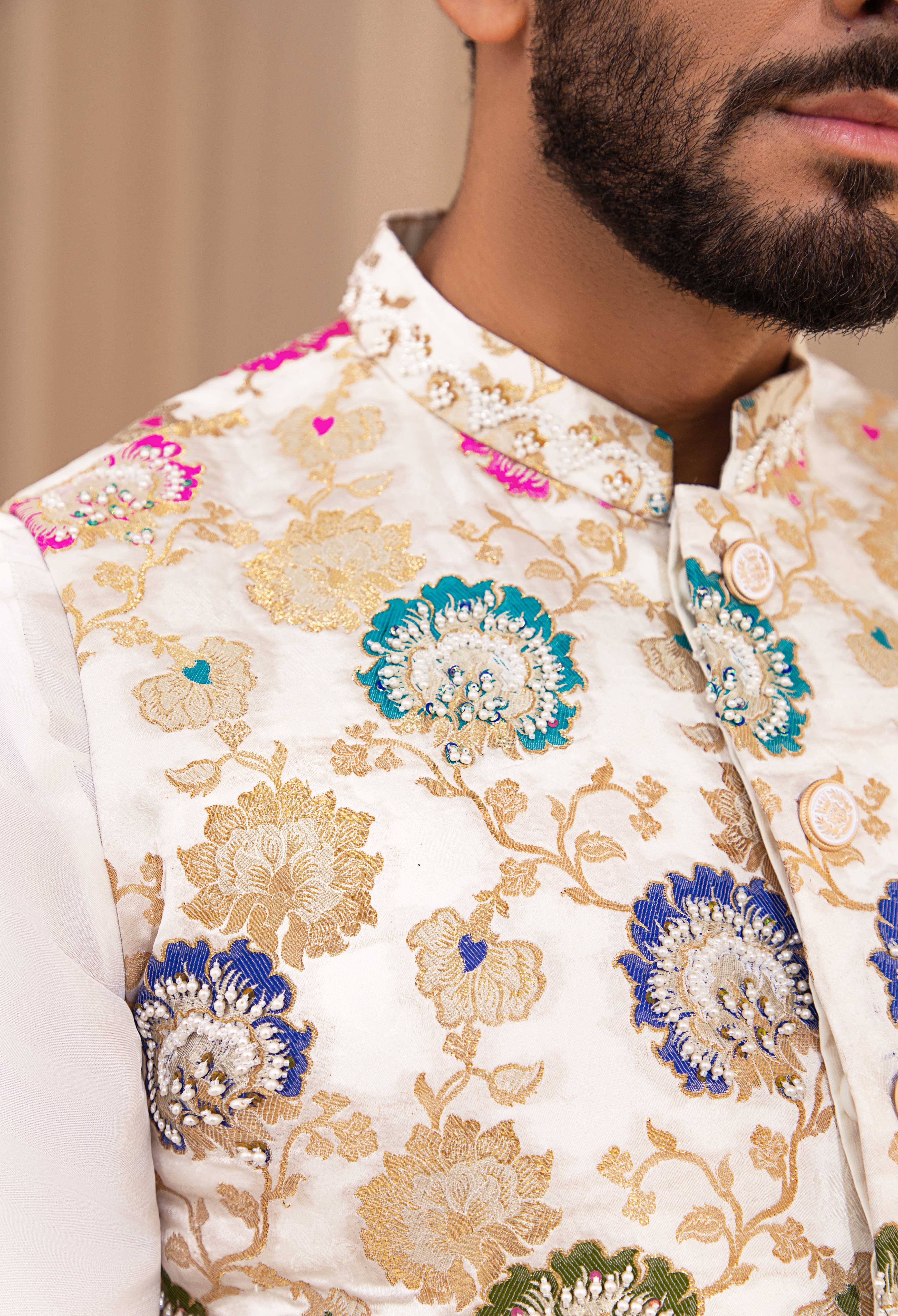 Description: Experience comfort and luxury with Bahar e Nau waistcoat Constructed with luxe satin in a multi-Jaal pattern, each piece features intricate cut dana, lustrous pearl sequences, and eye-catching tilla adornments.