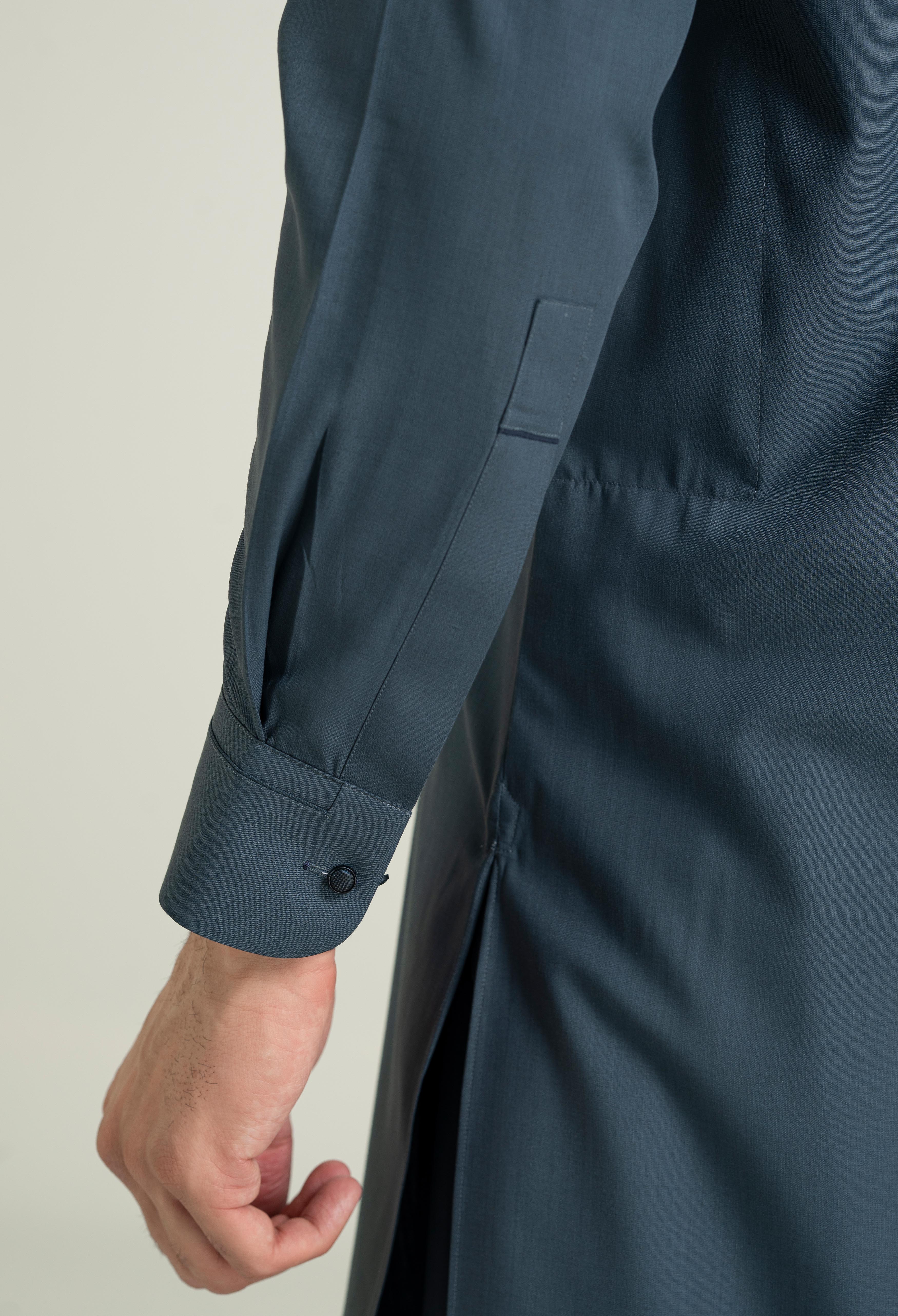 Rounded cuffs, a curved hem, and straight-stitched buttonholes add softness and simplicity. Contrast piping on the collar and cuffs brings a subtle accent, balancing tradition with contemporary style.