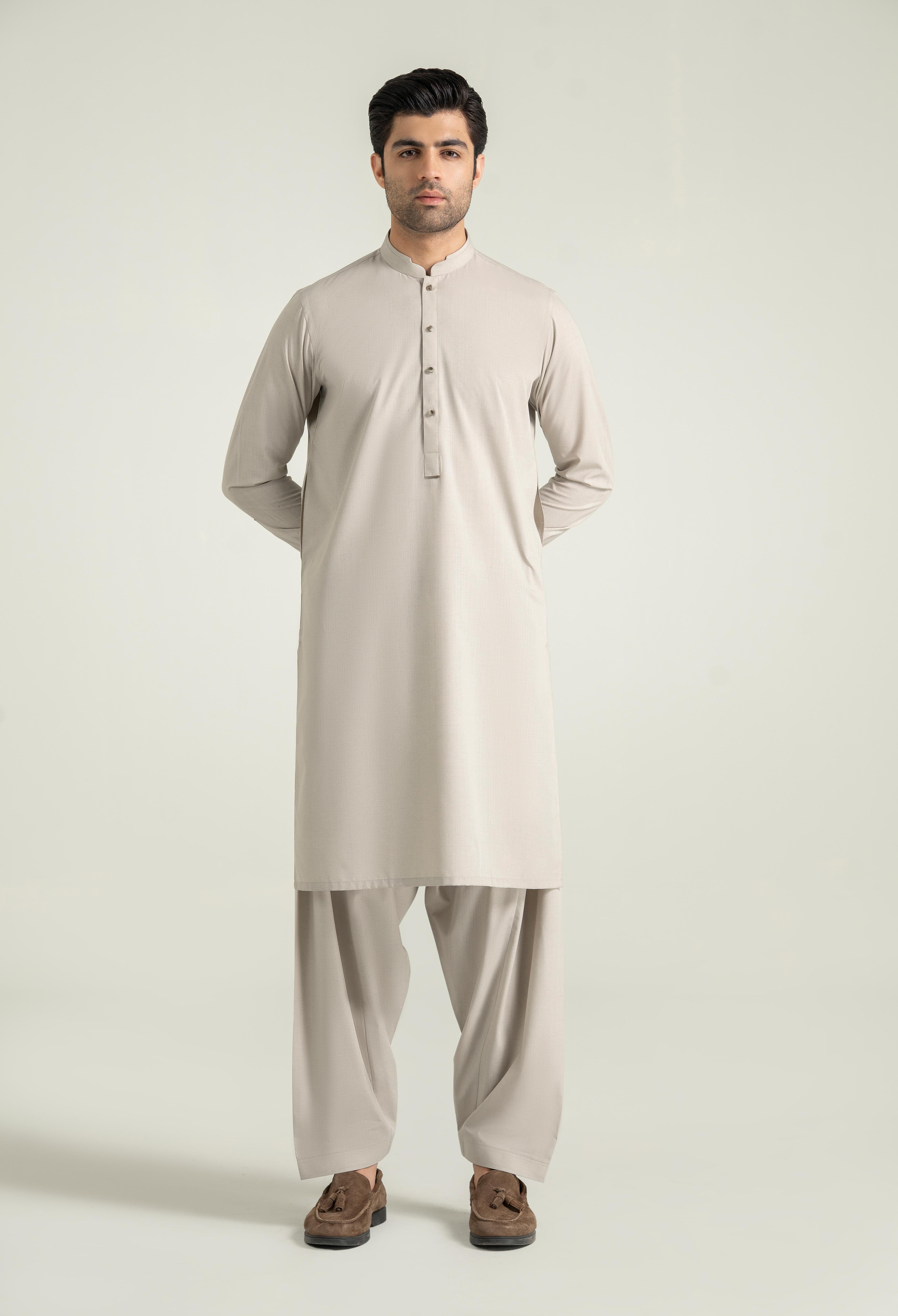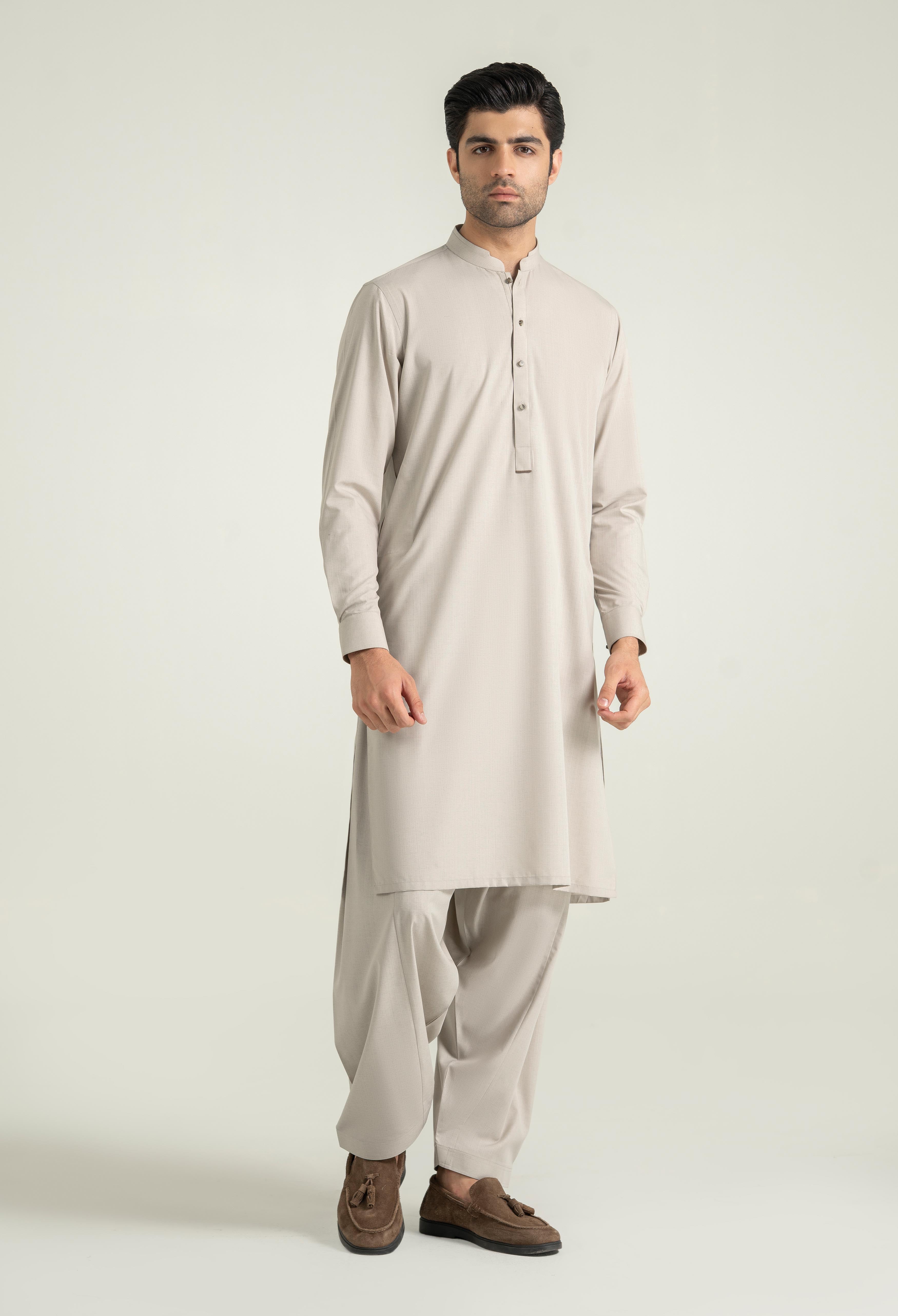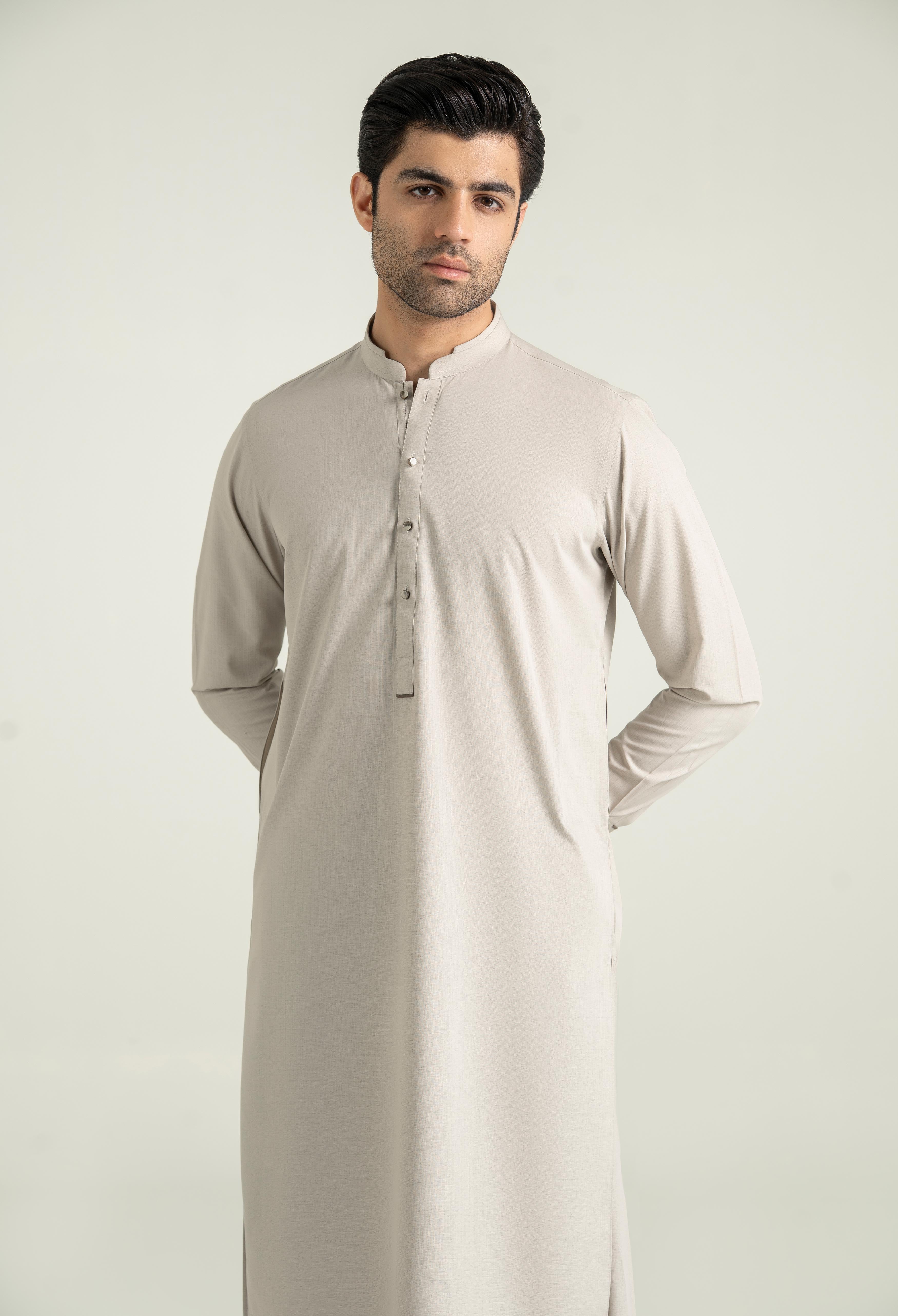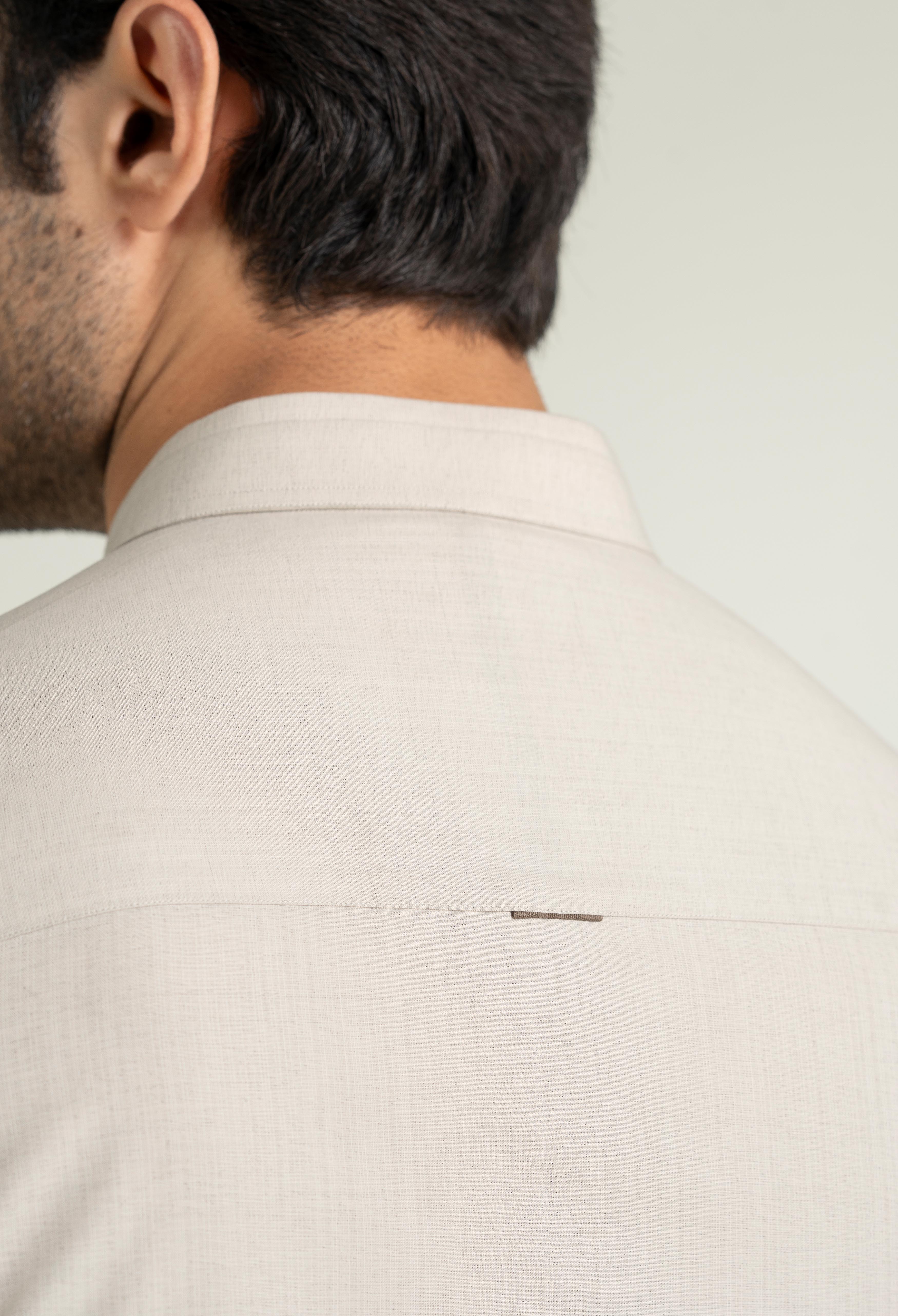 This article features a subtle band collar accented with contrast piping for a sharp, tailored look. The front placket and rounded cuffs are finished with small fabric patch detailing, adding sophisticated look..