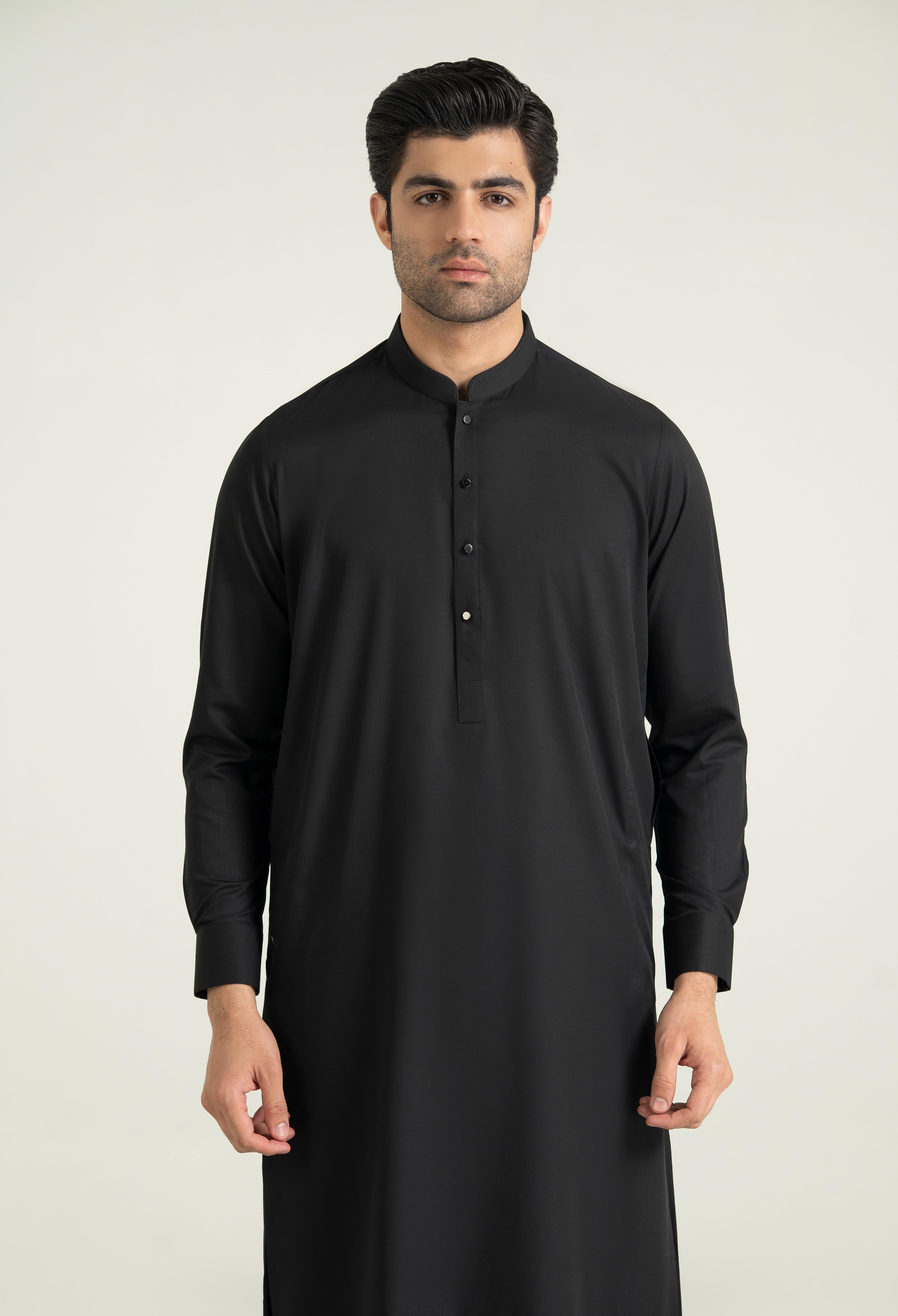 This thoughtfully designed shalwar kameez collection features a round band collar paired with straight cuffs, offering a clean and contemporary look. Intricate arrowhead embroidered stitch embellishes the half band collar, cuffs, and back shoulder, adding distinctive craftsmanship to the design. Contrast print fabric is used on the inside of the band collar, inside back label, and inside cuffs, enhancing the garment with subtle visual interest. The outfit is completed with a 1-inch placket, 2.5-inch straight cuffs, a straight hand-stitched hem, and two side pockets, blending functionality with refined detailing.