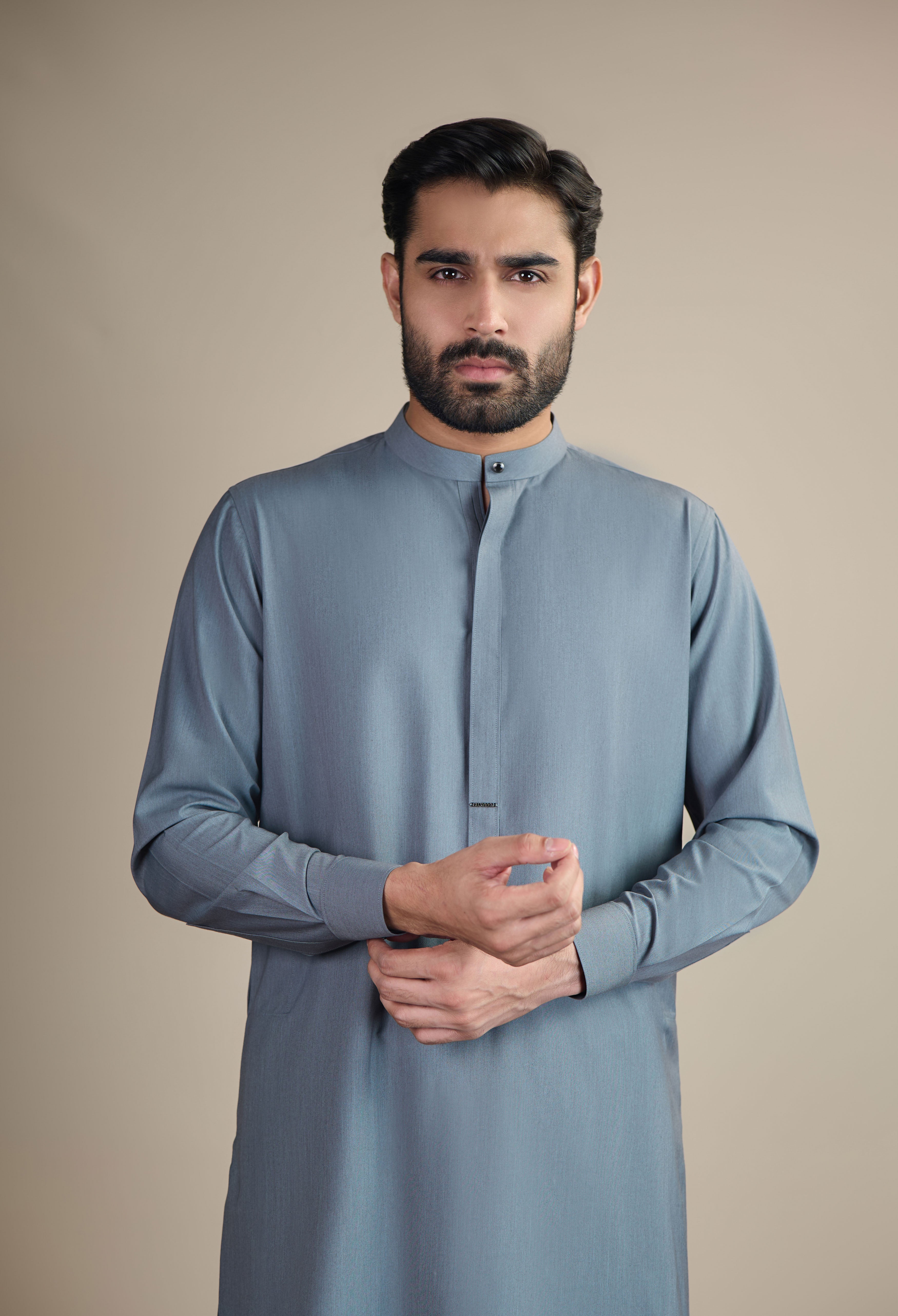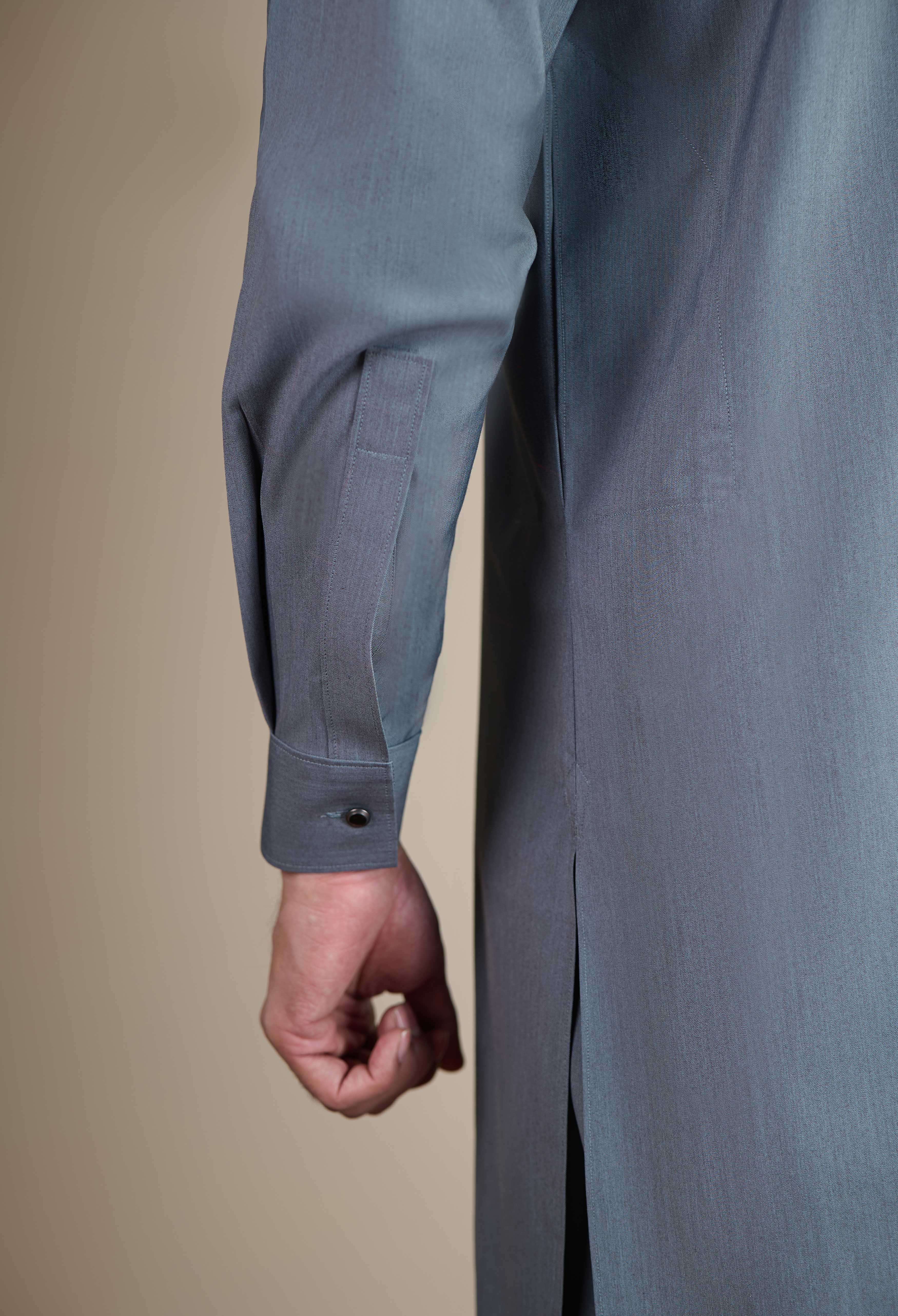 Inspired by the heritage of Eastern menswear and thoughtfully reimagined for the winter season, this piece reflects a refined interplay of structure, detail, and modern craftsmanship designed for both formal and semi-formal settings. The silhouette is clean and minimal, featuring a straight hem and straight cuffs measuring 2.25 inches, paired with a newly patterned band collar for a fresh, contemporary proportion. The front features a hidden placket, with the button placket lined in reverse fabric for subtle contrast and an elevated finish. The back yoke is bias cut for added movement and visual interest, detailed with reverse fabric piping, a refined loop detail, and a metal shaffer stud that adds a modern accent. Half boot stitching is applied to the hidden placket, cuff, collar, sleeve placket, front placket, and back yoke, reinforcing structure with a tailored, handcrafted touch. Inside, a D-shaped panel at the upper back is finished with loops, reverse fabric, and a label patch, adding a signature interior detail. Two side pockets maintain functionality without disrupting the garment’s clean lines. This piece is a considered study in layered detailing and contemporary tailoring anchored in tradition, yet executed with quiet innovation