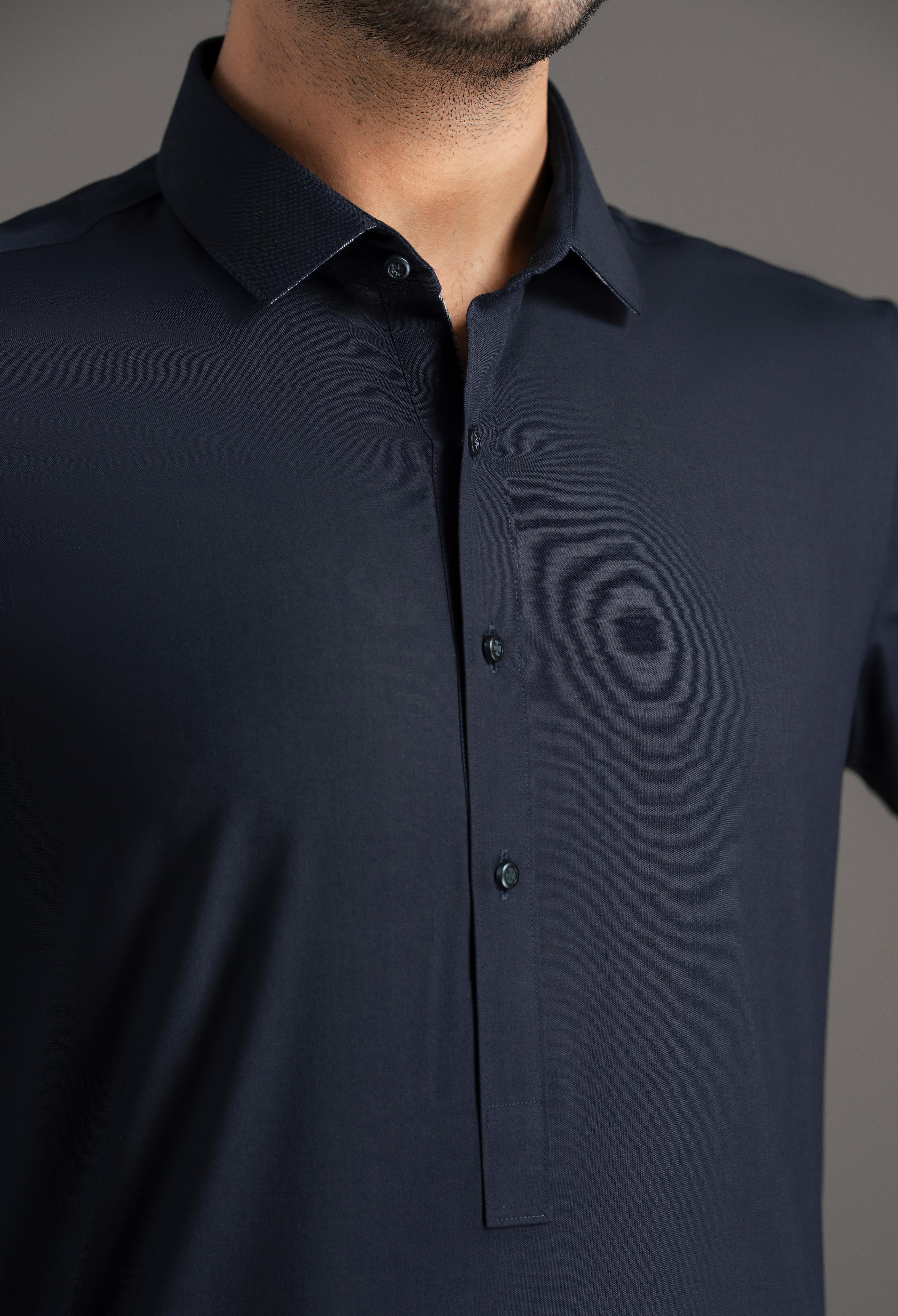 This piece blends classic tailoring with modern design elements, offering both comfort and sophistication. It features a shirt collar and printed fabric used as contrast inside the cuffs and inside back shoulder yoke, with printed fabric piping along the button placket for a subtle accent.