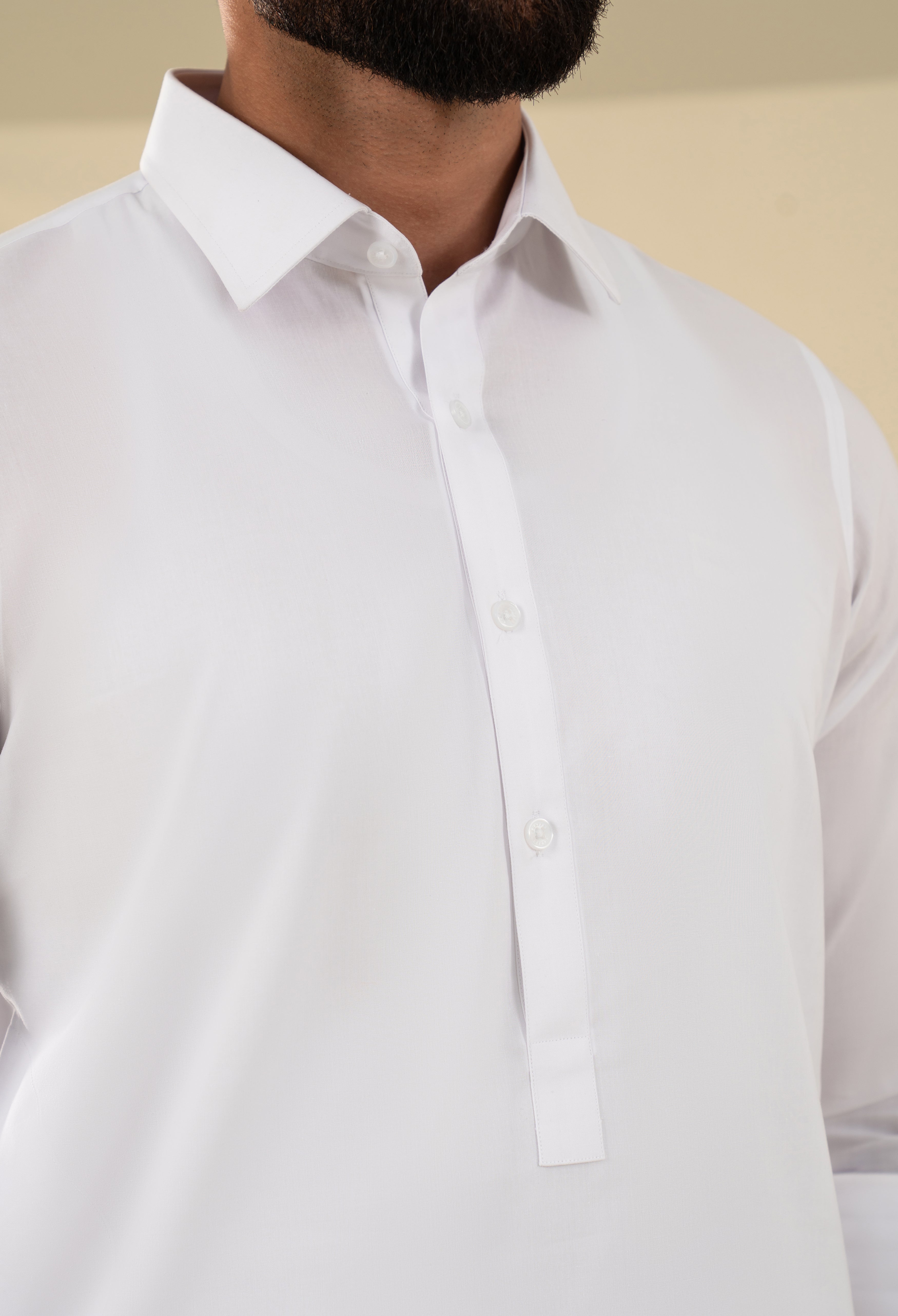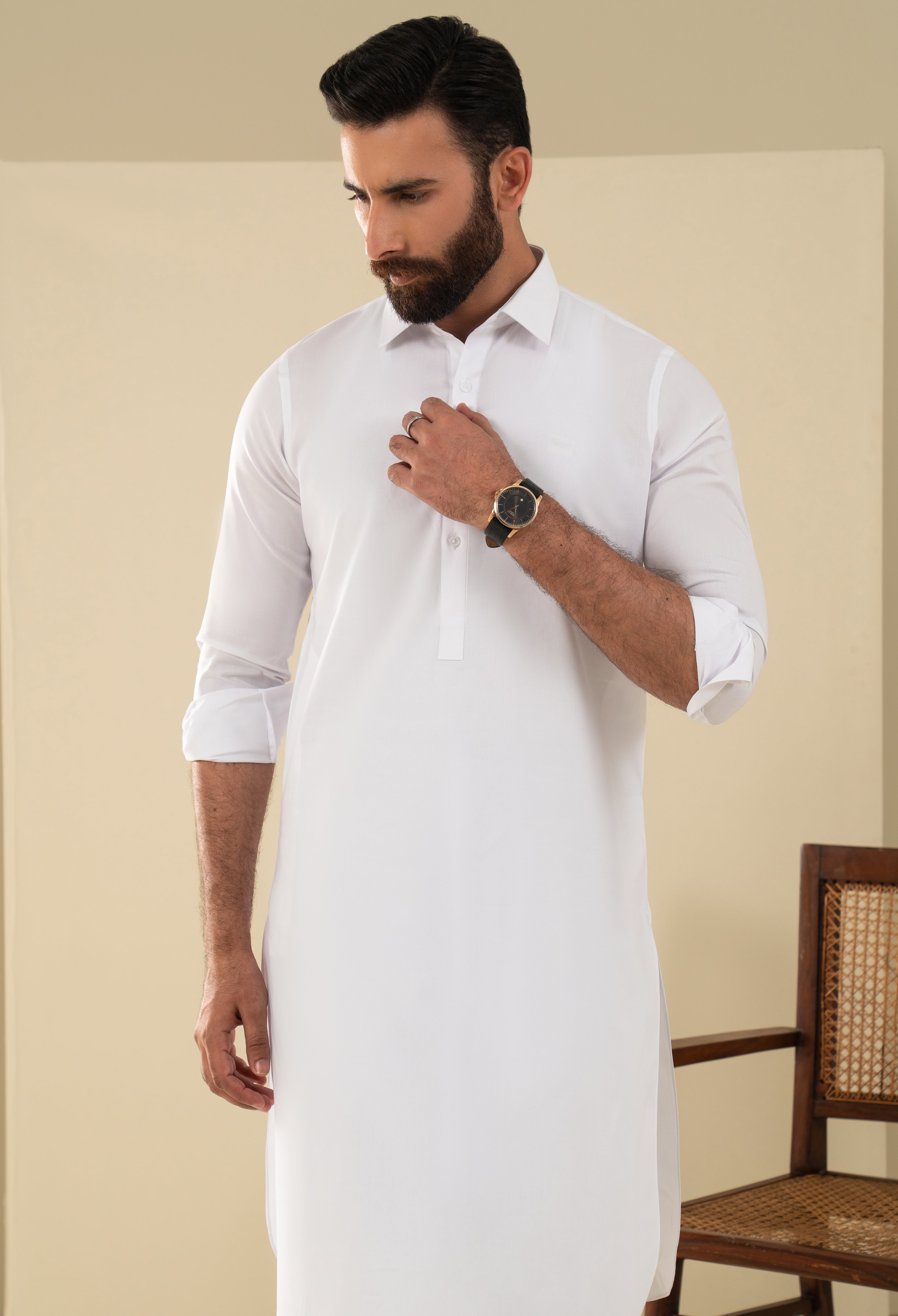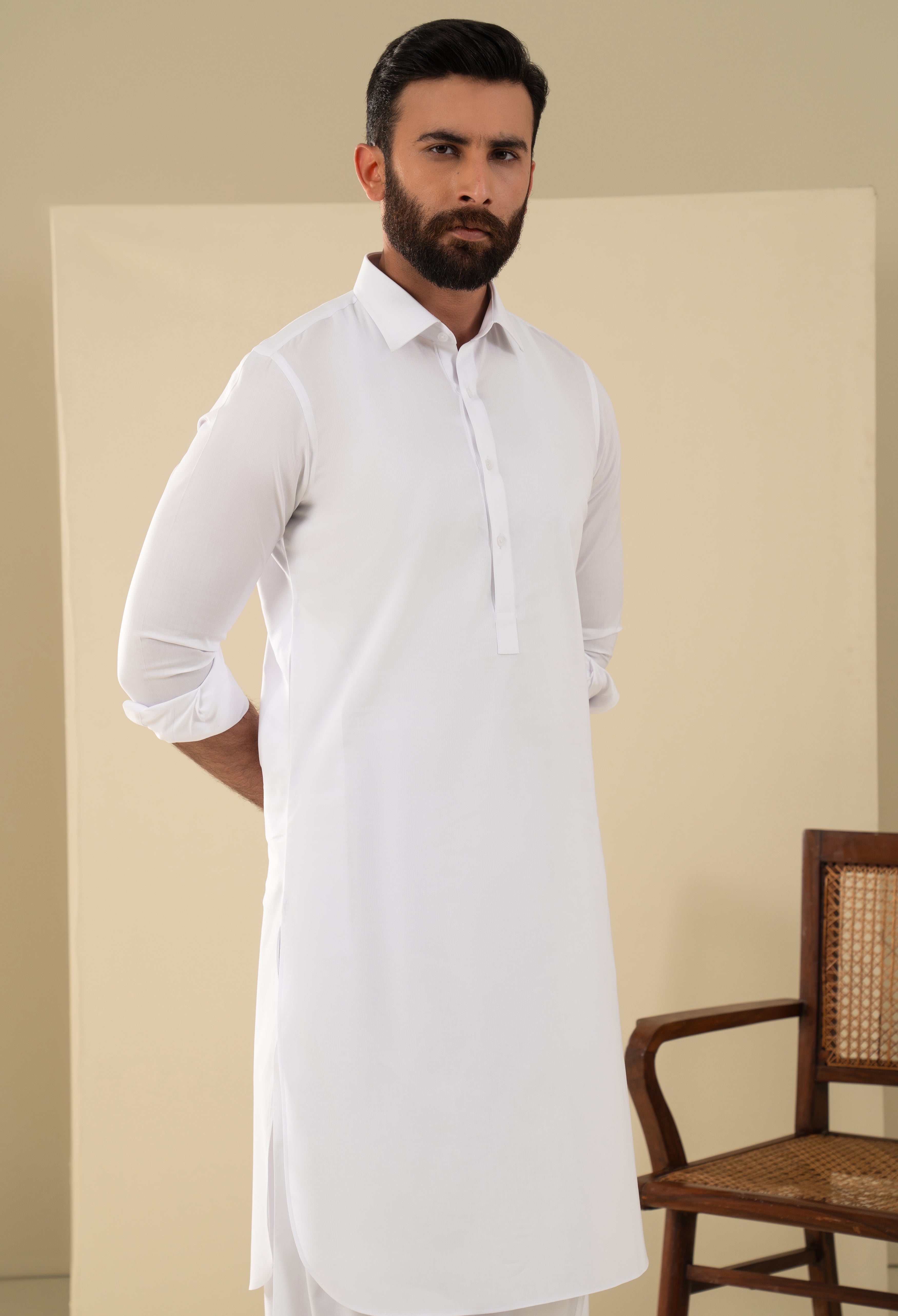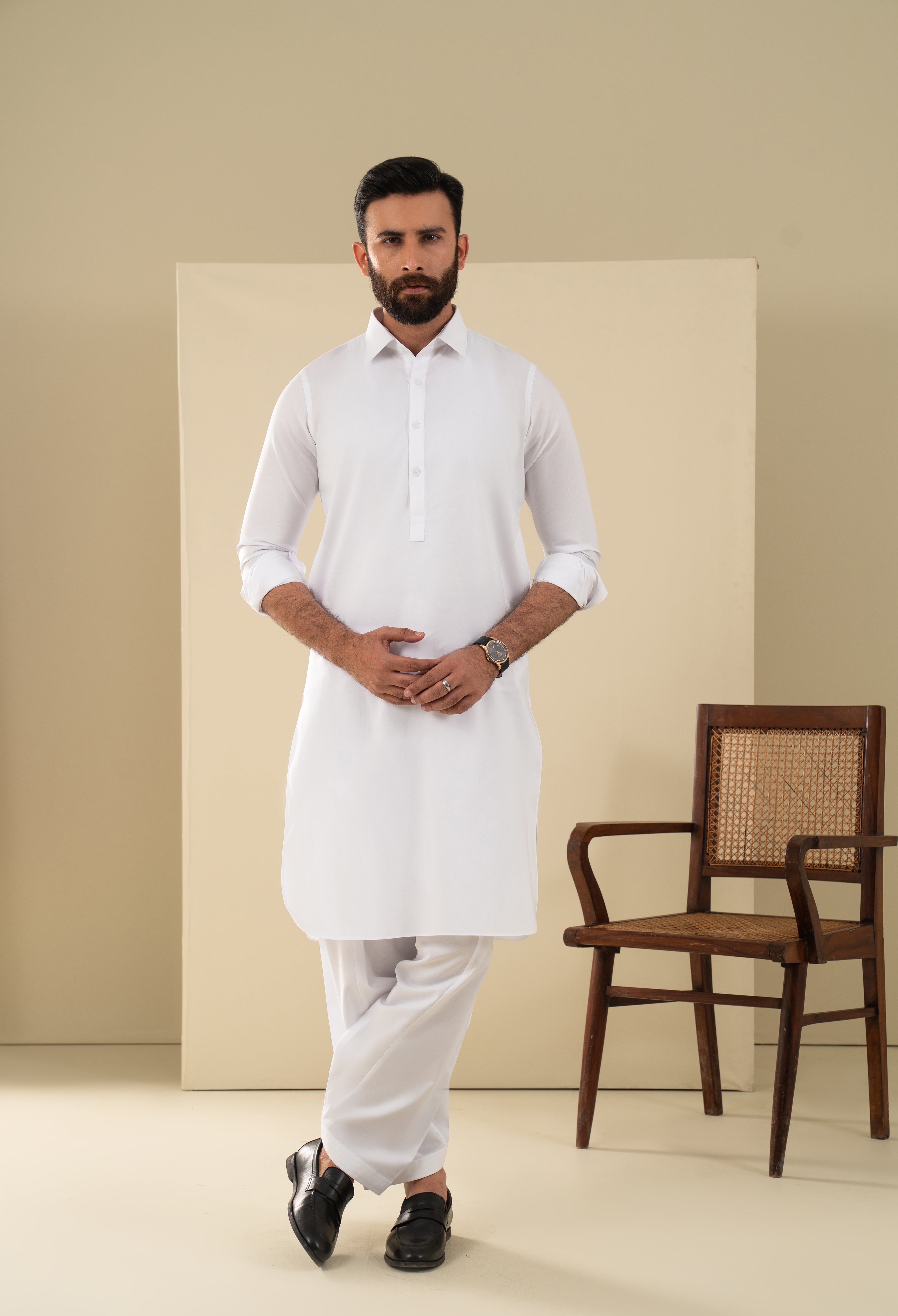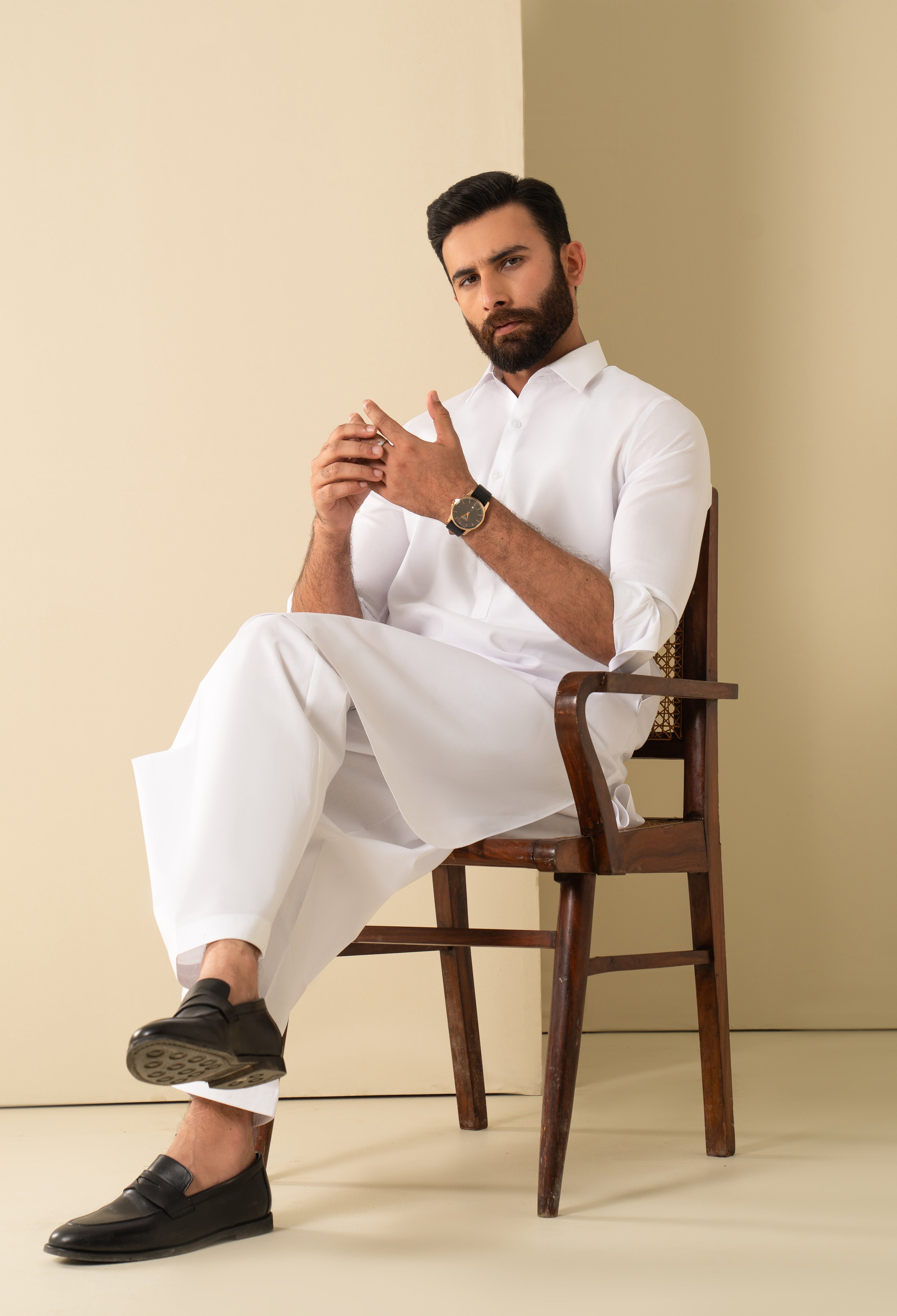 A men’s classic-fit shalwar kameez in Sogo cotton fabric with a shirt collar design blends timeless tradition with a contemporary edge. The breathable cotton ensures comfort and versatility, while the relaxed fit offers effortless grace. The shirt collar adds a modern, structured touch, enhancing the outfit's adaptability for both formal settings. Clean stitching and minimalistic detailing complete the design, emphasizing sophistication and cultural authenticity.