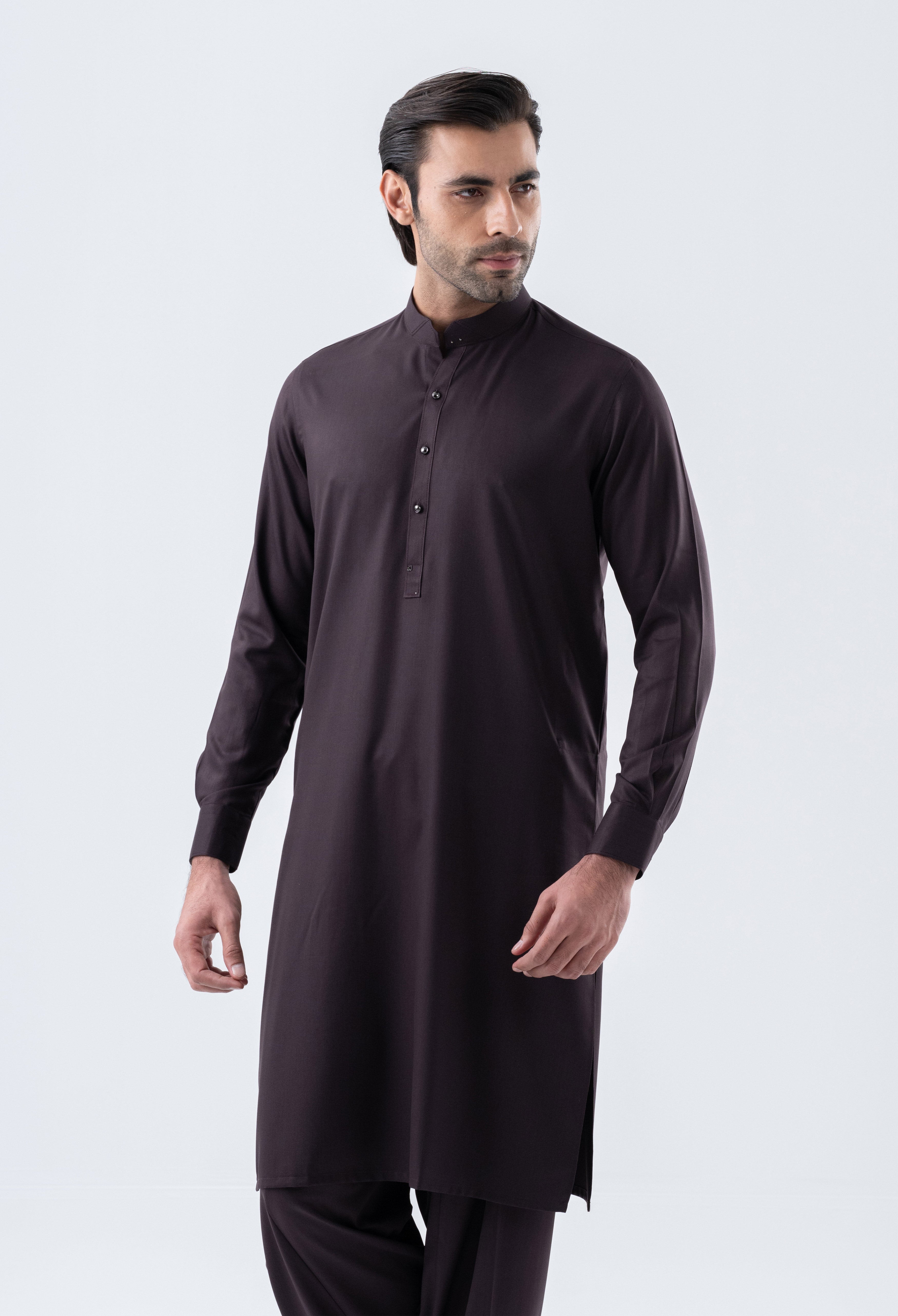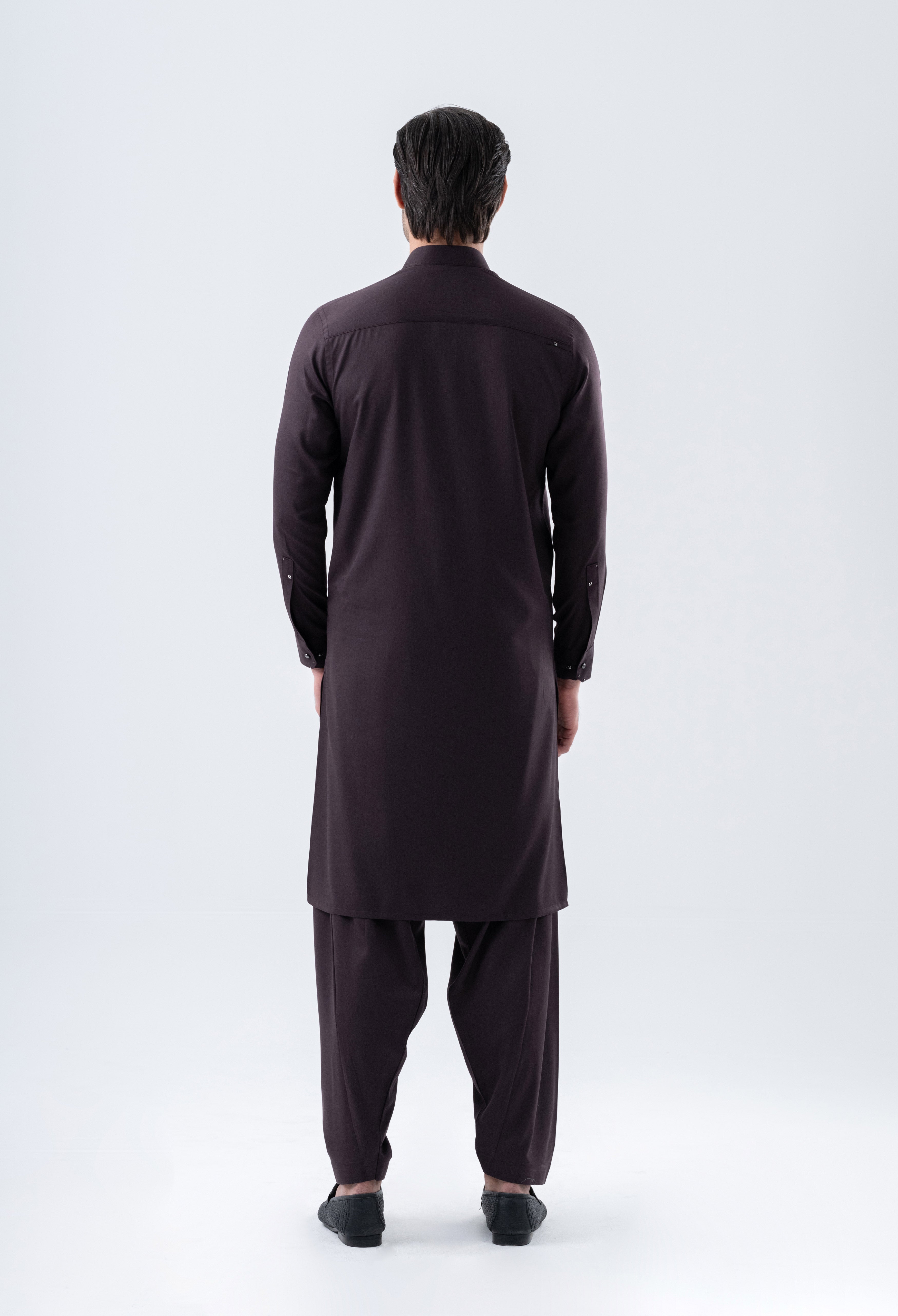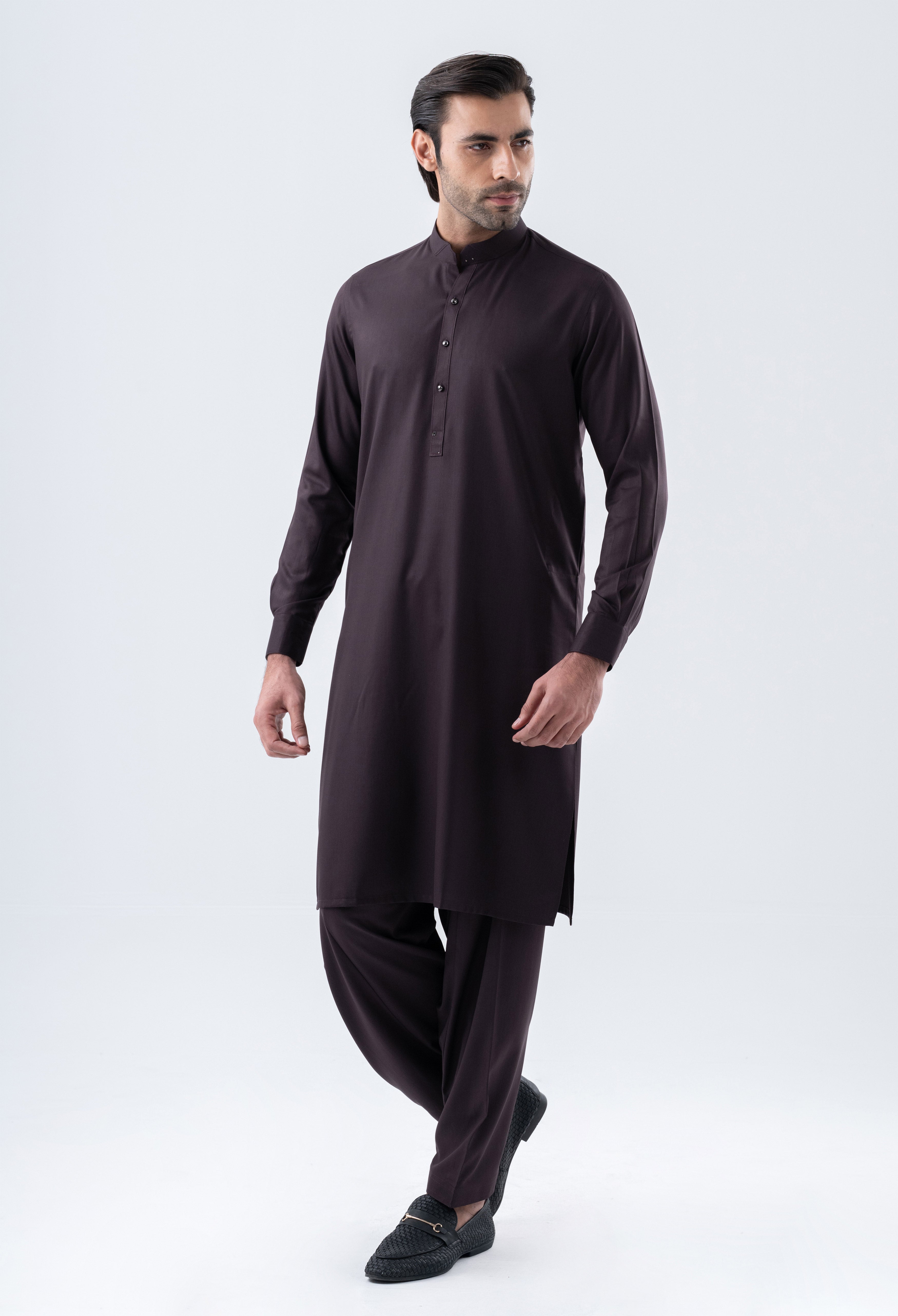 Introducing the ASKARI Shalwar Suit where contemporary style meets traditional elegance. This casual ensemble features a sophisticated band collar, cuffed sleeves, and a straight hem, all enhanced by a matching fabric panel on the collar adorned with commando stitching. The slim fit design ensures a flattering silhouette, while the metal fancy button style adds a touch of modern flair. Thoughtfully crafted with metal accessories on the collar, cuffs, placket, and yoke, the ASKARI is perfect for those who appreciate refined details.