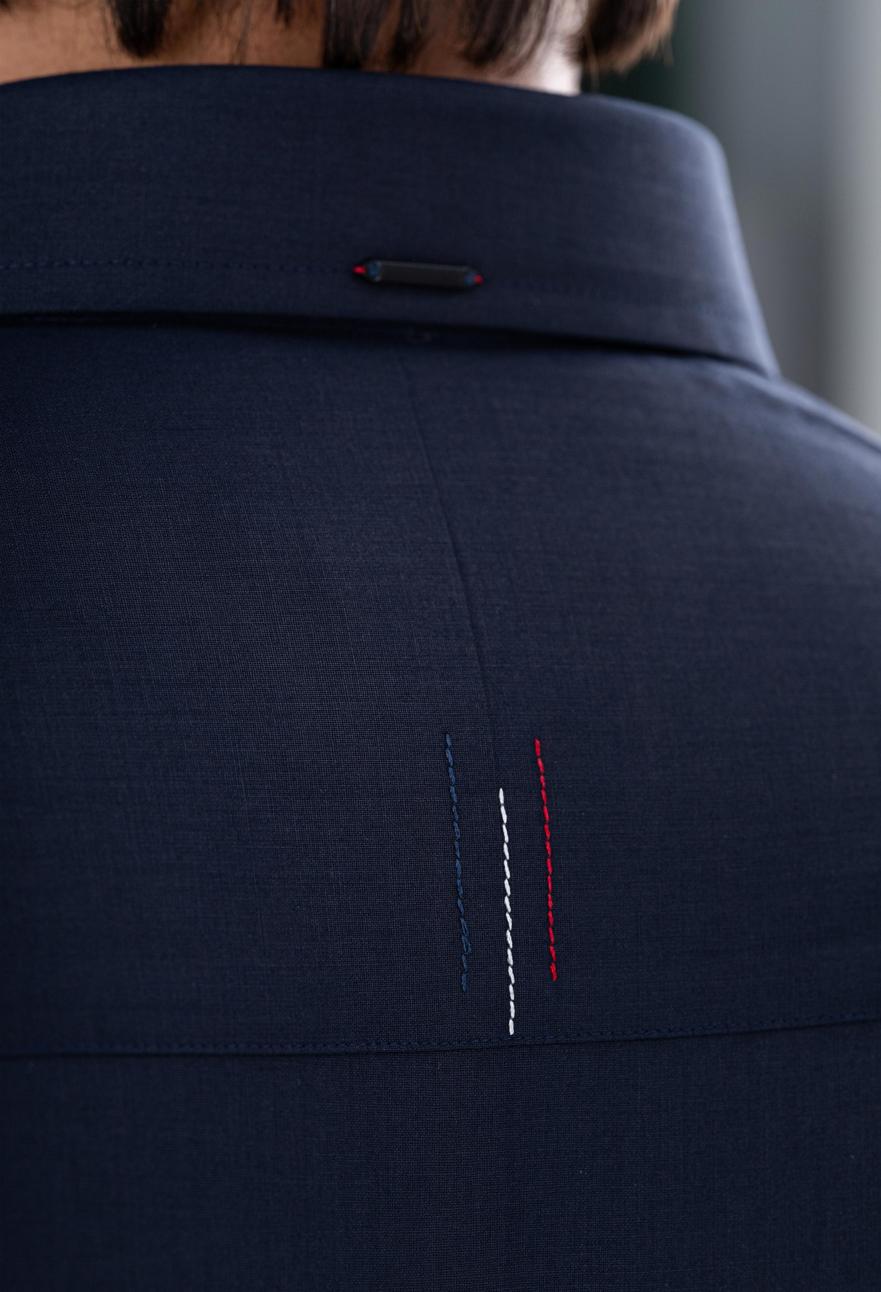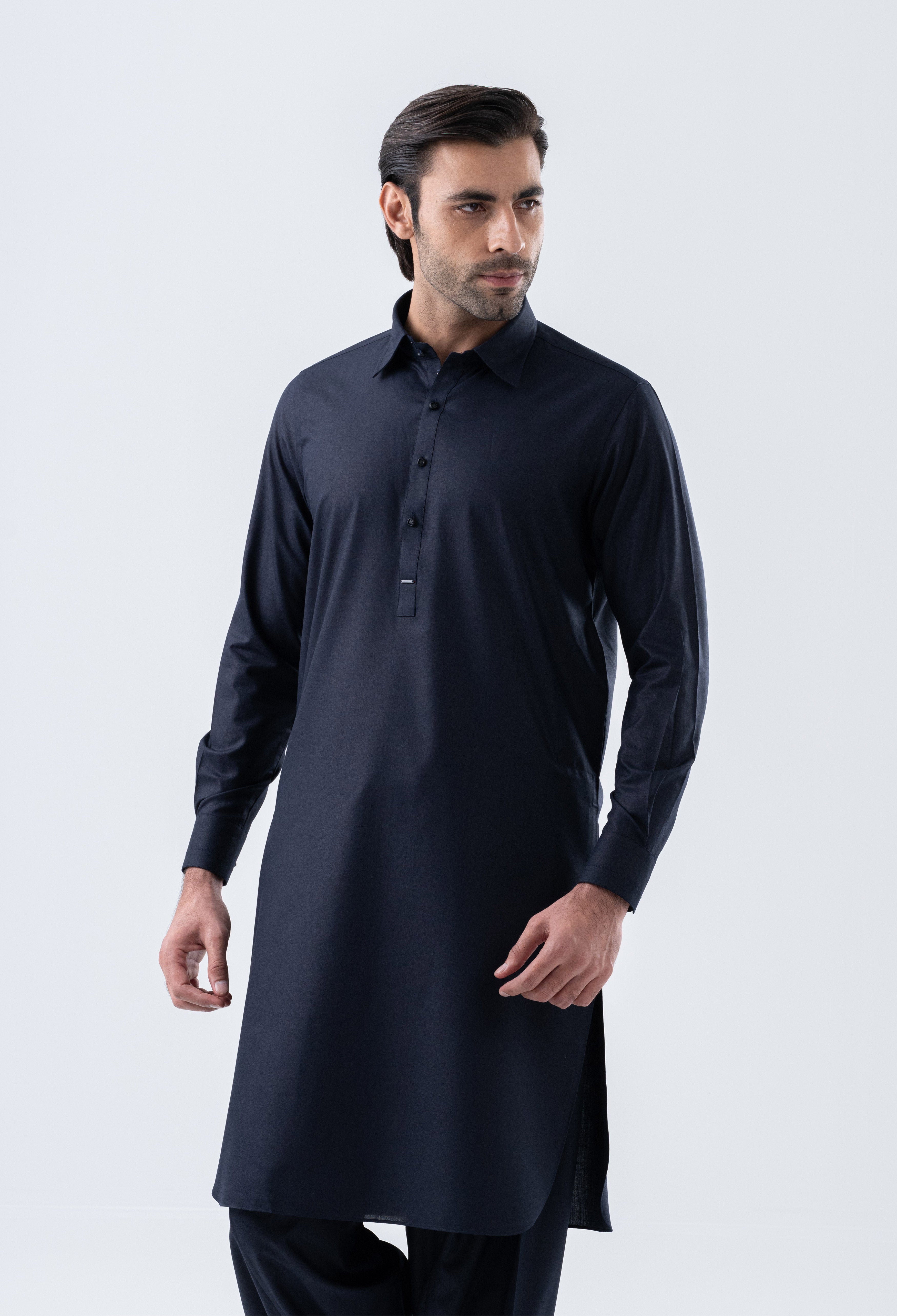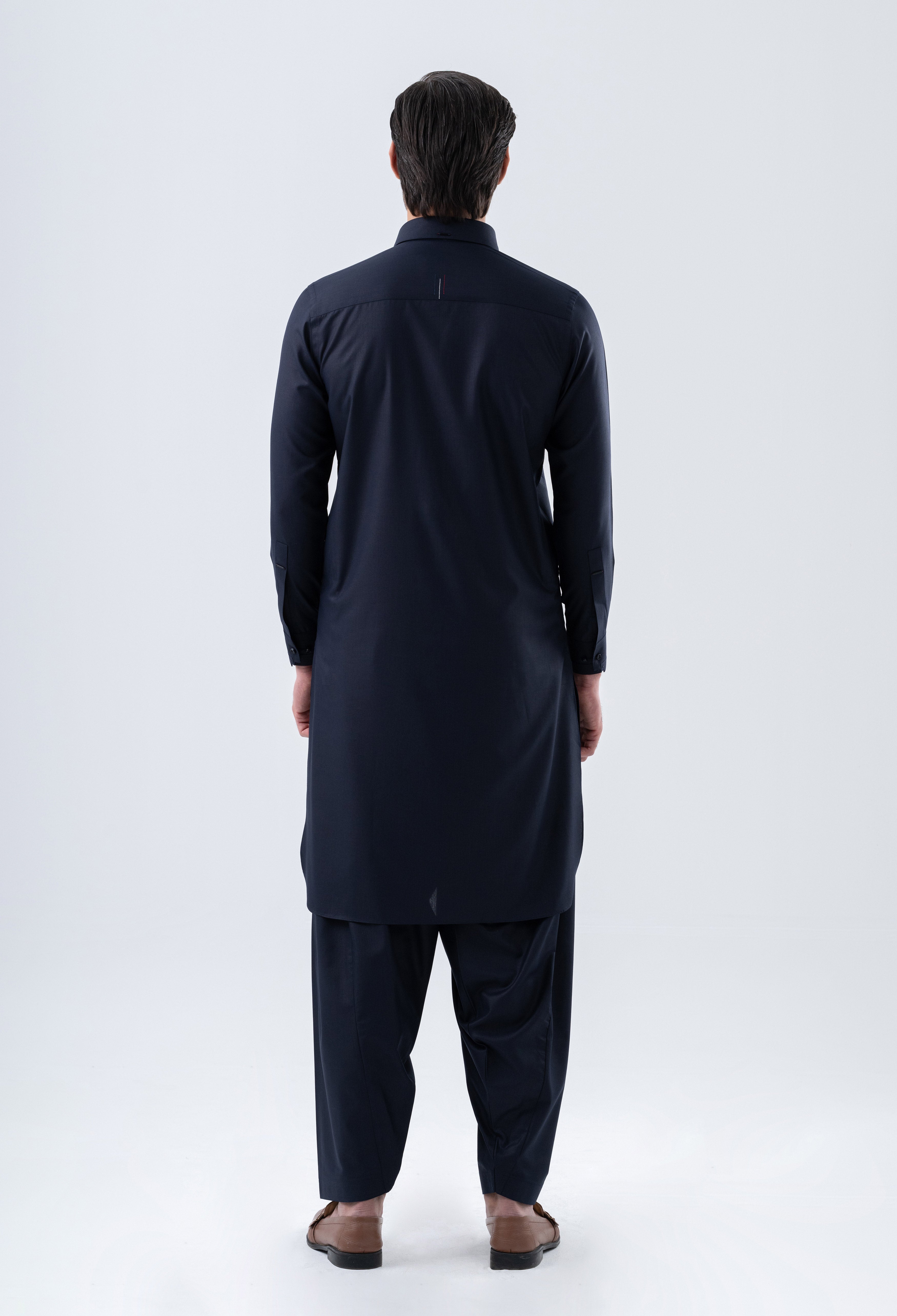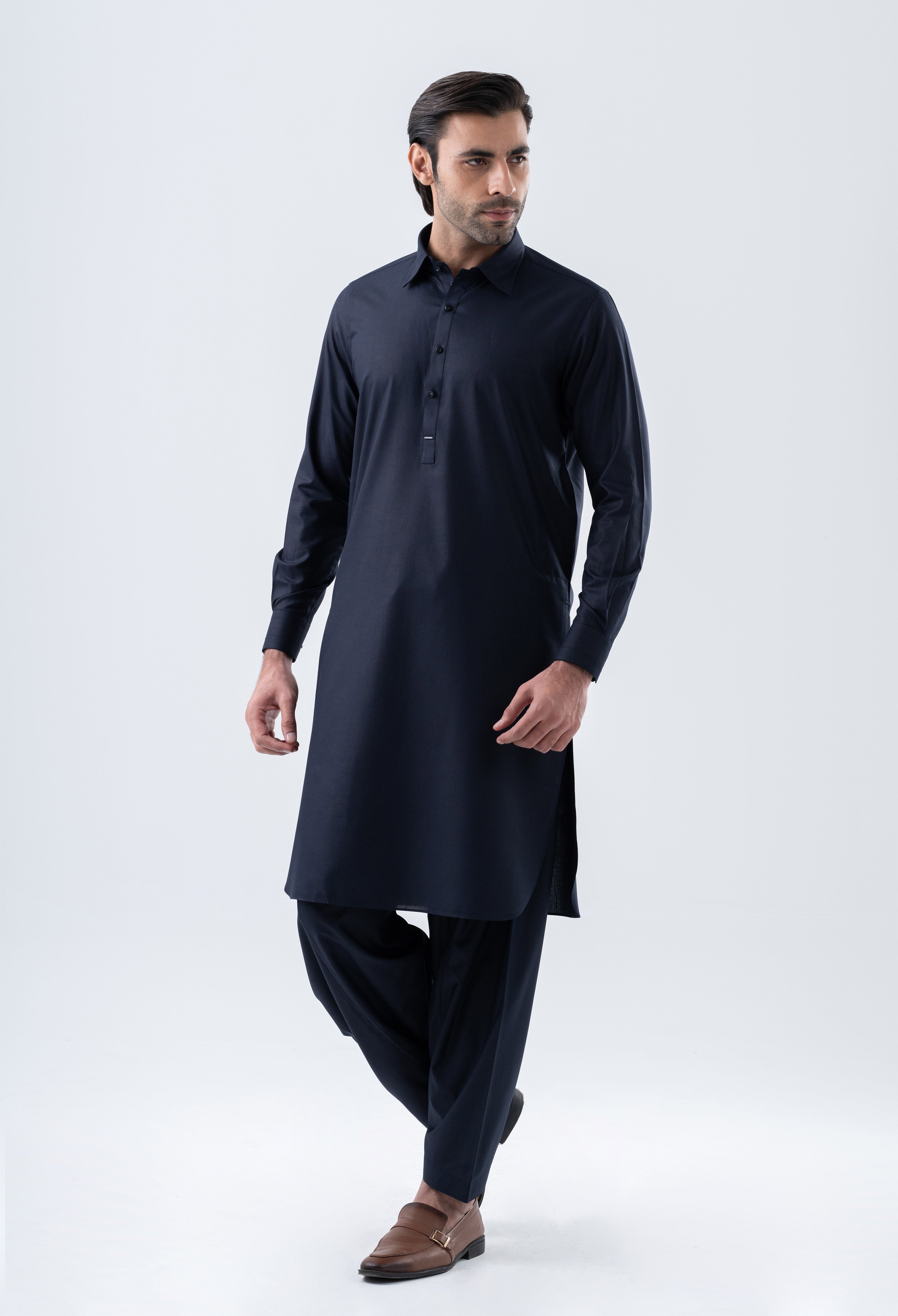 Introducing the BONUS Shalwar Suit—where contemporary style meets traditional elegance. This casual masterpiece features a refined shirt collar, a stylish round hem, and cut cuffs, all designed for a sleek slim fit. The collar band showcases a matching fabric panel adorned with commando stitching and rivets, while metal accessories add a touch of sophistication. Exquisite Resham thread stitching on the yoke and takki detailing on the button placket complete the look.