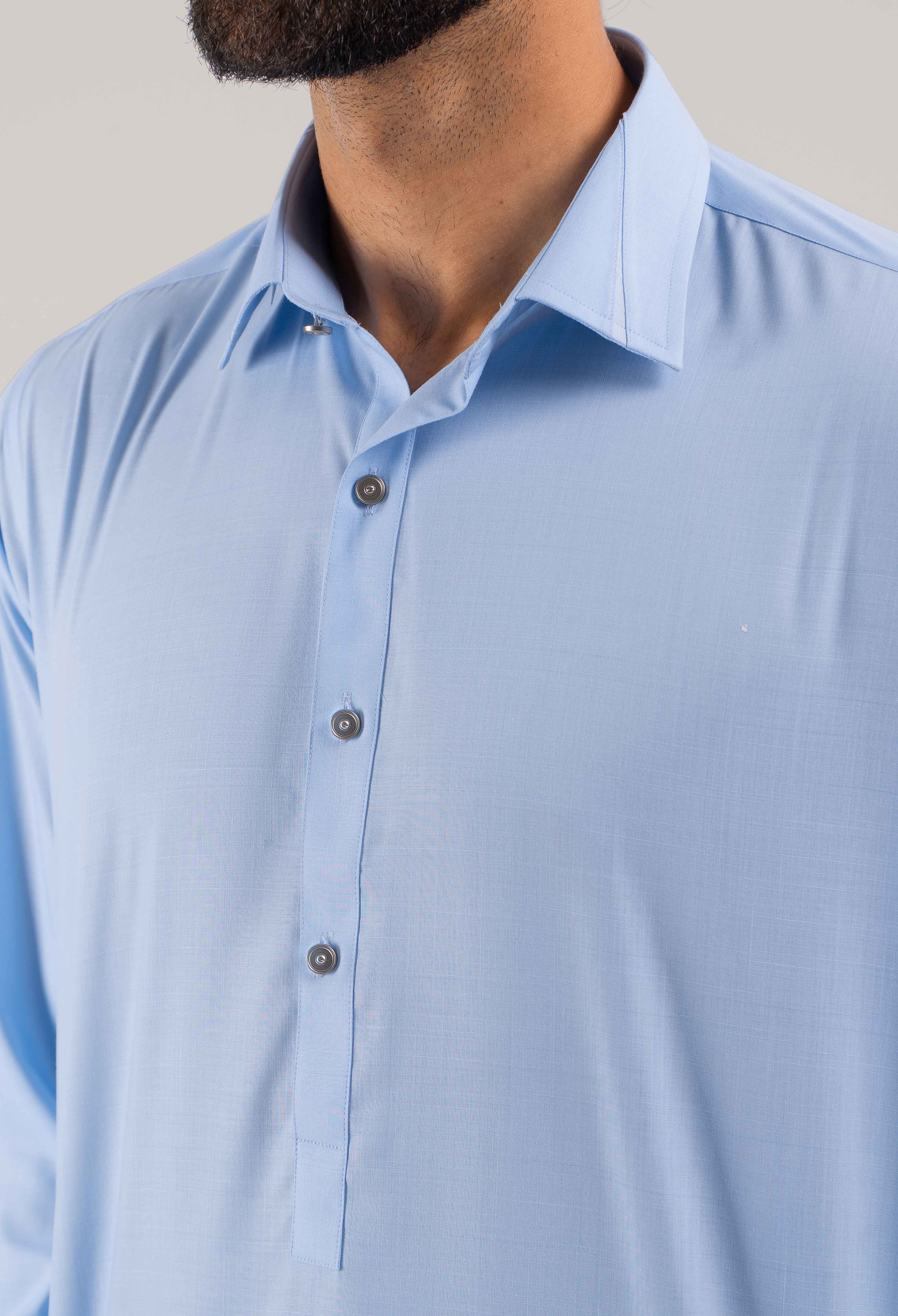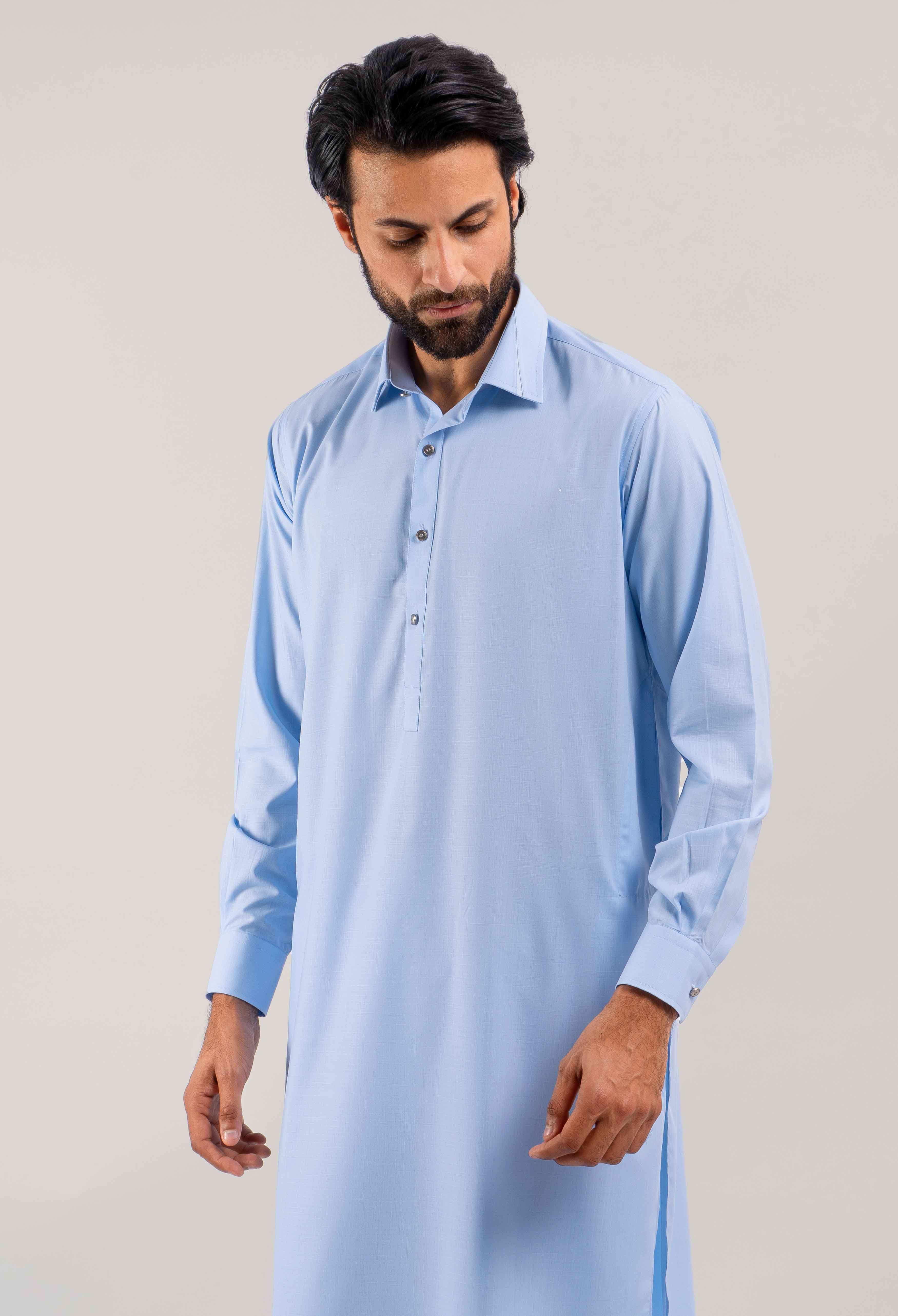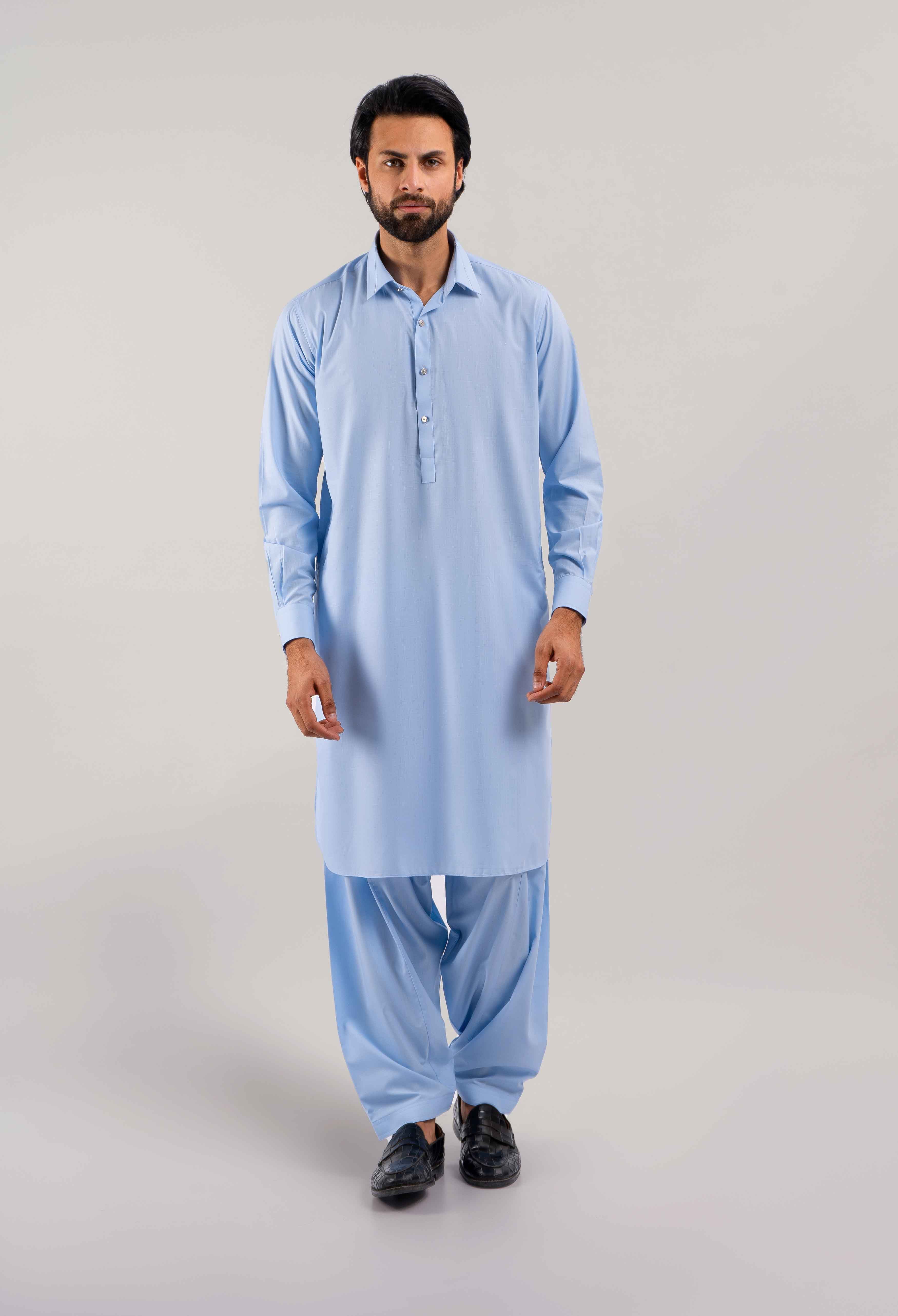 This Sky Blue Flag March Kameez Shalwar offers a traditional and sophisticated look, perfect for any occasion. The high-quality fabric and intricate detailing make it a comfortable and elegant addition to your wardrobe.