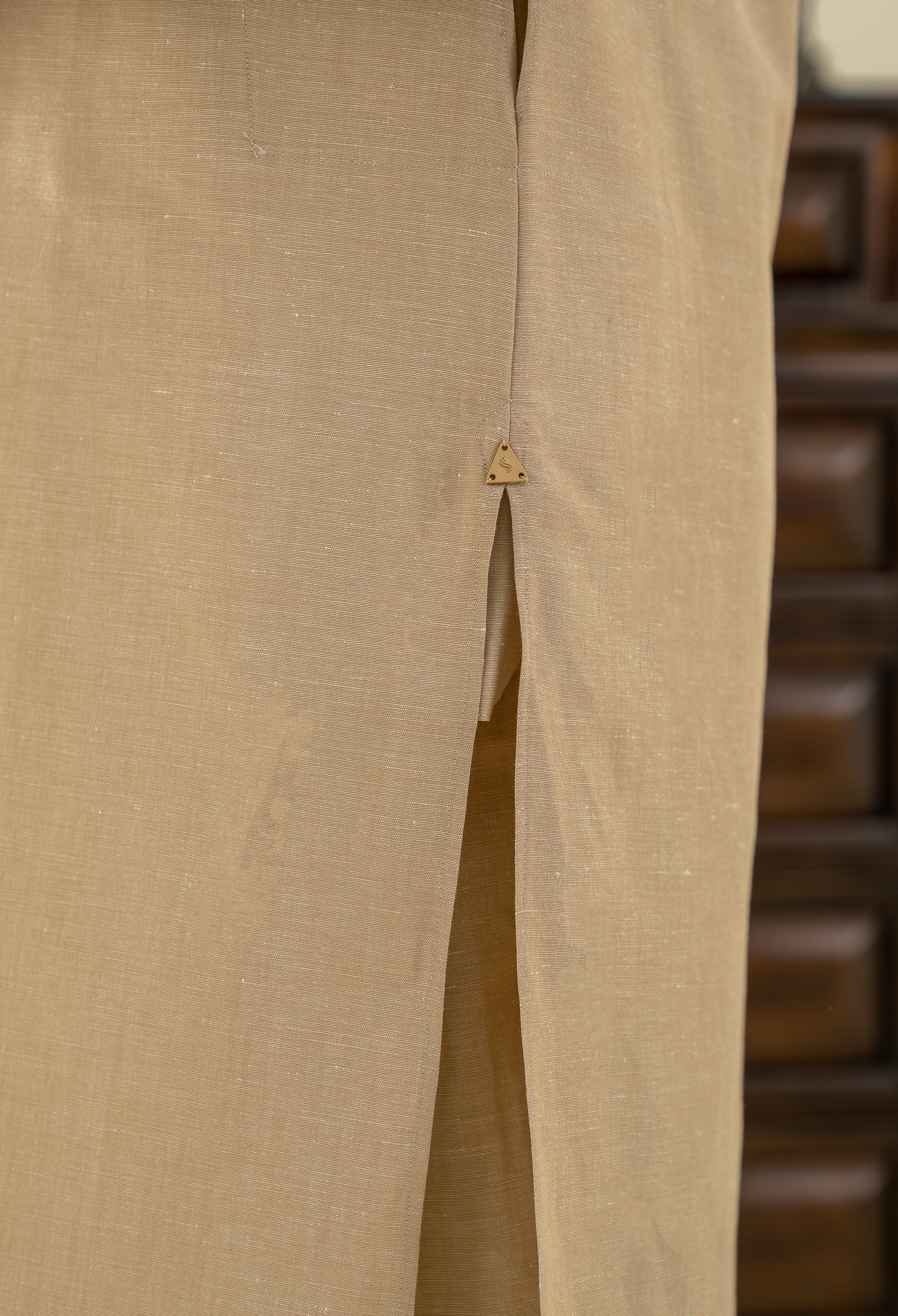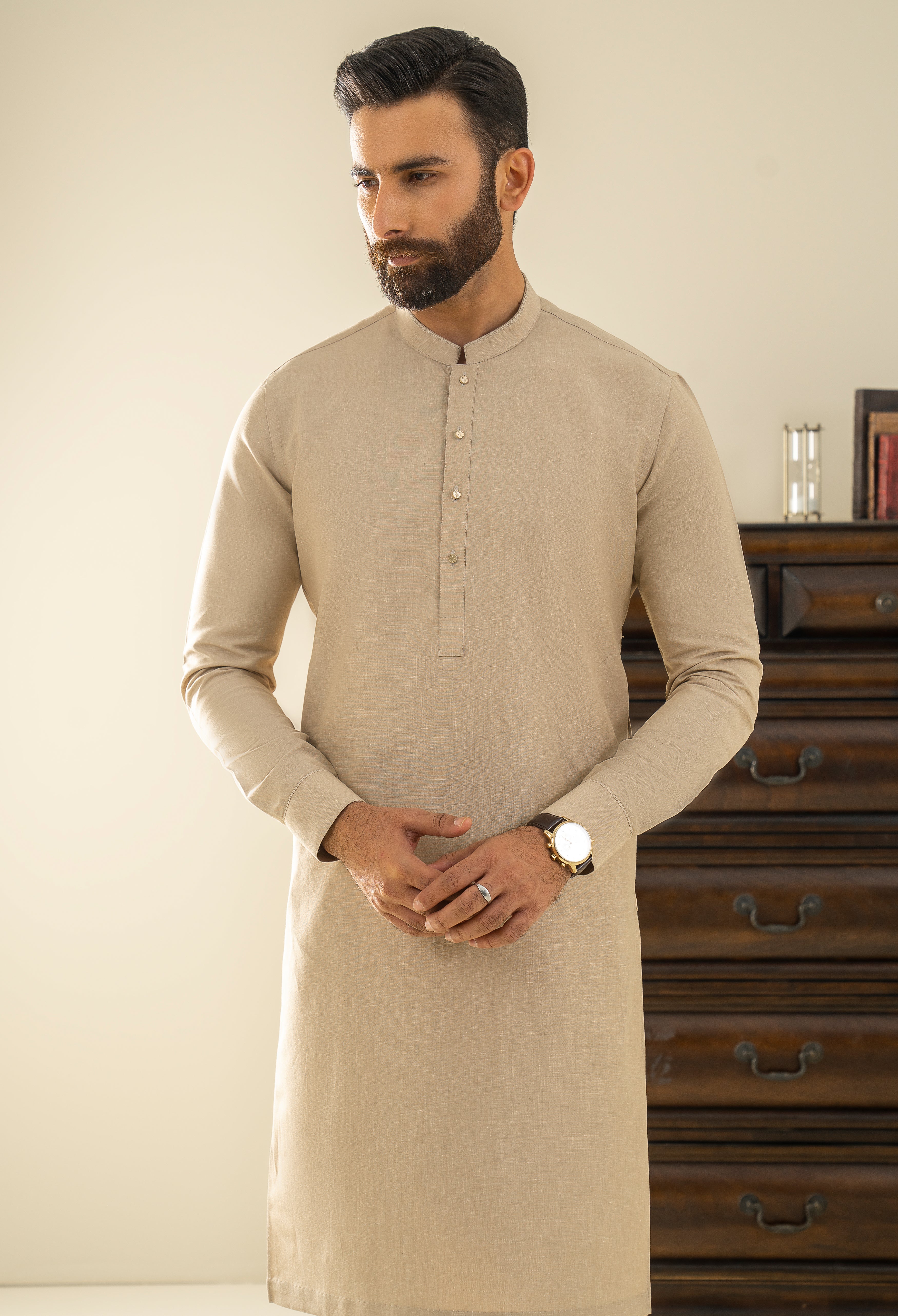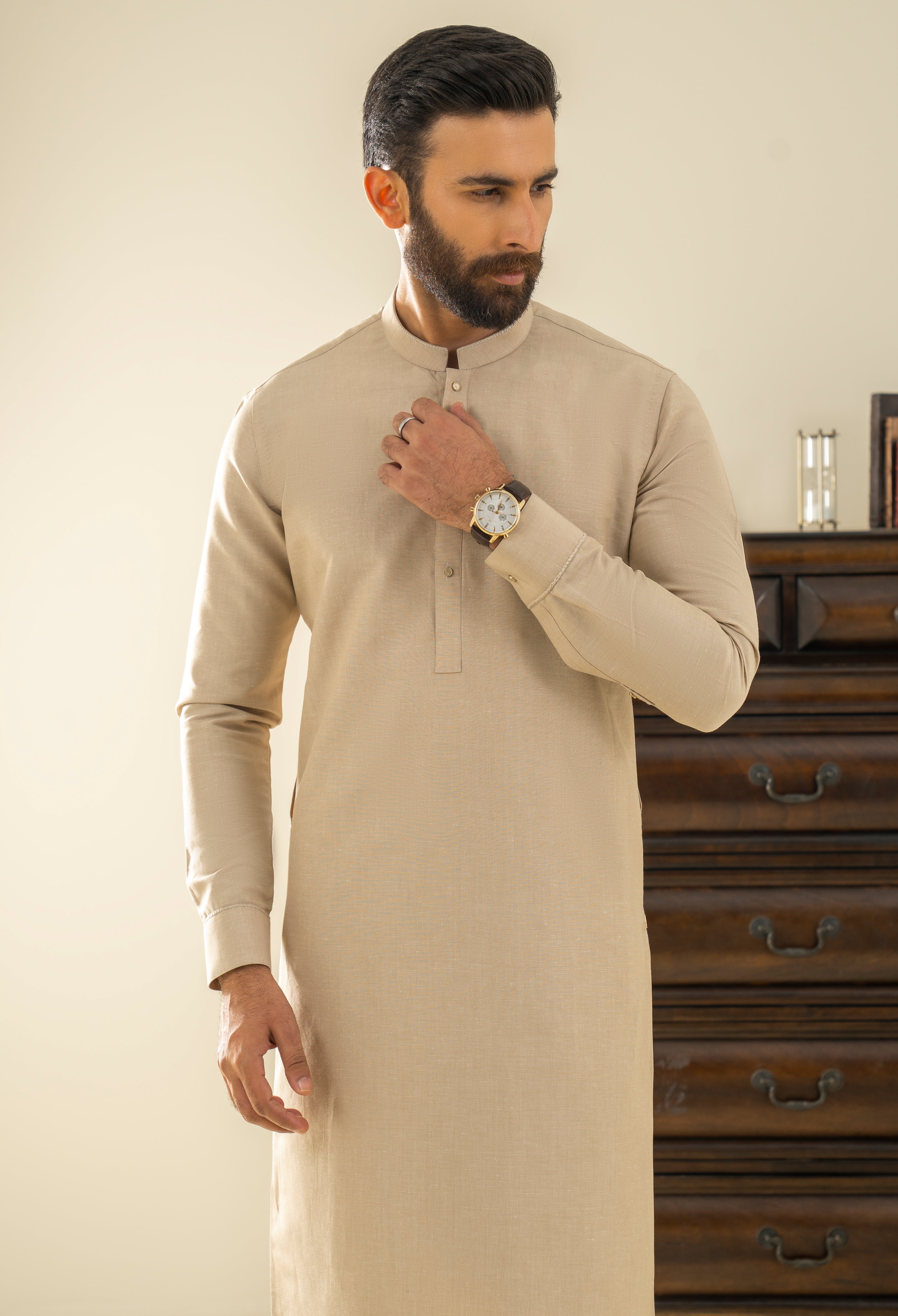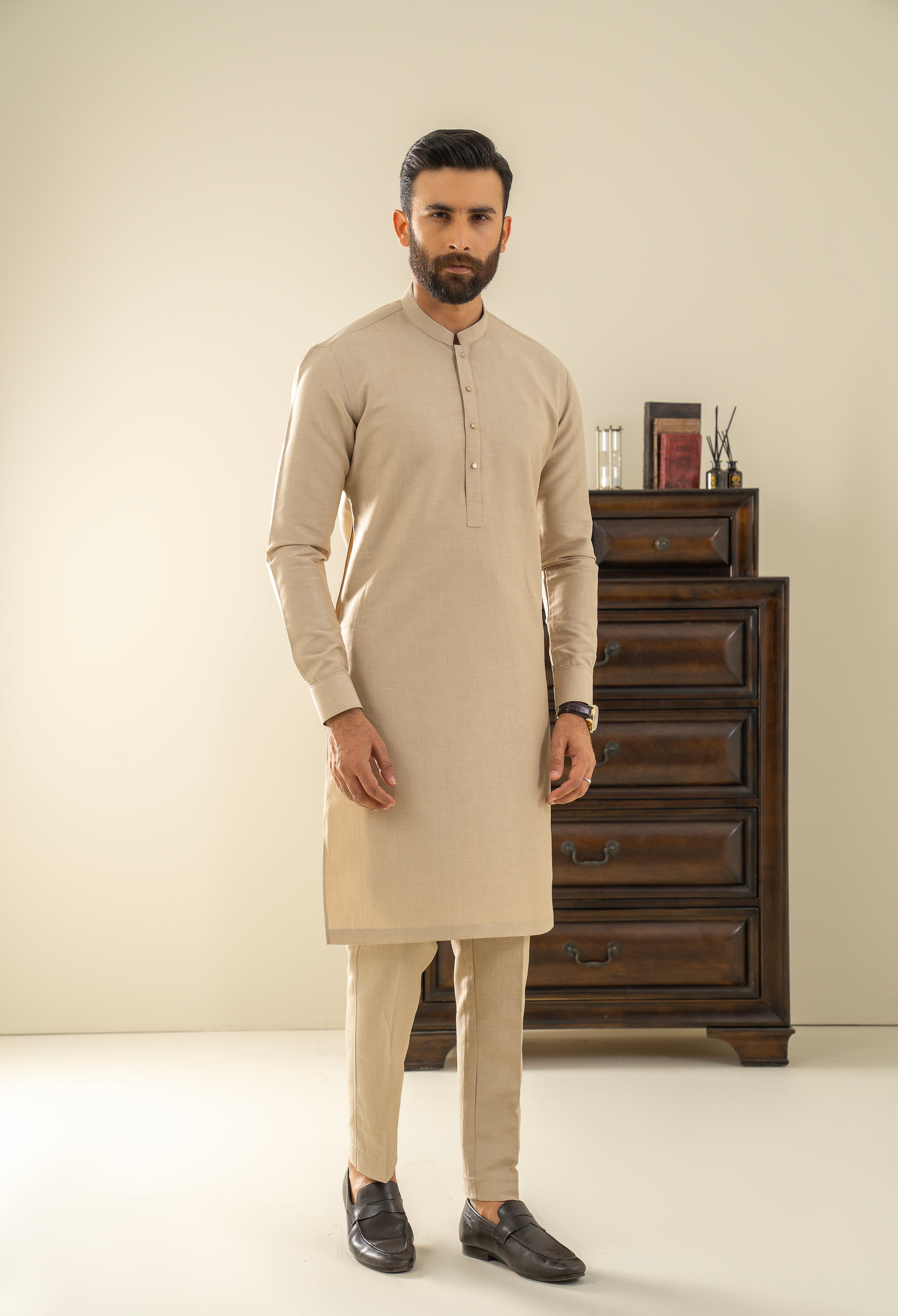 This Denim Linen Fabric kurta pajama set is crafted from a unique blend of denim and linen fabric, offering the best of both worlds: the rugged, timeless appeal of denim with the soft, breathable comfort of linen. The fabric has a subtle texture that mimics the look of denim while providing a soft and smooth feel against the skin. The kurta is designed with a sophisticated collar featuring intricate embroidery, adding an artistic flair to the overall look. Dorri detailing adds a traditional touch, enhancing the elegance and uniqueness of the set. The collar and front patti are further adorned with carefully placed studs, elevating the design to a luxurious and rich appearance. This kurta pajama suit offers a modern yet regal vibe, perfect for those who appreciate the fusion of contemporary and classic styles, ideal for special events or evening occasions.