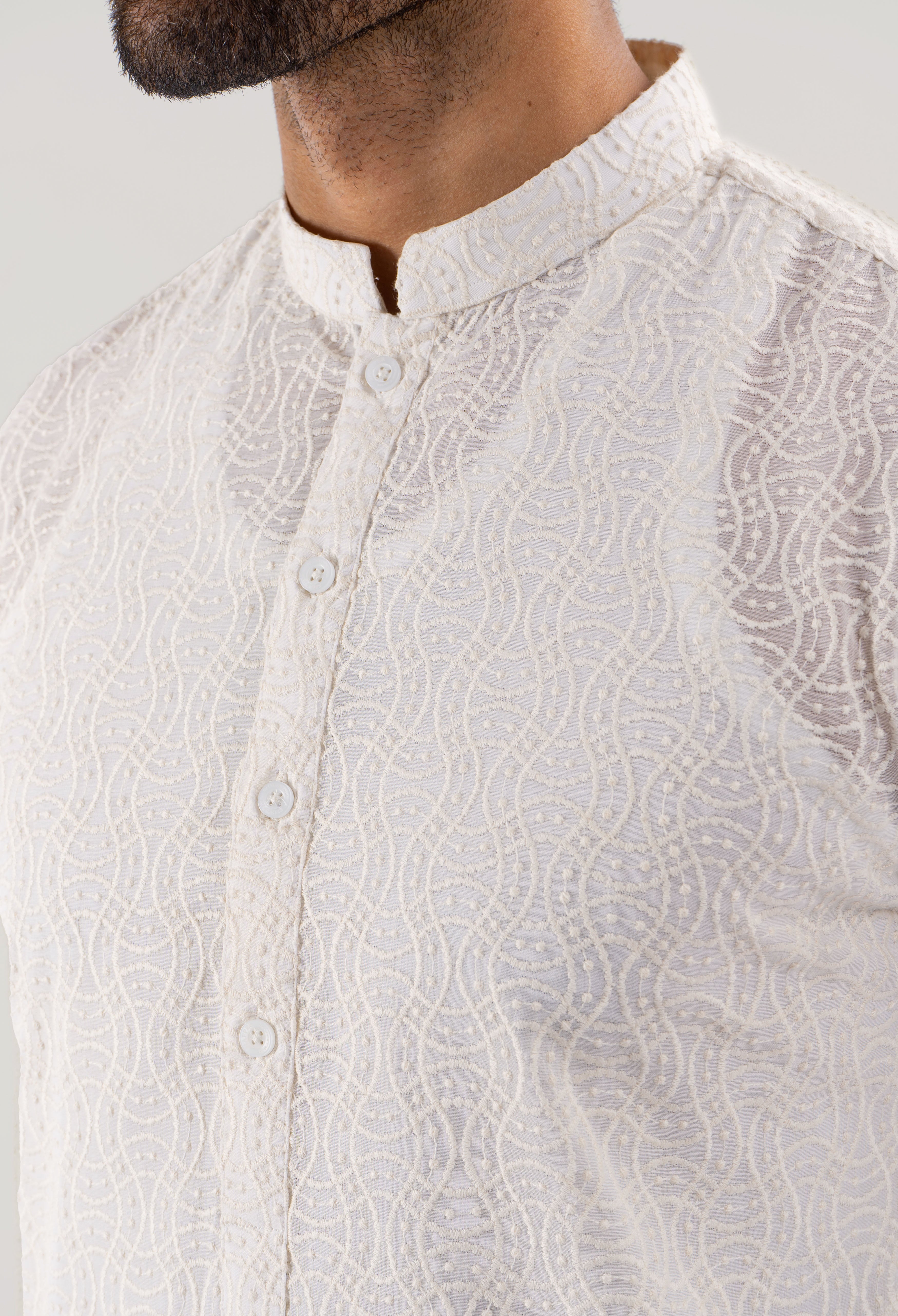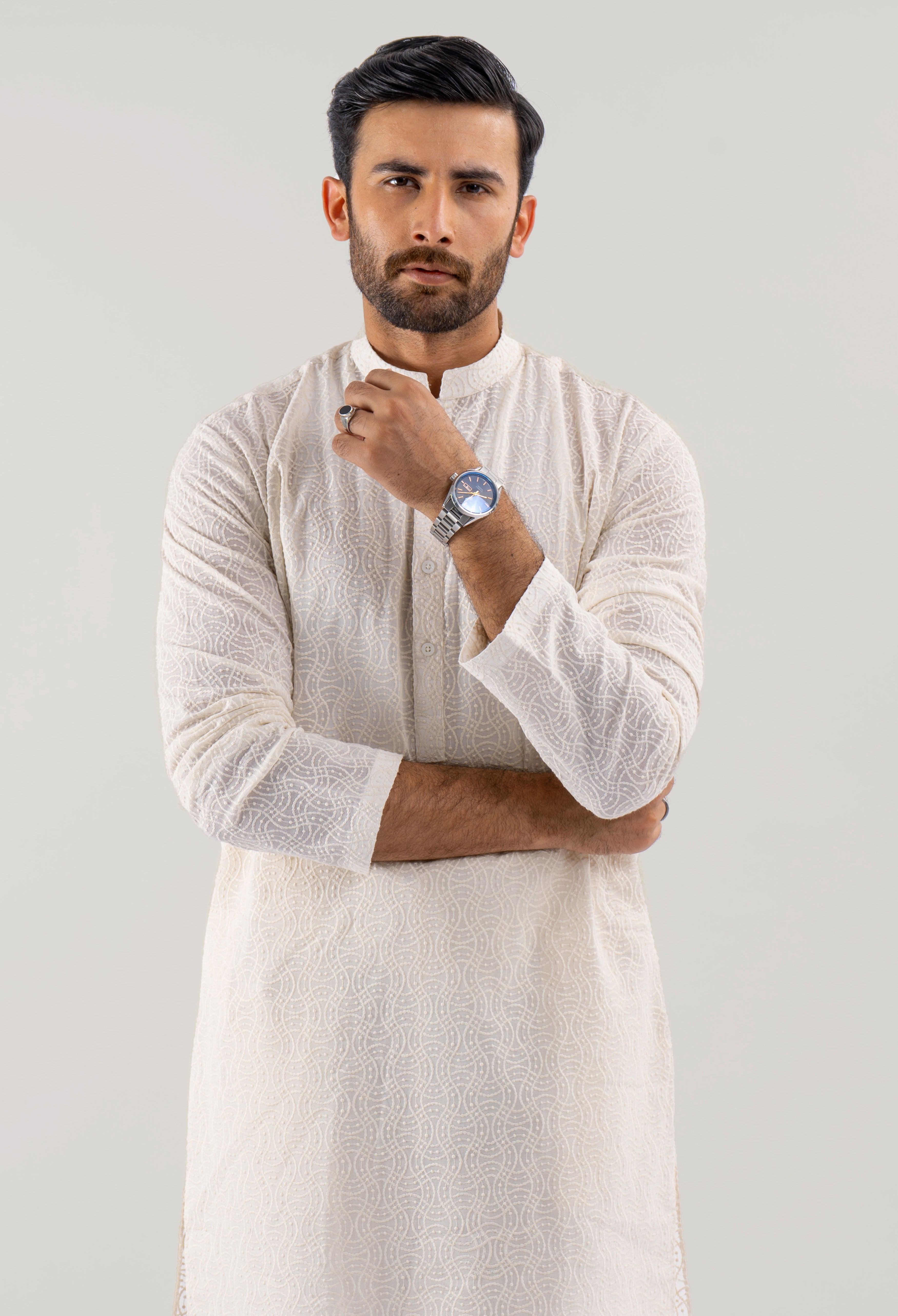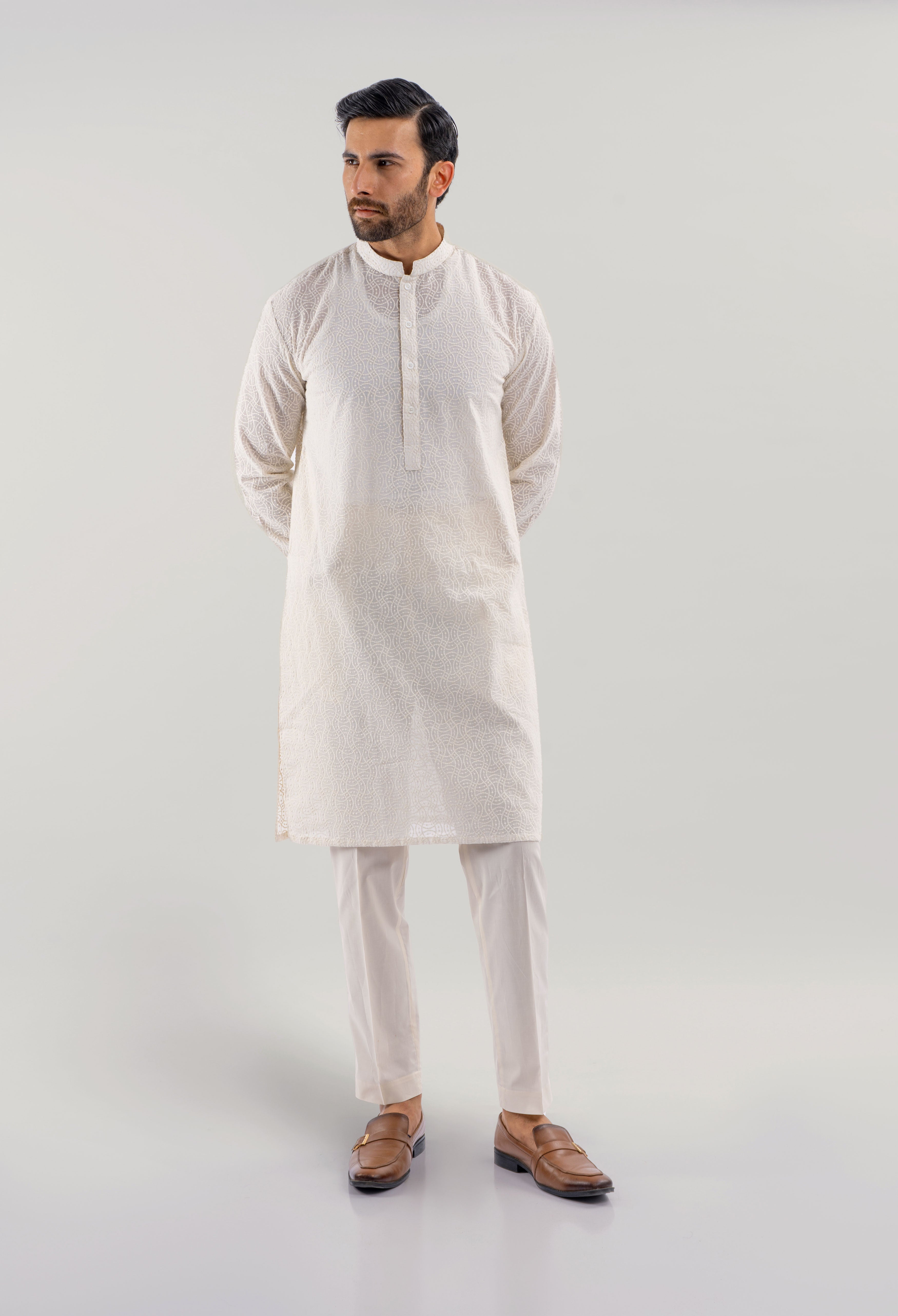 Off White Pearl - Wavy Line Schiffli Kurta Pajama