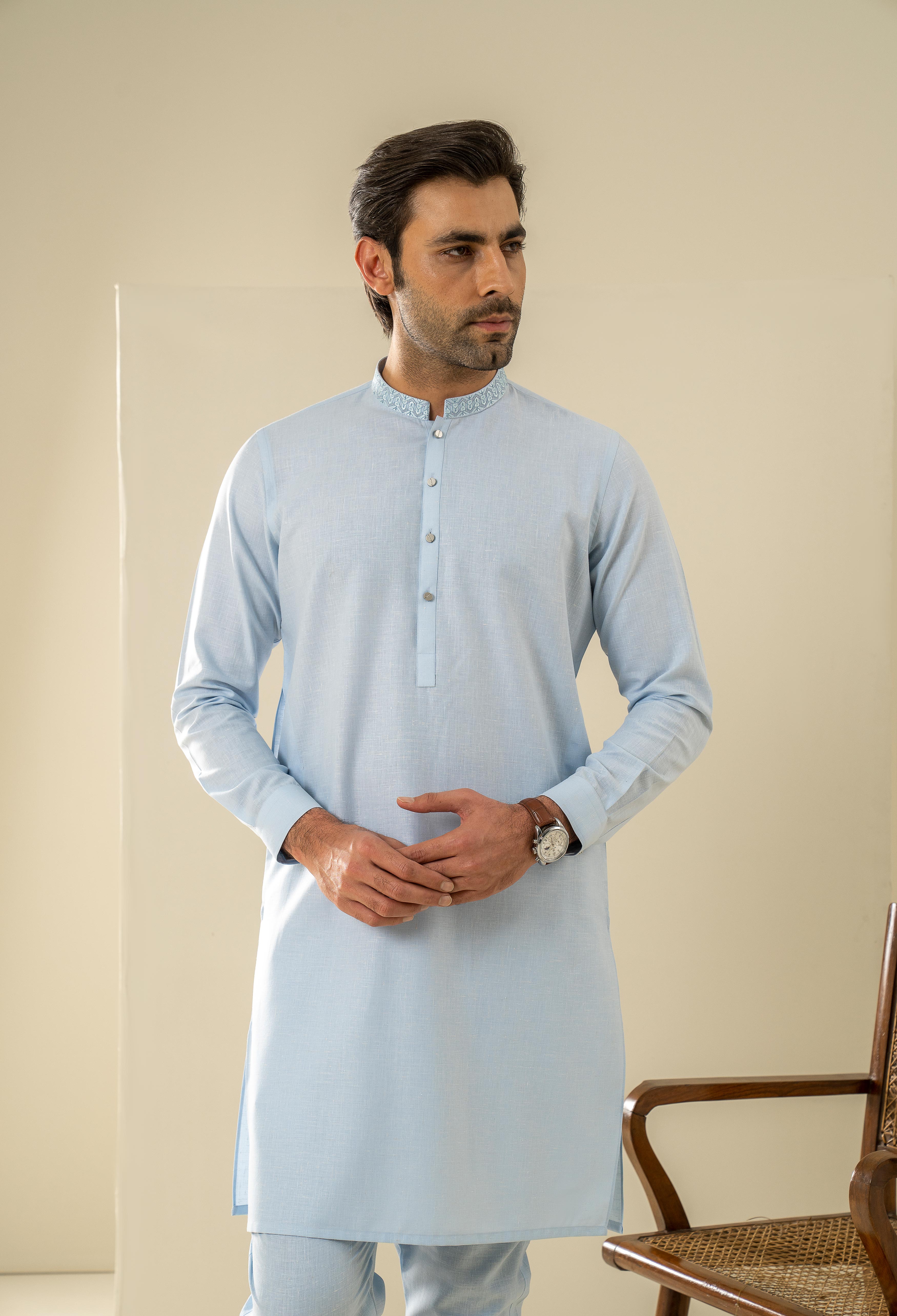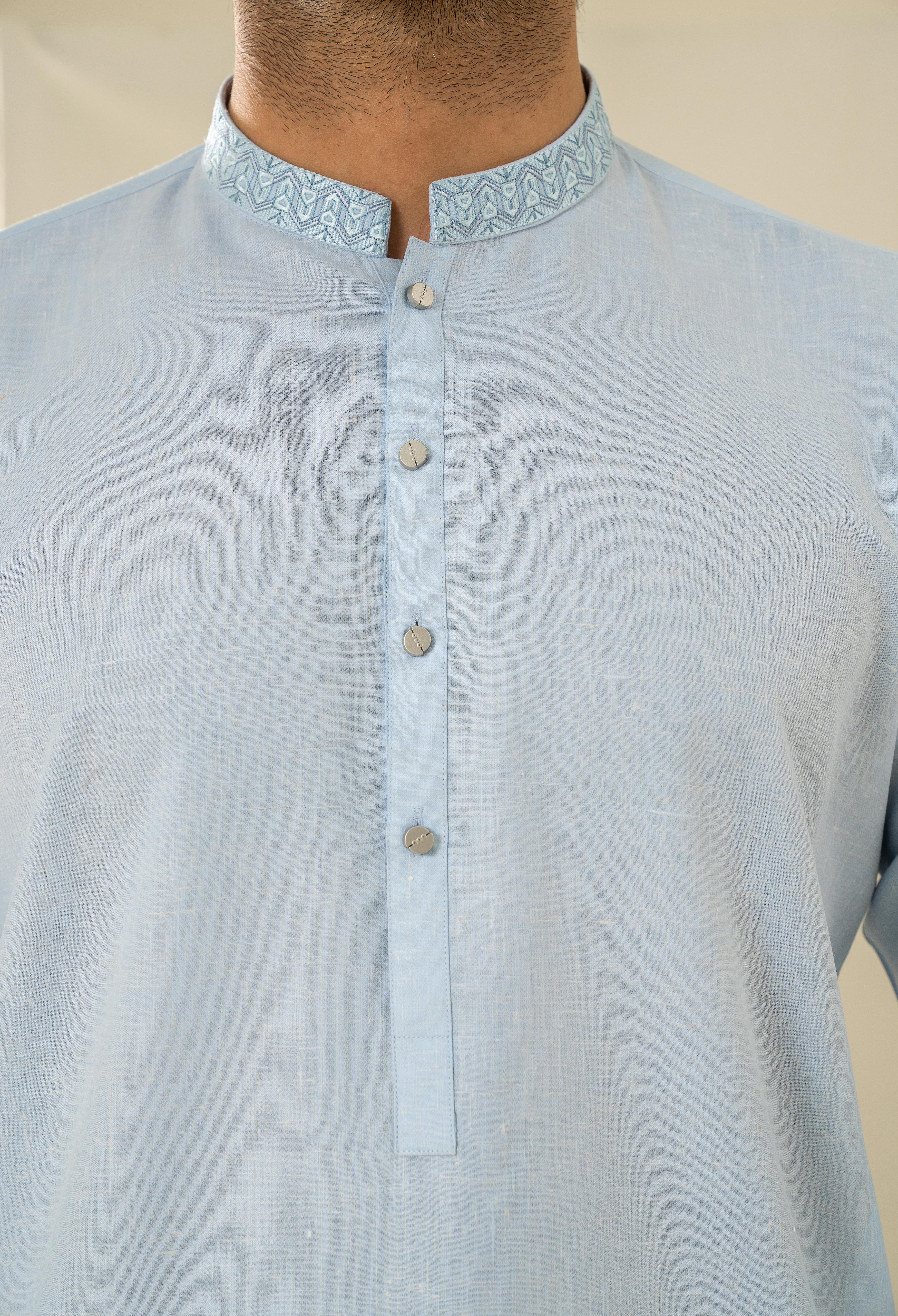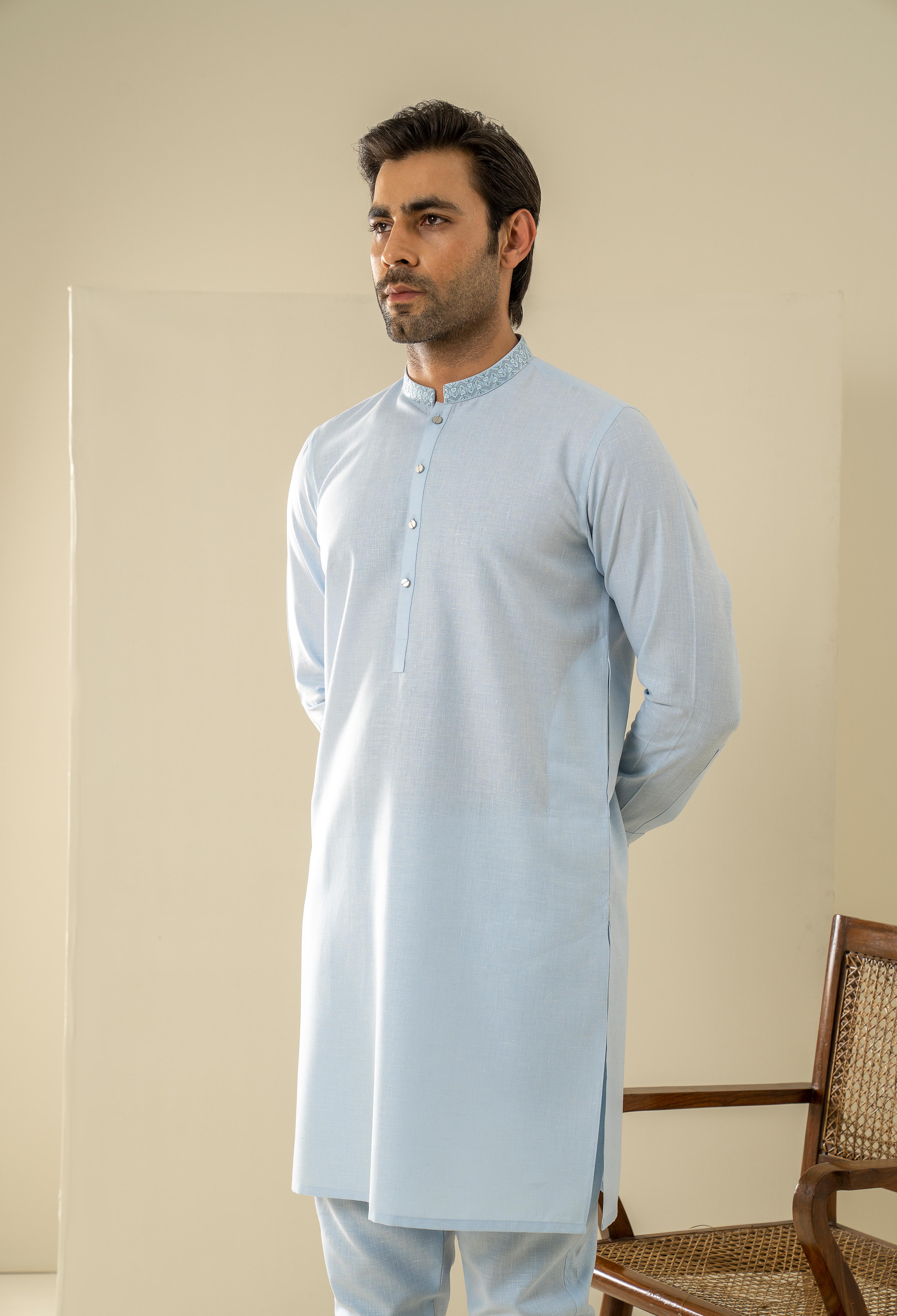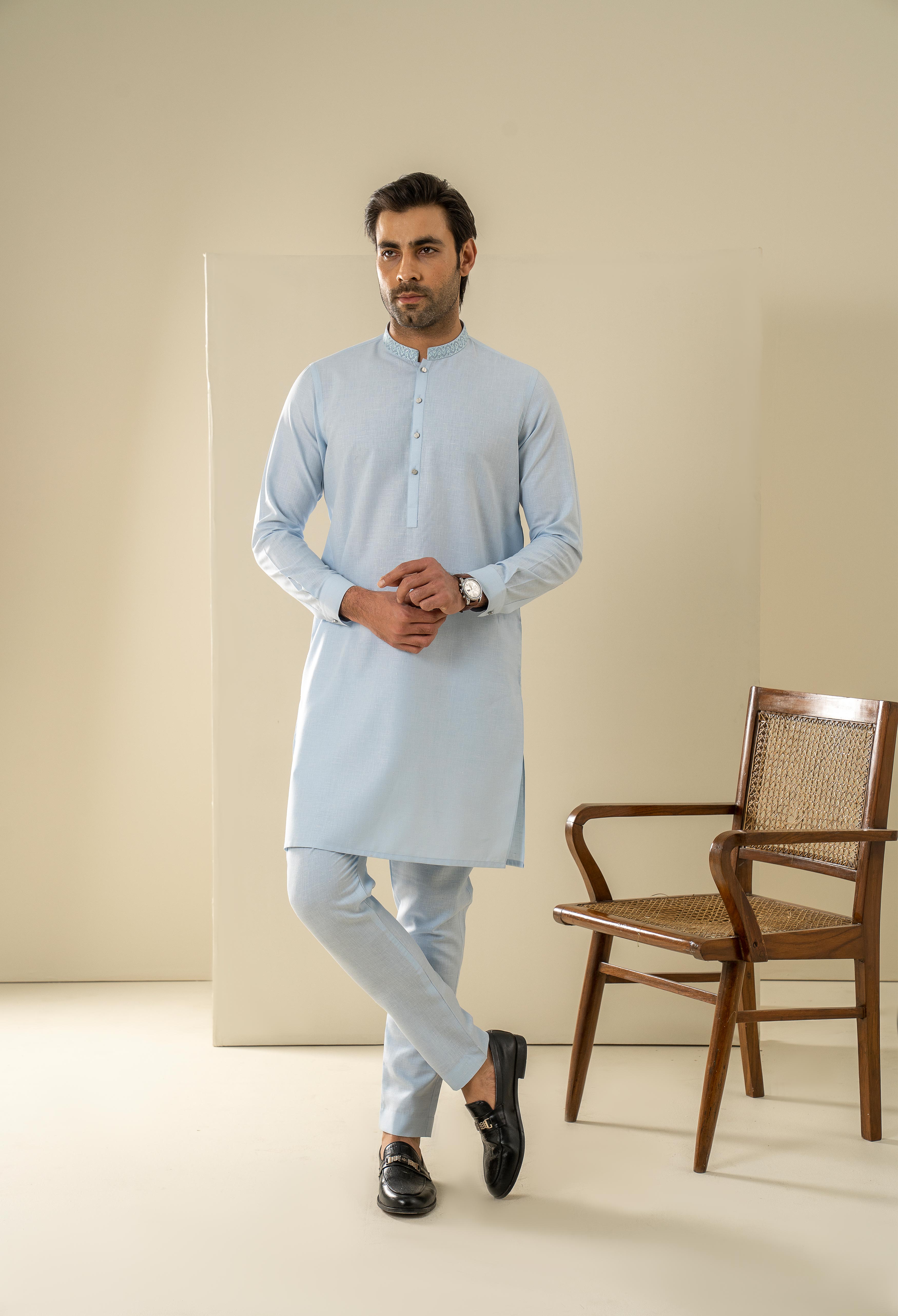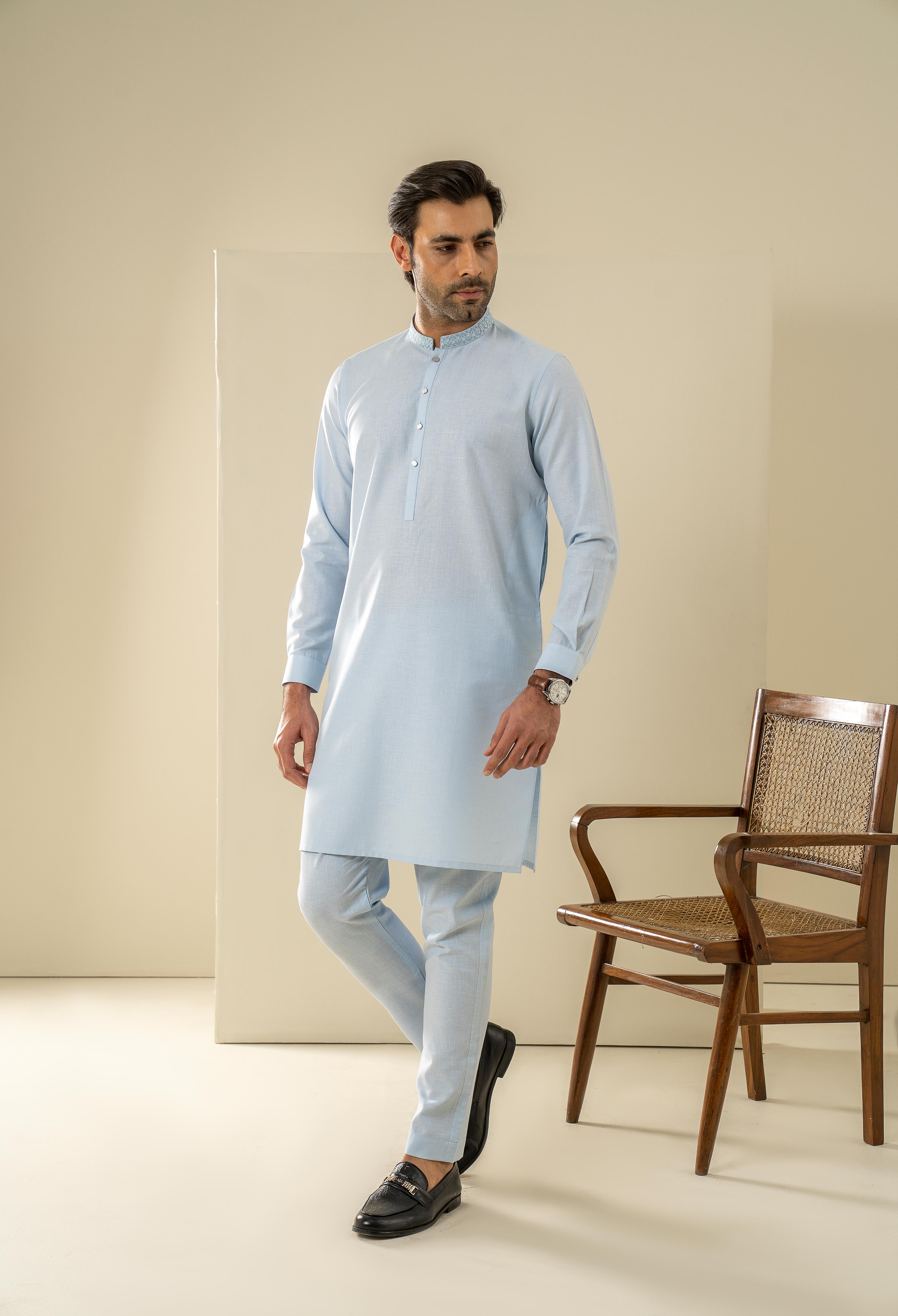 TANDANCY – a slim fit casual Kurta Pajama that combines style and comfort. Featuring a band embroidery collar, straight hem, and straight cuffs for a refined look. Finished with metal fancy buttons for added elegance. Perfect for any casual occasion.