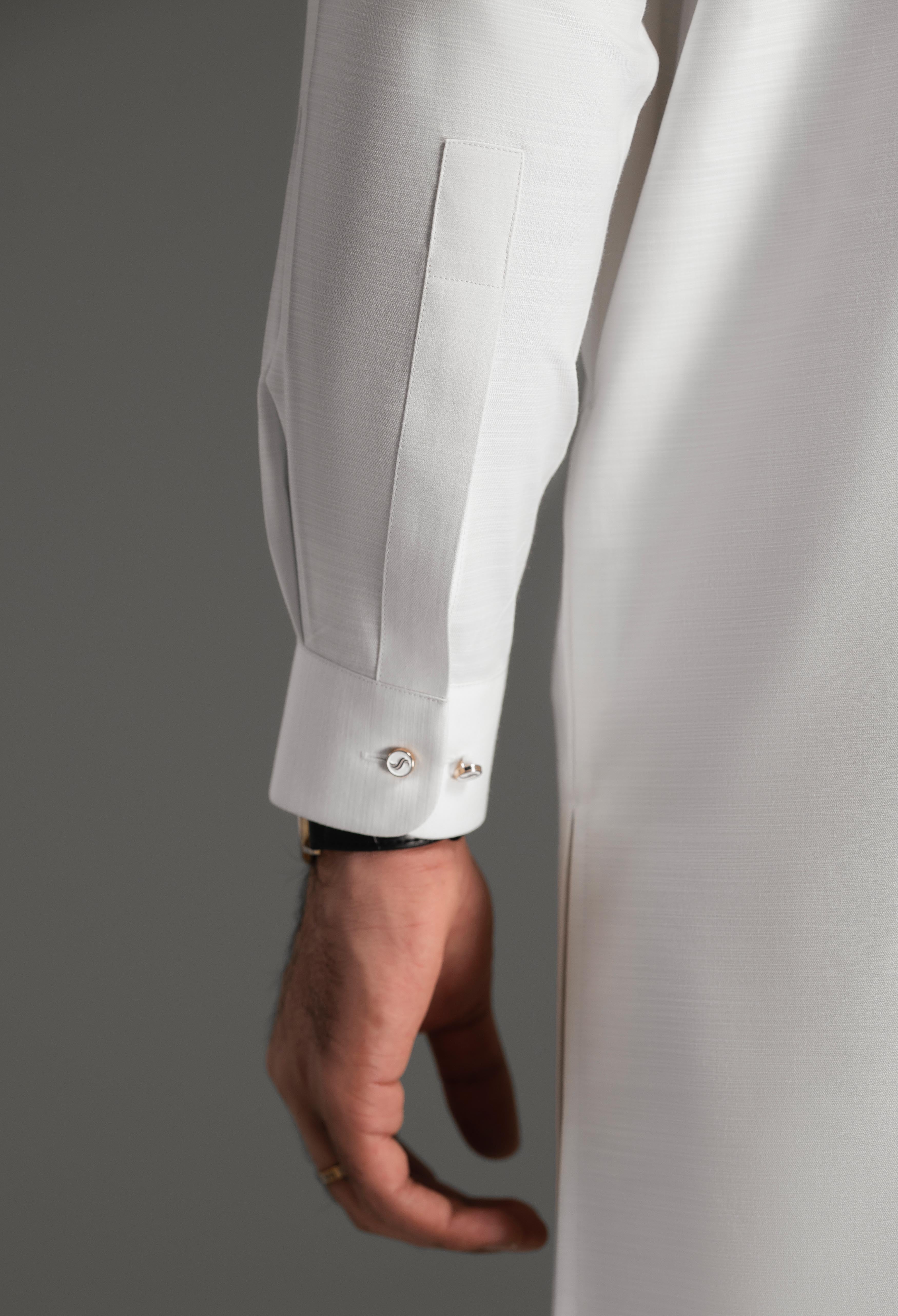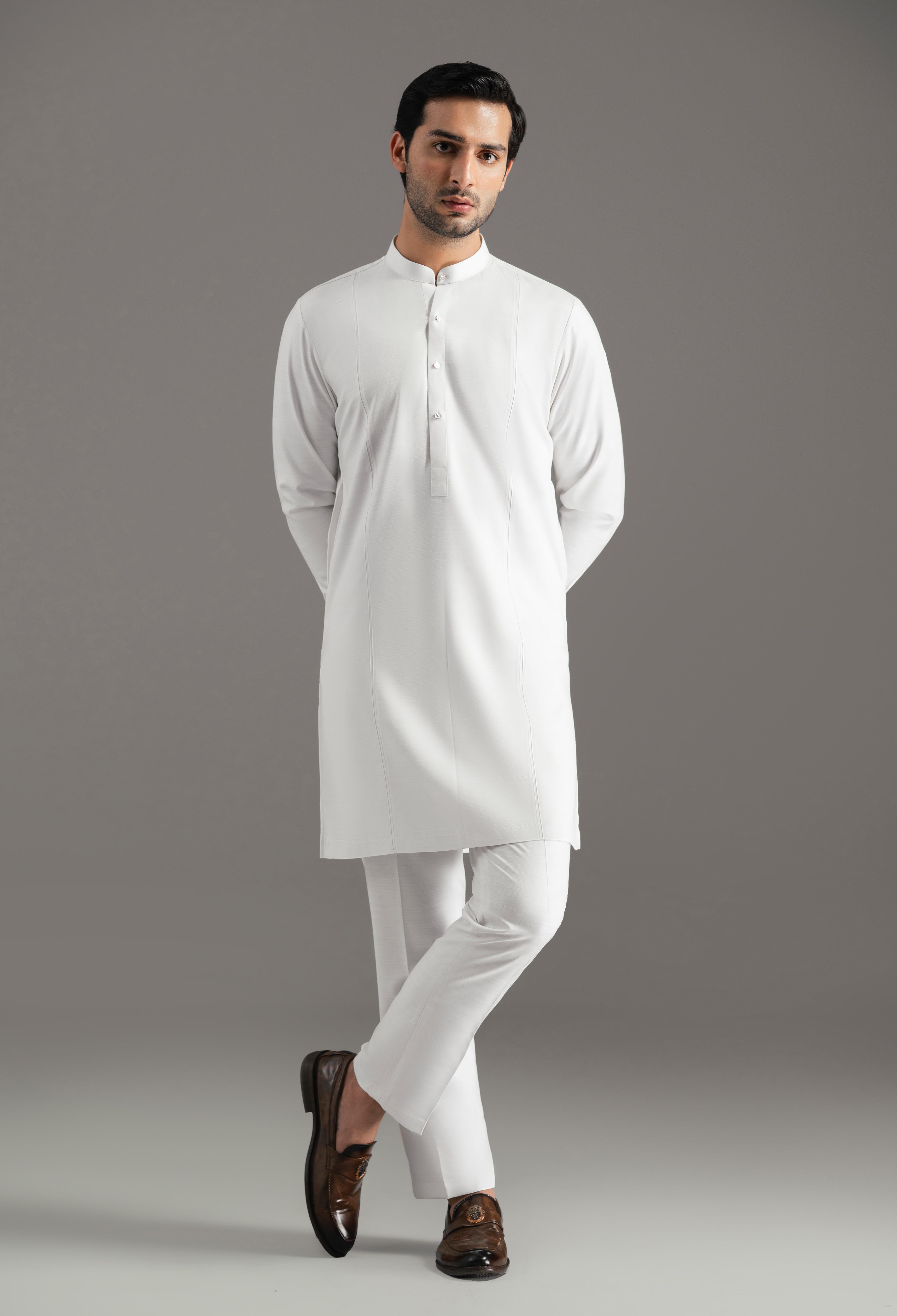 The design features a round band collar, round cuffs, two front pleats, and one pleat on the back shoulders, adding subtle structure and elegance. Practical two side pockets are seamlessly integrated, while the look is completed with a new style pant pajama, ensuring both comfort and refined simplicity.