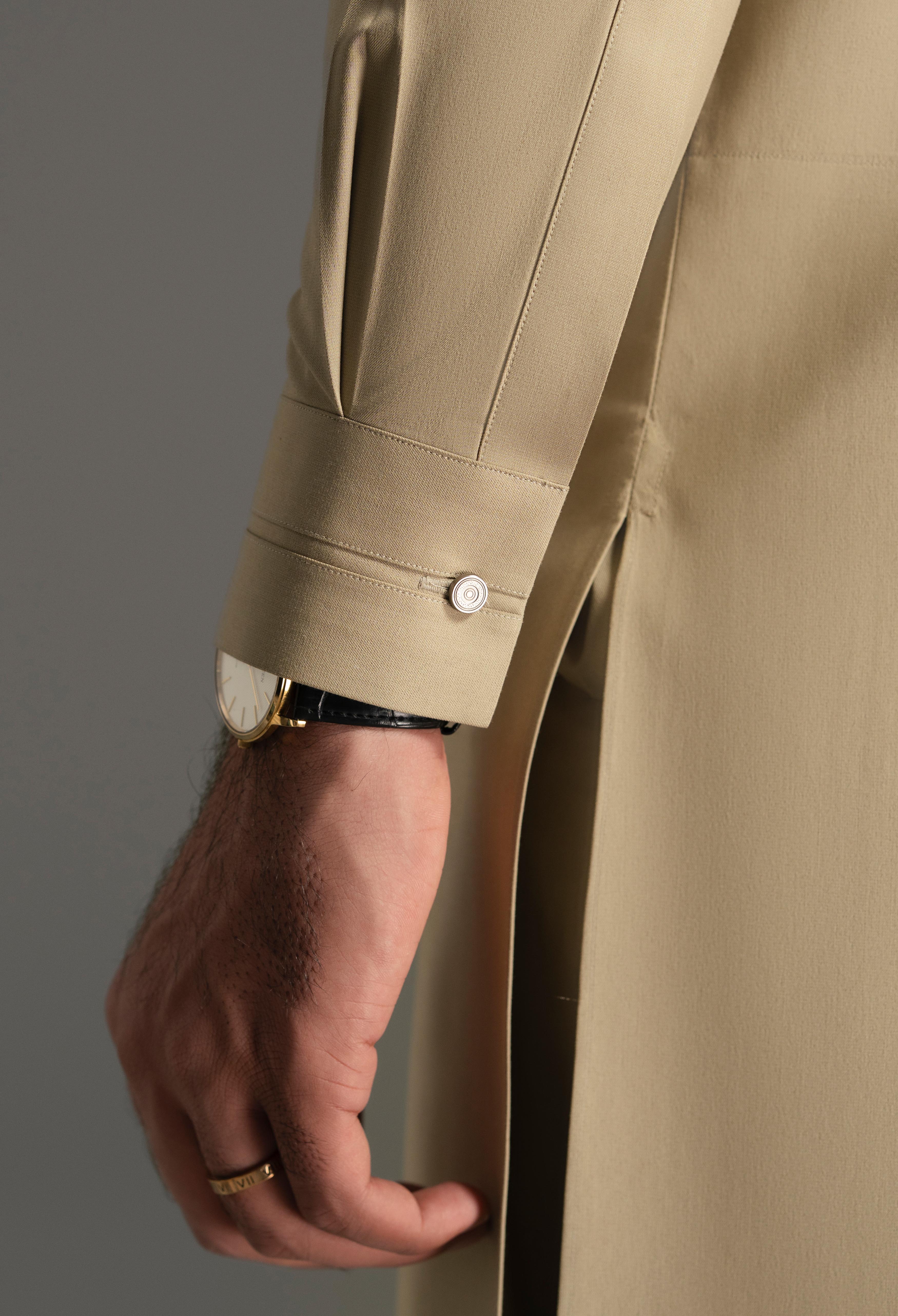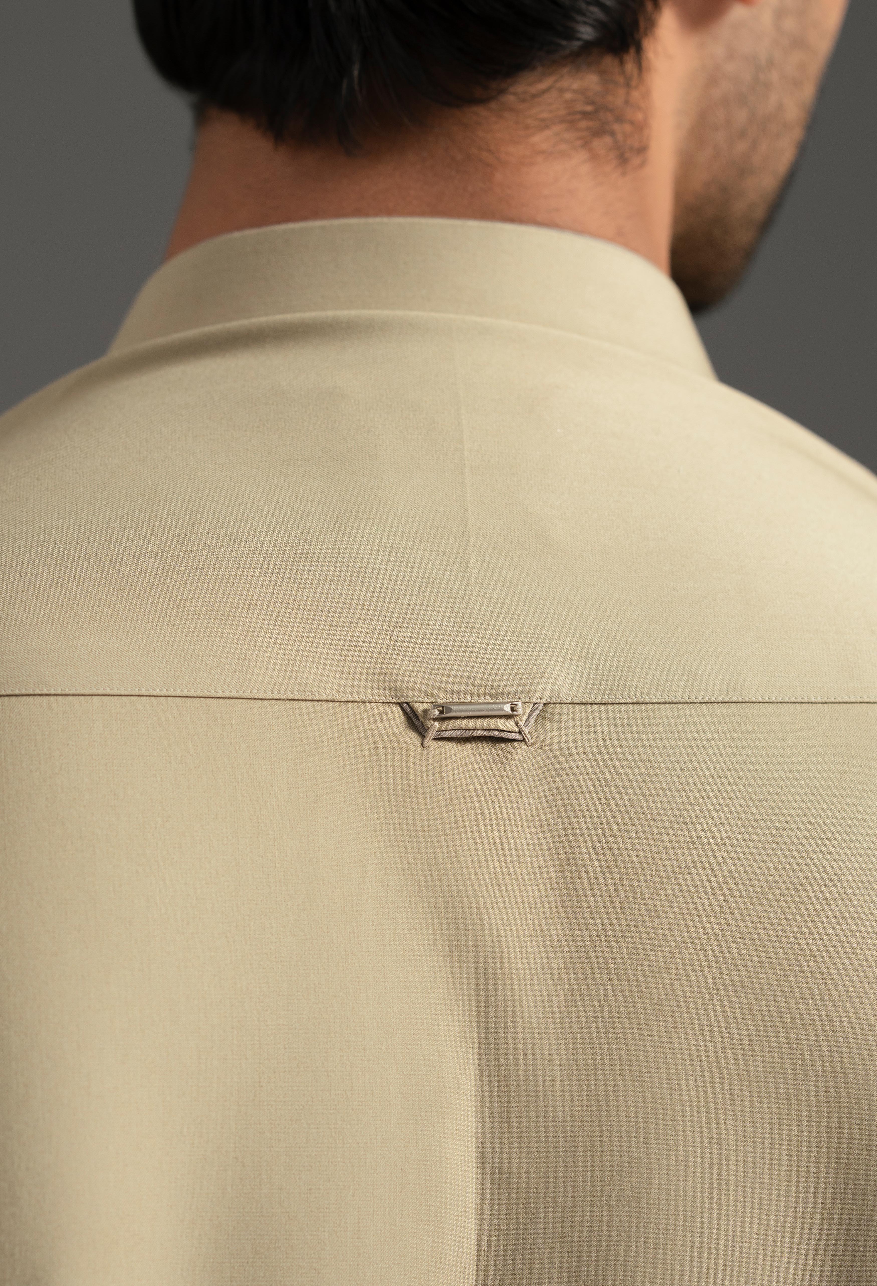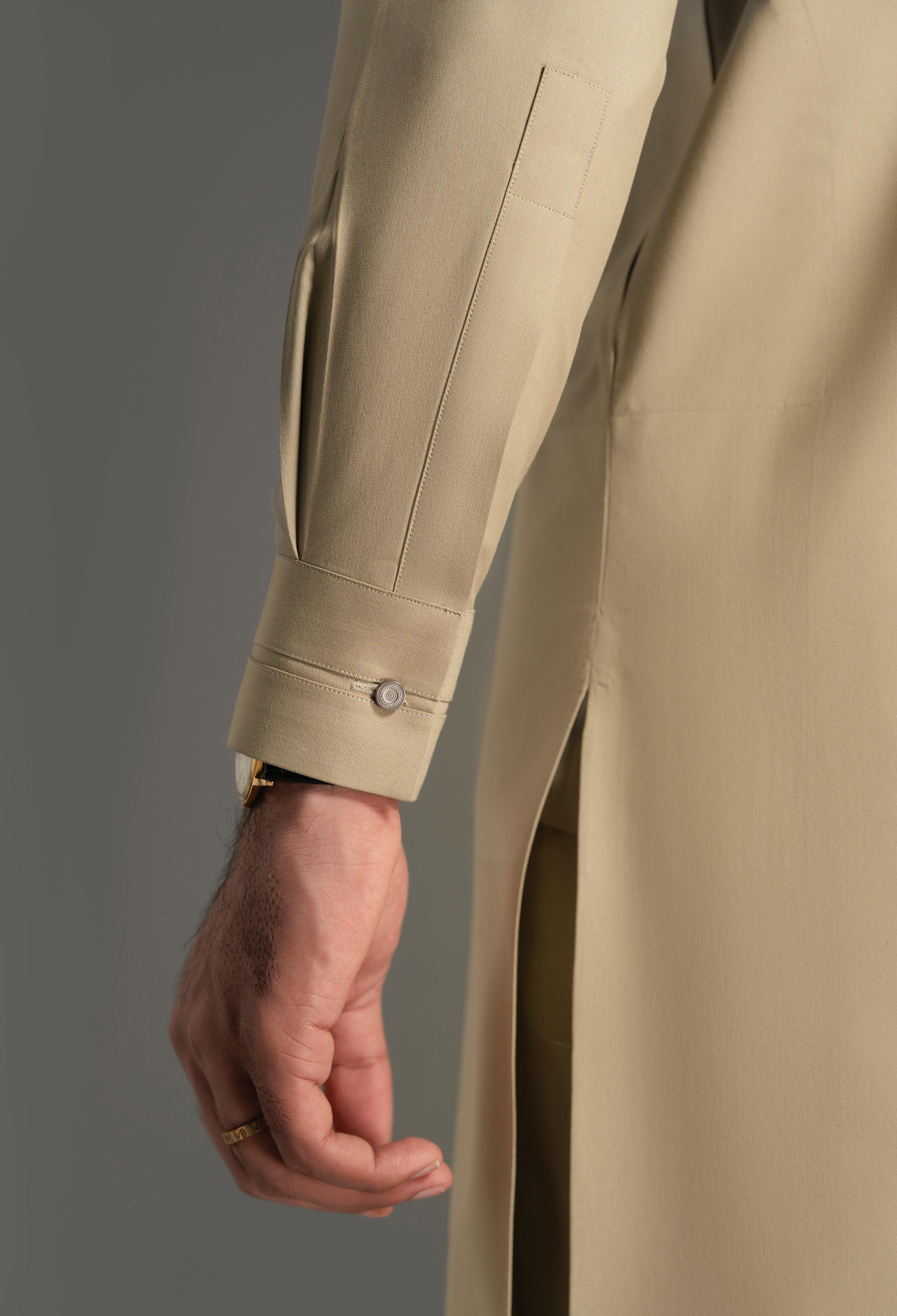 A modern essential designed for winter sophistication, this ensemble is cut in a contemporary silhouette that emphasizes clean lines and refined construction. The band collar features contrast fabric straight piping with a precise stitch, adding a distinctive touch of detail. At the back shoulder yoke, a contrast fabric patch (Superior Blend Light Fawn Fabric) is complemented by the same fabric attachment and a metallic loop stud at the top, enhancing its modern appeal.