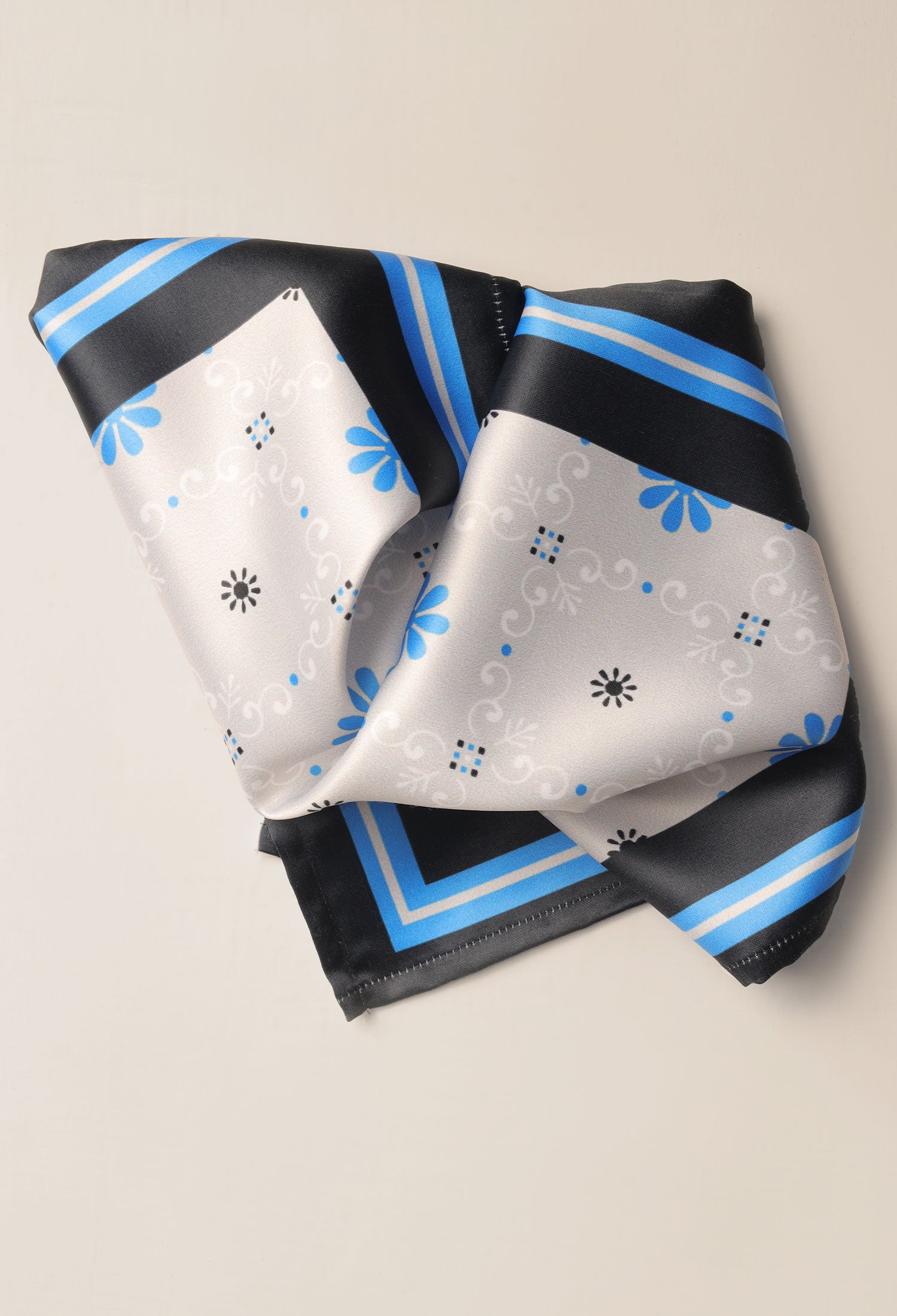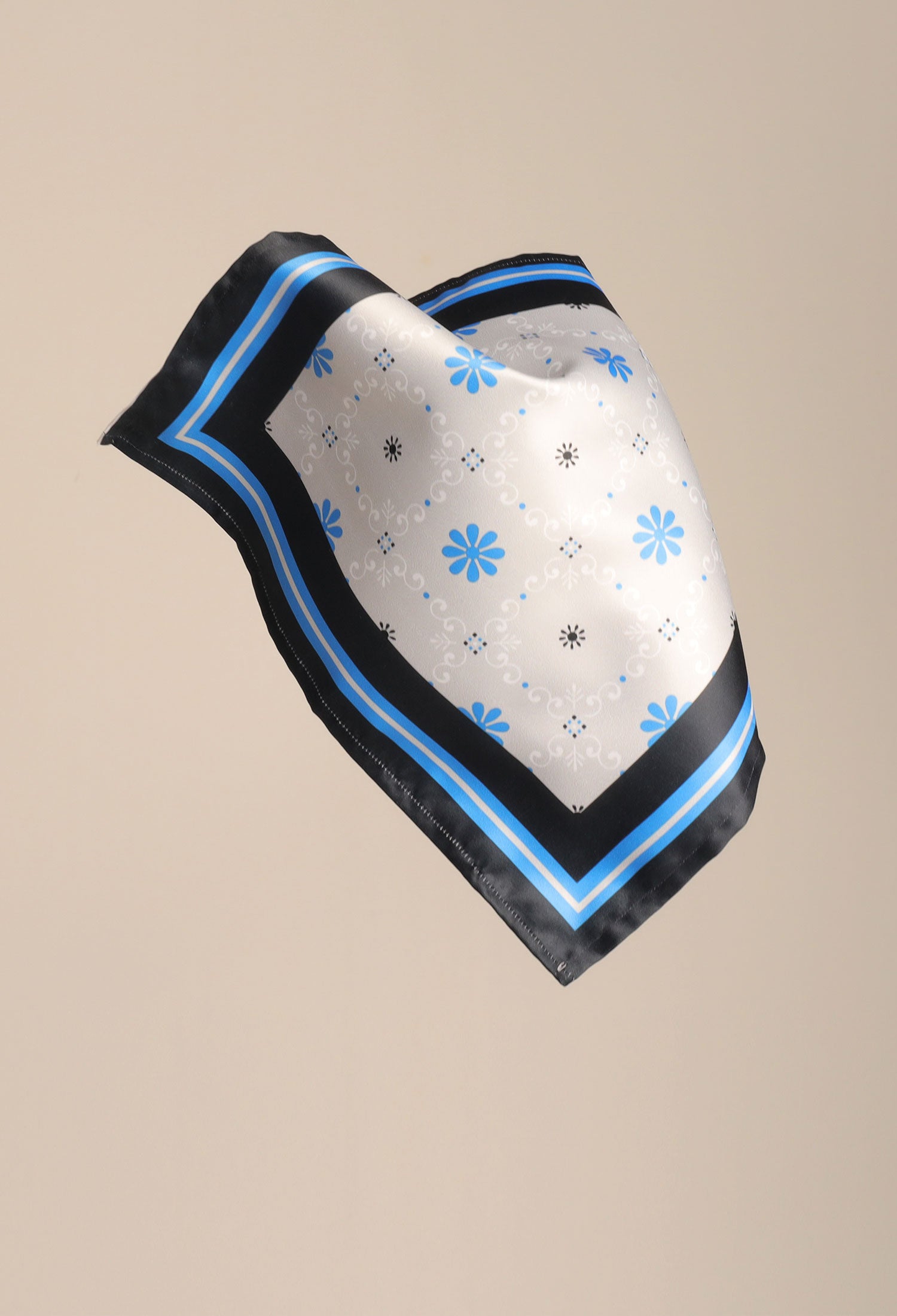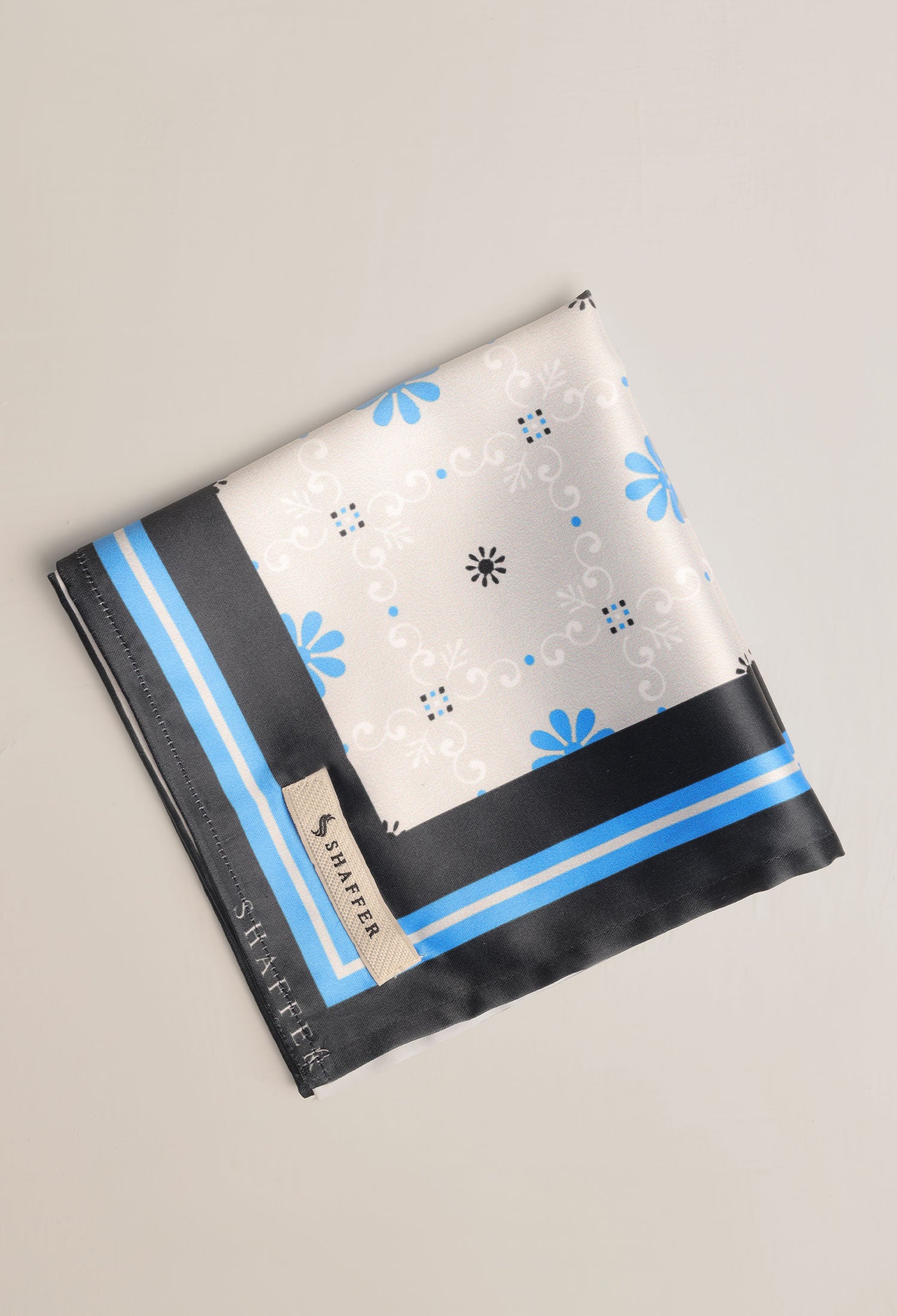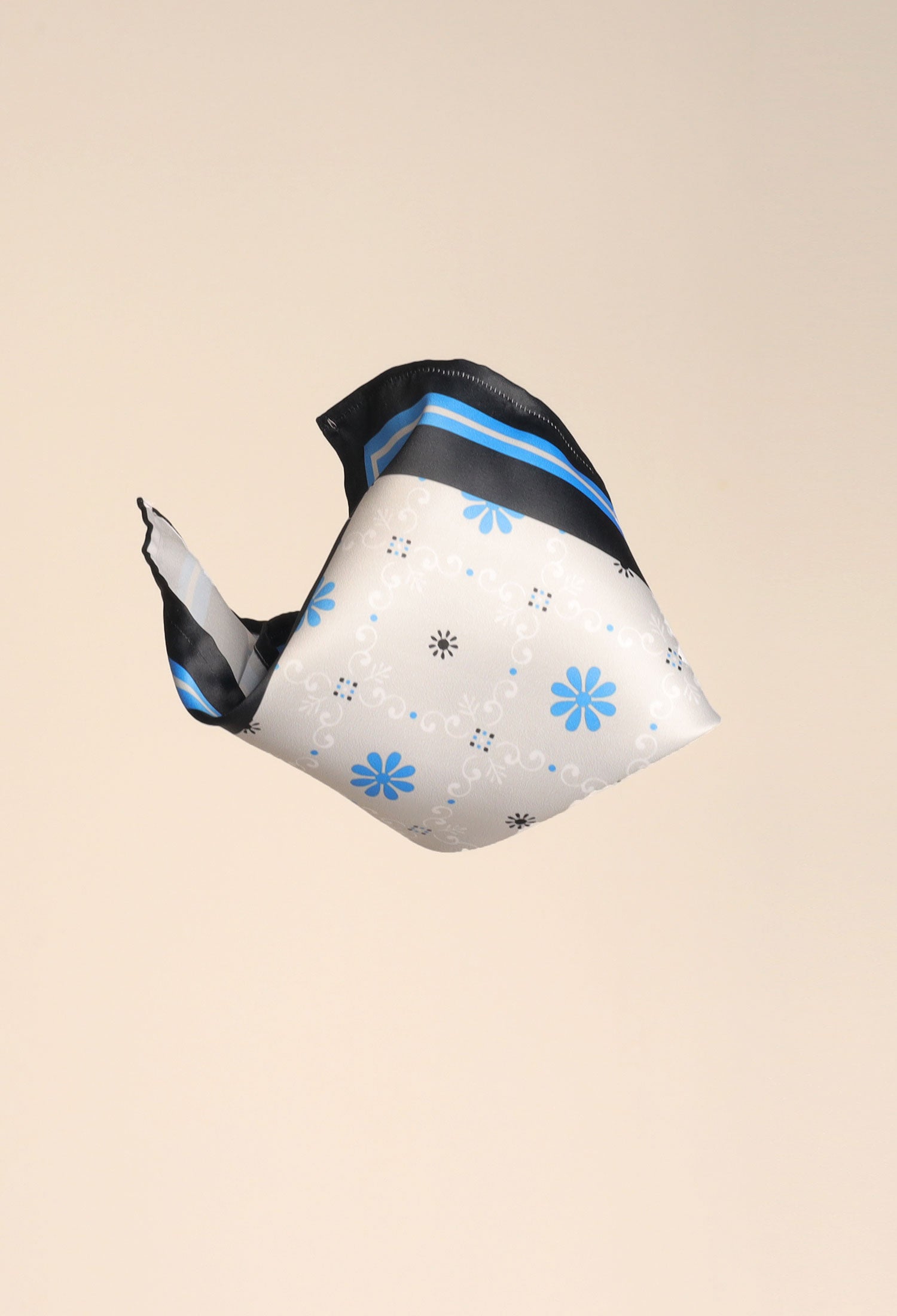 This DAISY BLUE POCKET SQUARE in satin silk is 10x10 inches in size, boasting a digital print composed of daisies and subtle design elements in complementing colors. A unique finish is given by the self-printed color details.