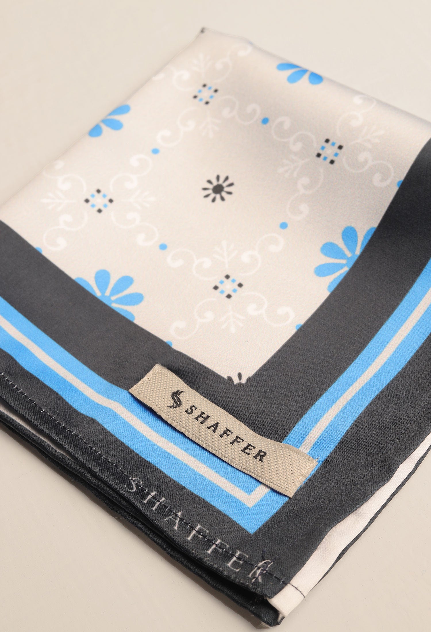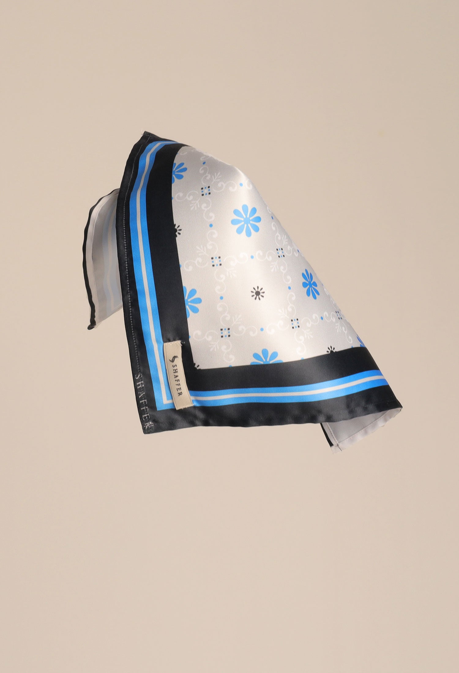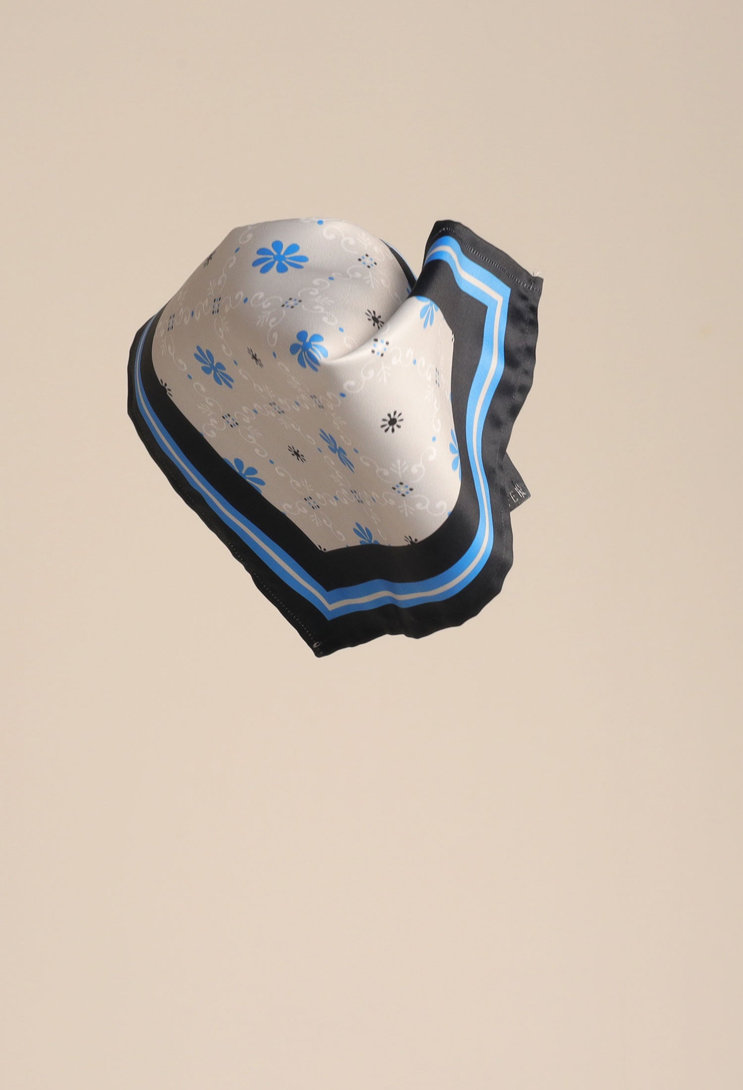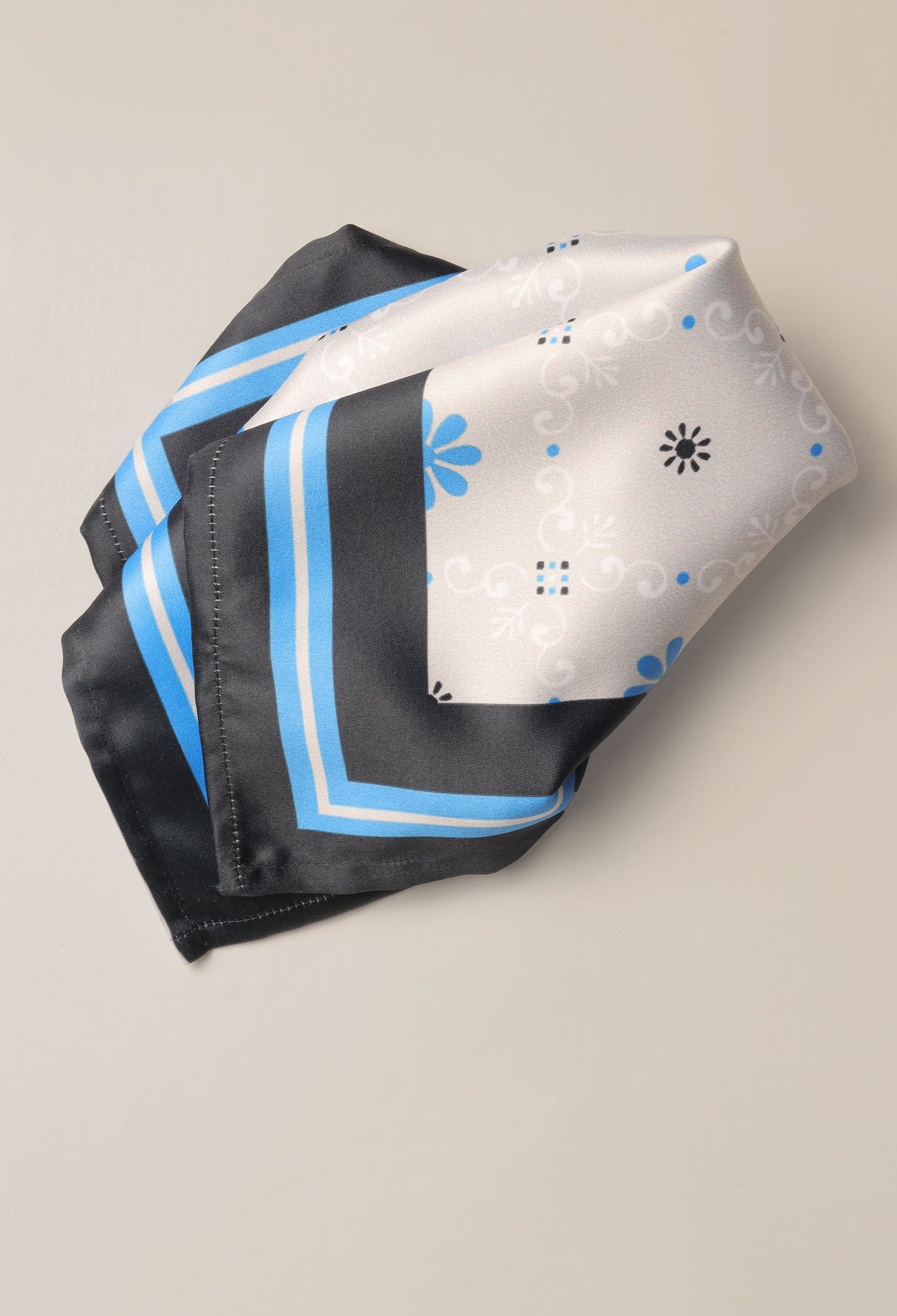 This DAISY BLUE POCKET SQUARE in satin silk is 10x10 inches in size, boasting a digital print composed of daisies and subtle design elements in complementing colors. A unique finish is given by the self-printed color details.