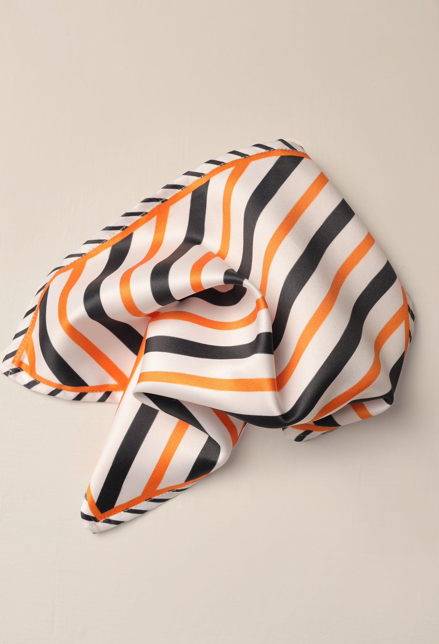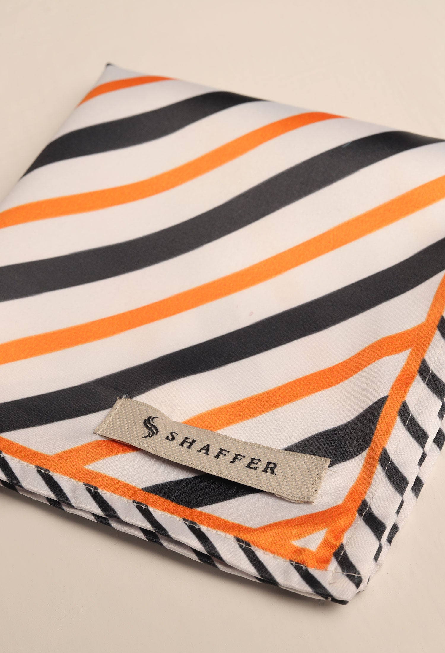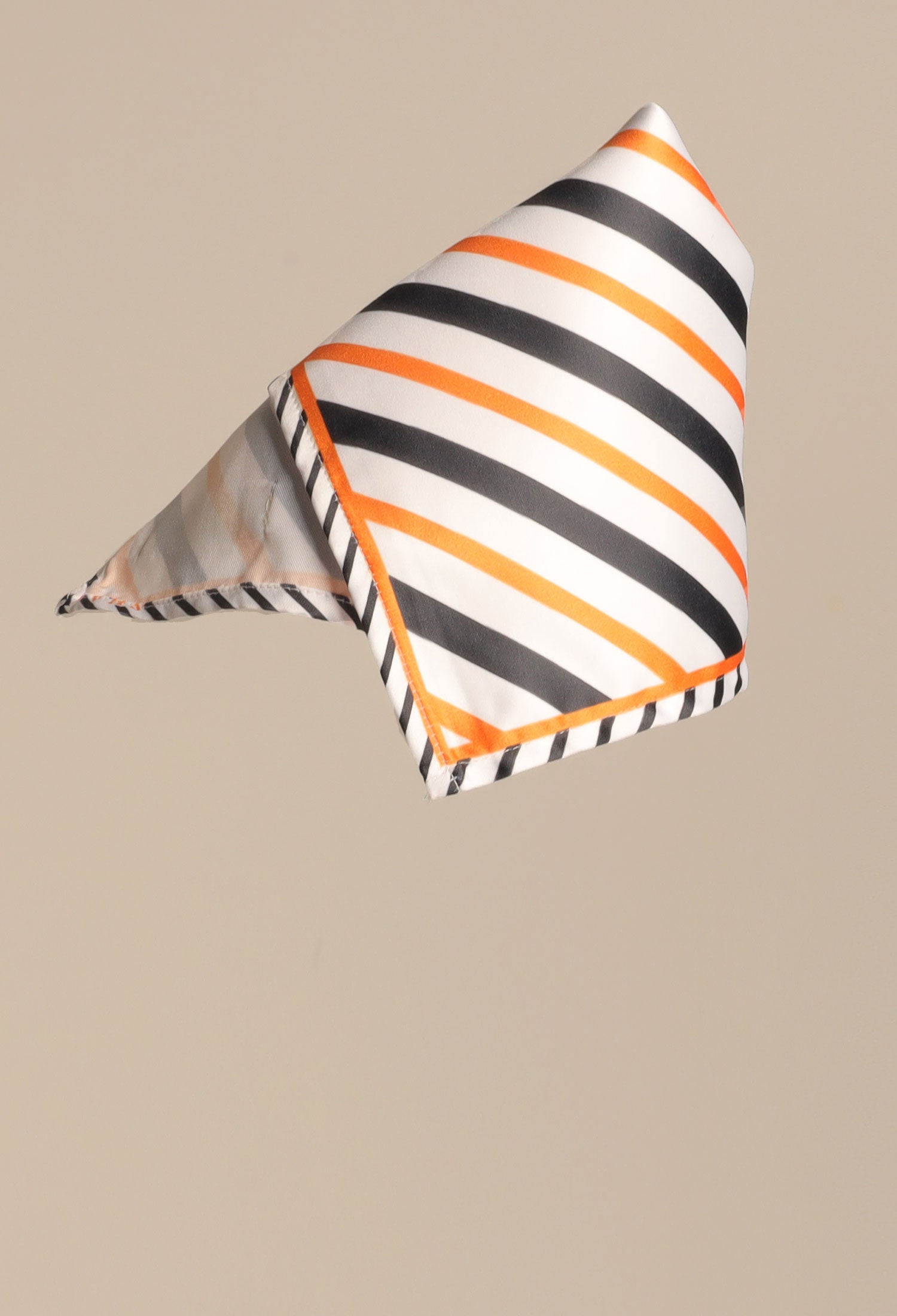This DIAGONAL STRIPE POCKET SQUARE measures 10" by 10", crafted out of Satin Silk fabric and featuring a digital print of two contrasting colors in diagonal stripes.