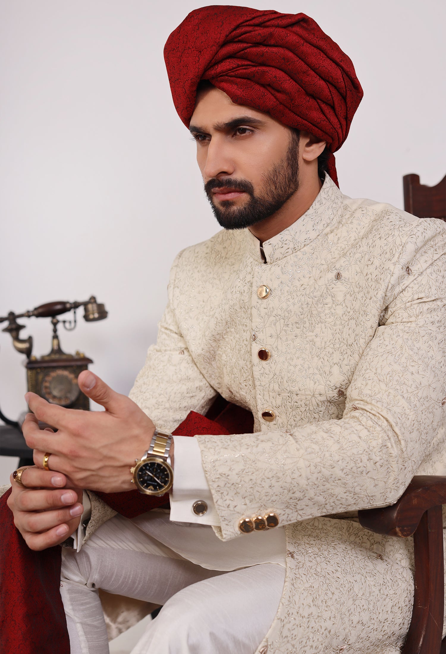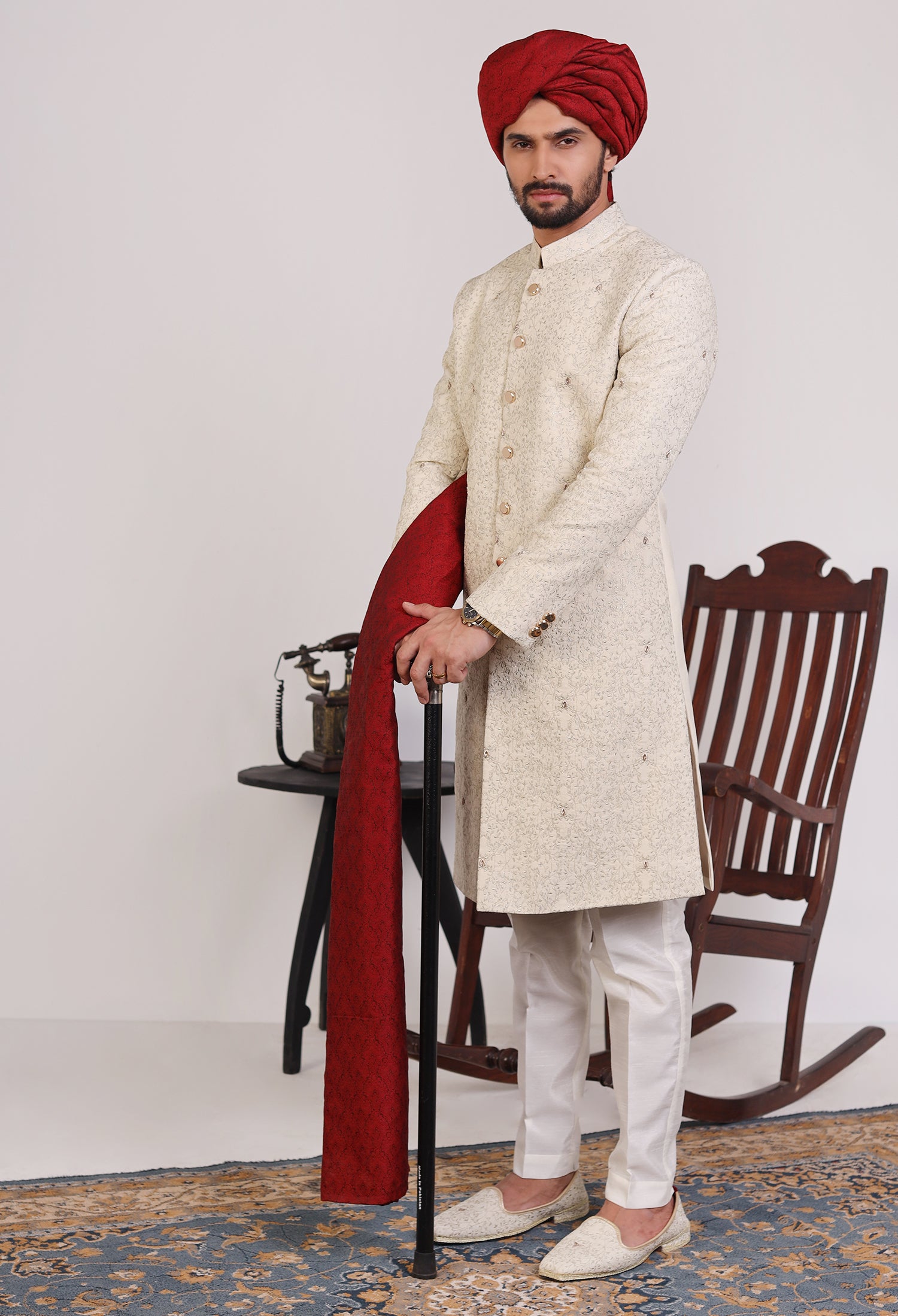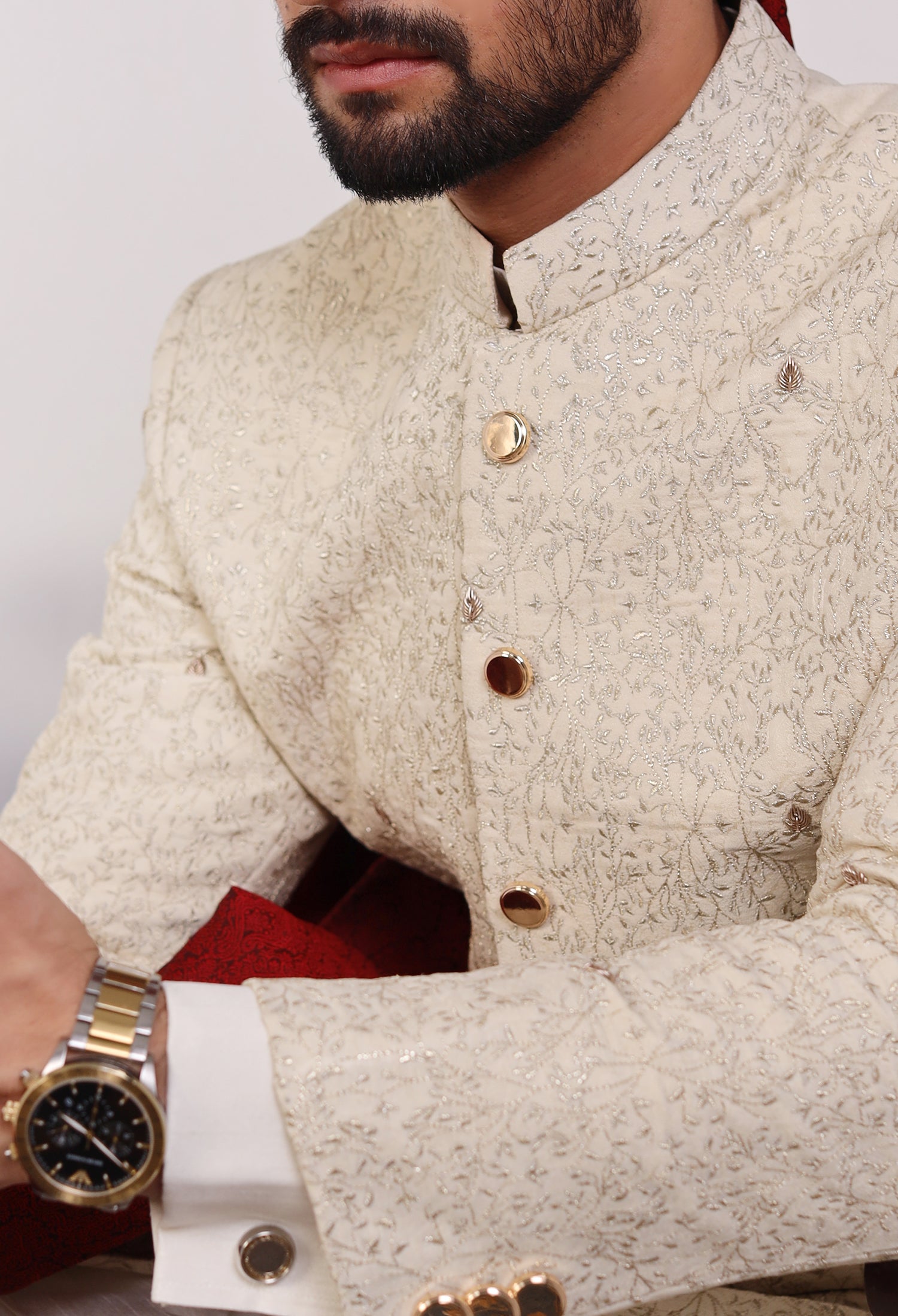 Our Golden Verdant sherwanis combine tradition and modern craftsmanship, featuring hand embroidery, machine embroidery, and intricate thread work on luxurious jamawar fabric. Each piece is designed with precision, where hand embroidery adds a unique, artisanal touch, machine embroidery offers consistent, detailed patterns, and thread work brings texture and depth. The smooth, glossy satin serves as the perfect canvas, enhancing the intricate designs and ensuring the sherwani is both comfortable and visually stunning. These elements come together to create a sophisticated garment that reflects cultural heritage and timeless elegance