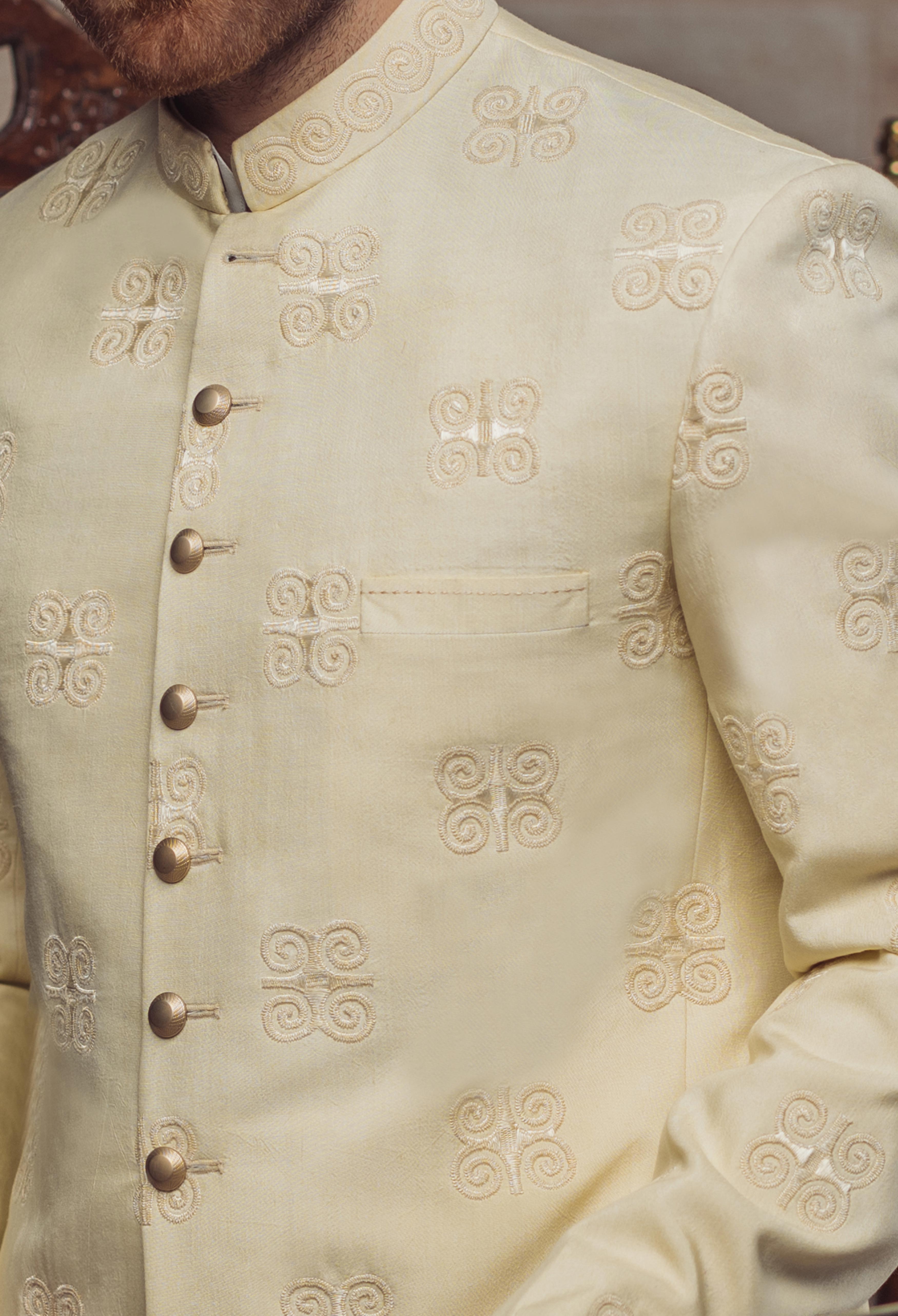 Discover a regal look with this Egyptian Art Sherwani crafted from smooth raw silk fabric with delicately detailed metal buttons! Feel like a Pharaoh in this sophisticated, yet fun style.