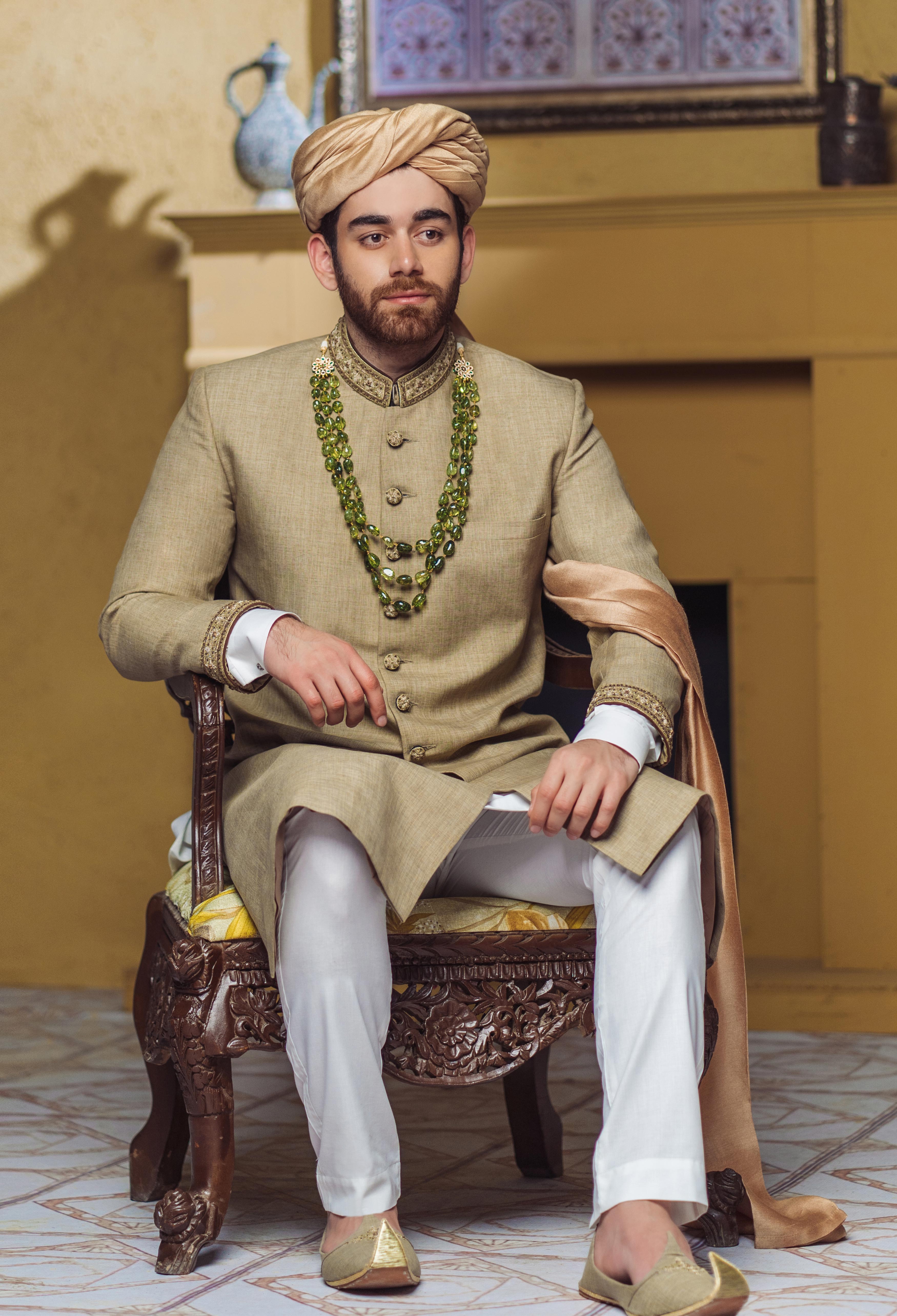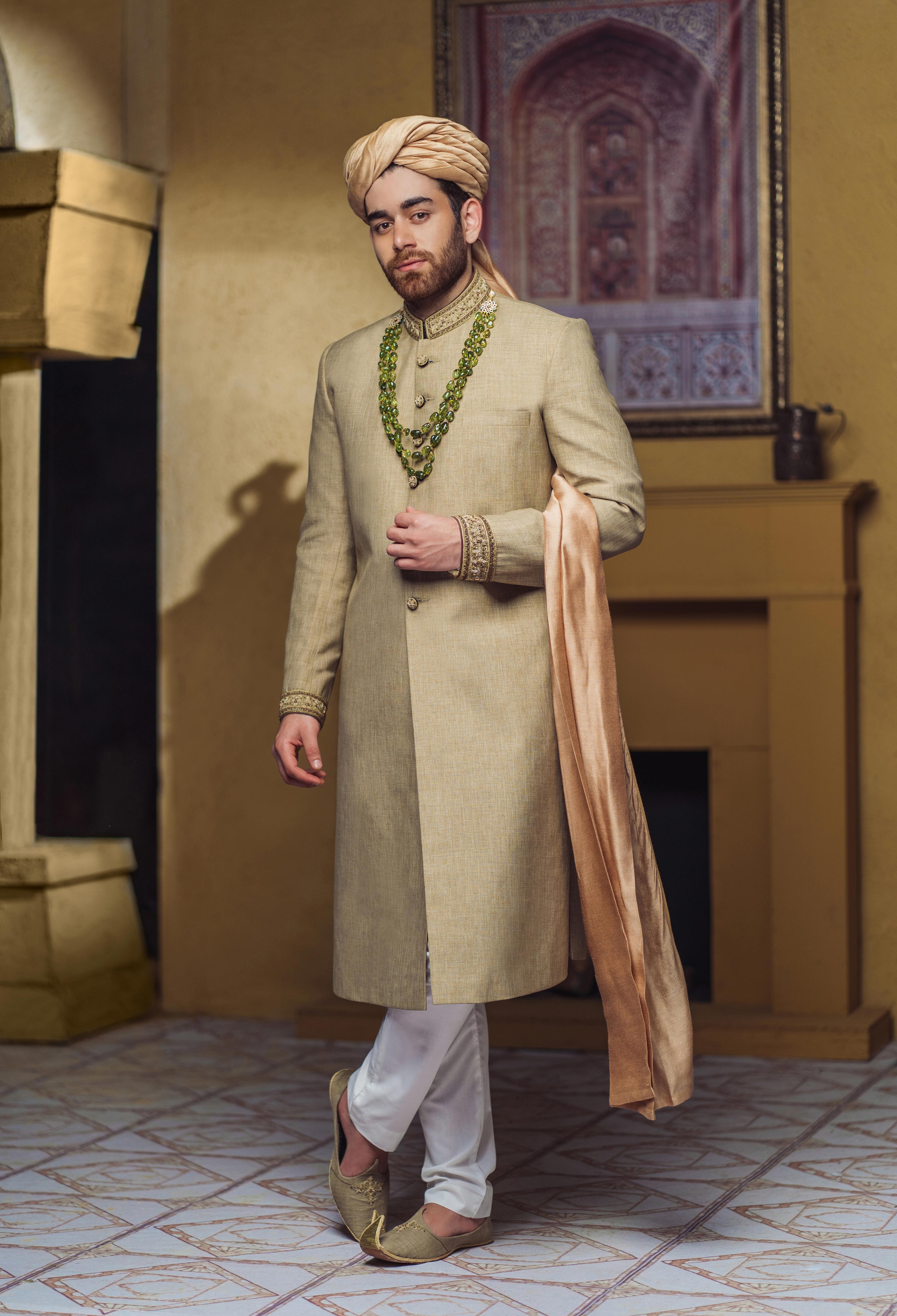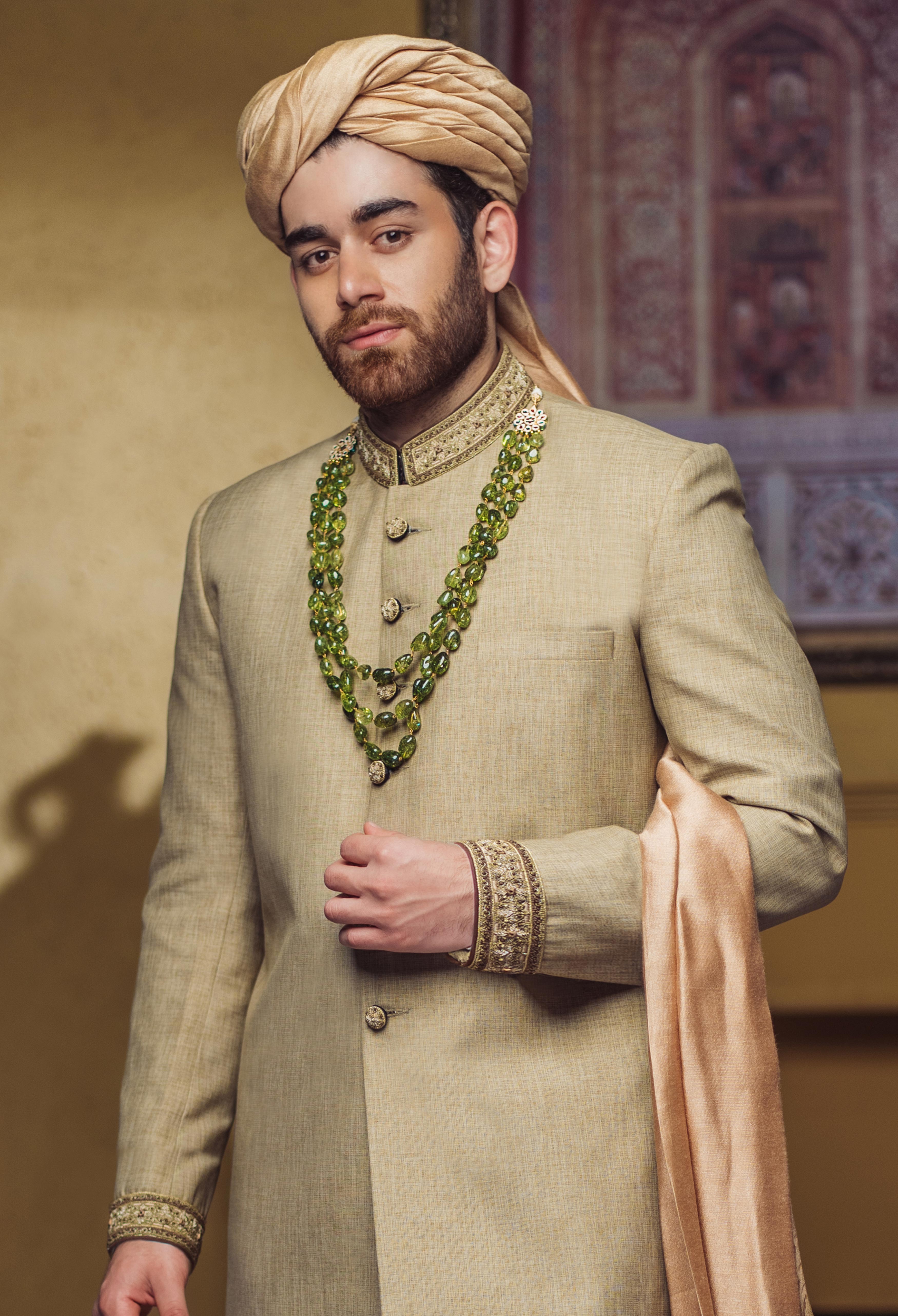 SULTAN Zardozi's tantalizing work adorns the collar and sleeves, Sherwani, and Suiting Fabric while intricate Hand Made Buttons complete the look.