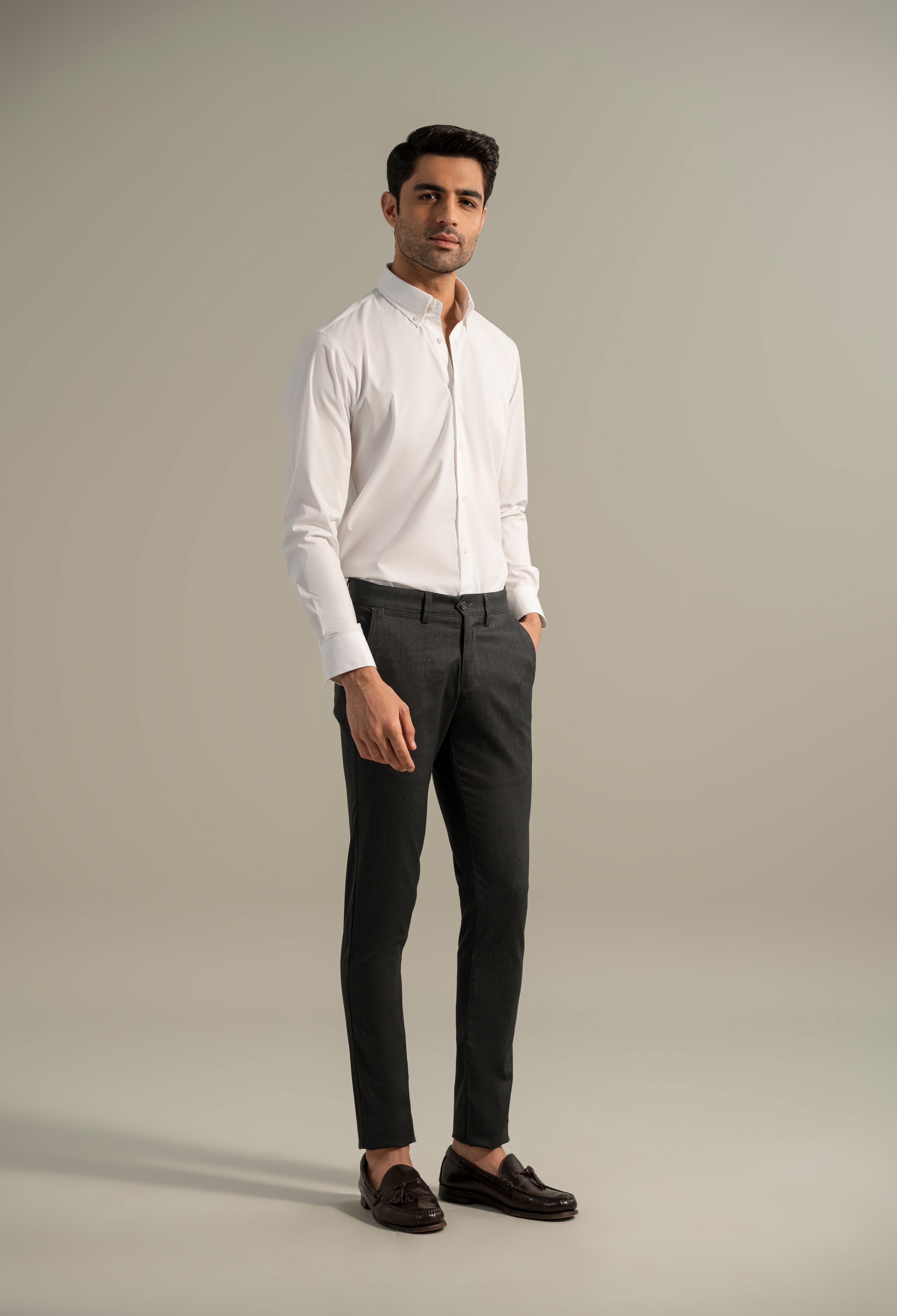 The Snow White Semi Formal Shirt is crafted with a round hem and cut cuffs for a modern silhouette. It features durable plastic buttons and a customized button-down collar, paired with a plain button placket for a clean finish.