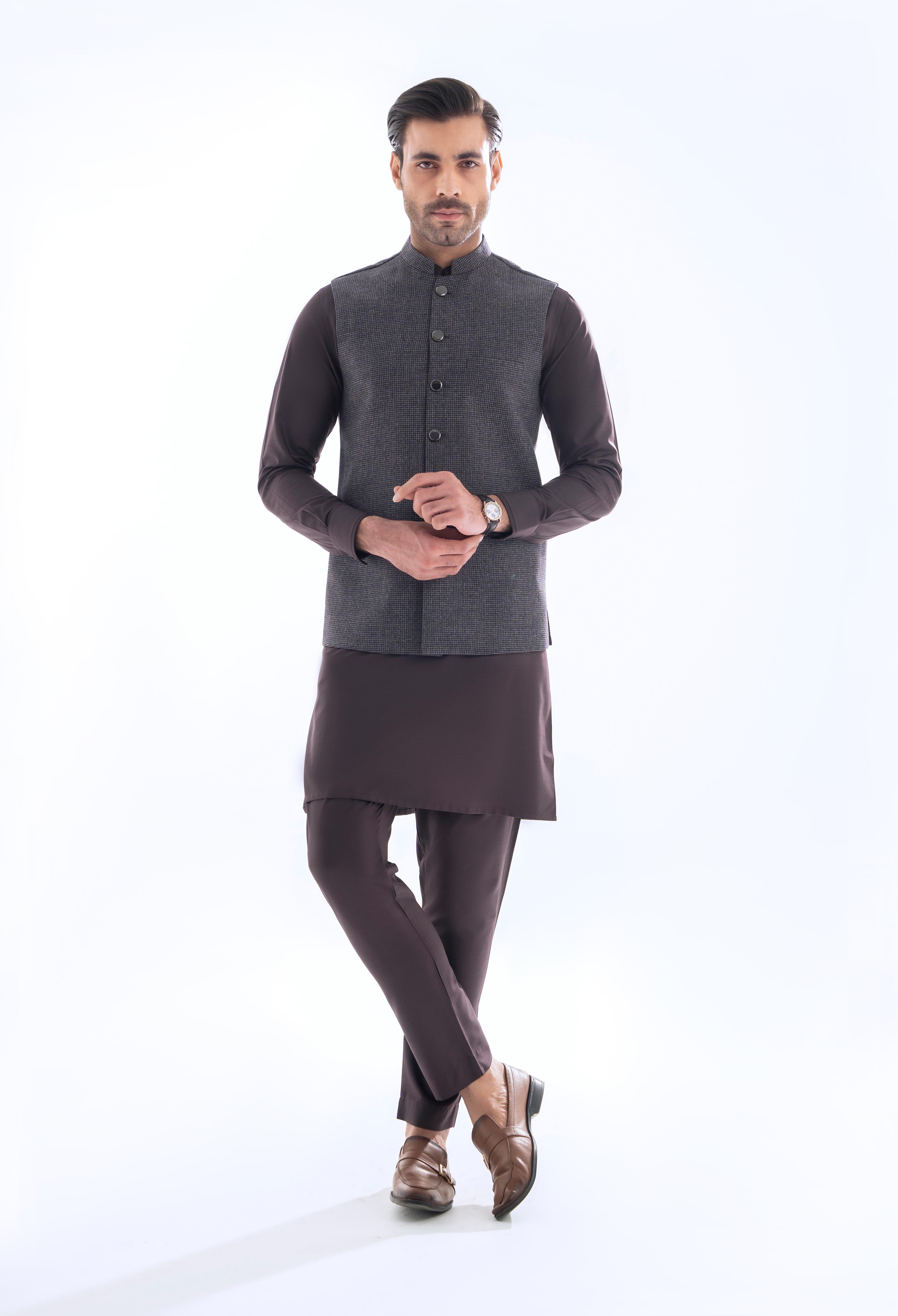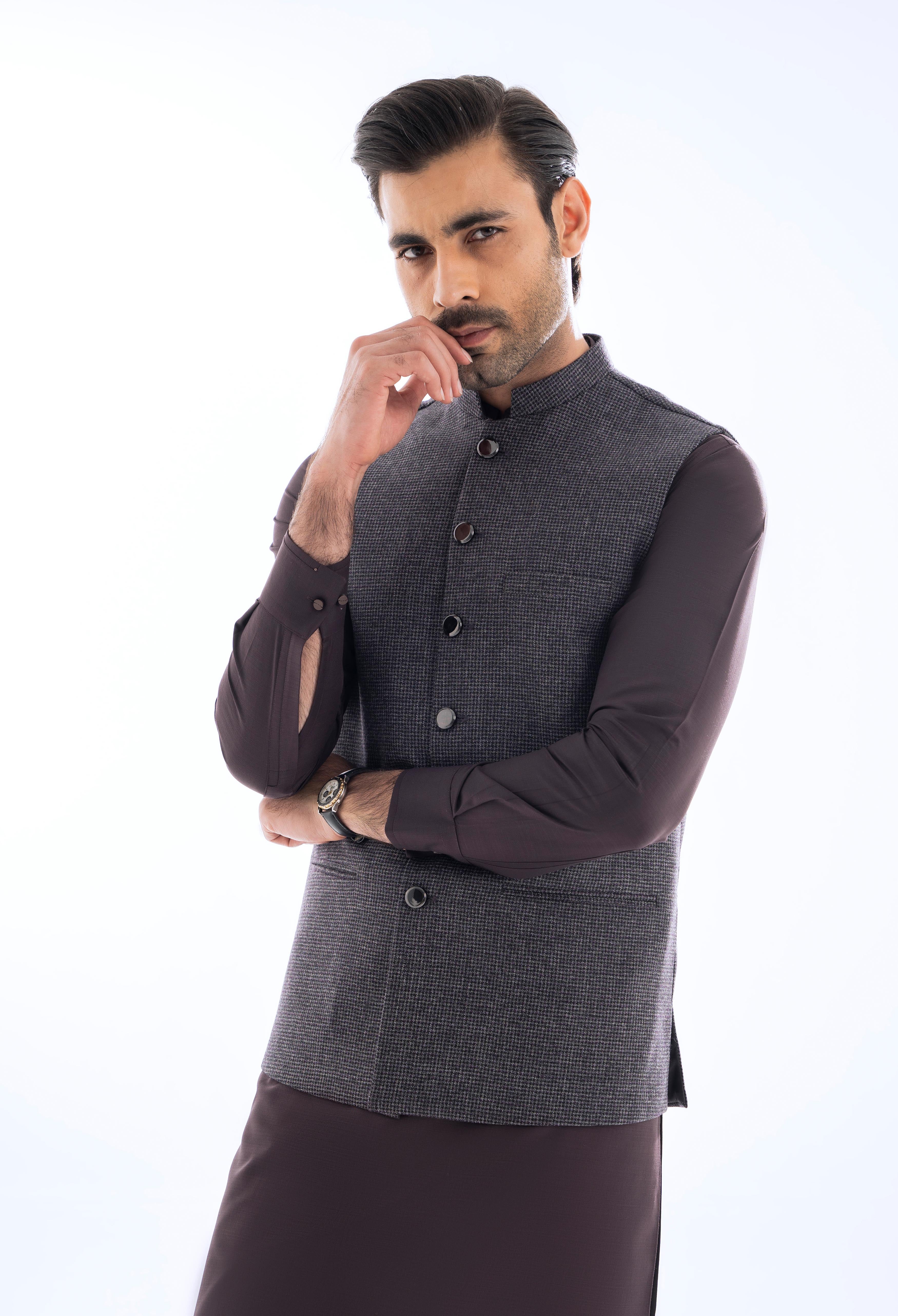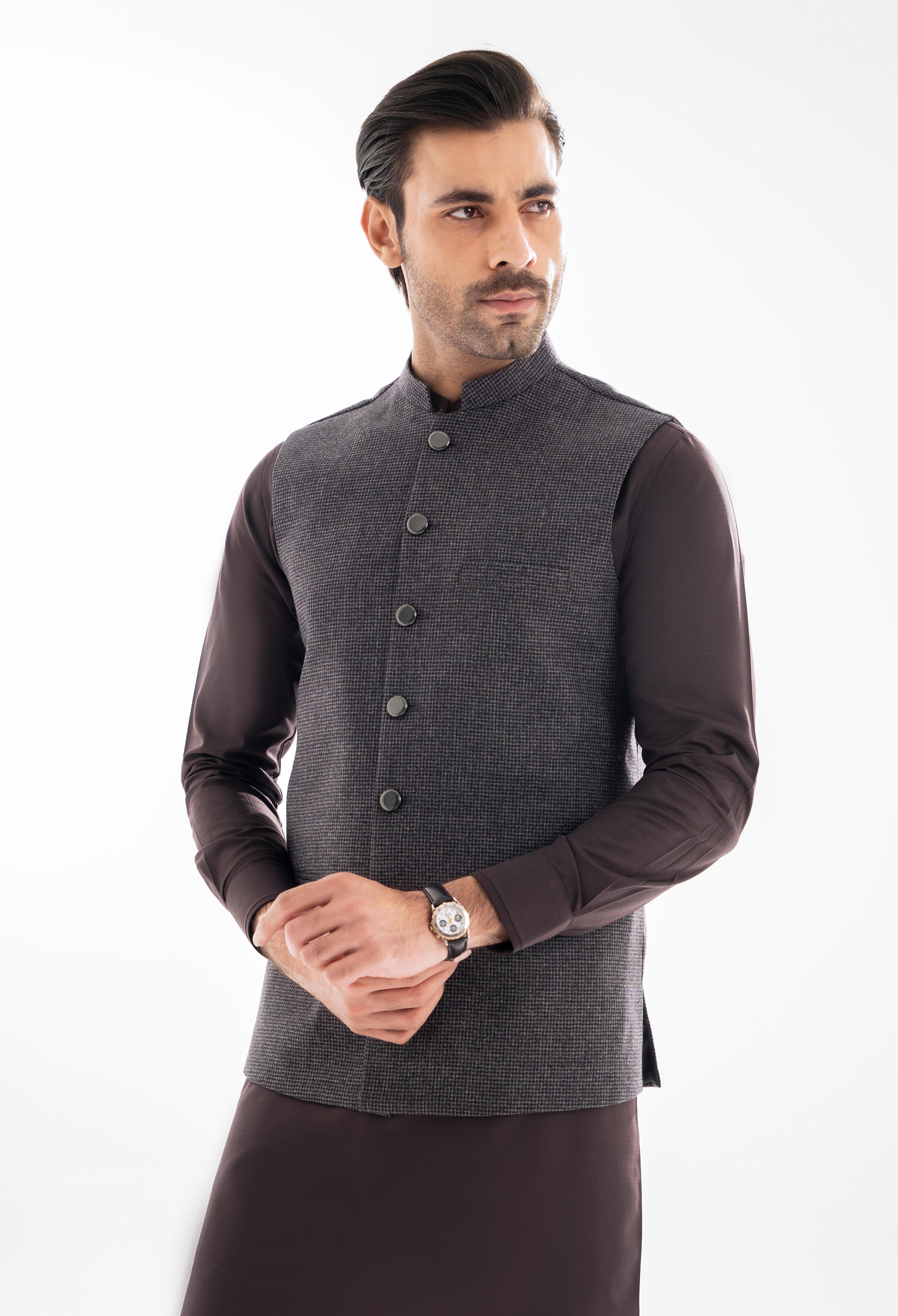 This elegant waistcoat is designed to impress, featuring a sleek band collar and metallic buttons that add a modern touch. The warm floral print lining and matching pocket square enhance its sophistication, blending intricate detail with elite craftsmanship for a standout look.