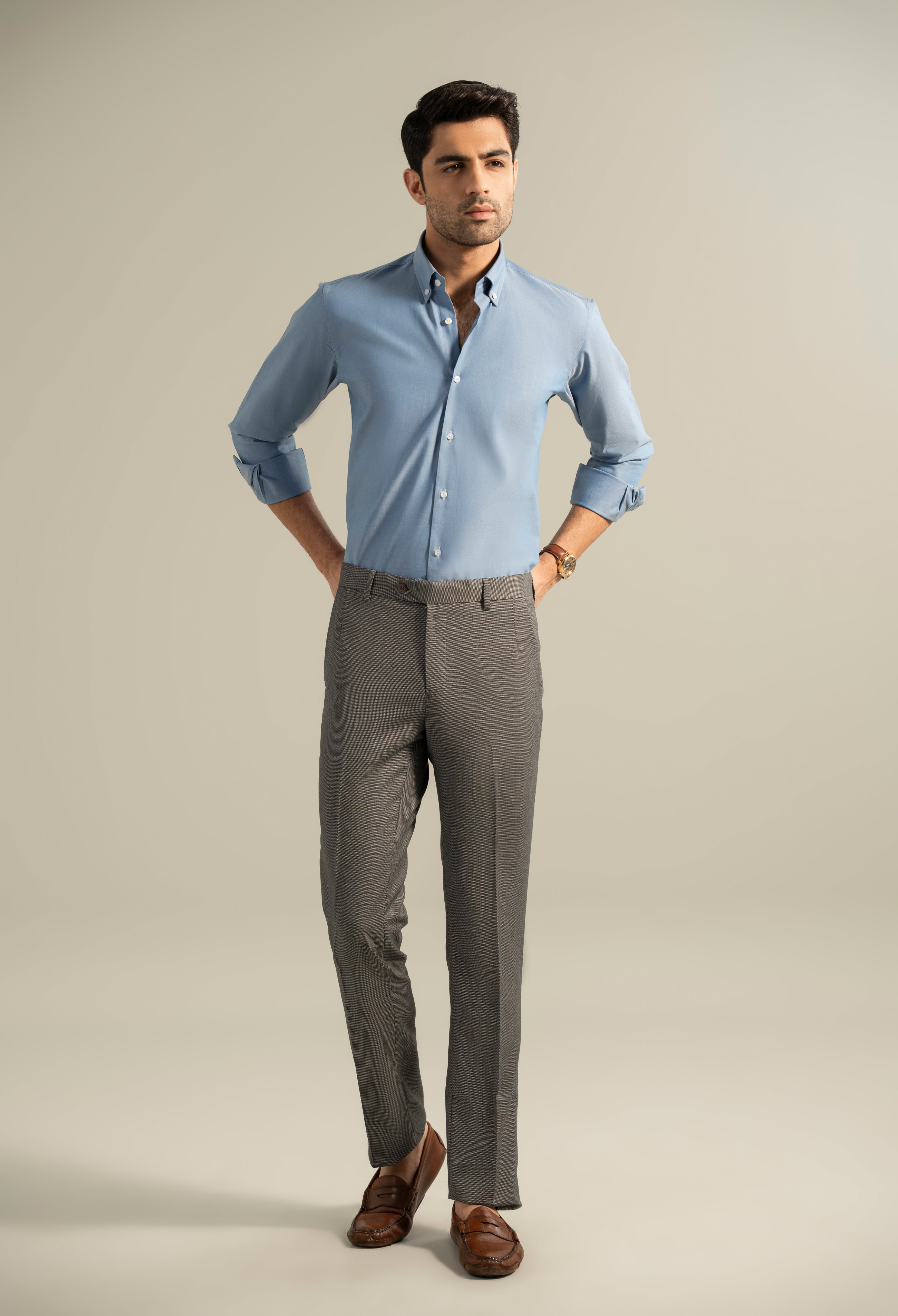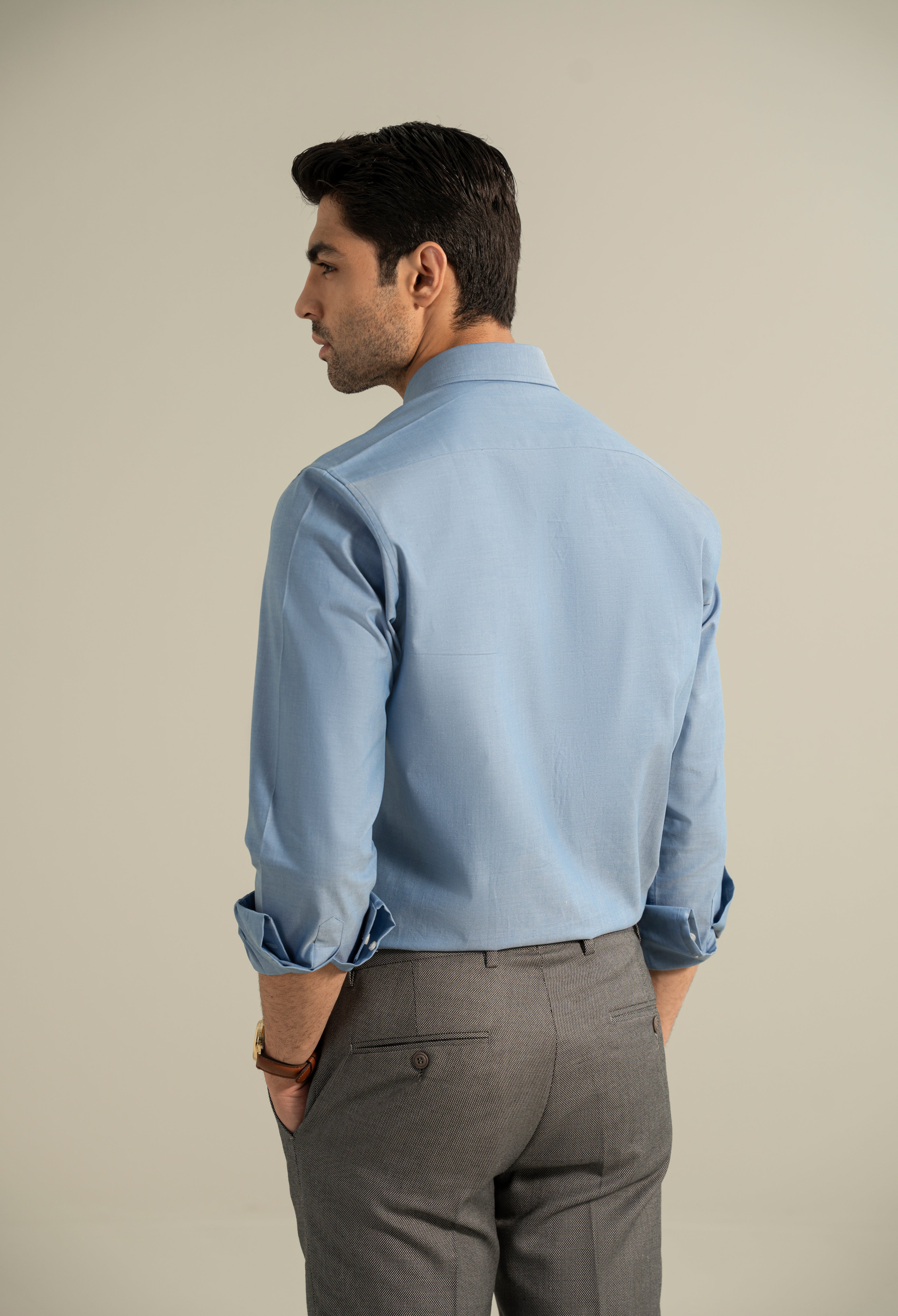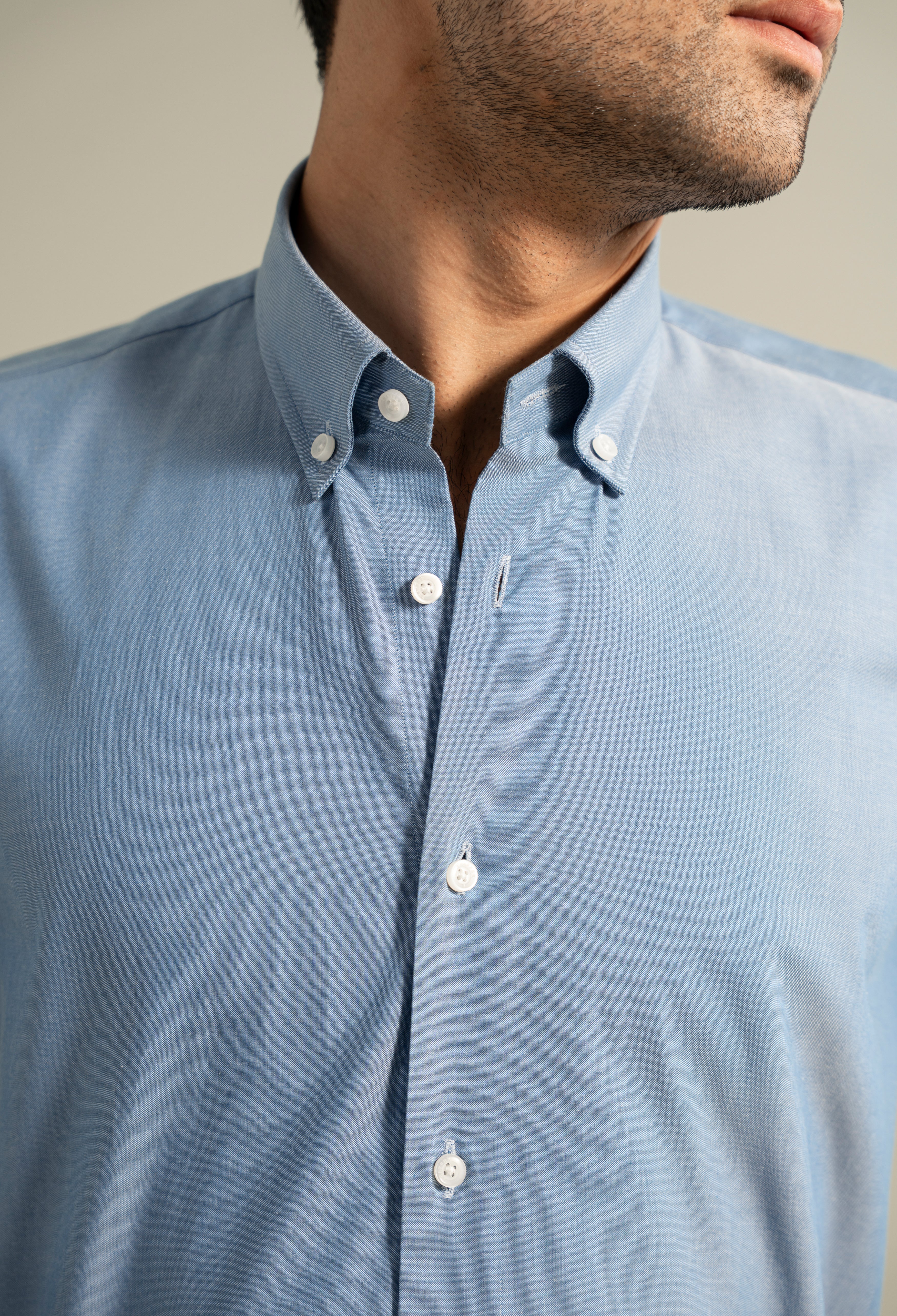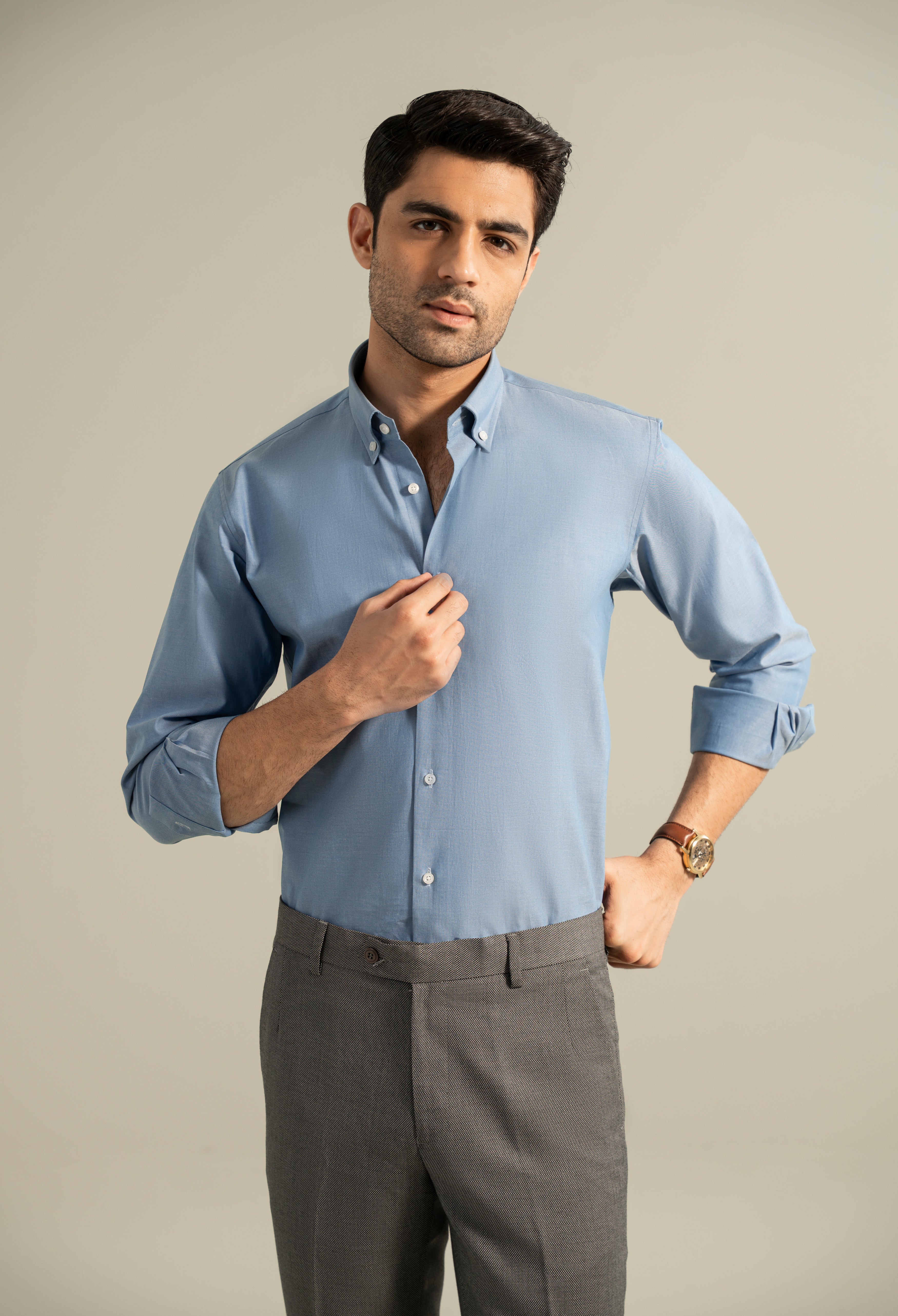 The Cosmic Blue Semi Formal Shirt is crafted with a round hem and cut cuffs for a modern silhouette. It features durable plastic buttons and a customized button-down collar, paired with a plain button placket for a clean finish.