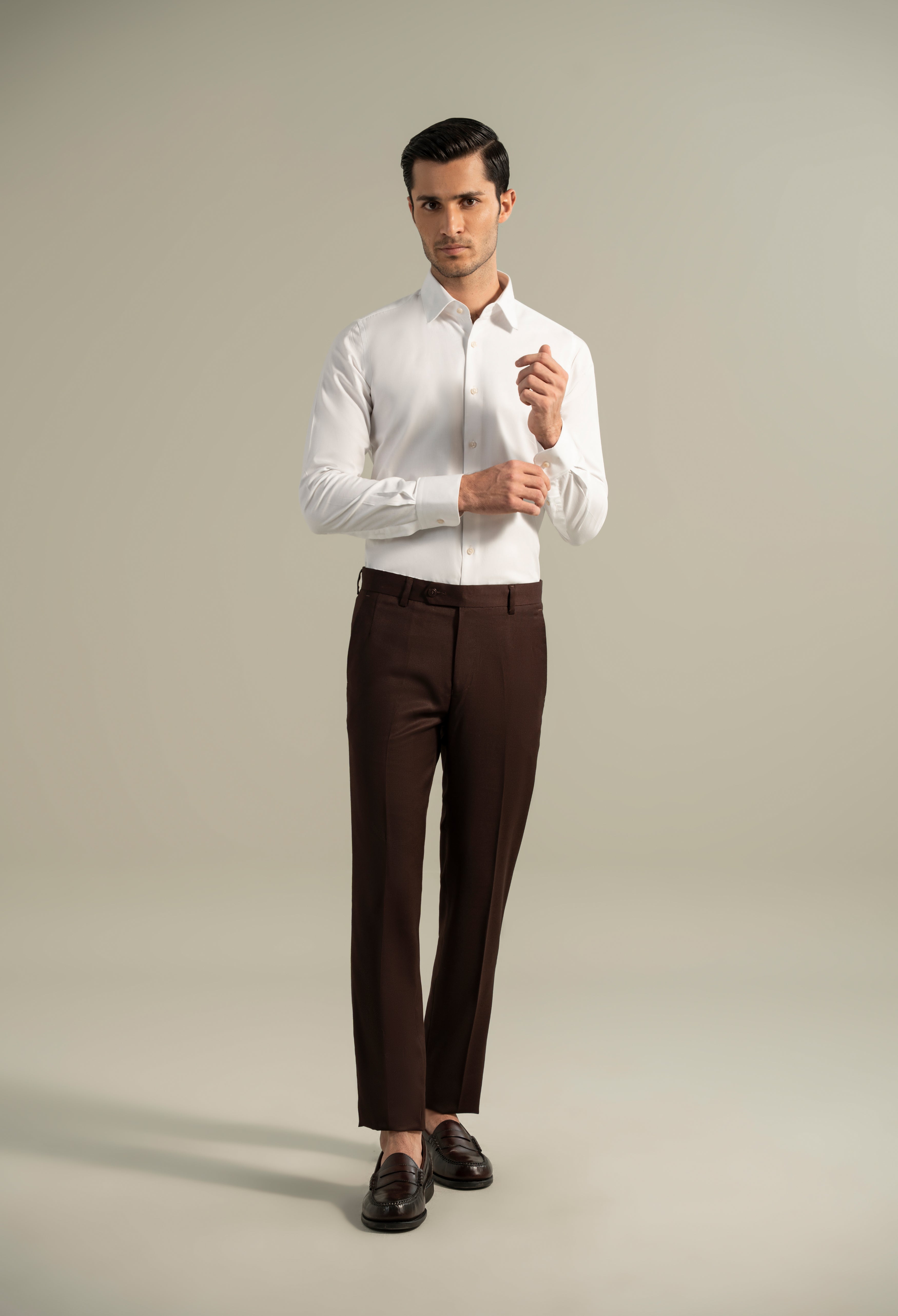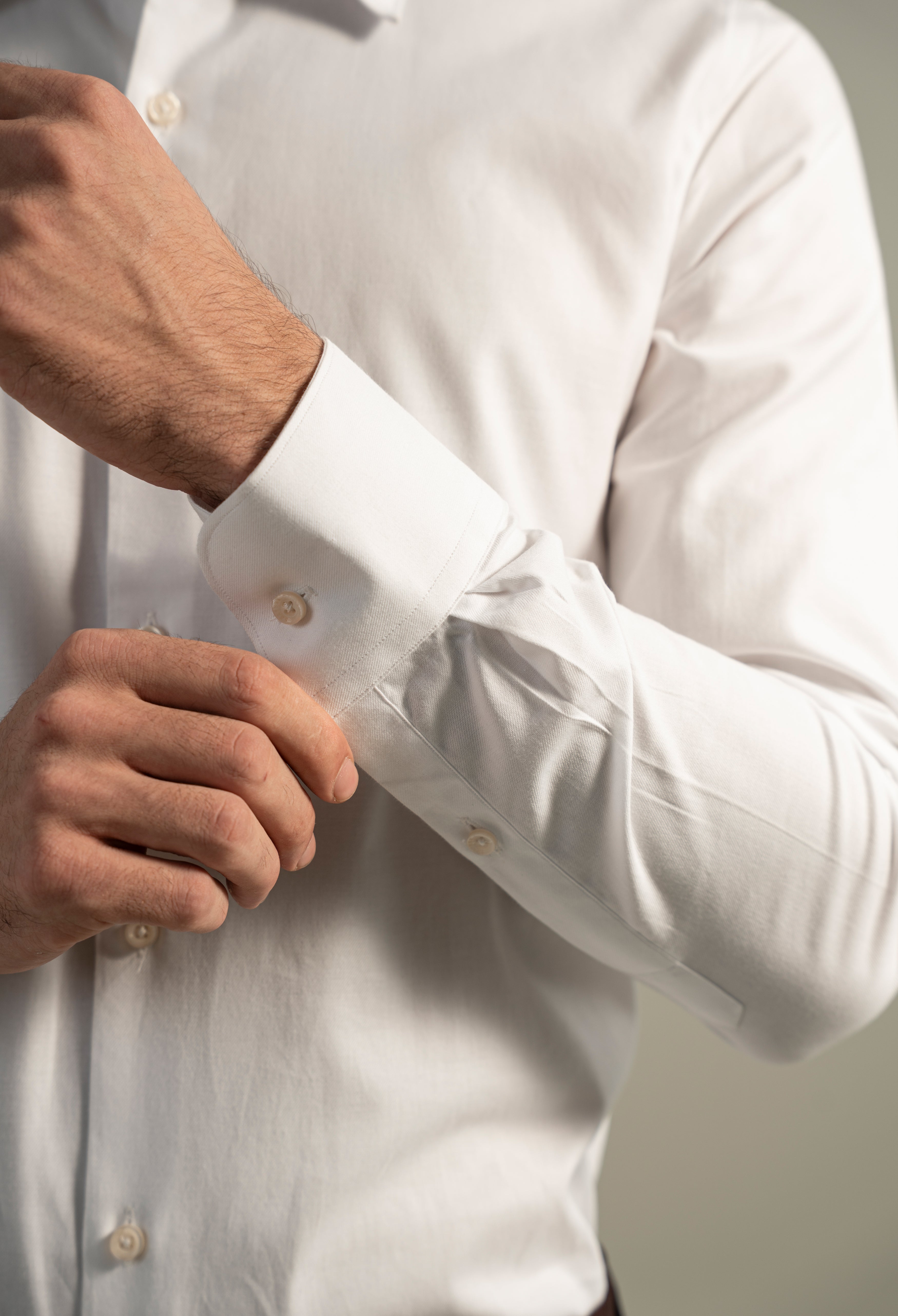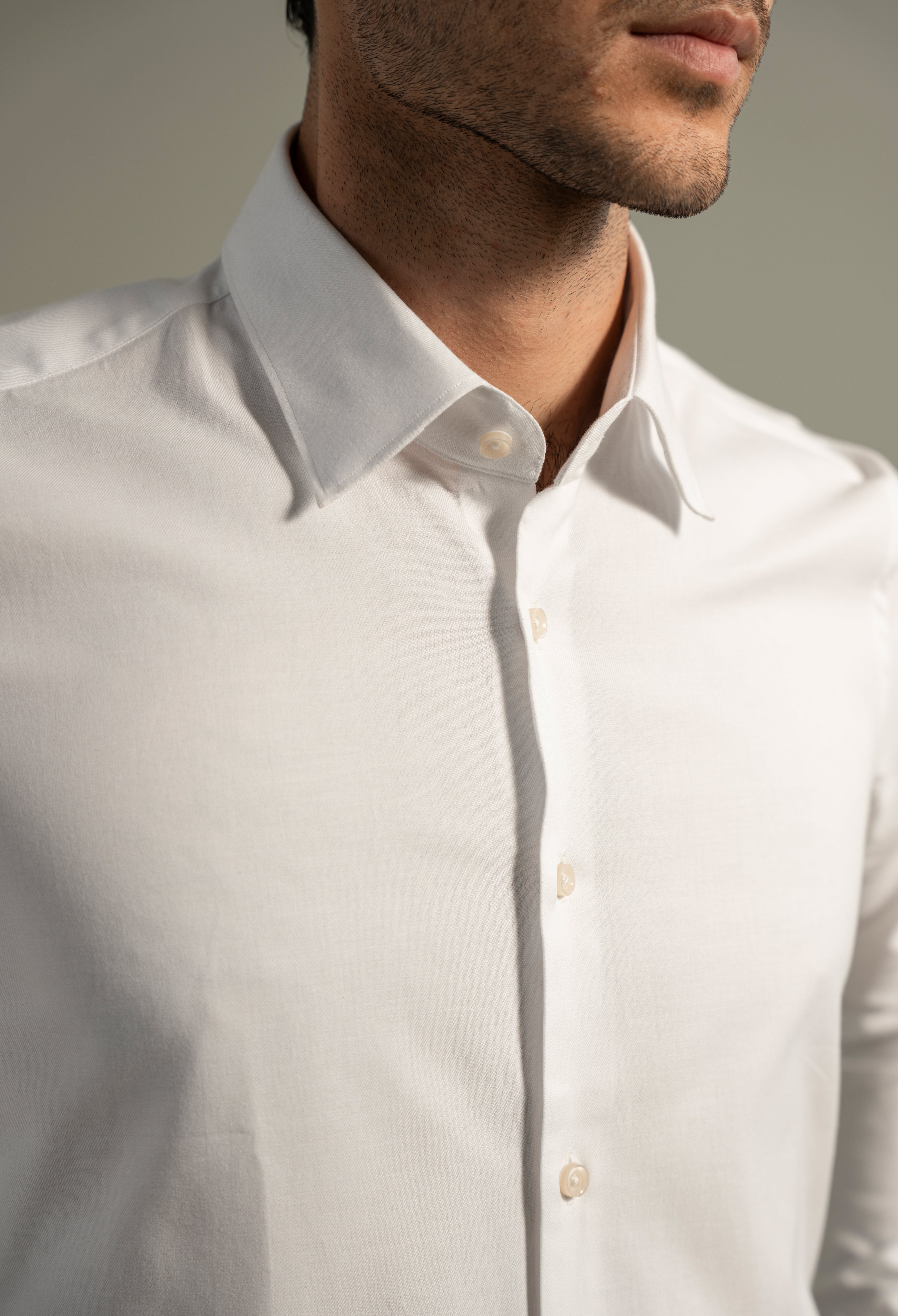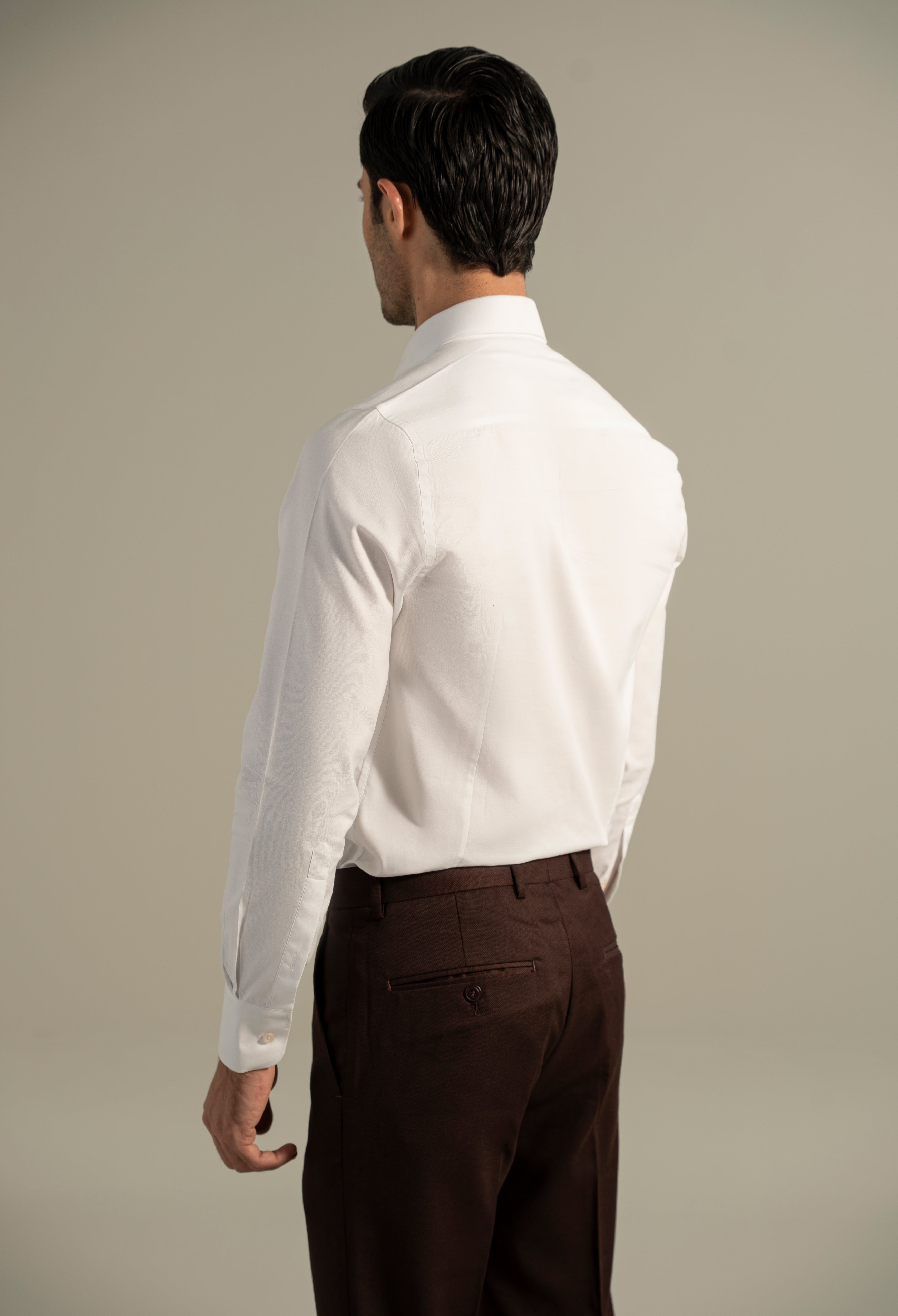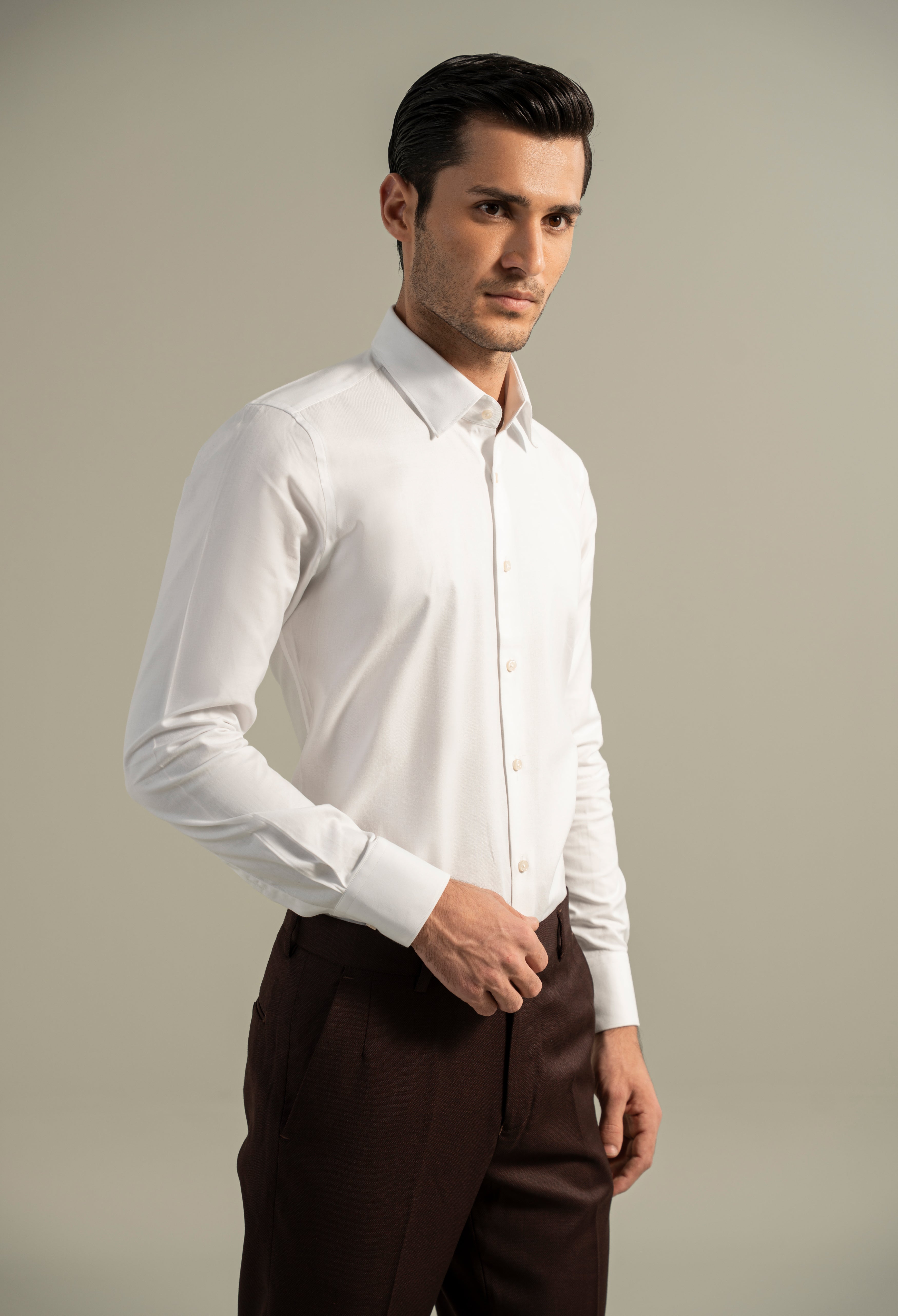Cotton White shirt features expert tailoring with a round hem and cut cuffs for a refined silhouette. It includes durable plastic buttons and a customized shirt collar designed for both comfort and style. The plain button placket maintains a clean, classic look, crafted precisely to match sample specifications for consistent quality and fit.