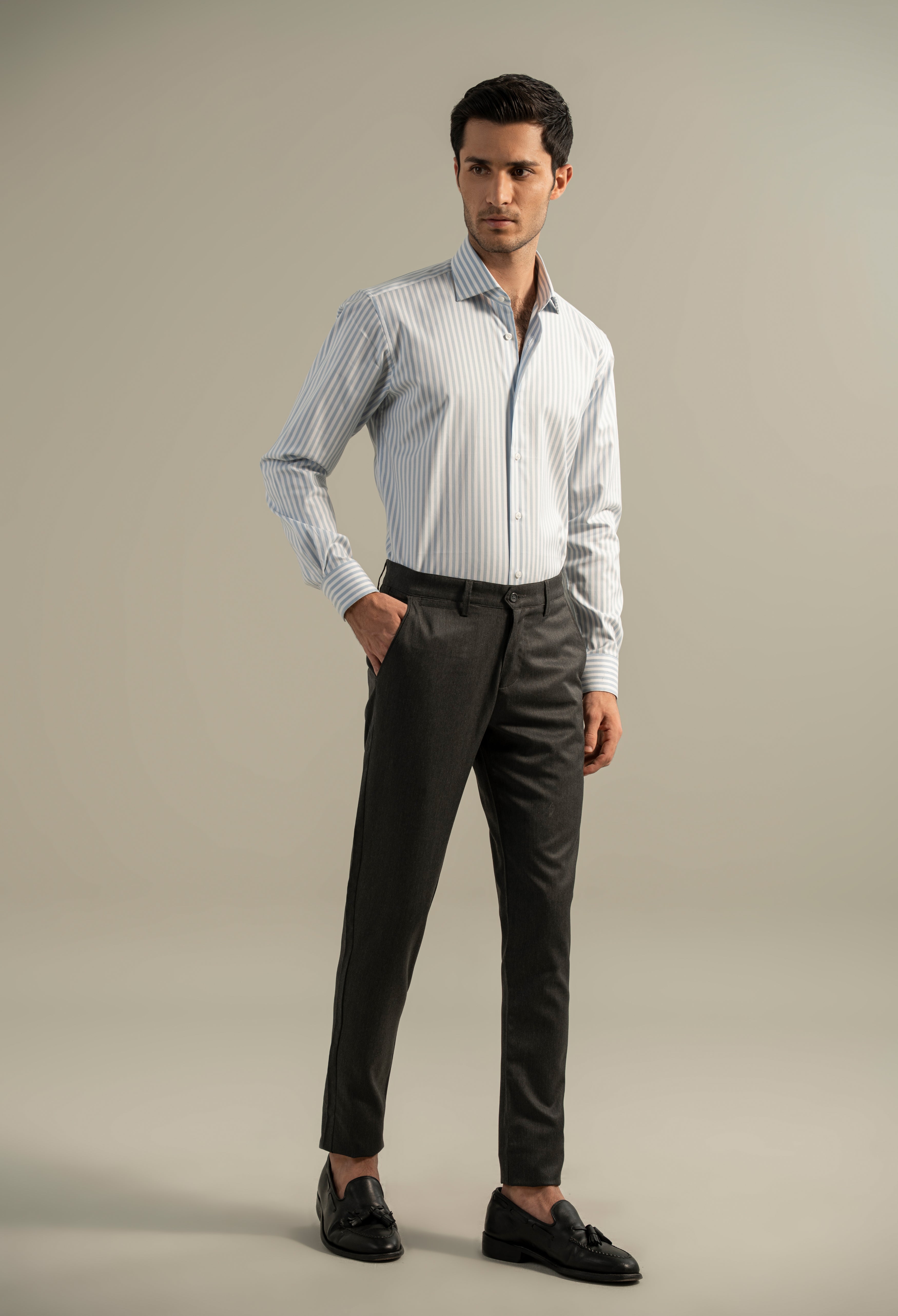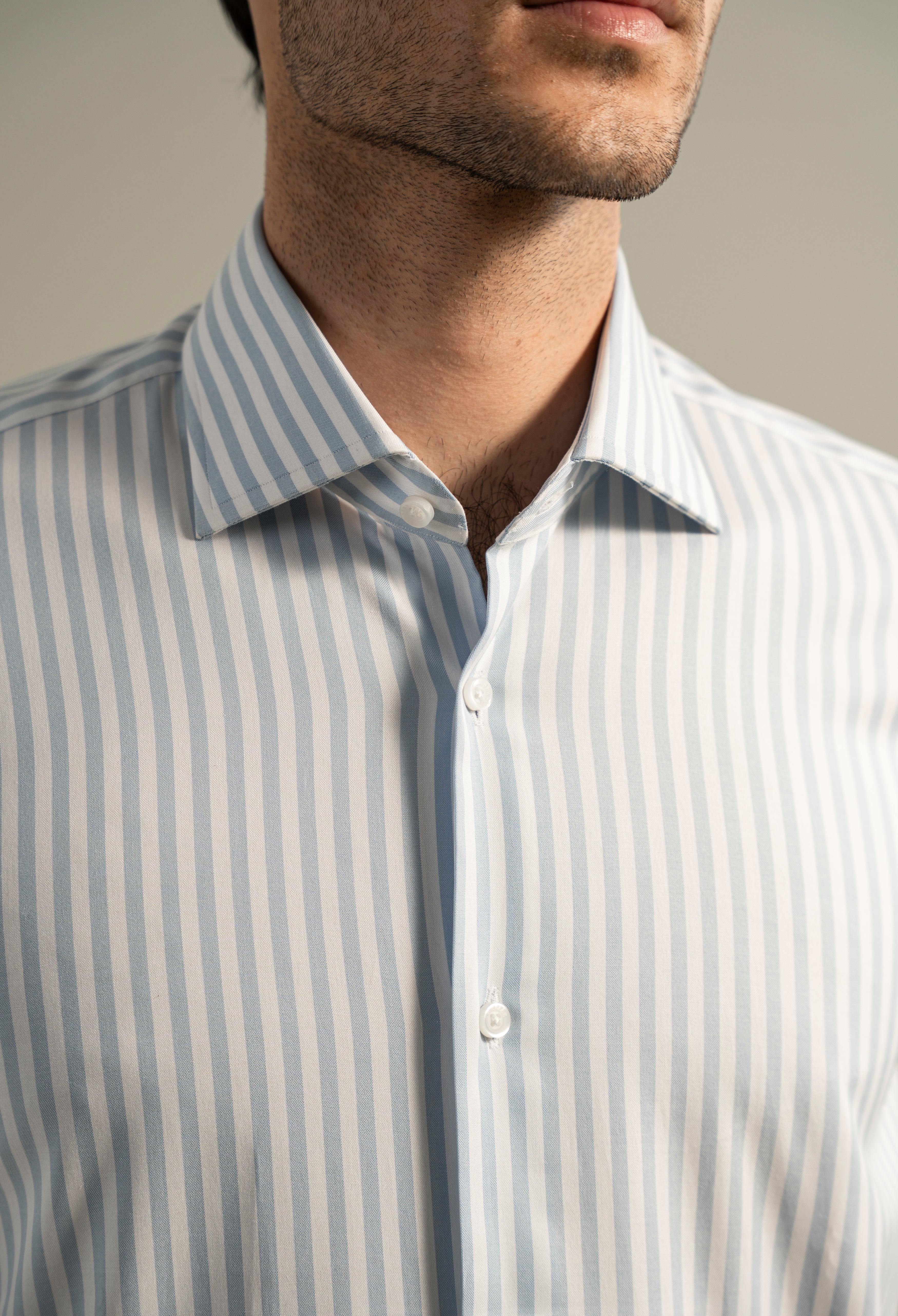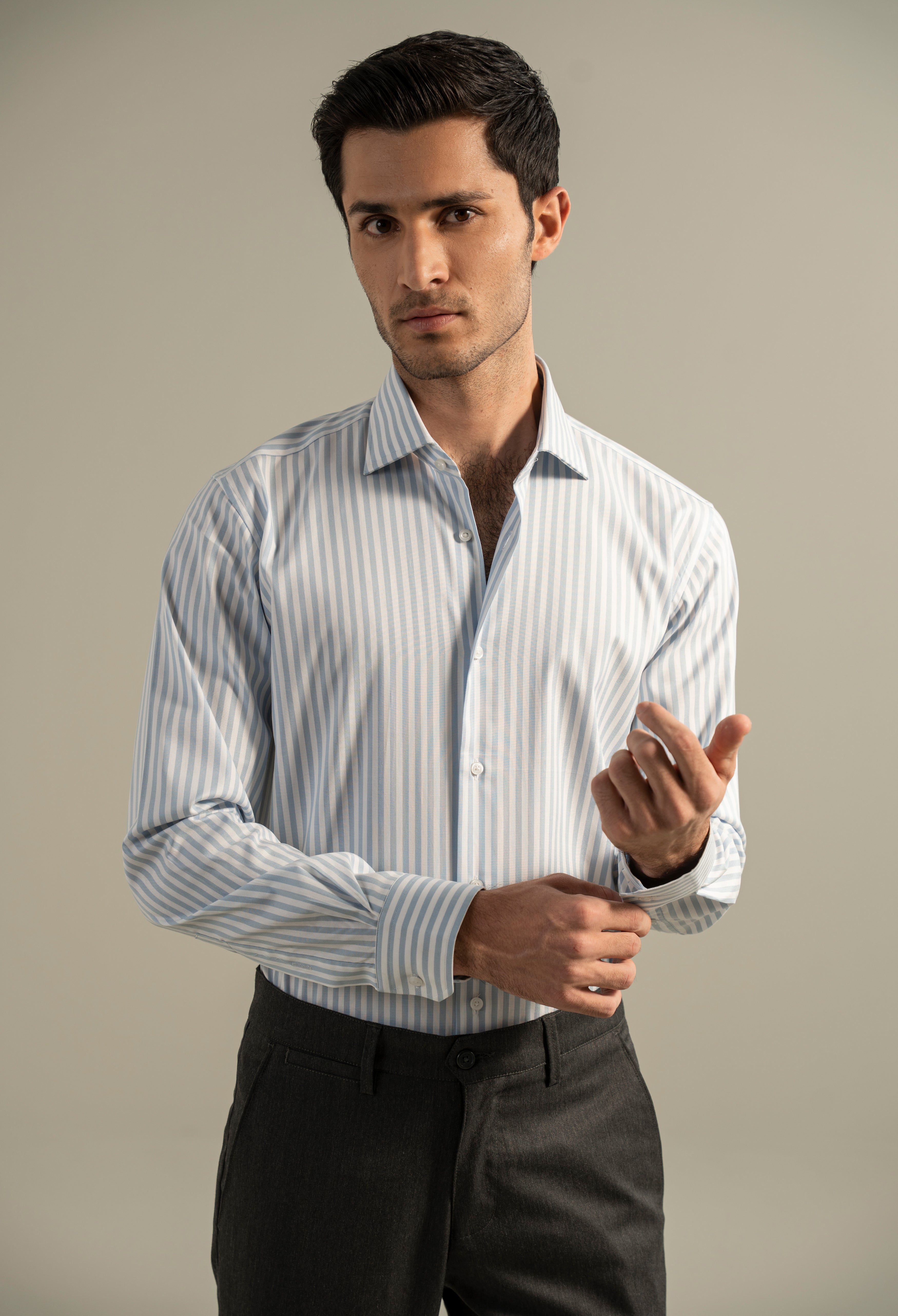 Elevate your wardrobe with the Ice Blue Stripe Shirt, expertly crafted for a refined and polished look. Its subtle blue stripes offer a timeless pattern that pairs effortlessly with both casual and formal attire.