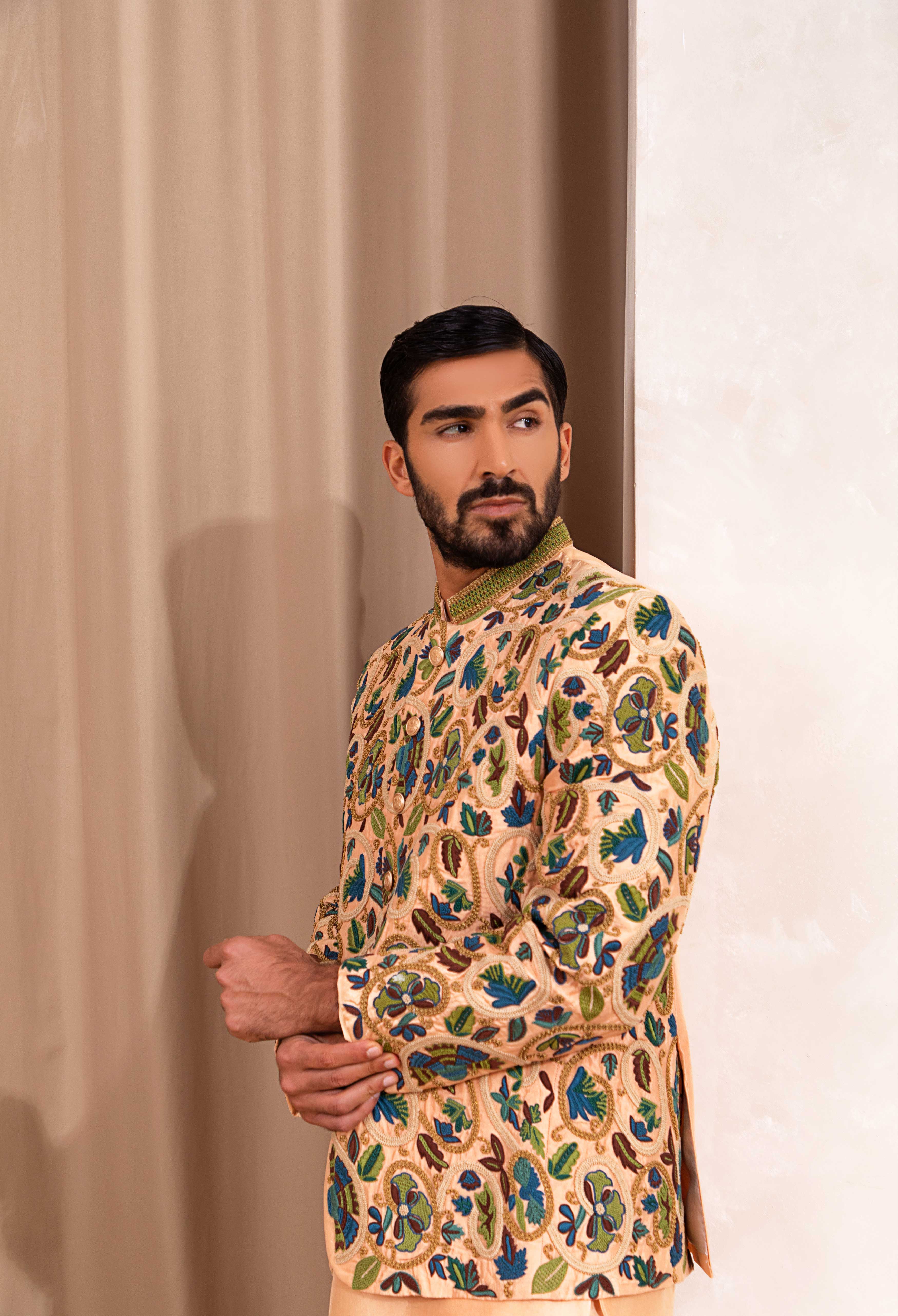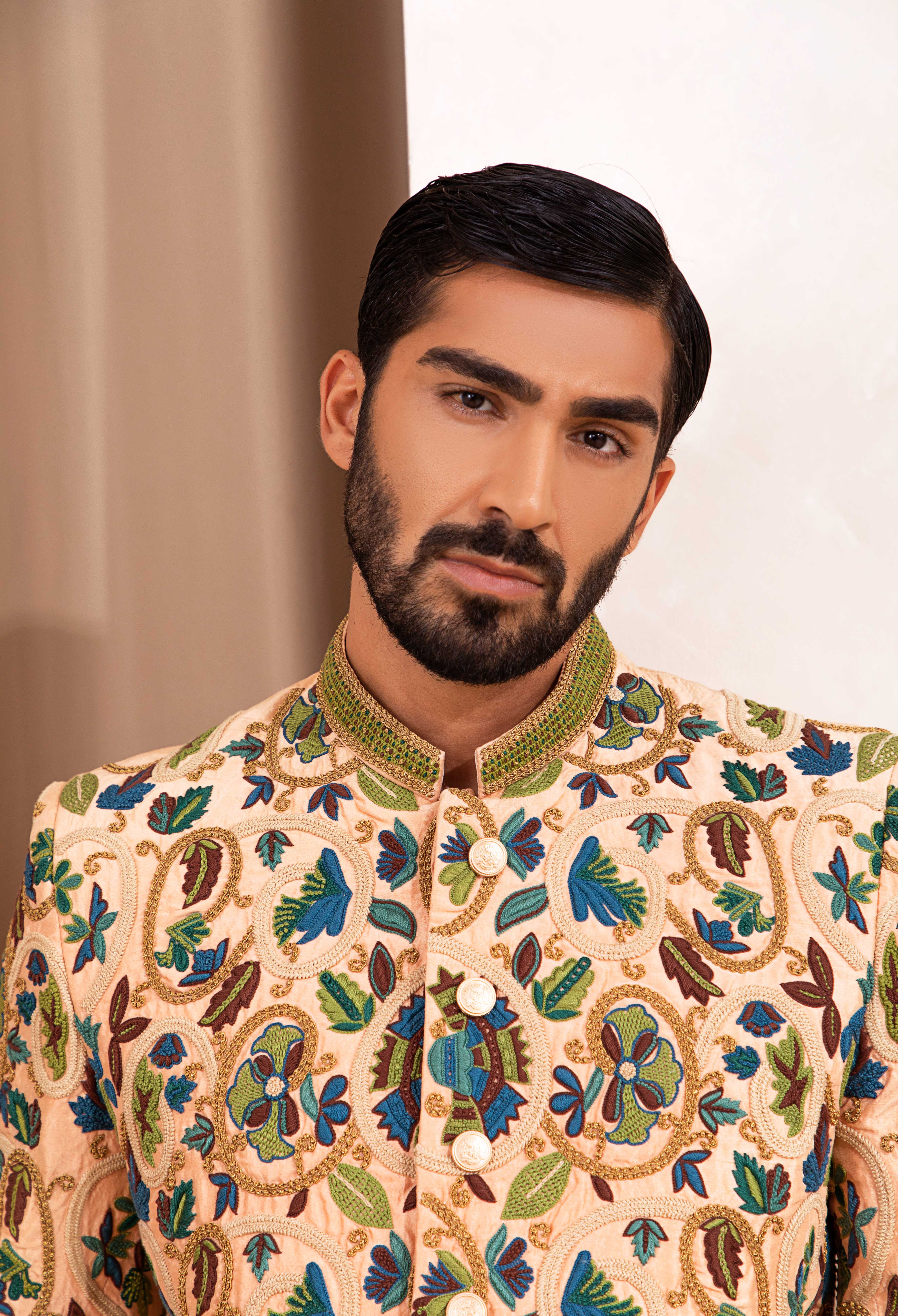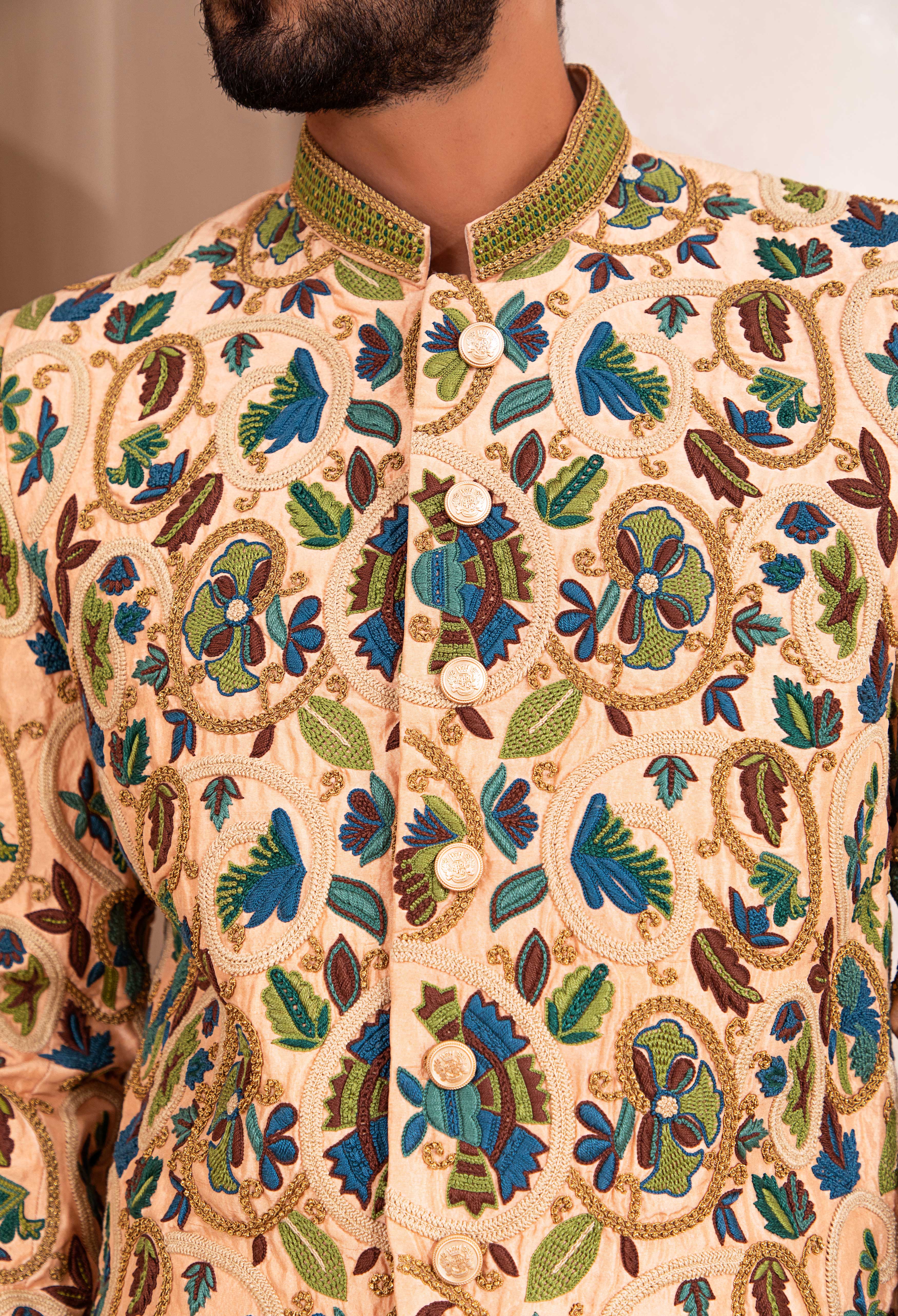 Description: Luxurious raw silk, exquisitely adorned with Ari and zardozi work, make this Ibtikar prince coat a standout!