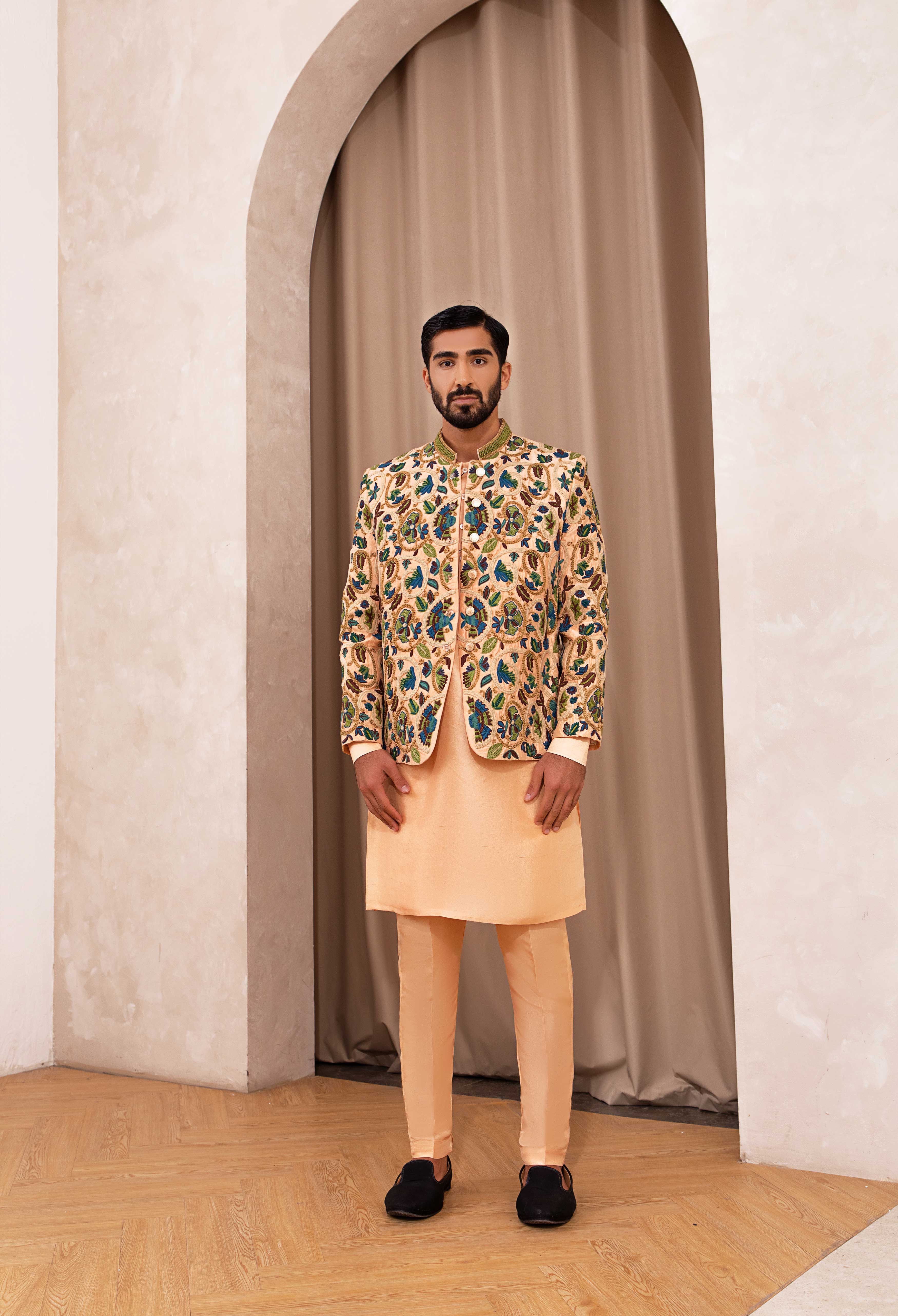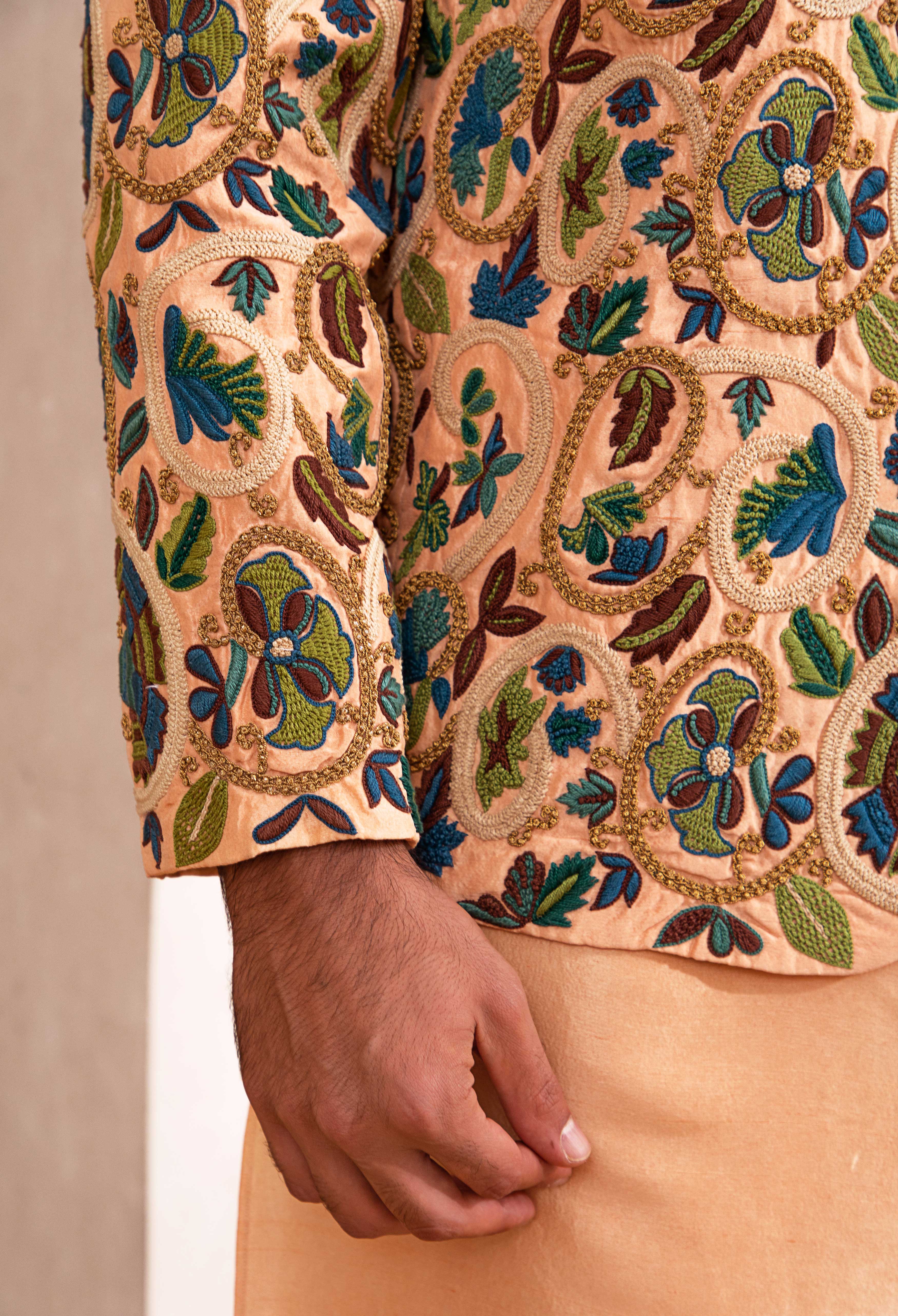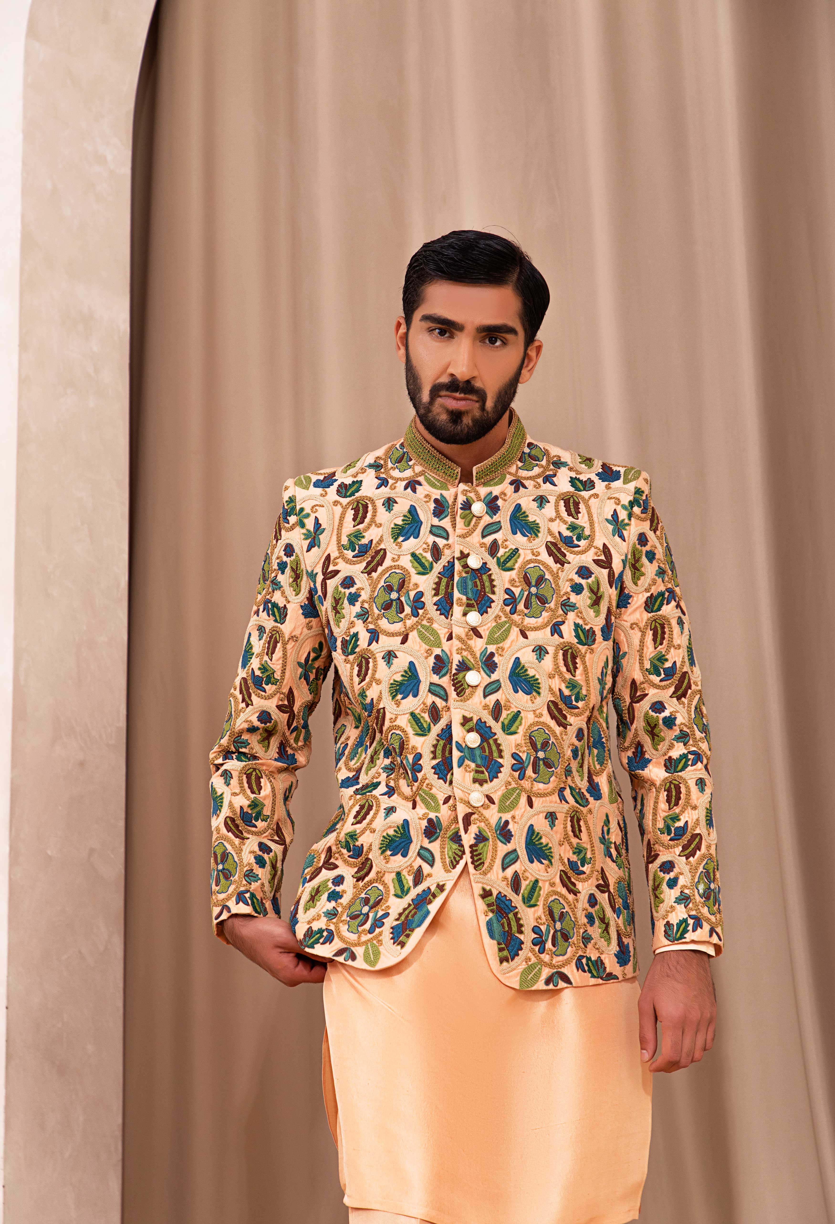 Description: Luxurious raw silk, exquisitely adorned with Ari and zardozi work, make this Ibtikar prince coat a standout!