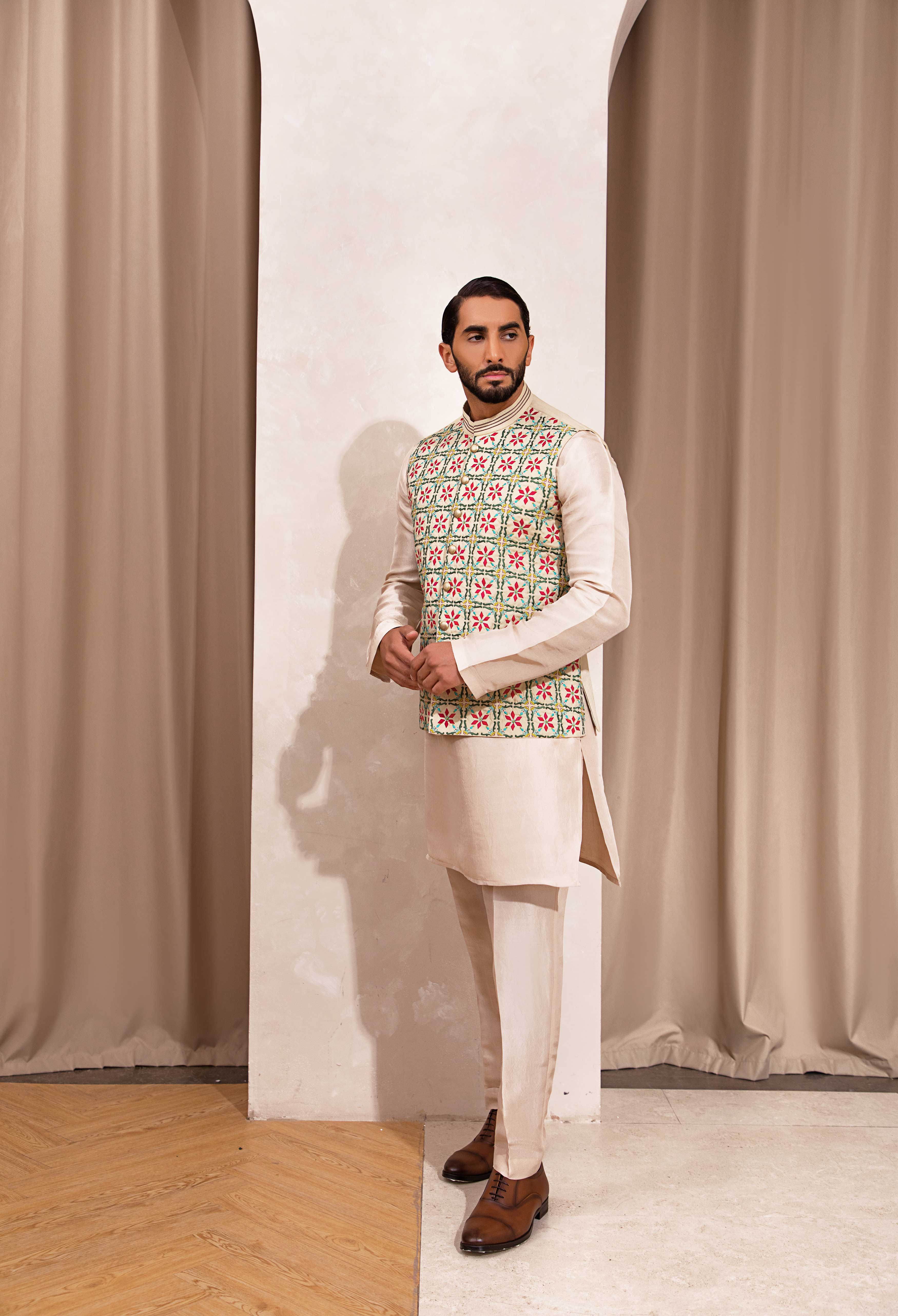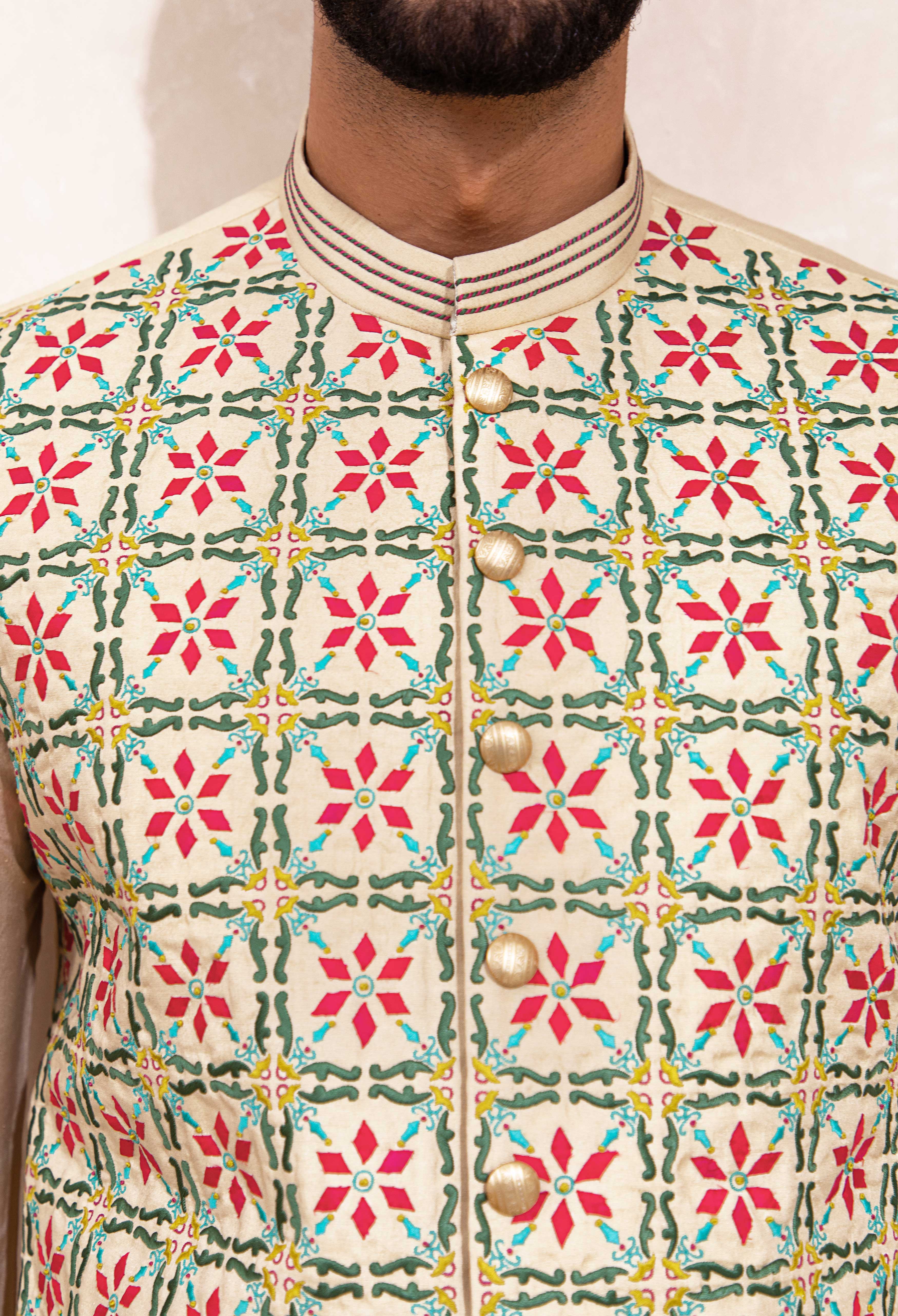 Description: Luxurious Shamdani Prince coat crafted with the finest raw silk, featuring exquisite Ari and Zardozi embroidery for a timeless, luxurious look.