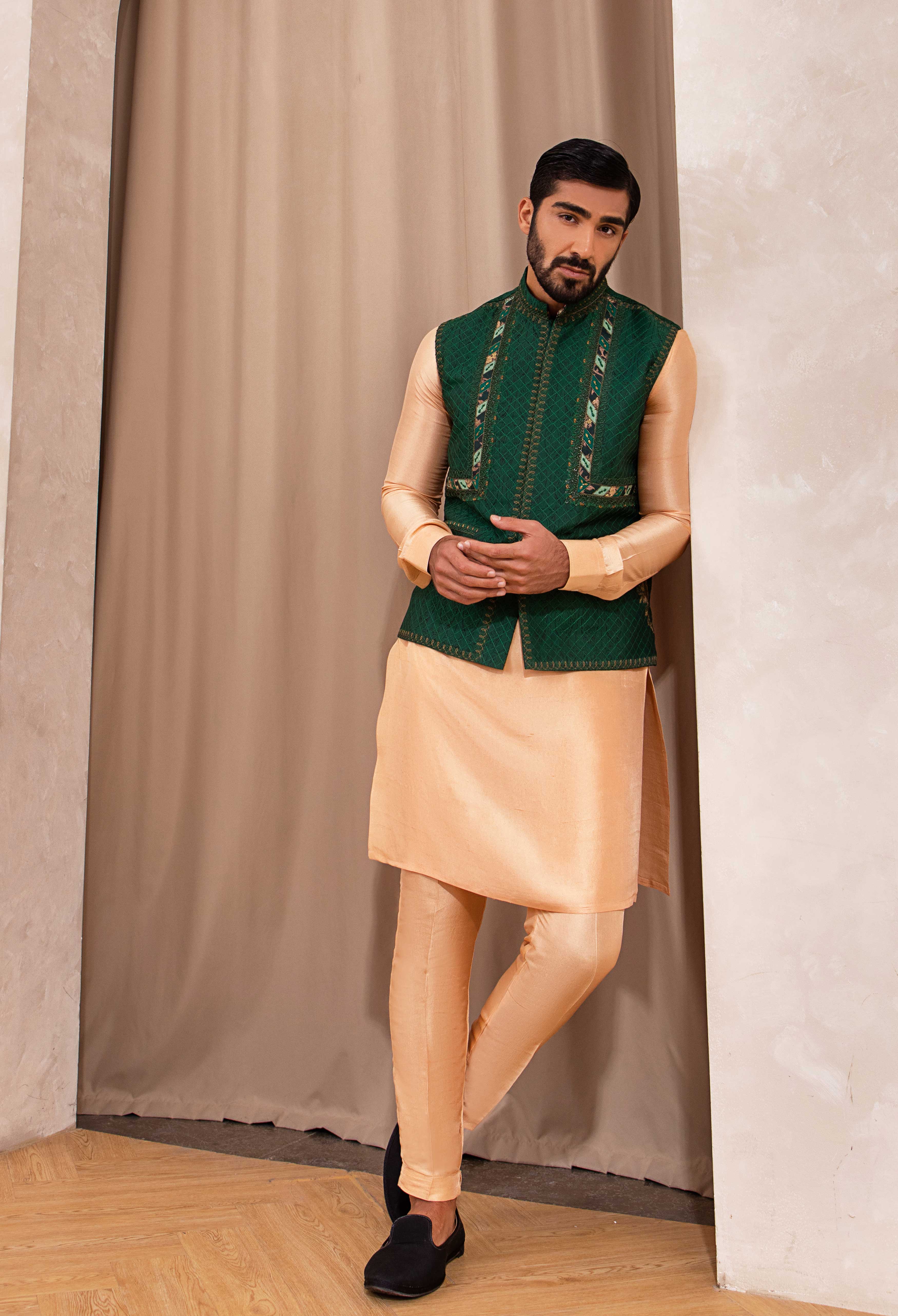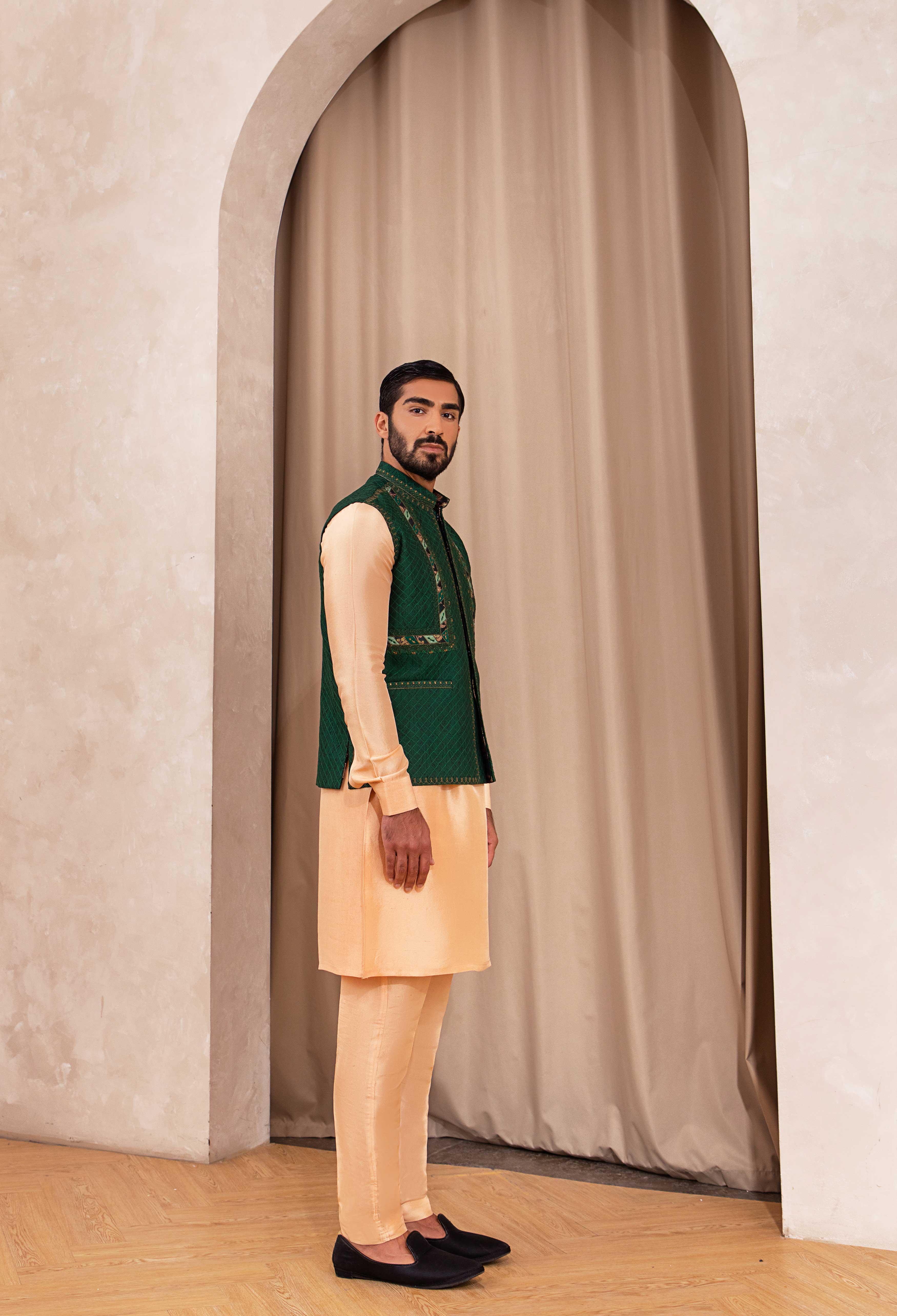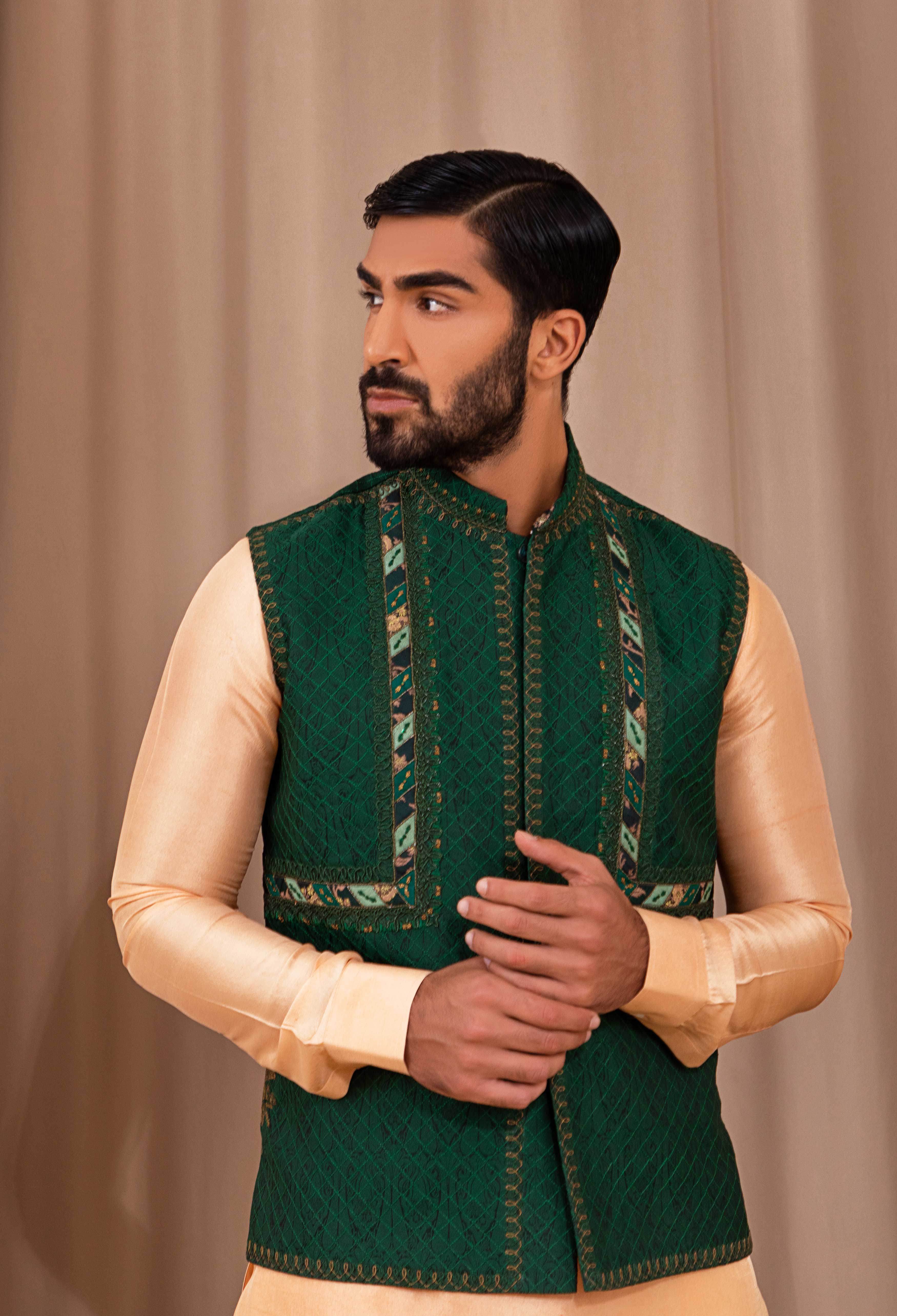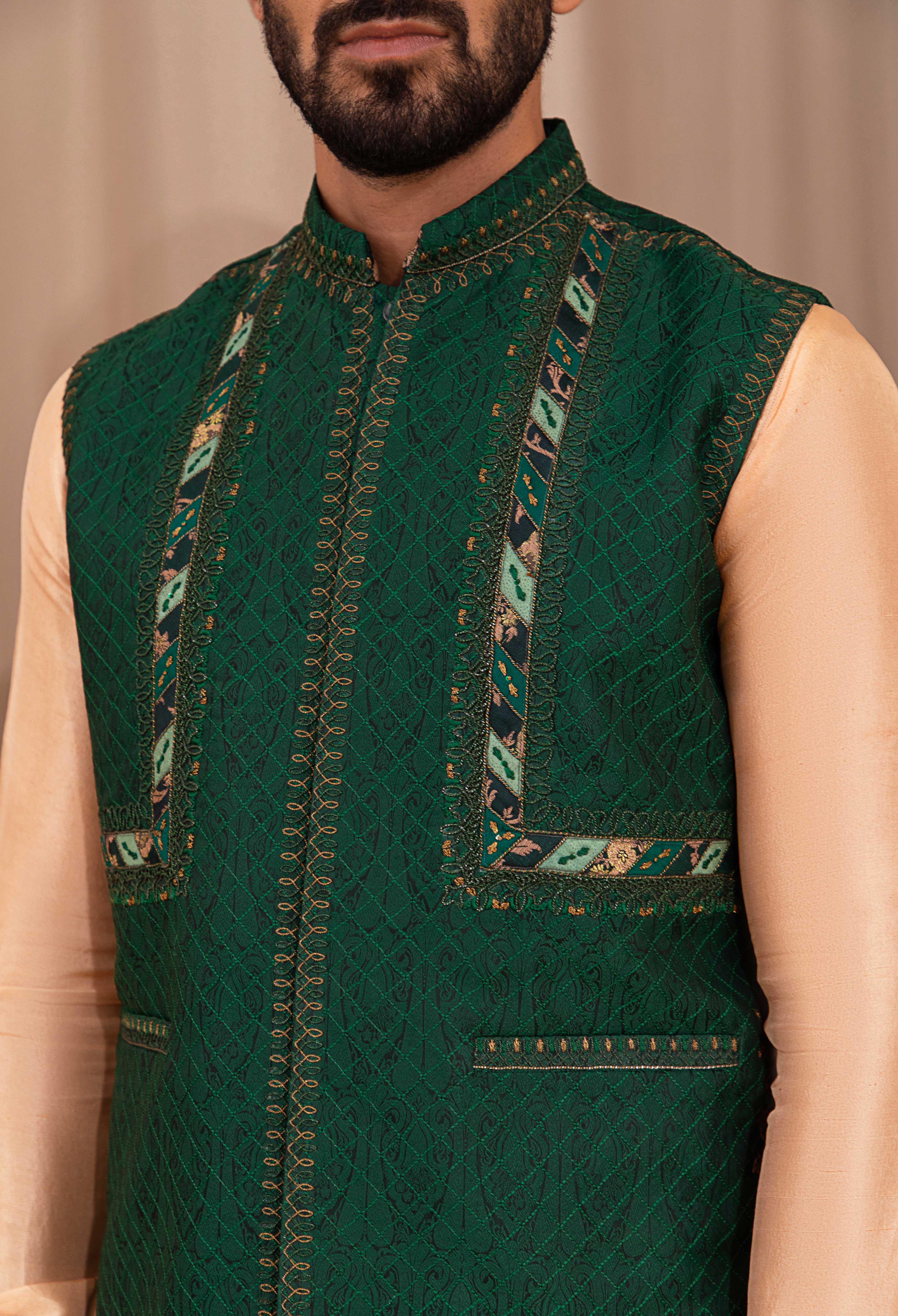 Description: Sophisticated Zamurd Prince coat Fabric combined with classic Jamawar Technique featuring intricate Dori, Zardozi, Sequence and Hand-Embroidered details.