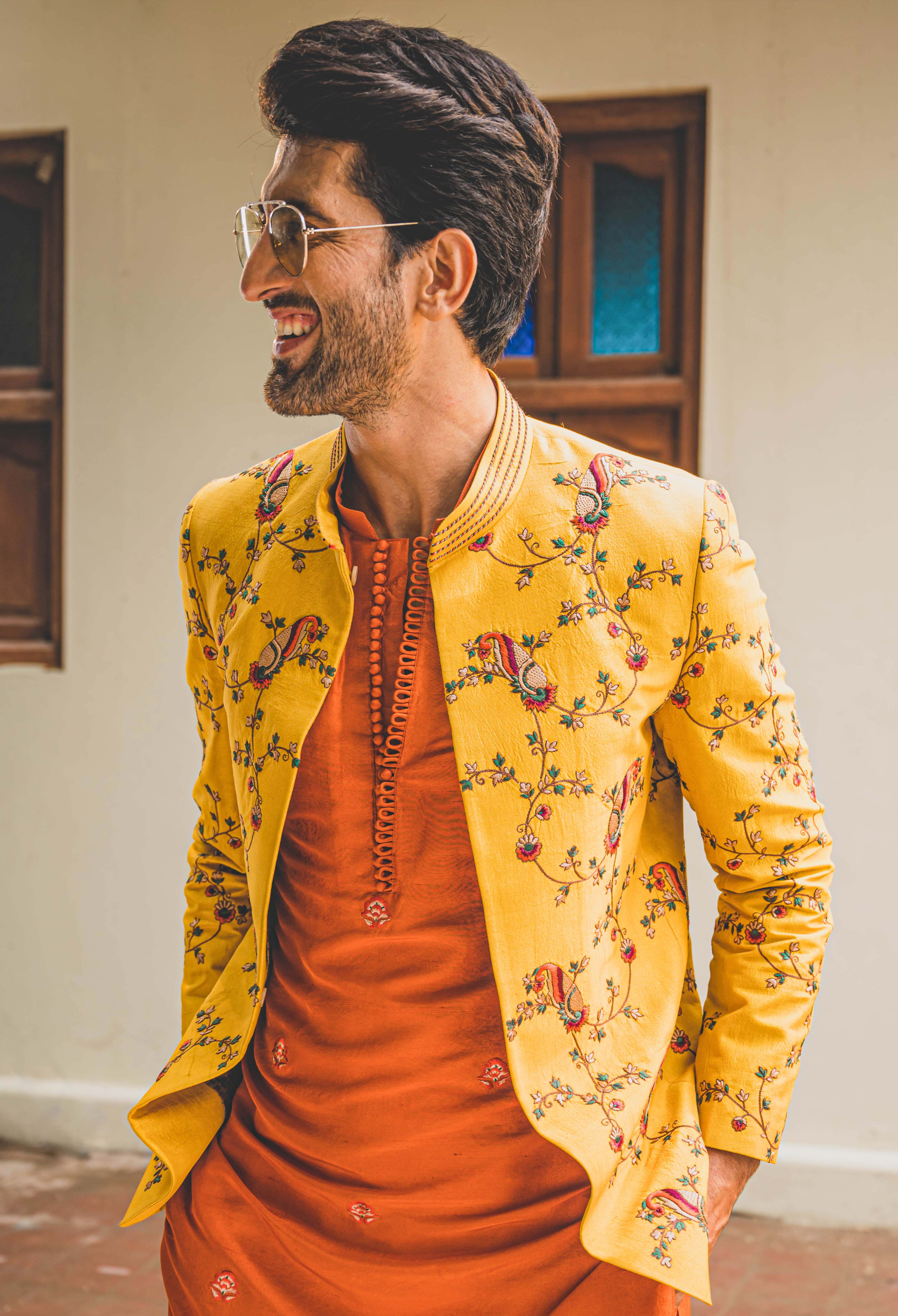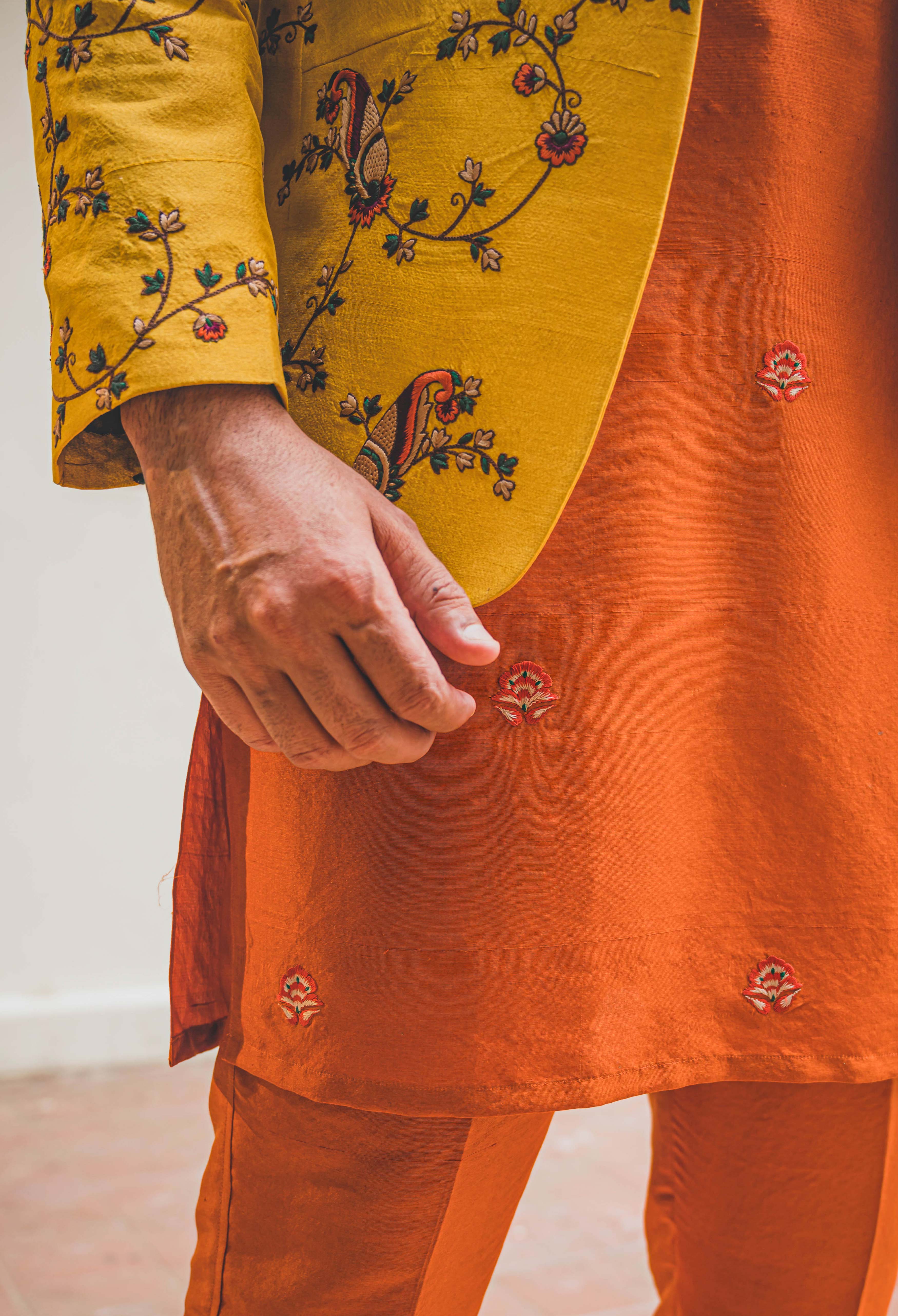 Description: Chrome Beauty's Prince Coat features Pure Row Silk construction with Ada Work Hand Embroidery, decorated with floral leafs and Paisley motifs.