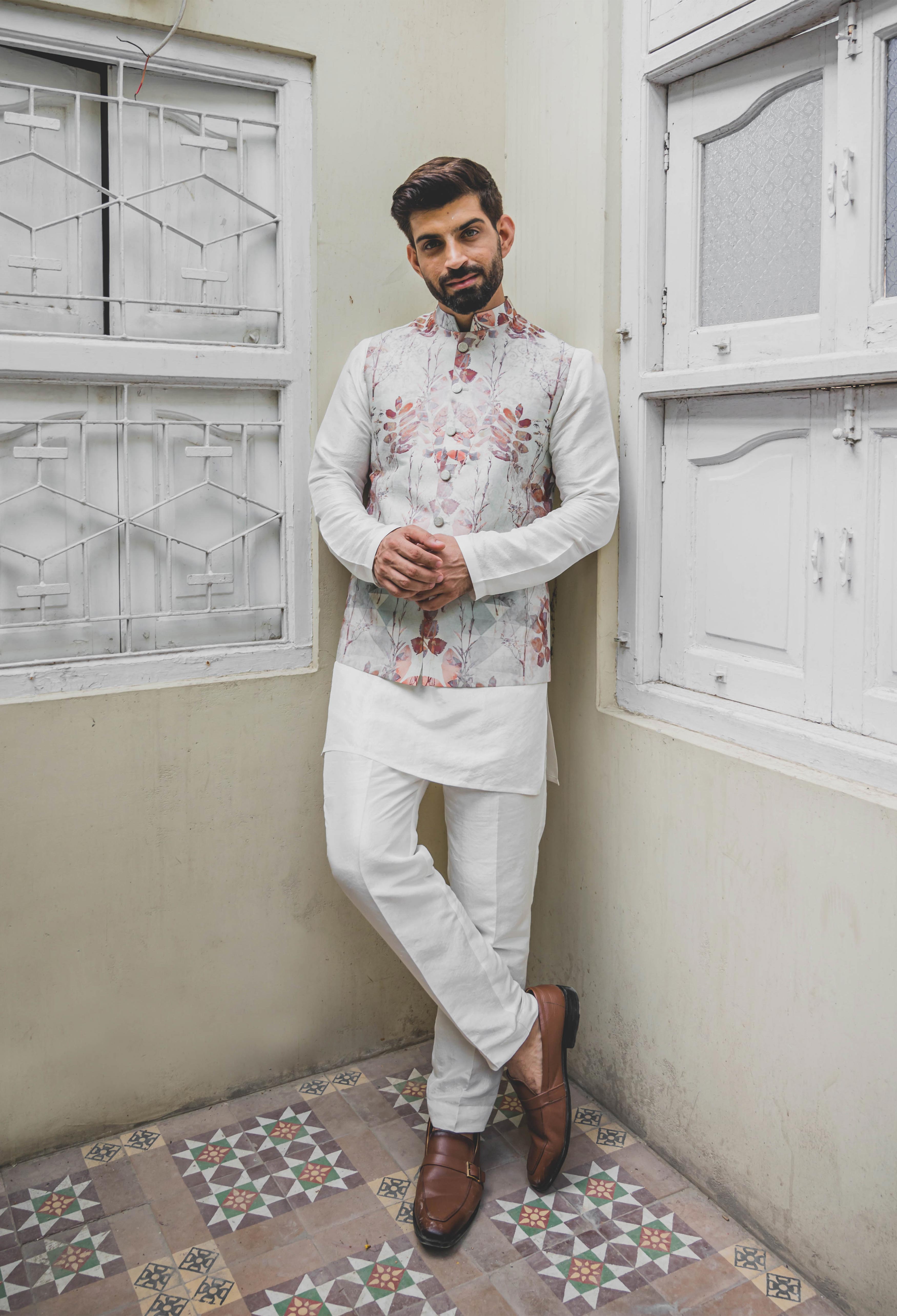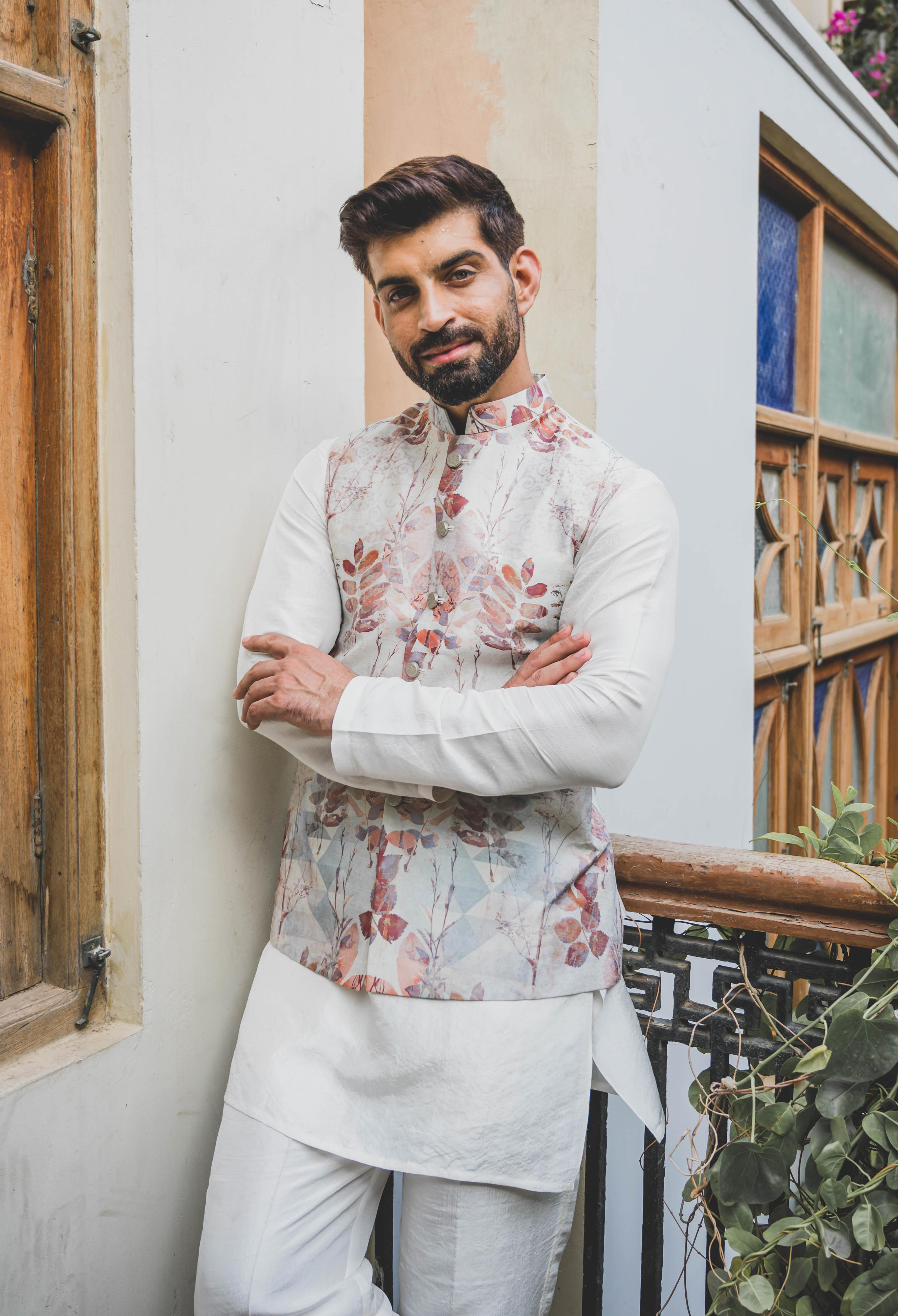 Description: This waistcoat features a digital-print Khaddi raw silk fabric, the perfect combination to capture the rustic beauty of Autumn and add a modern touch with its geometric pattern.