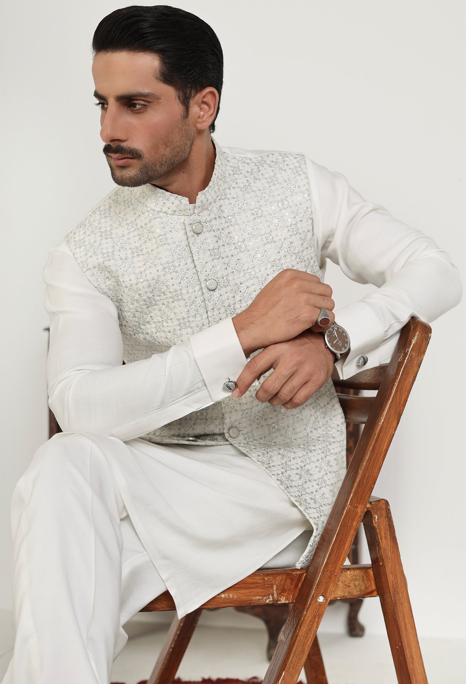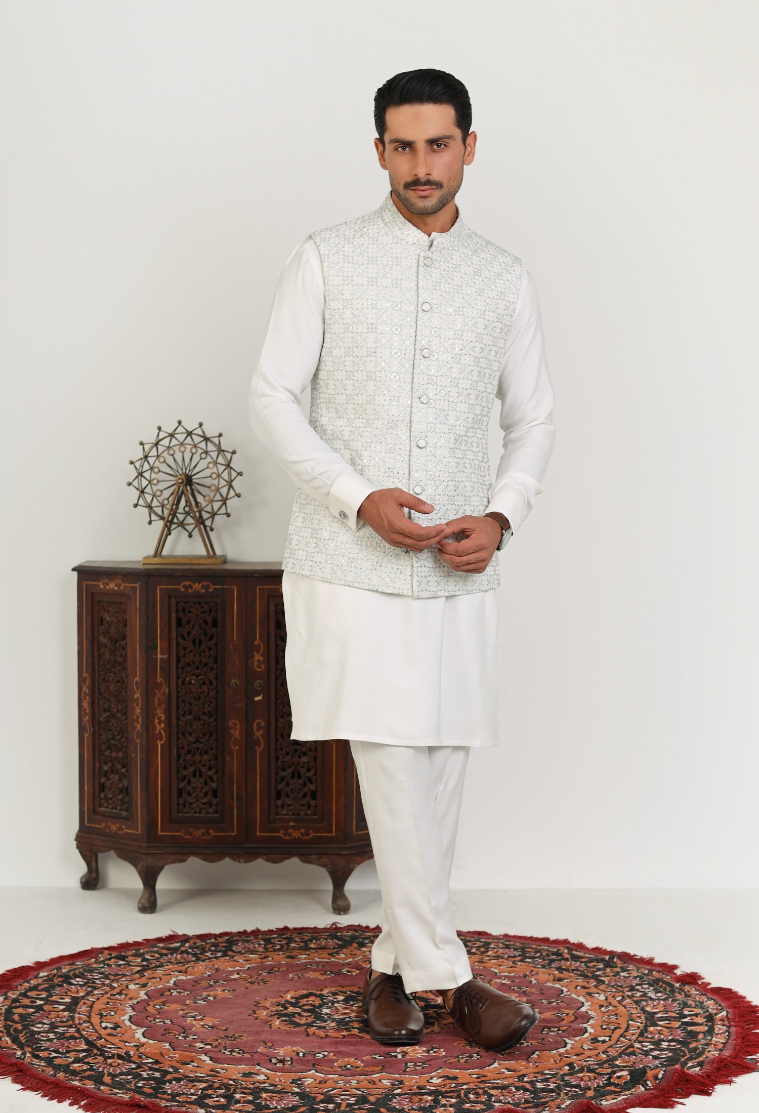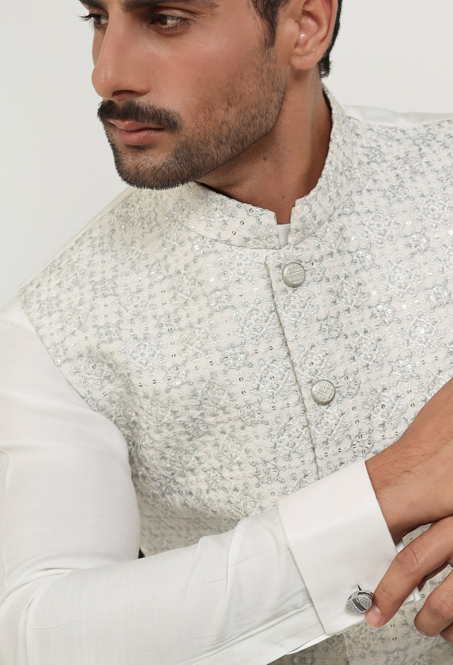 Our Soft Bloom waistcoats beautifully blend traditional elements with modern craftsmanship, featuring intricate hand embroidery, precise machine embroidery, and detailed thread work on refined Raw Silk fabric. Each waistcoat is meticulously crafted—hand embroidery adds a unique, artisanal touch, while machine embroidery offers detailed, consistent designs. The thread work adds texture and depth, enhancing the waistcoat's visual appeal. The smooth and lustrous satin fabric serves as the perfect backdrop, accentuating the embroidery and ensuring the waistcoat is both comfortable and sophisticated. These elements unite to create a versatile, elegant waistcoat that embodies both cultural heritage and contemporary style.