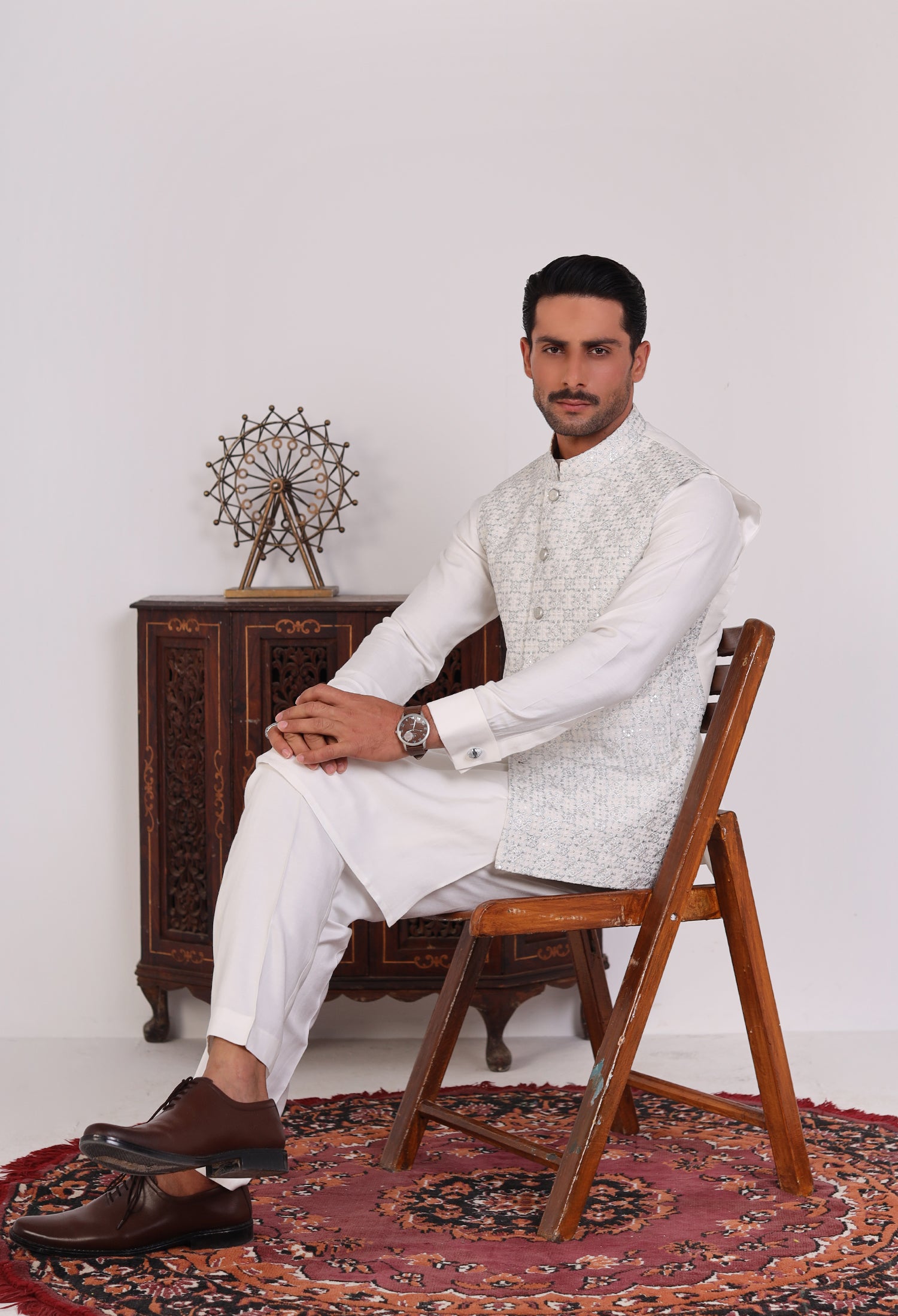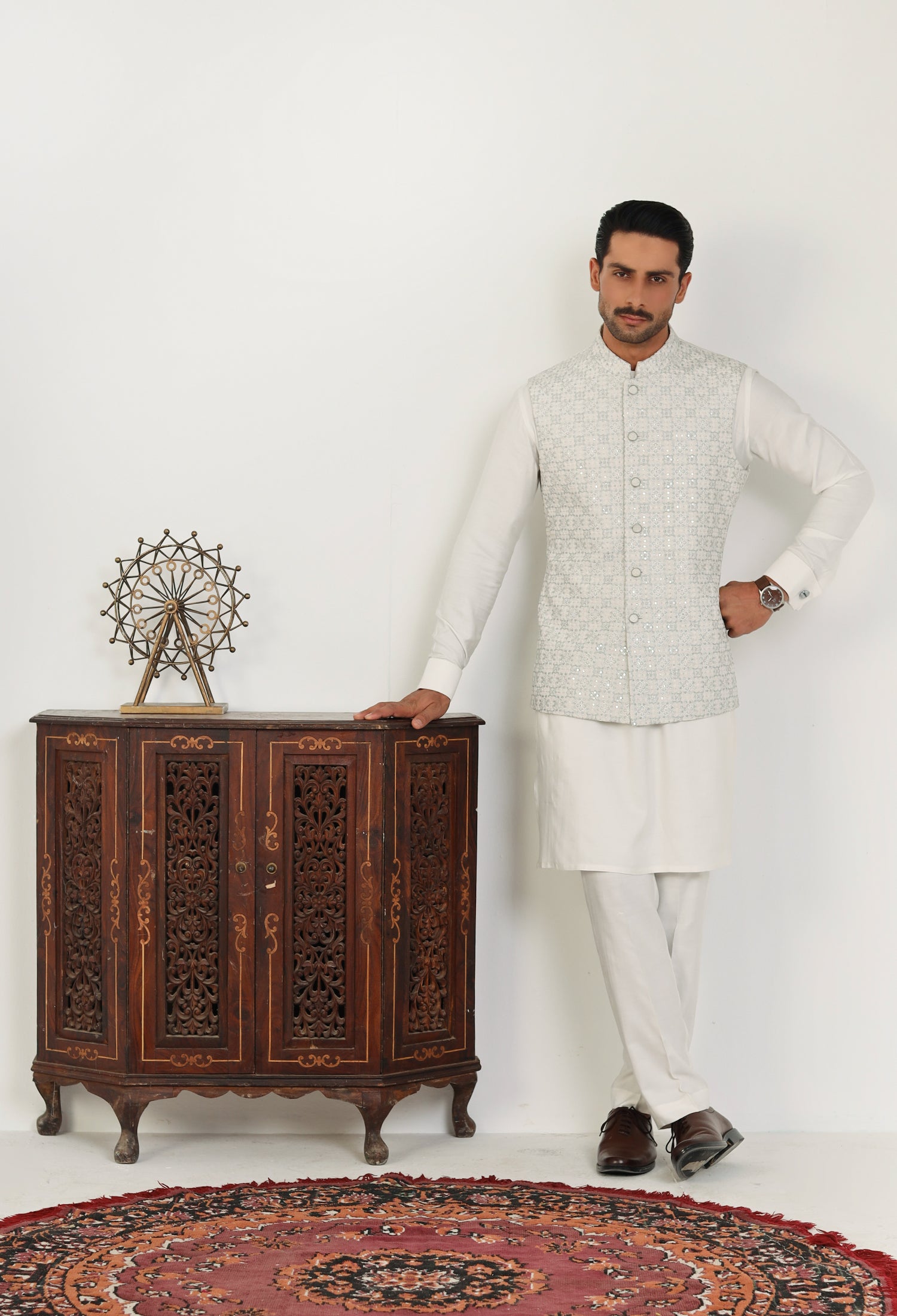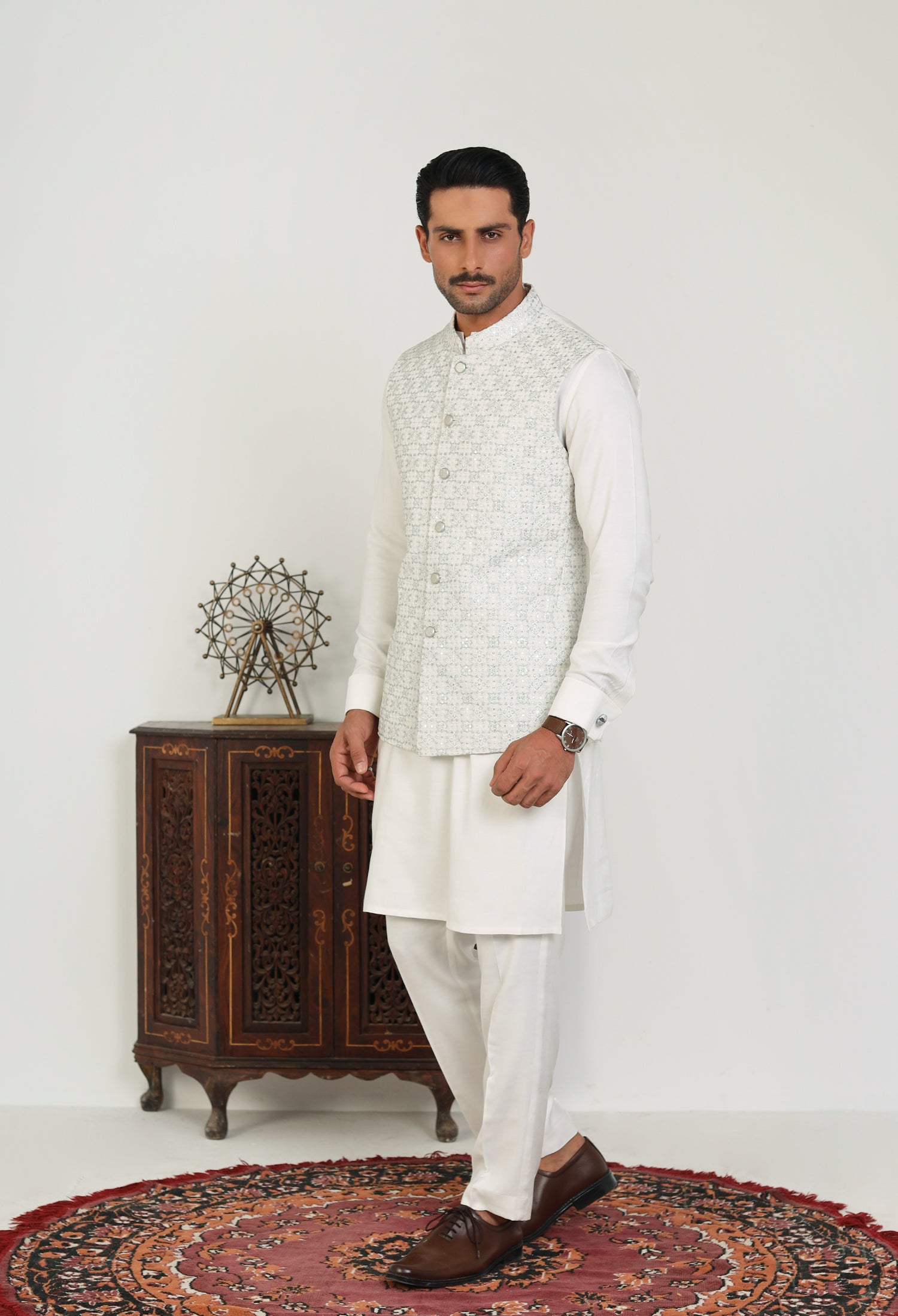 Our Soft Bloom waistcoats beautifully blend traditional elements with modern craftsmanship, featuring intricate hand embroidery, precise machine embroidery, and detailed thread work on refined Raw Silk fabric. Each waistcoat is meticulously crafted—hand embroidery adds a unique, artisanal touch, while machine embroidery offers detailed, consistent designs. The thread work adds texture and depth, enhancing the waistcoat's visual appeal. The smooth and lustrous satin fabric serves as the perfect backdrop, accentuating the embroidery and ensuring the waistcoat is both comfortable and sophisticated. These elements unite to create a versatile, elegant waistcoat that embodies both cultural heritage and contemporary style.