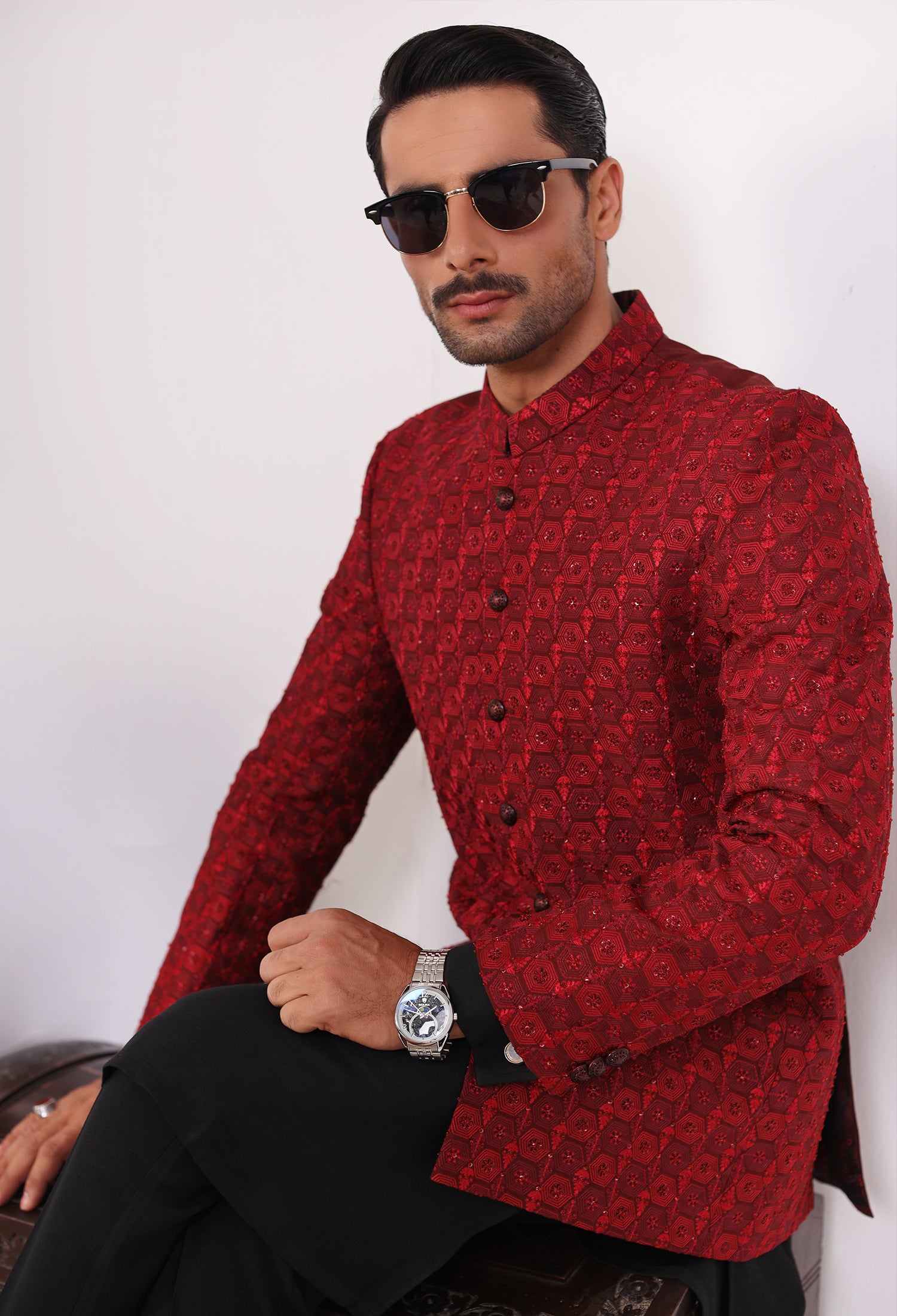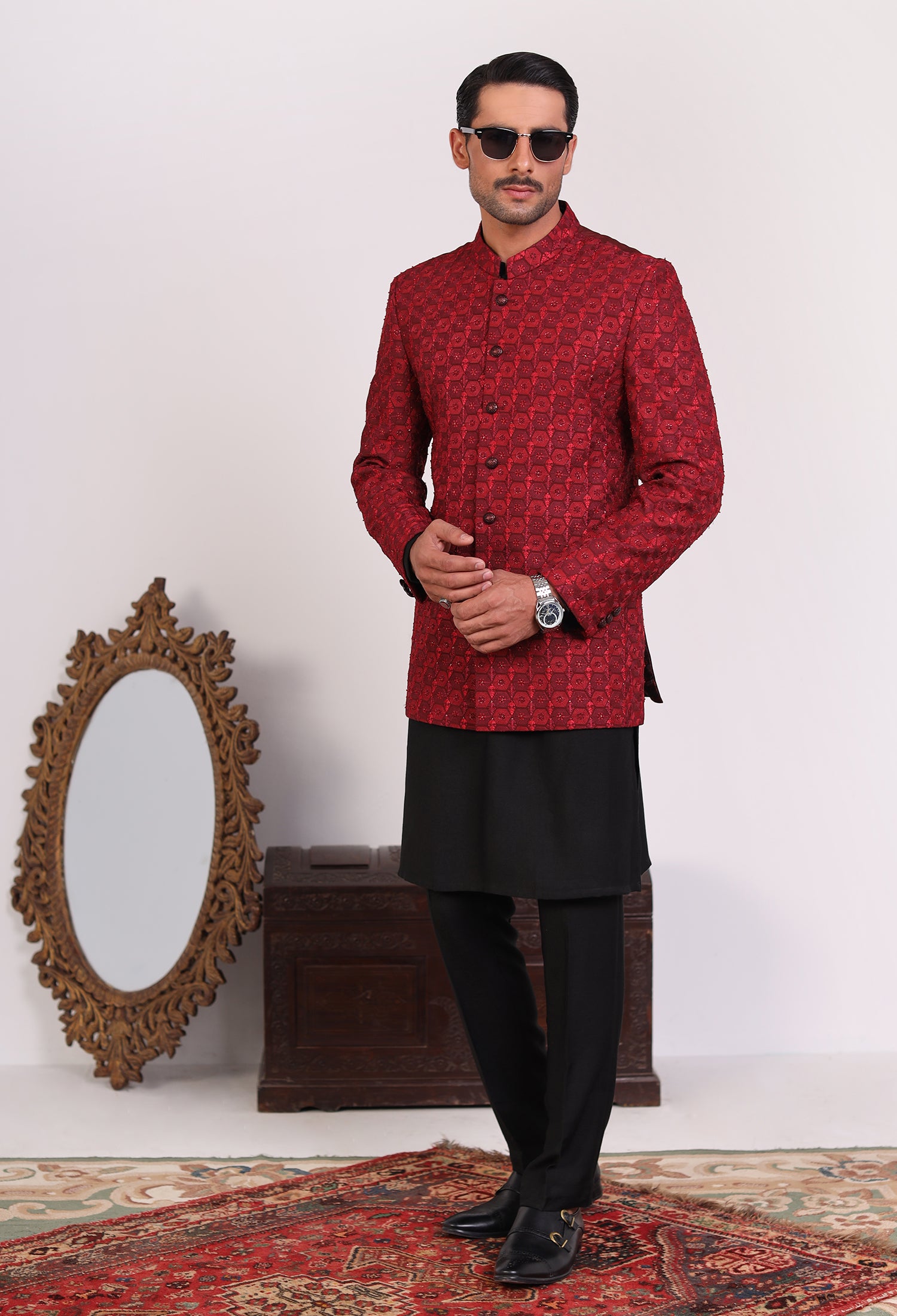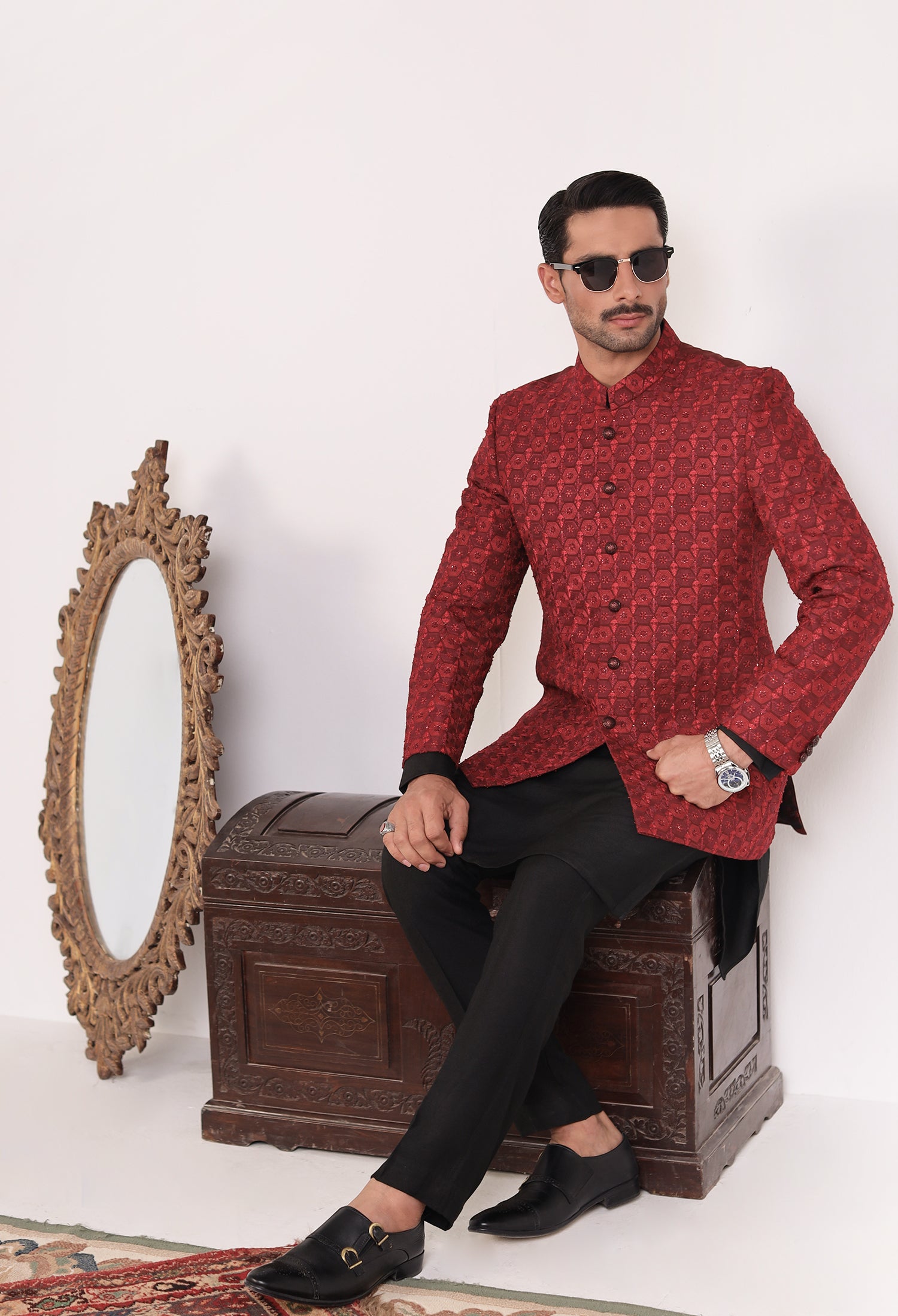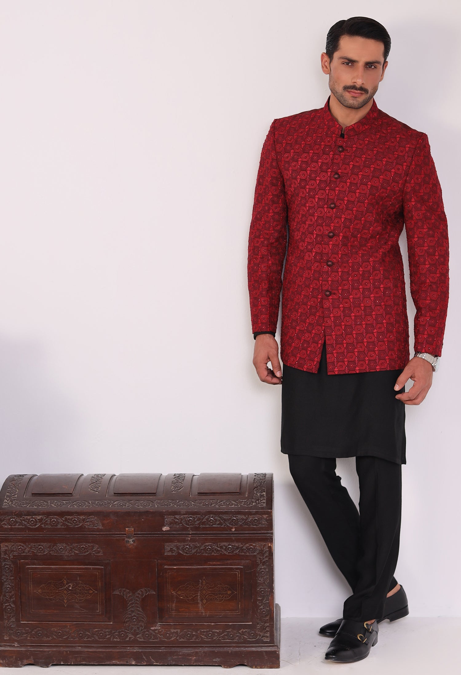 Our Ruby Prism prince coats seamlessly blend traditional elegance with modern craftsmanship, featuring exquisite hand embroidery, precise machine embroidery, and detailed thread work on luxurious Raw Silk fabric. Each prince coat is meticulously crafted—hand embroidery adds a unique, artisanal charm, while machine embroidery ensures intricate and uniform patterns. The thread work adds depth and richness, elevating the overall design of the coat. The satin fabric, with its smooth, lustrous texture, serves as the perfect foundation, enhancing the embroidery and providing both comfort and sophistication. These elements combine to create a prince coat that embodies cultural heritage while offering a refined, contemporary style.