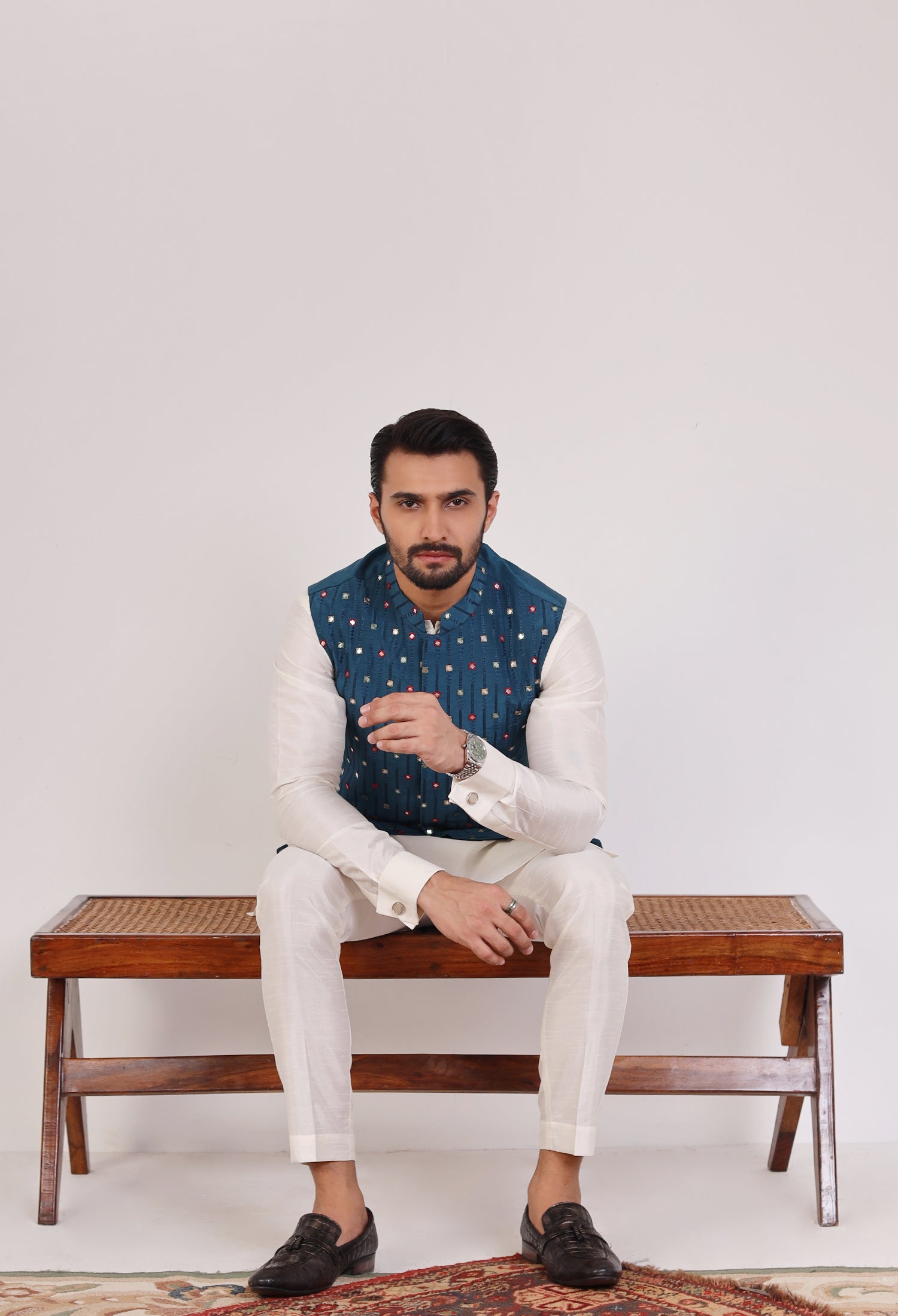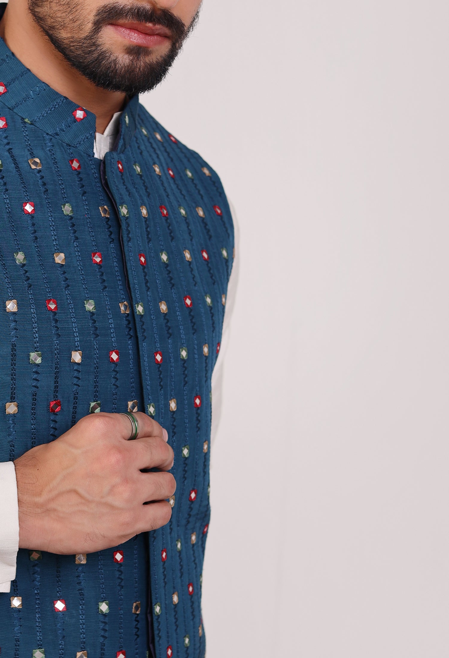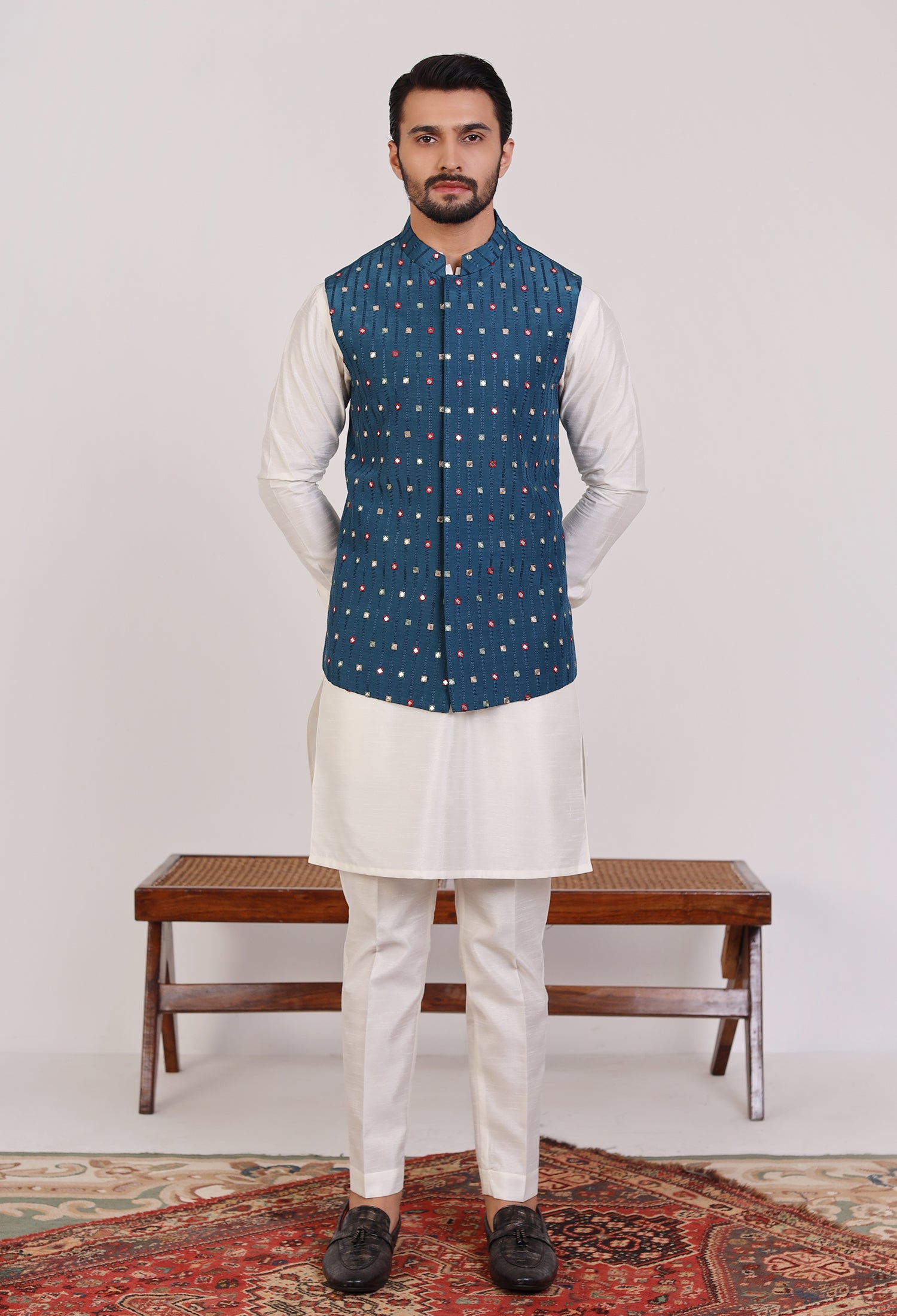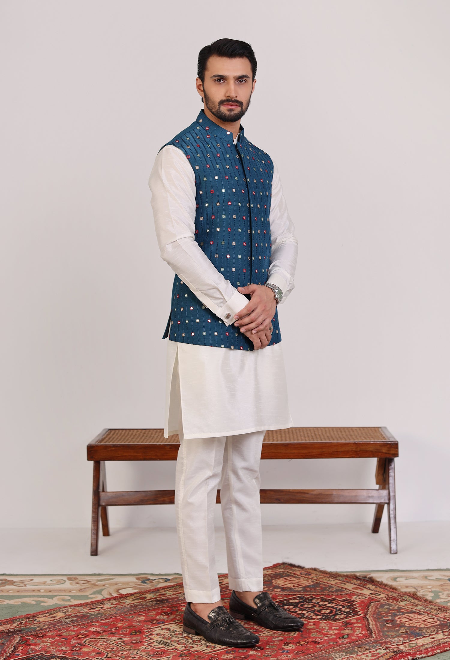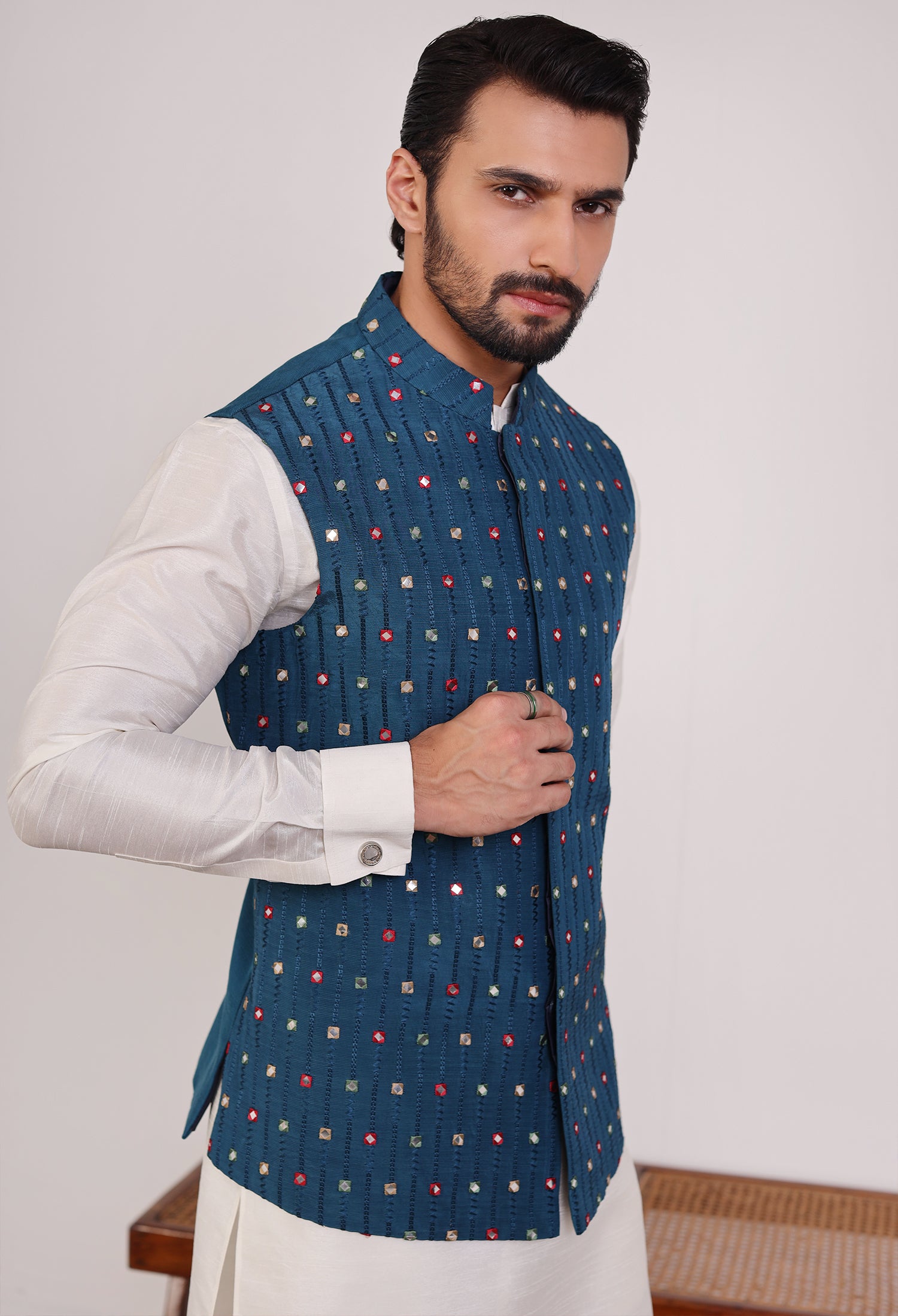 Our Mirrored Sapphire waistcoats beautifully blend traditional elements with modern craftsmanship, featuring intricate hand embroidery, precise machine embroidery, and detailed thread work on refined Raw Silk fabric. Each waistcoat is meticulously crafted—hand embroidery adds a unique, artisanal touch, while machine embroidery offers detailed, consistent designs. The thread work adds texture and depth, enhancing the waistcoat's visual appeal. The smooth and lustrous satin fabric serves as the perfect backdrop, accentuating the embroidery and ensuring the waistcoat is both comfortable and sophisticated. These elements unite to create a versatile, elegant waistcoat that embodies both cultural heritage and contemporary style.