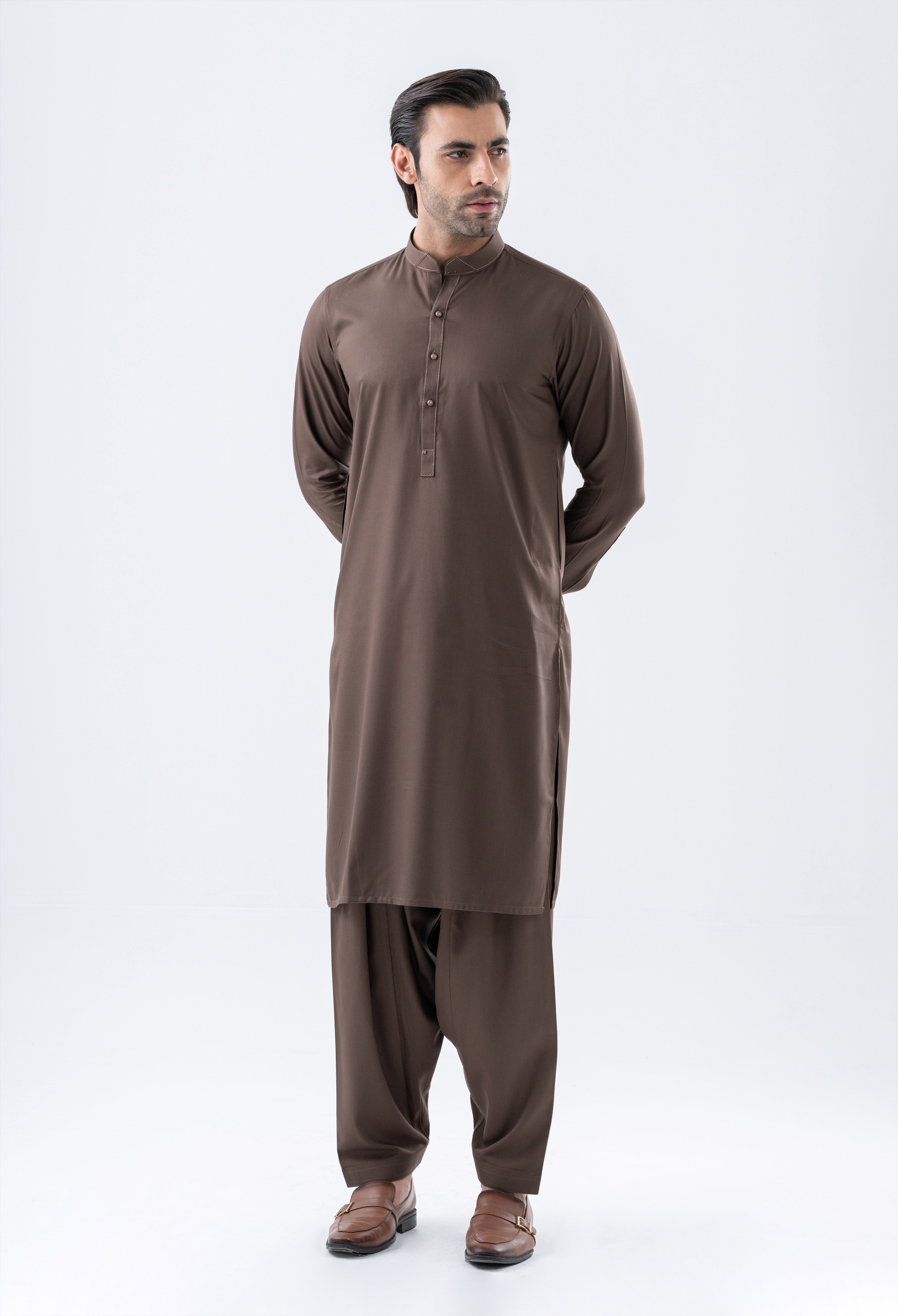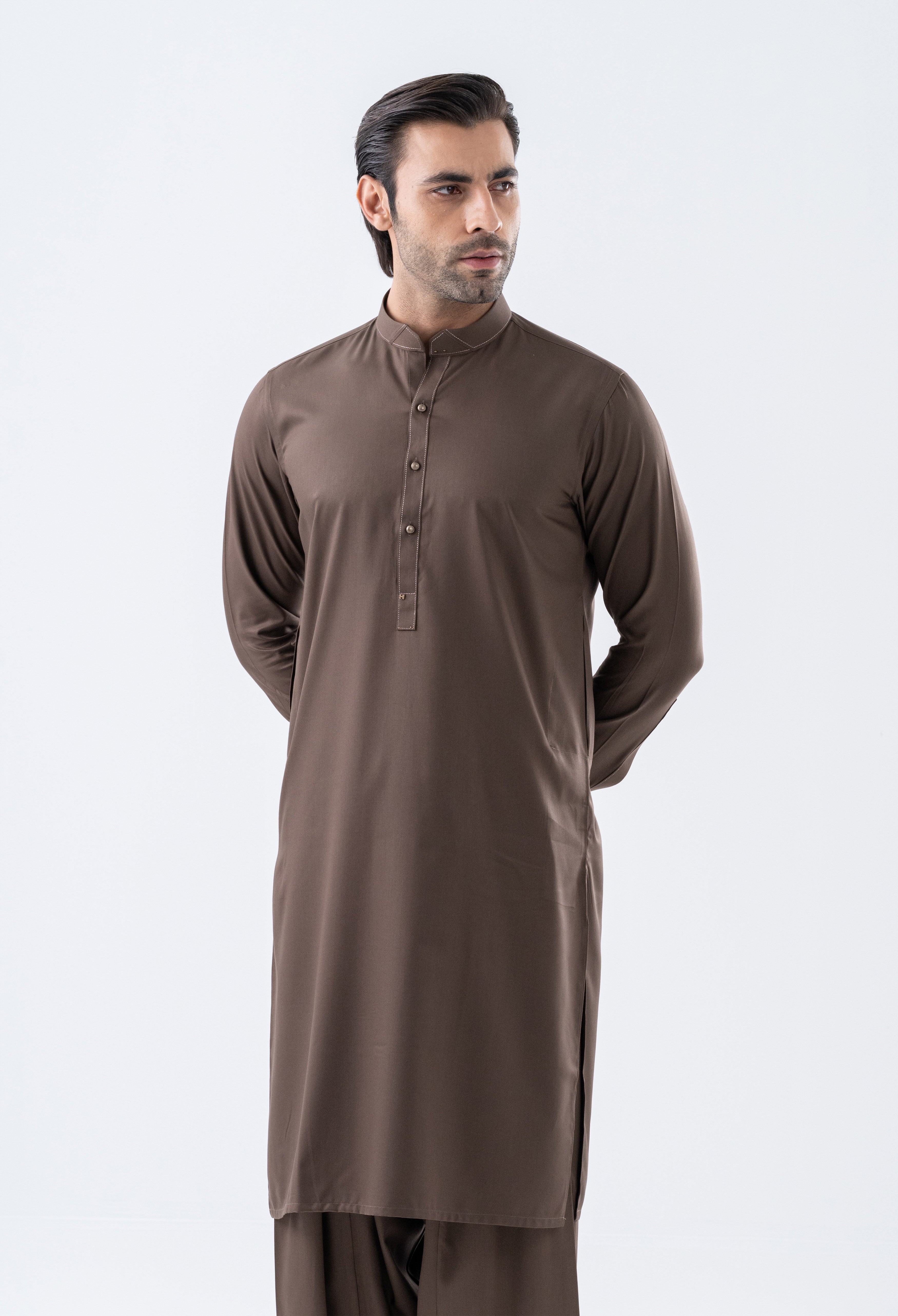 Introducing the ASKARI Shalwar Suit where contemporary style meets traditional elegance. This casual ensemble features a sophisticated band collar, cuffed sleeves, and a straight hem, all enhanced by a matching fabric panel on the collar adorned with commando stitching. The slim fit design ensures a flattering silhouette, while the metal fancy button style adds a touch of modern flair. Thoughtfully crafted with metal accessories on the collar, cuffs, placket, and yoke, the ASKARI is perfect for those who appreciate refined details.