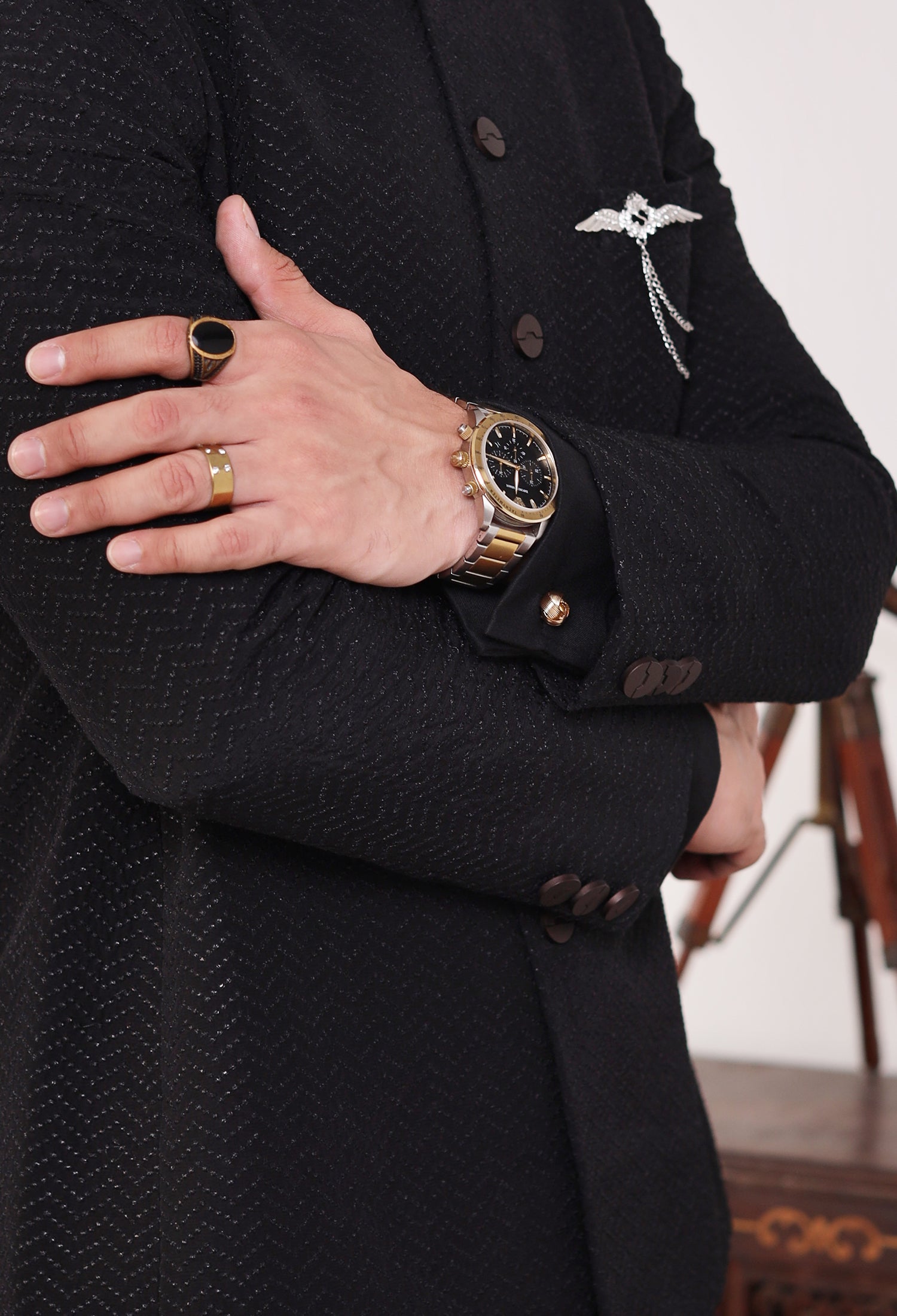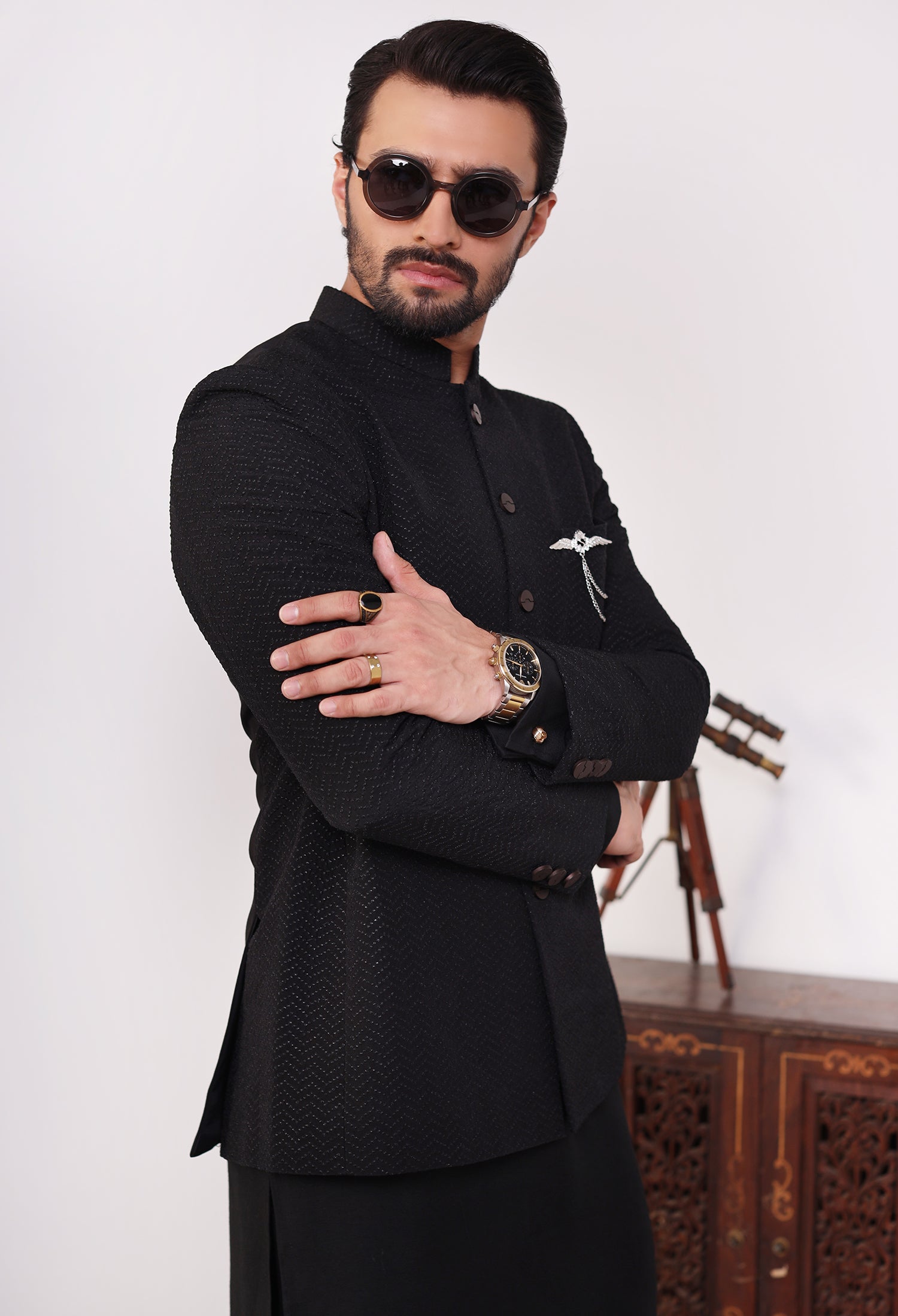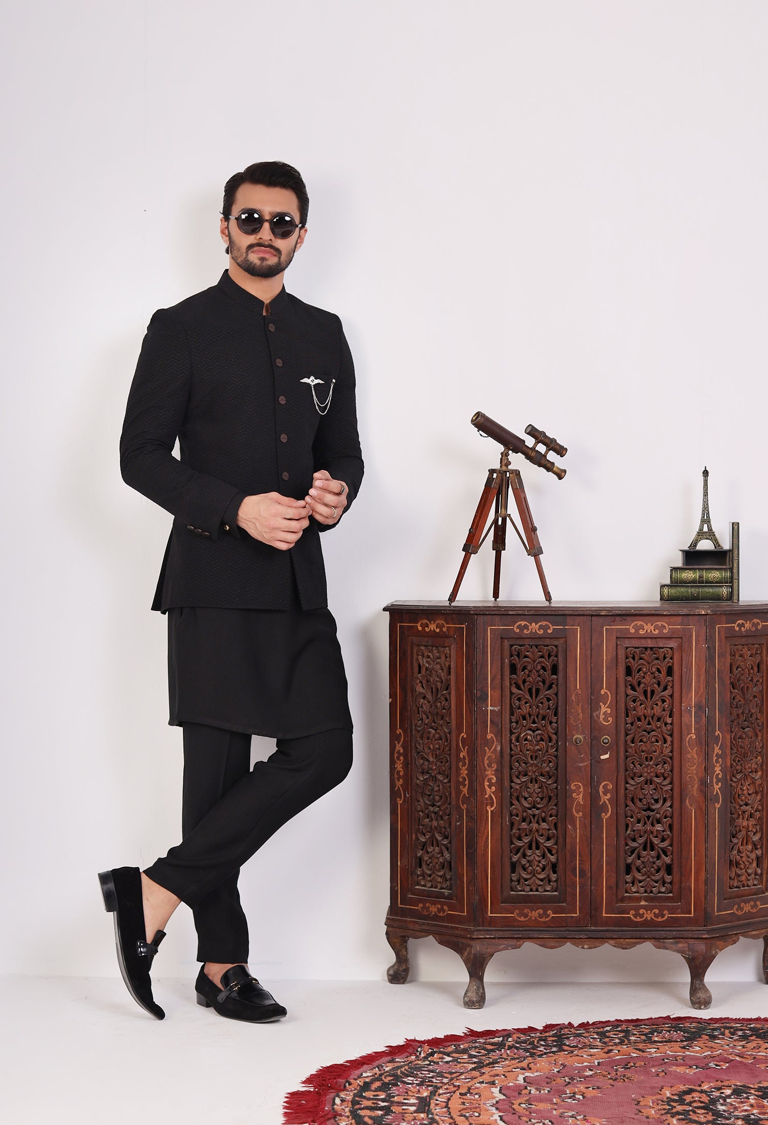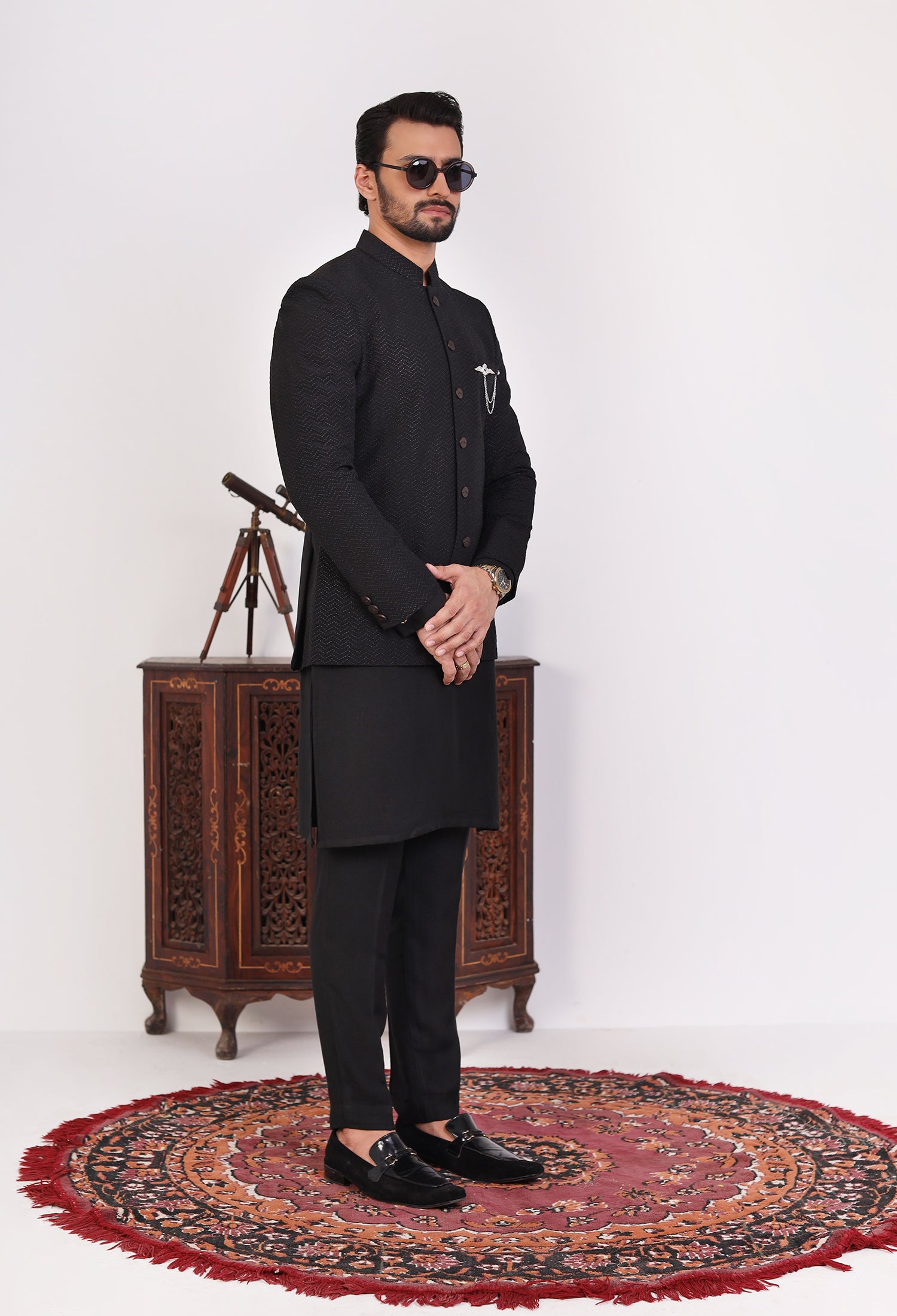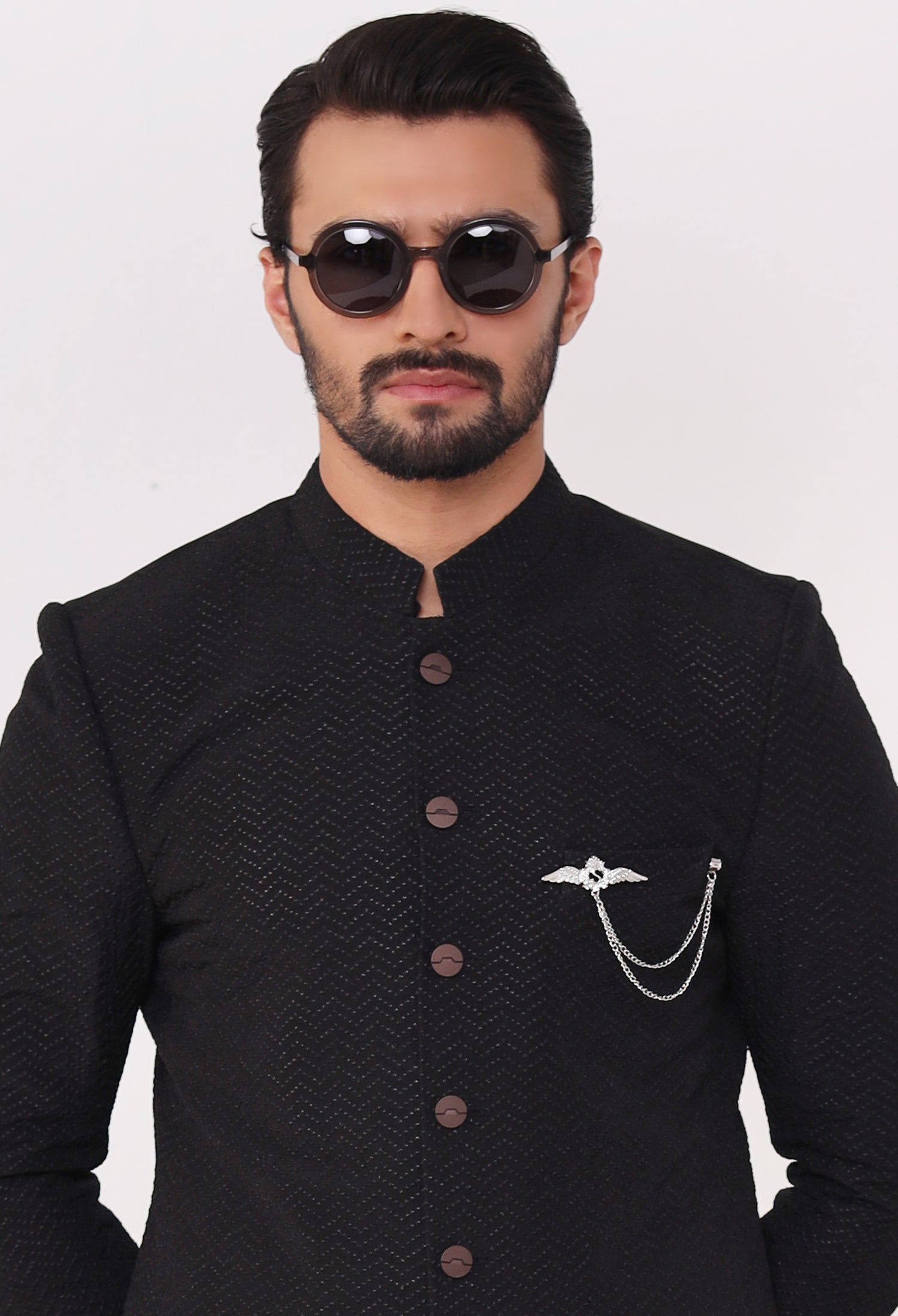 Our Ebon Zigzag prince coats seamlessly blend traditional elegance with modern craftsmanship, featuring exquisite hand embroidery, precise machine embroidery, and detailed thread work on luxurious Raw Silk fabric. Each prince coat is meticulously crafted—hand embroidery adds a unique, artisanal charm, while machine embroidery ensures intricate and uniform patterns. The thread work adds depth and richness, elevating the overall design of the coat. The satin fabric, with its smooth, lustrous texture, serves as the perfect foundation, enhancing the embroidery and providing both comfort and sophistication. These elements combine to create a prince coat that embodies cultural heritage while offering a refined, contemporary style.