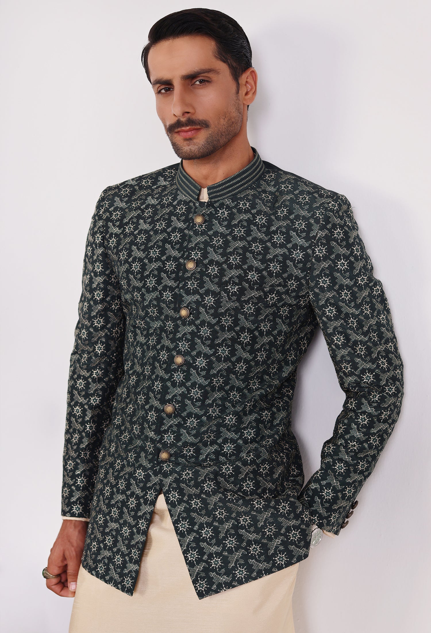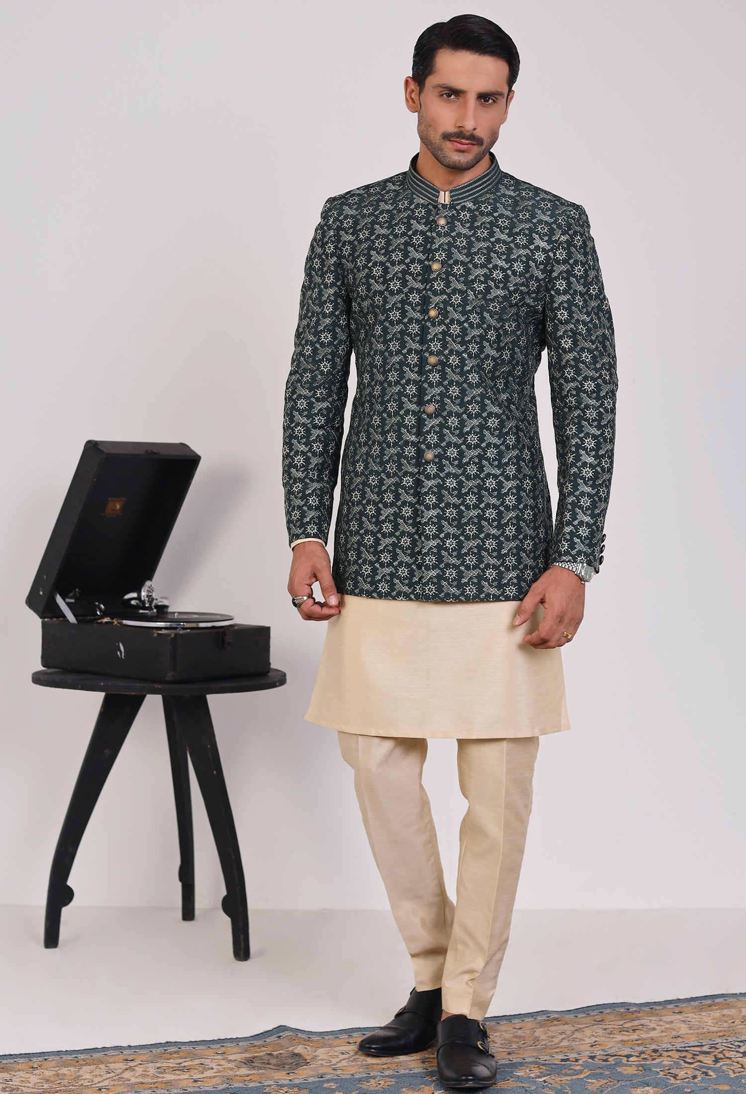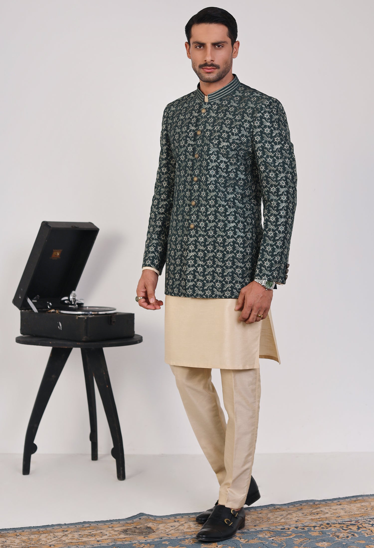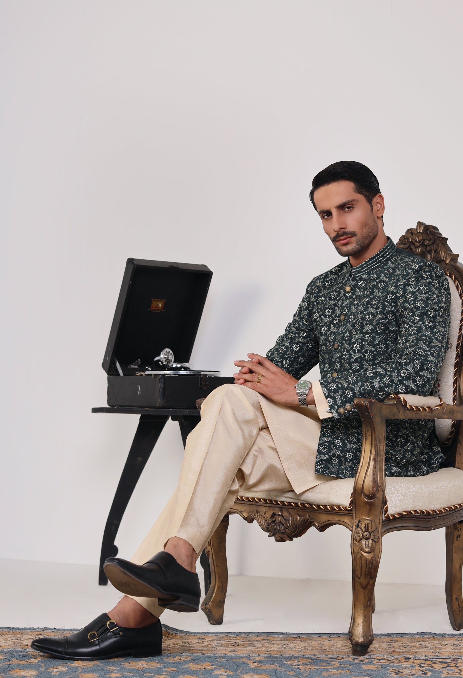 Our prince coats seamlessly blend traditional elegance with modern craftsmanship, featuring exquisite hand embroidery, precise machine embroidery, and detailed thread work on luxurious satin fabric. Each prince coat is meticulously crafted—hand embroidery adds a unique, artisanal charm, while machine embroidery ensures intricate and uniform patterns. The thread work adds depth and richness, elevating the overall design of the coat. The satin fabric, with its smooth, lustrous texture, serves as the perfect foundation, enhancing the embroidery and providing both comfort and sophistication. These elements combine to create a prince coat that embodies cultural heritage while offering a refined, contemporary style.