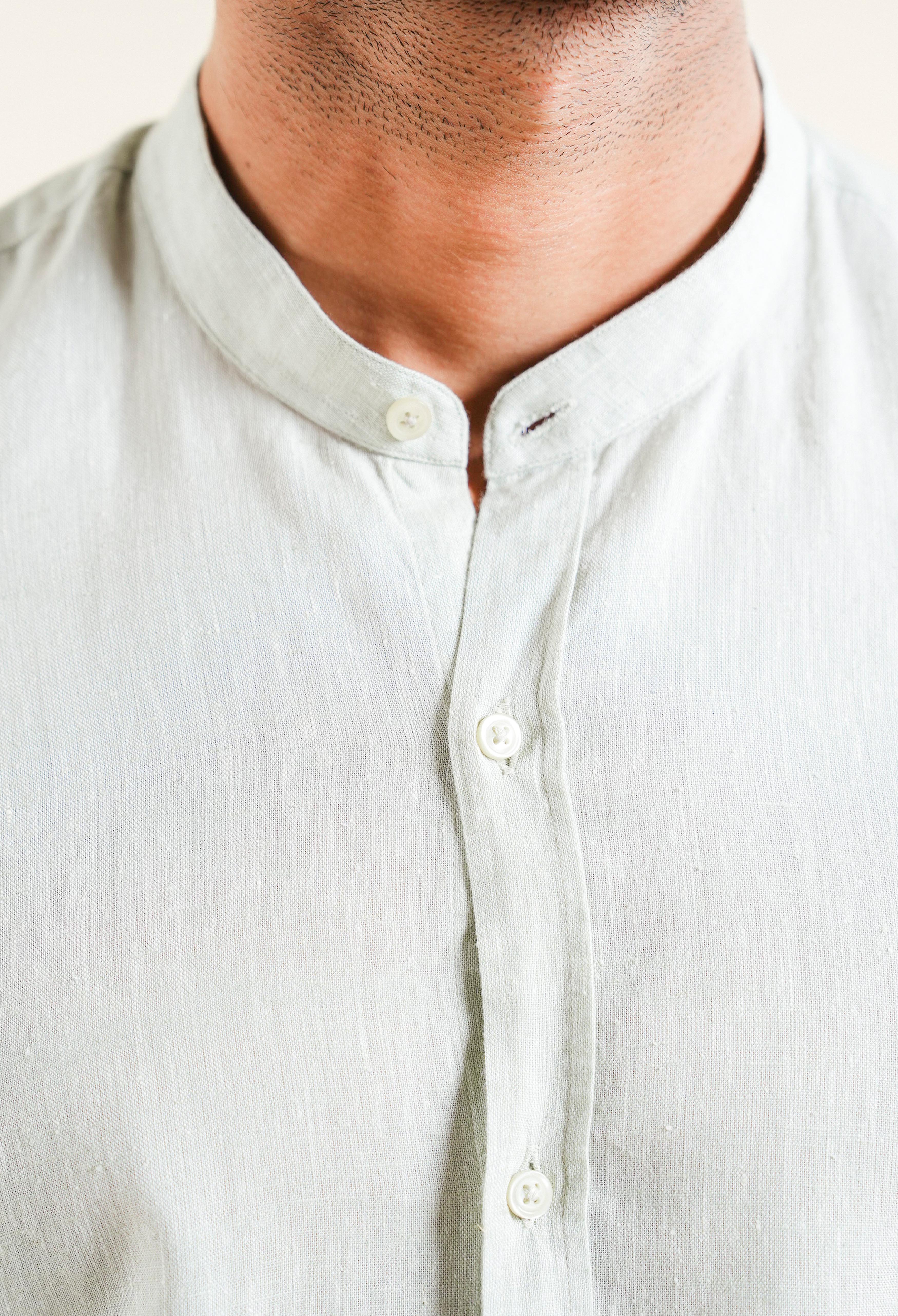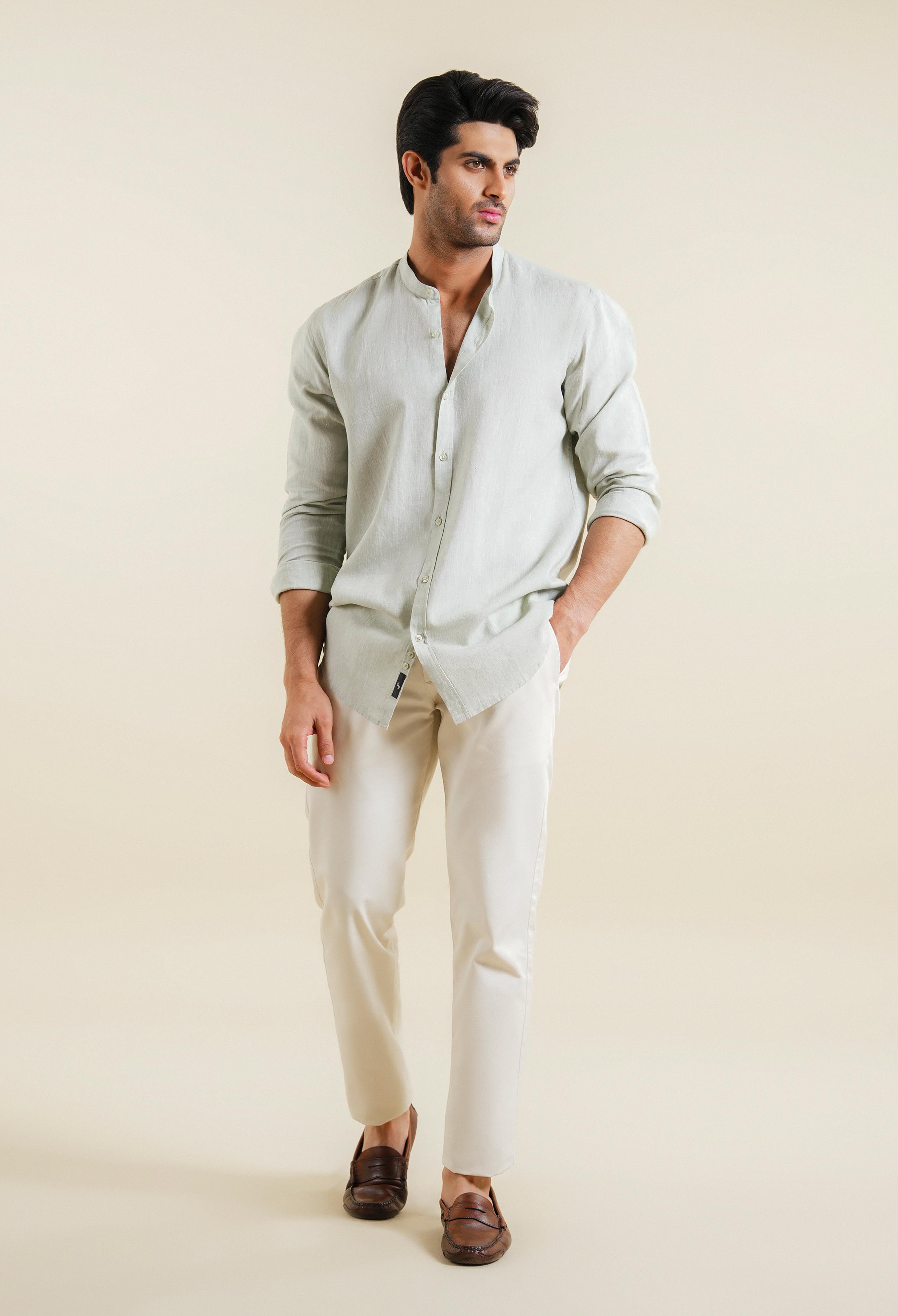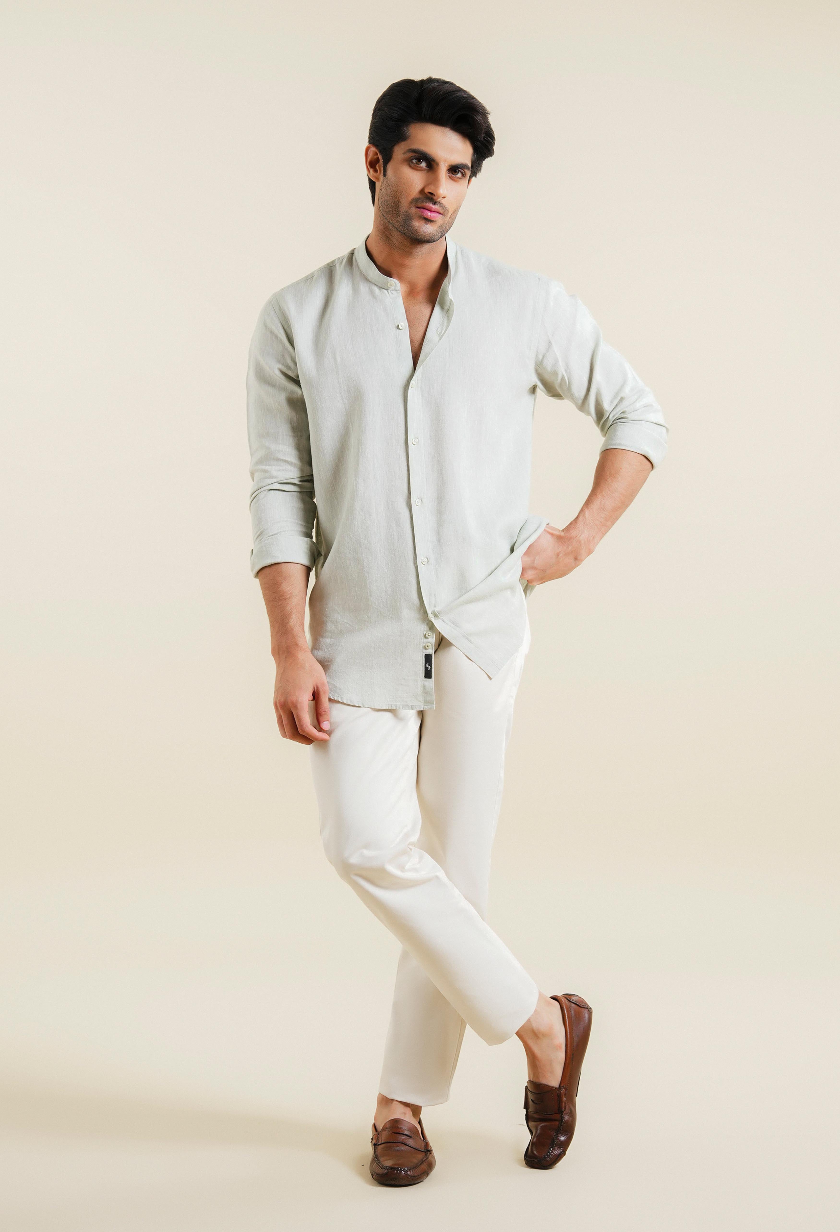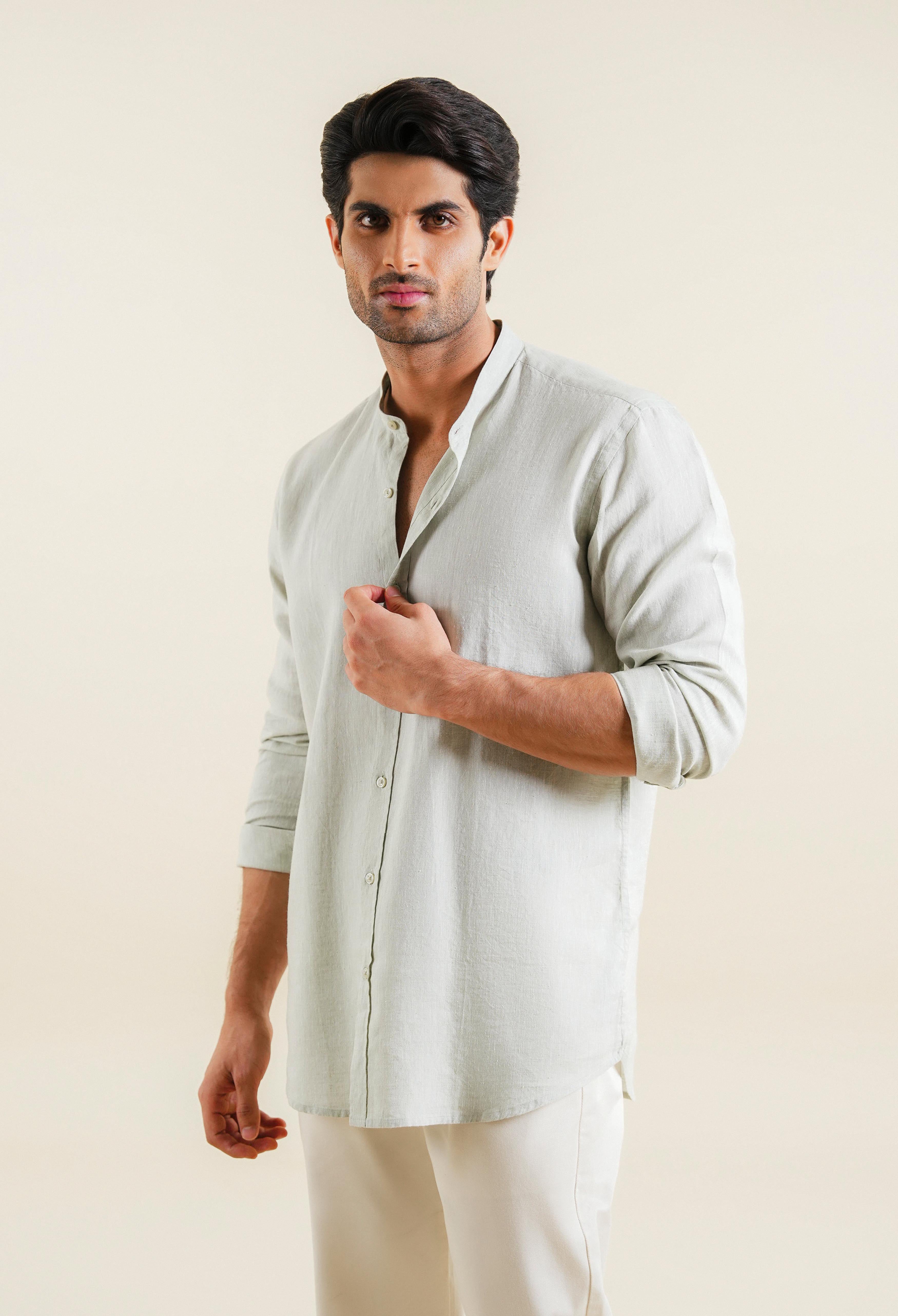 The men’s linen shirt is meticulously designed with a band collar and straight cuffs, tailored in a slim-fit silhouette. Lightweight and breathable, it features a subtle checkered or striped pattern that accentuates its modern and refined aesthetic. Crafted from soft, natural-textured linen, the shirt is offered in neutral tones such as squirrel grey seamlessly blending sophistication with relaxed comfort.