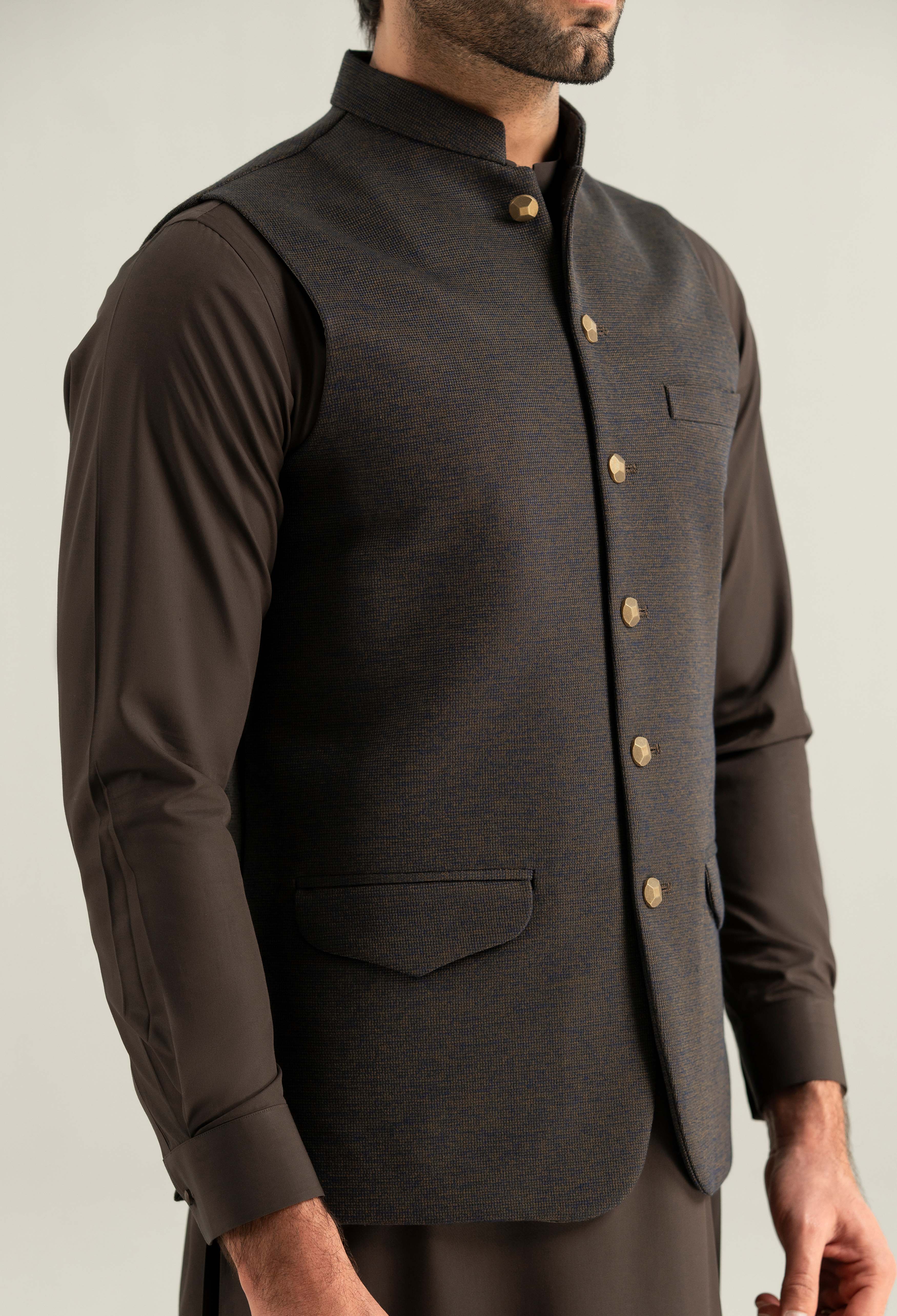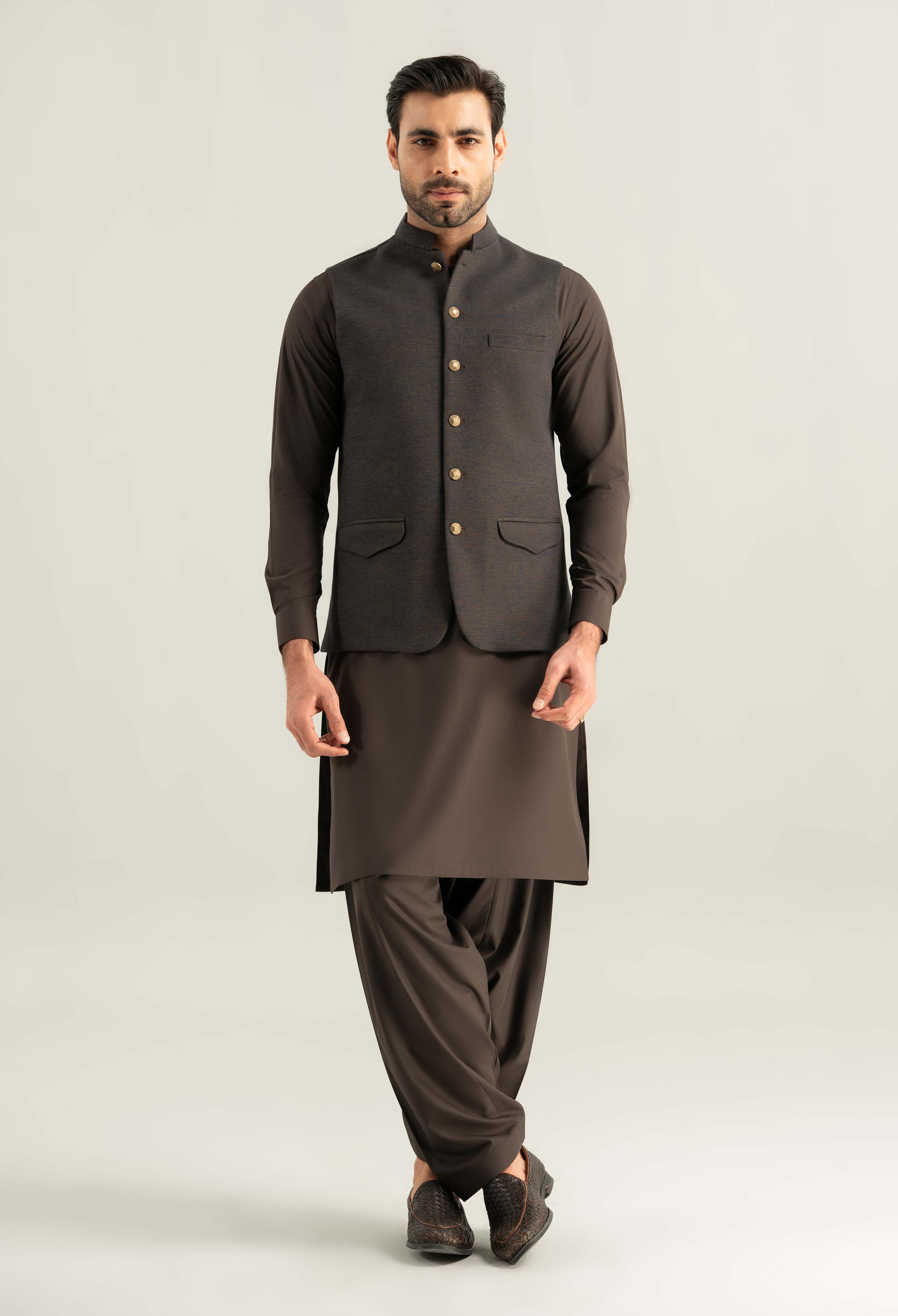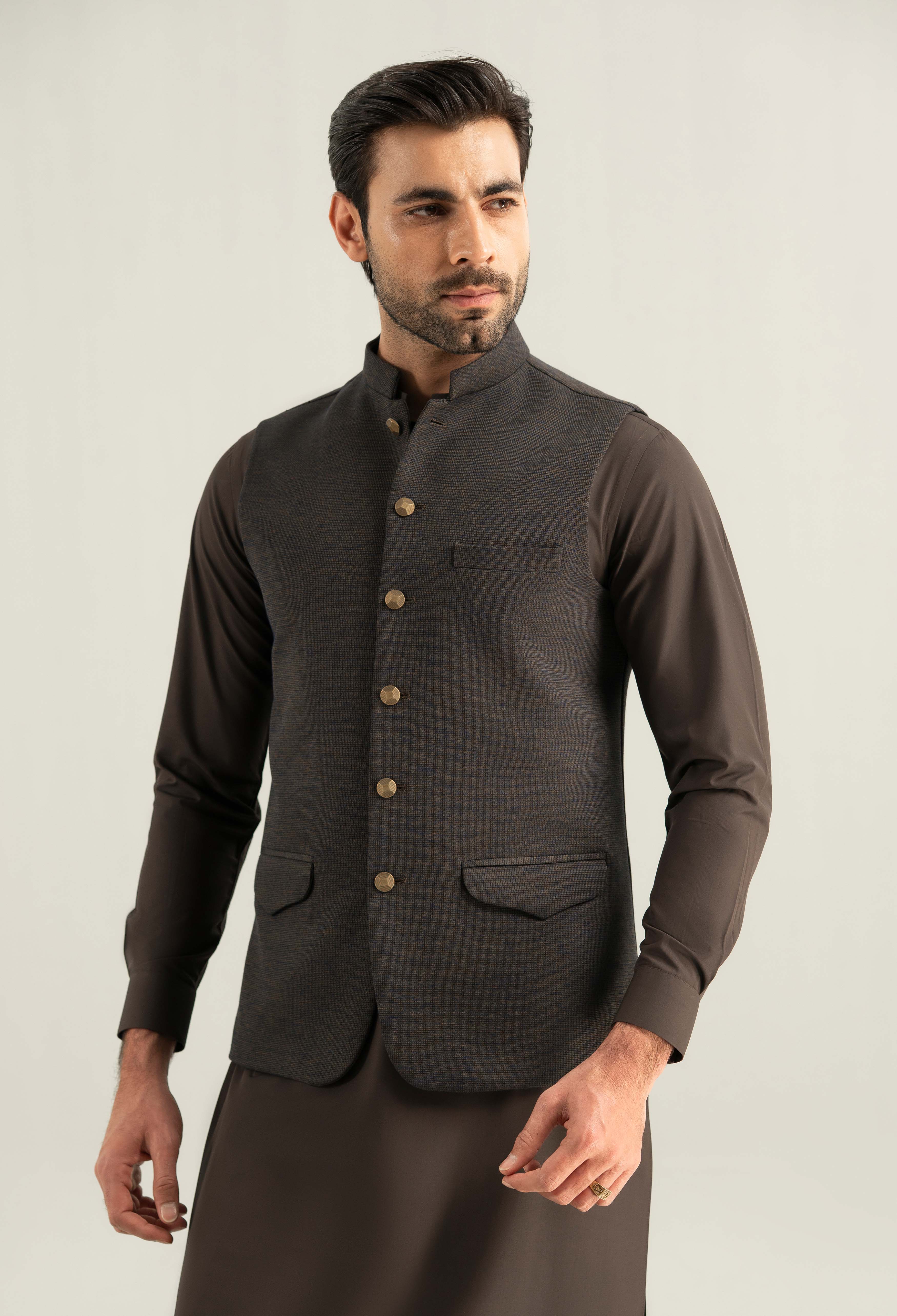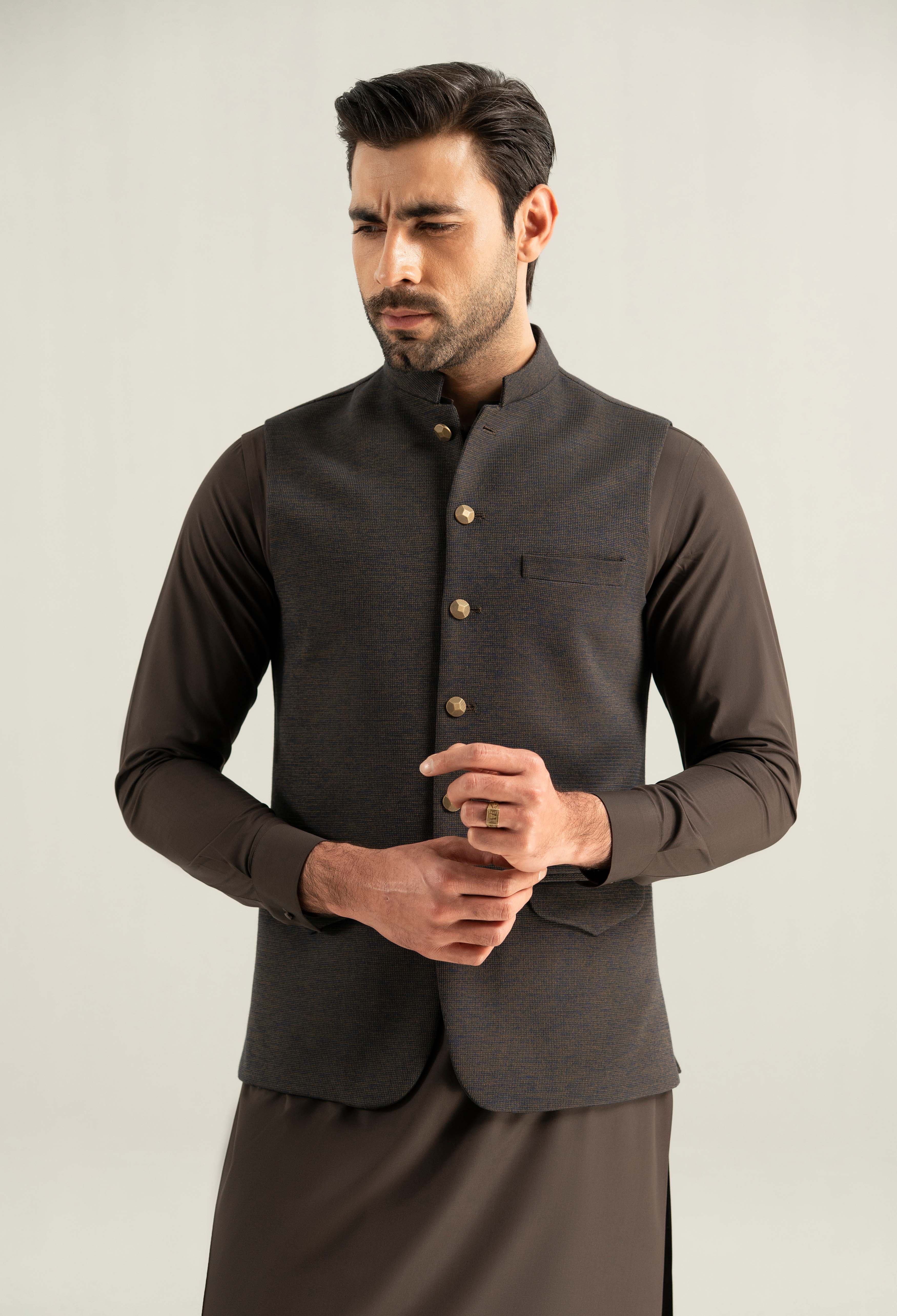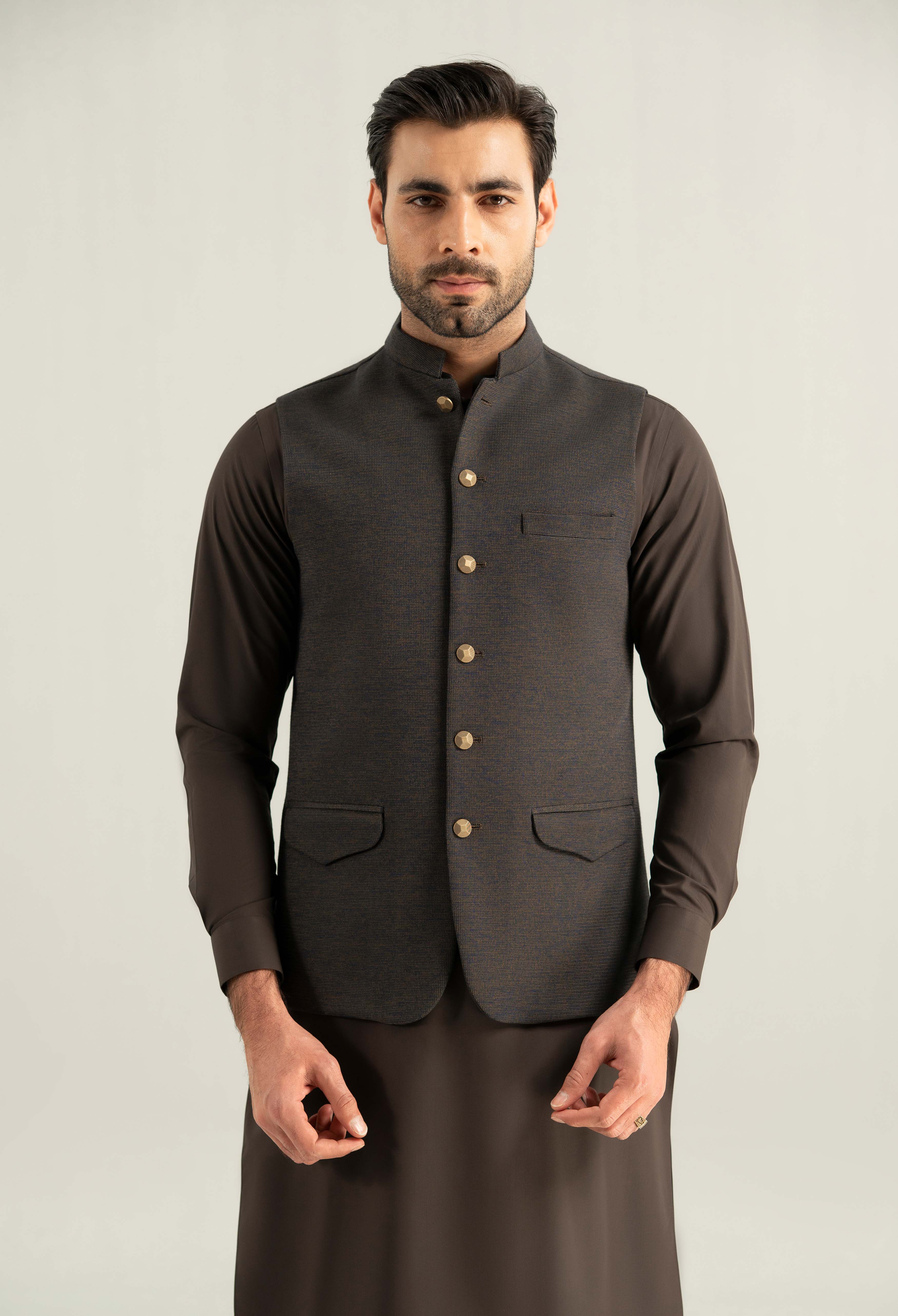 Elevate your shalwar suit with this elegant men’s waistcoat crafted from lightweight blended Fabric for a smooth refined look. A luxurious touch to stand out in style.