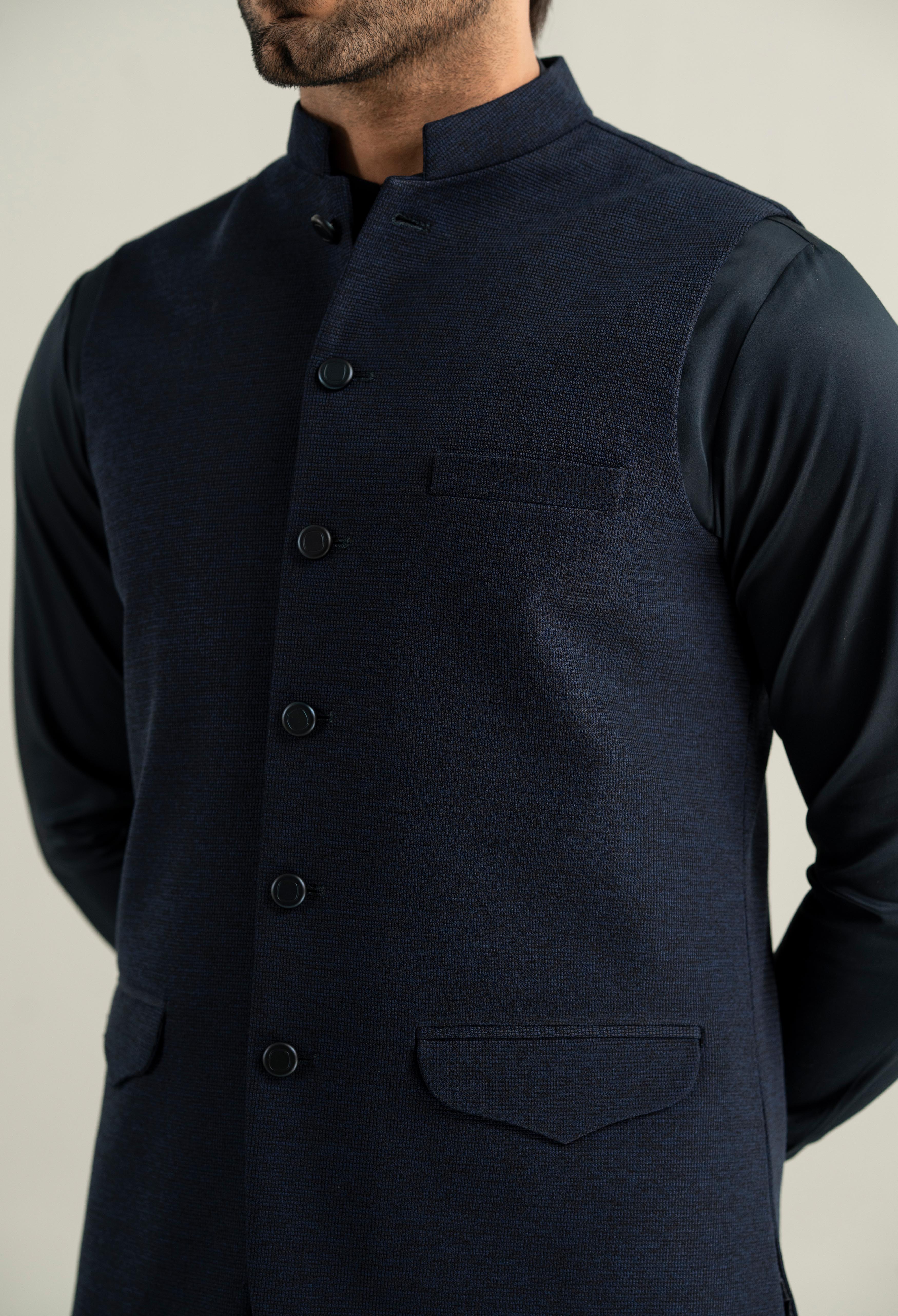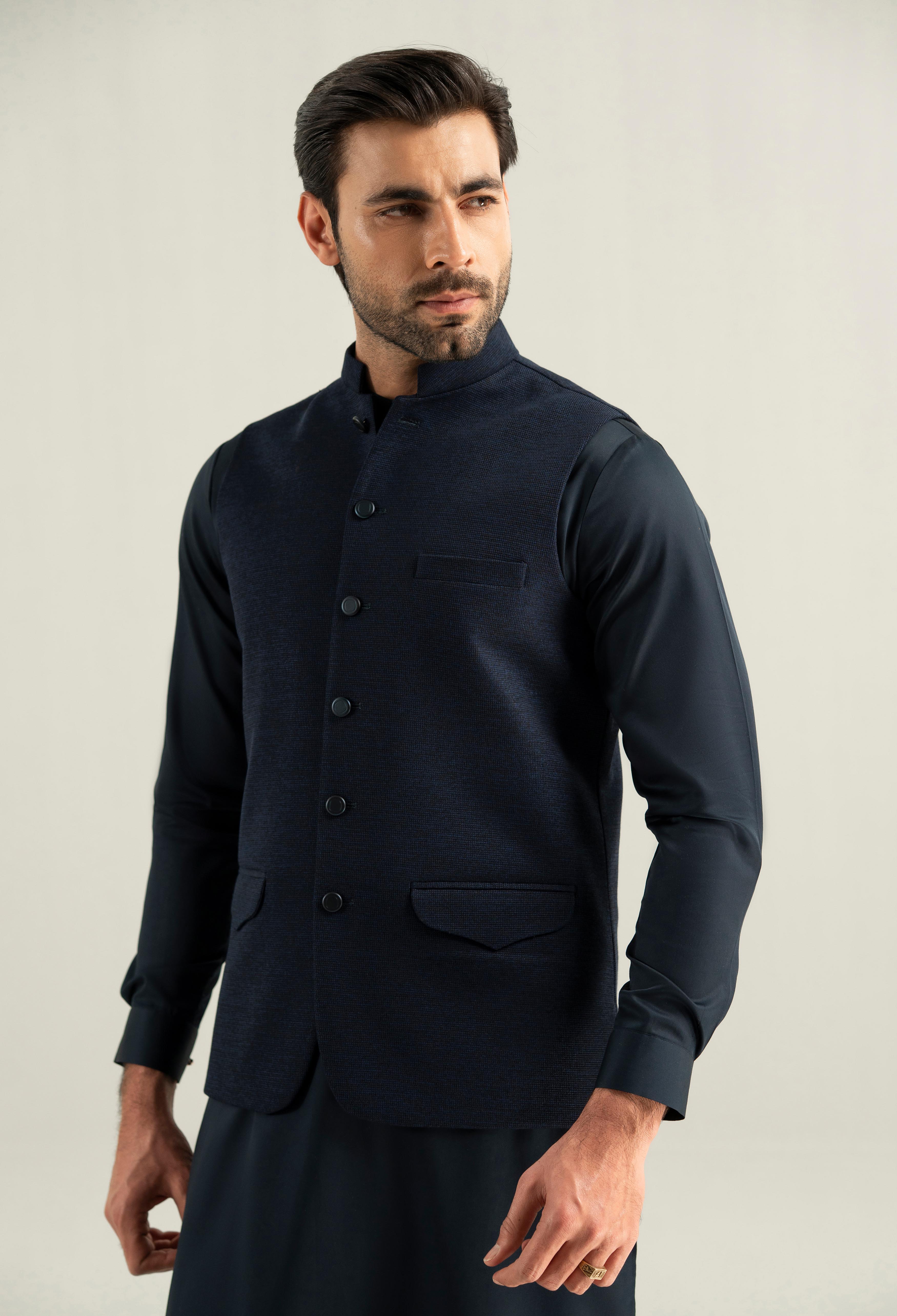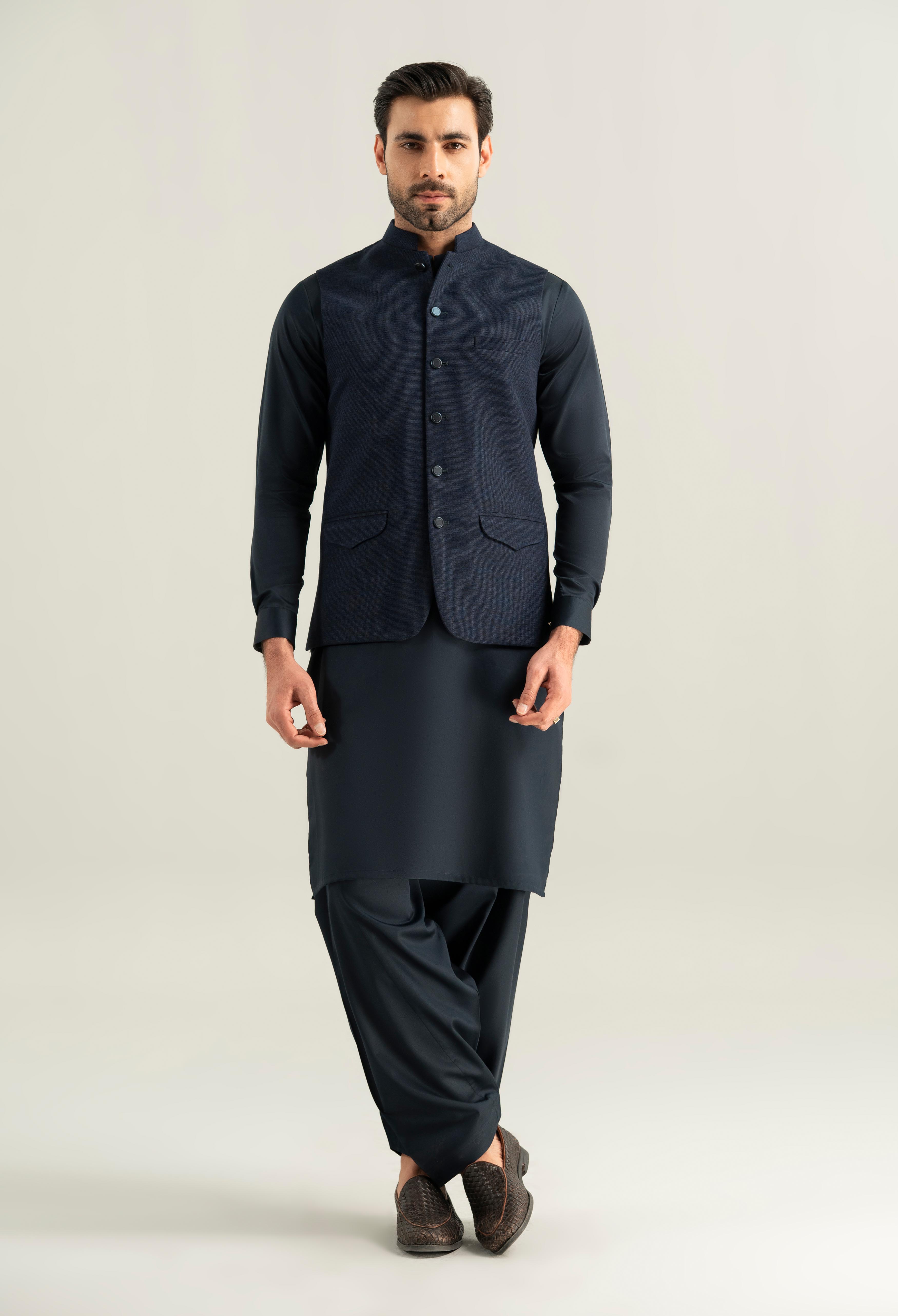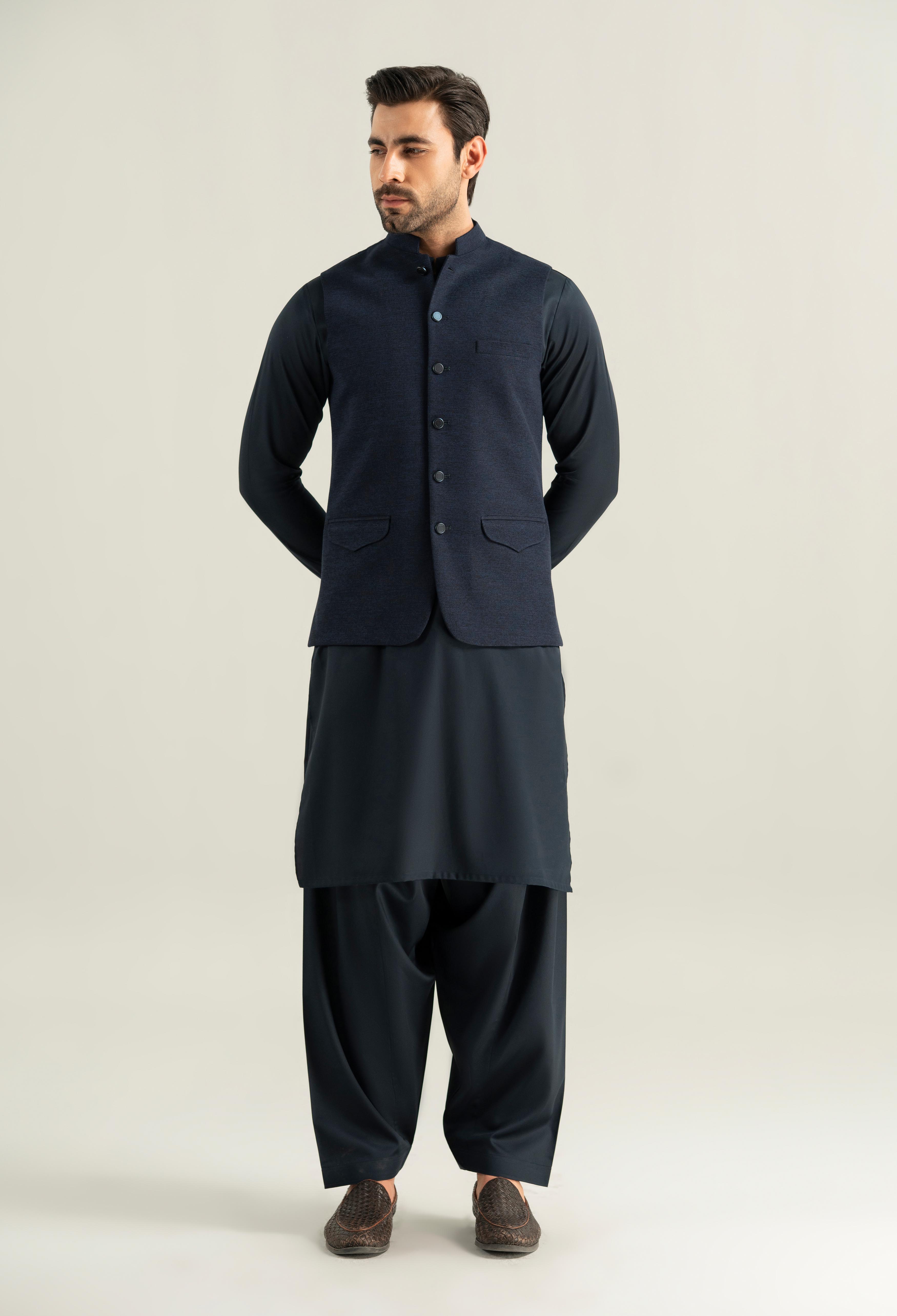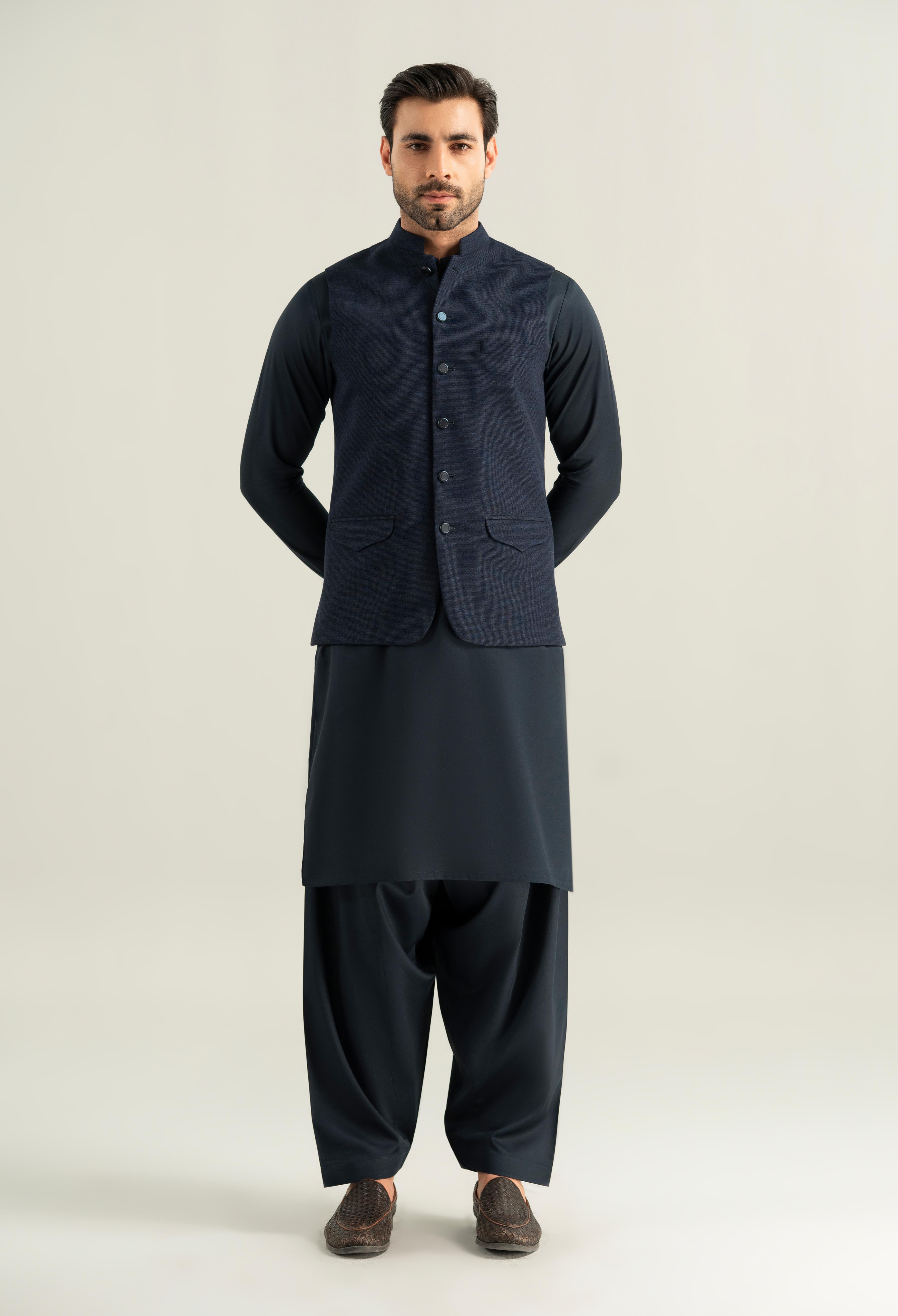 Elevate your shalwar suit with this elegant men’s waistcoat crafted from lightweight blended Fabric for a smooth refined look. A luxurious touch to stand out in style.