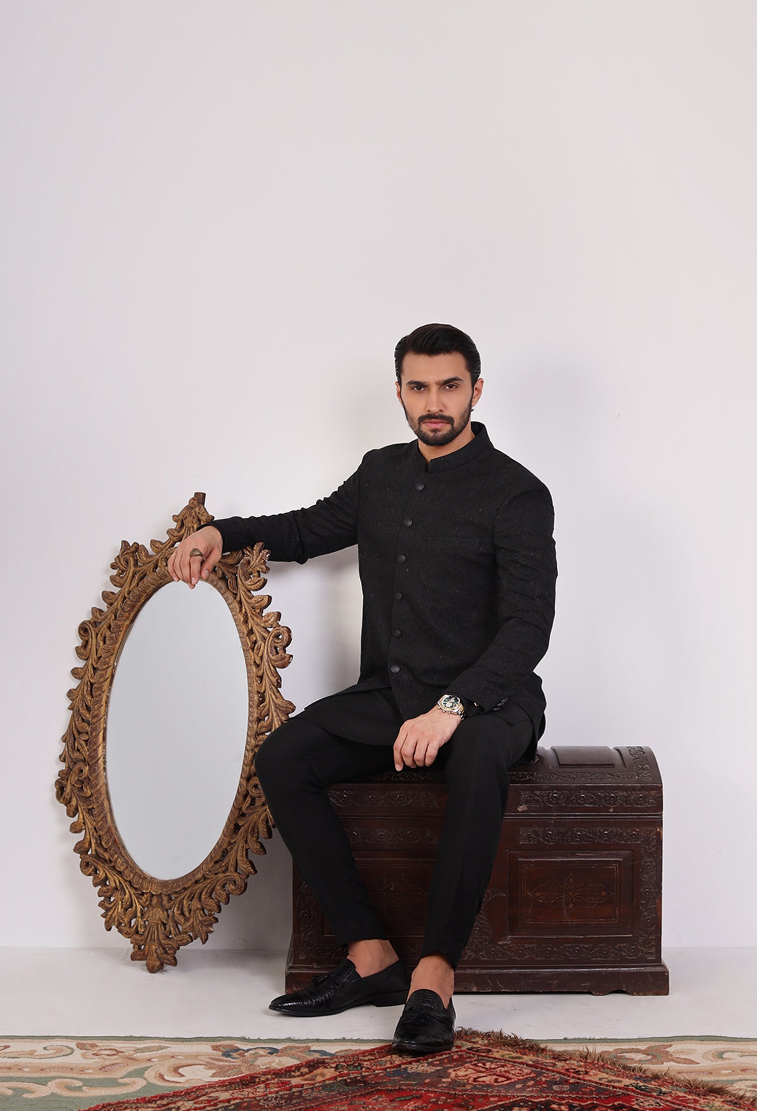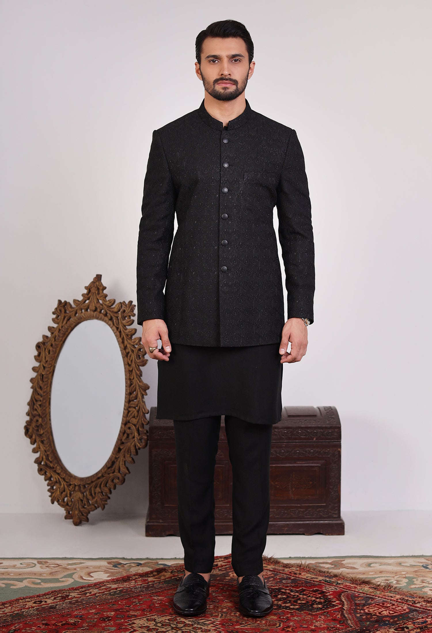 Our prince coats seamlessly blend traditional elegance with modern craftsmanship, featuring exquisite hand embroidery, precise machine embroidery, and detailed thread work on luxurious raw silk fabric. Each prince coat is meticulously crafted—hand embroidery adds a unique, artisanal charm, while machine embroidery ensures intricate and uniform patterns. The thread work adds depth and richness, elevating the overall design of the coat. The satin fabric, with its smooth, lustrous texture, serves as the perfect foundation, enhancing the embroidery and providing both comfort and sophistication. These elements combine to create a prince coat that embodies cultural heritage while offering a refined, contemporary style.