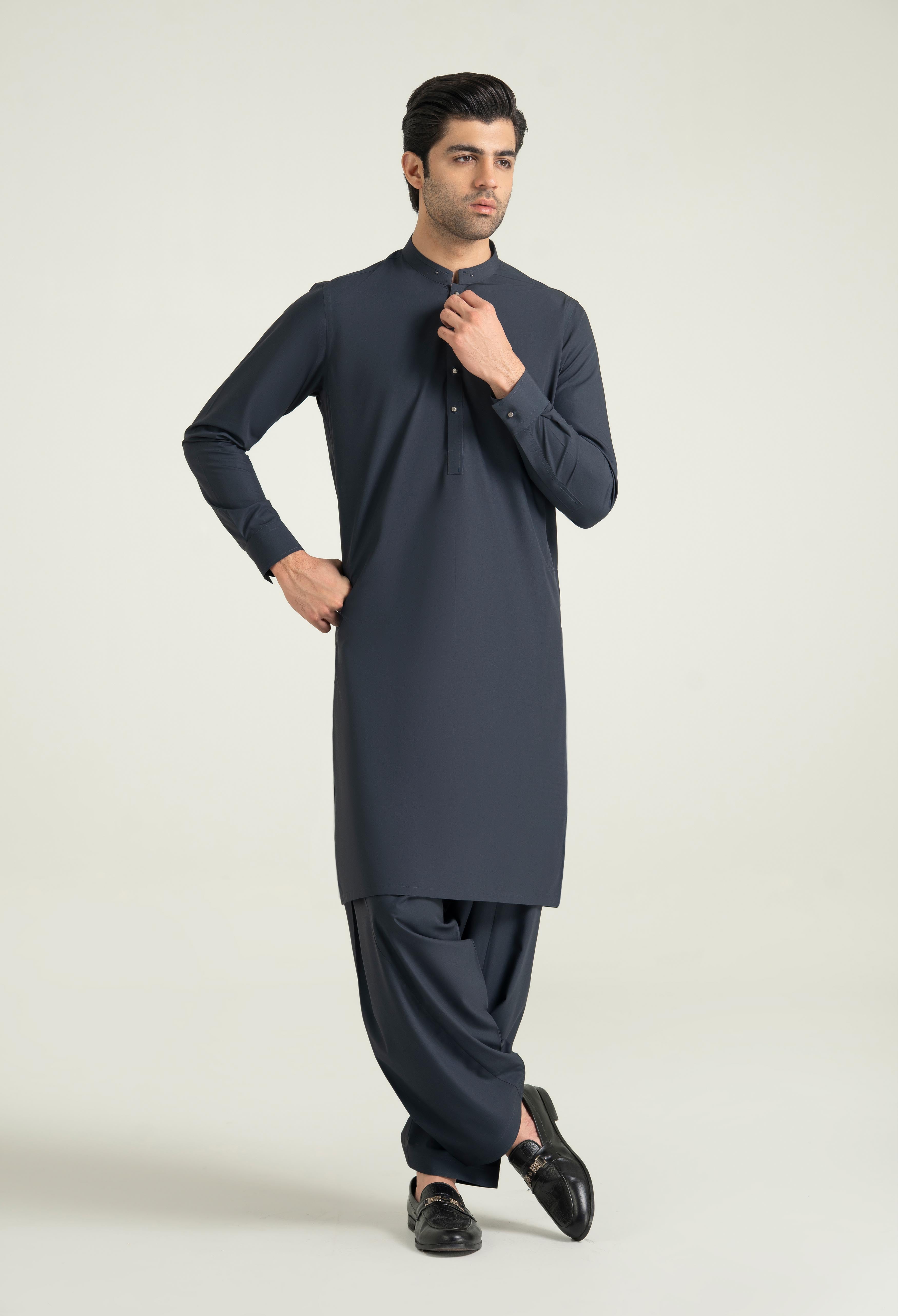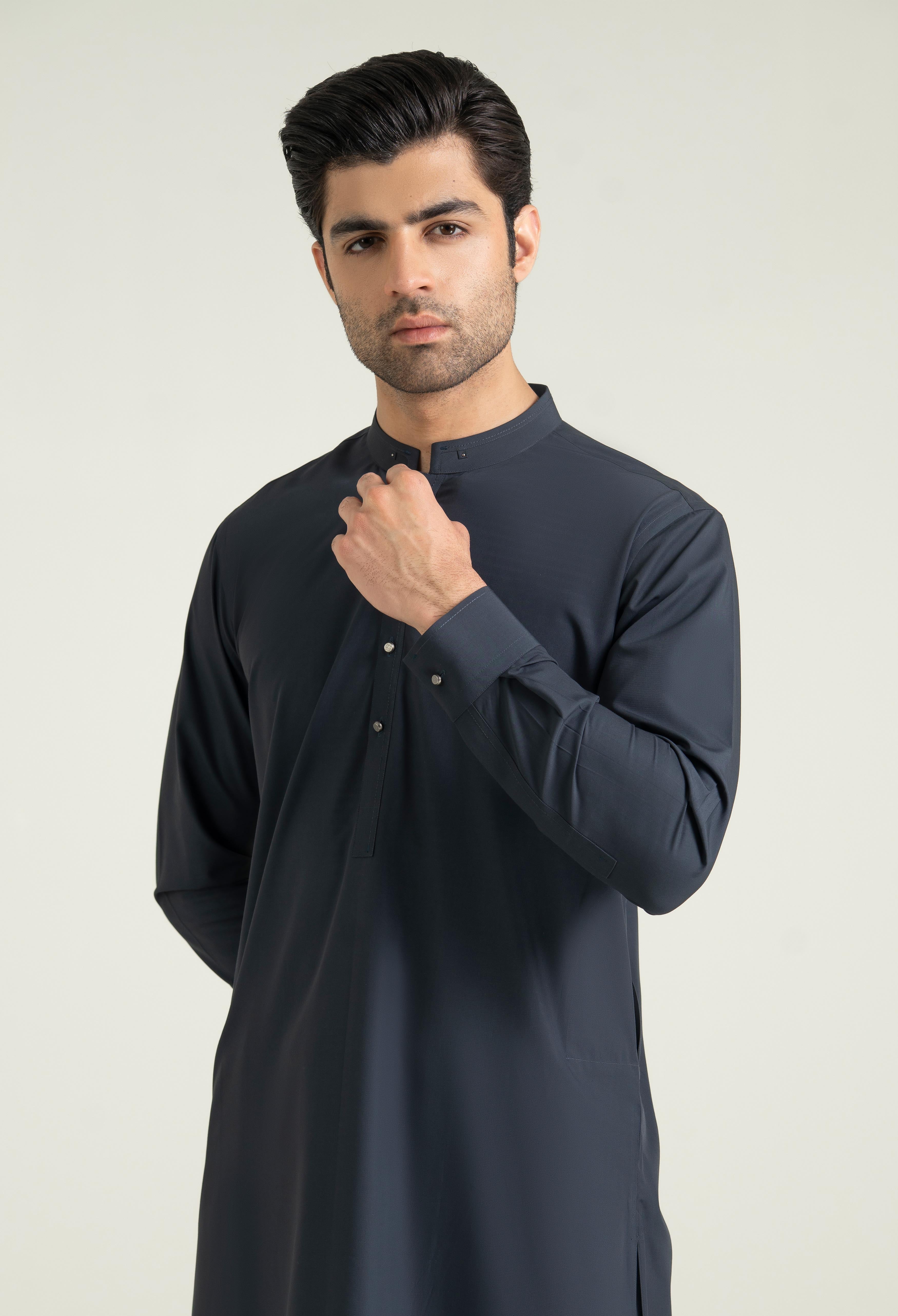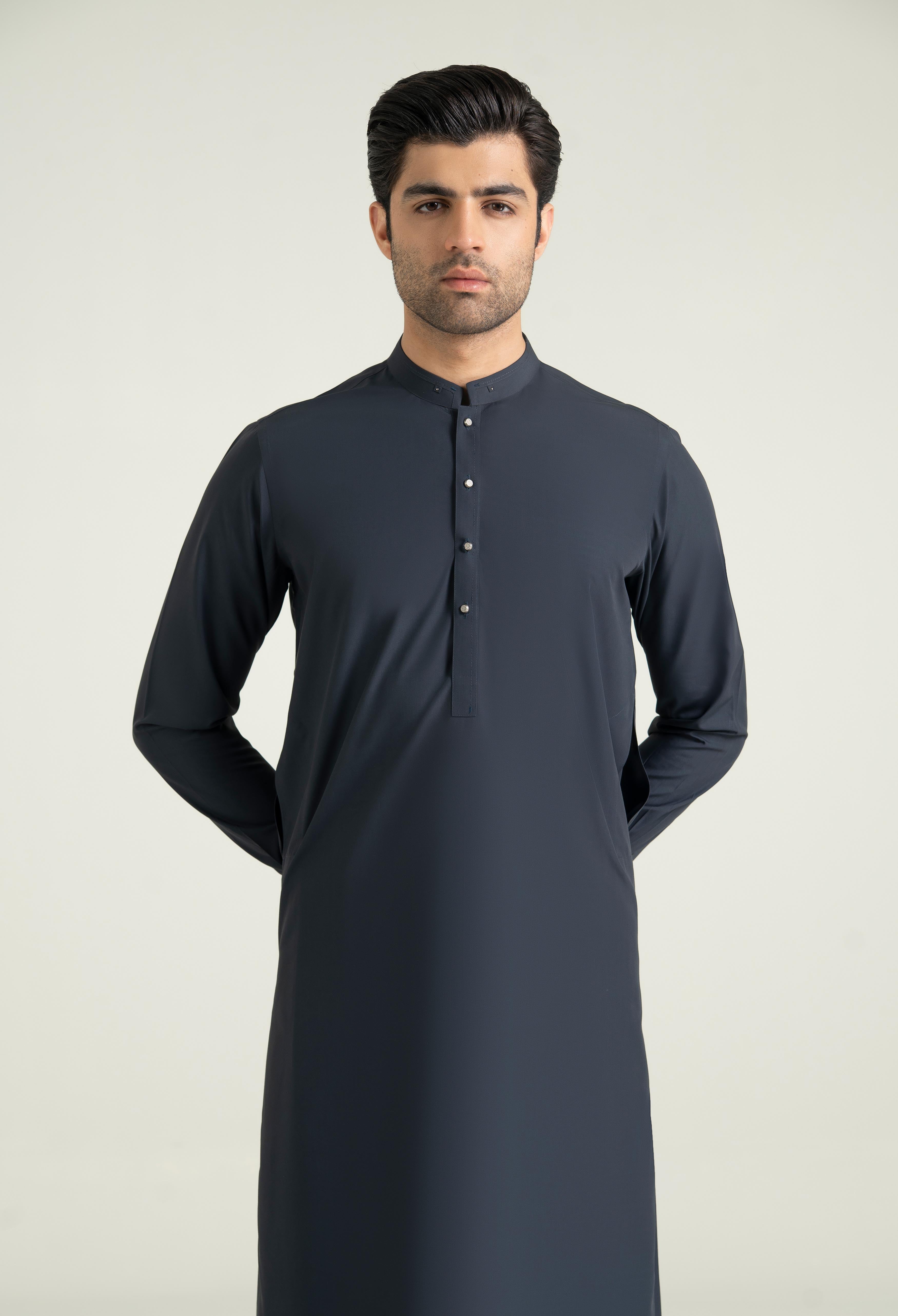 This festive shalwar kameez collection features finely crafted details, including a straight band collar enhanced with a same-fabric patch and rivet accent, complemented by clean edge-stitching for a refined finish. It incorporates bartack with stitch detailing on the back shoulder yoke, sleeves placket, front placket, straight cuffs adding both durability and subtle design interest. The silhouette is completed with a neat straight hem, and practical side-seam pockets, delivering a balance of function and elegance.